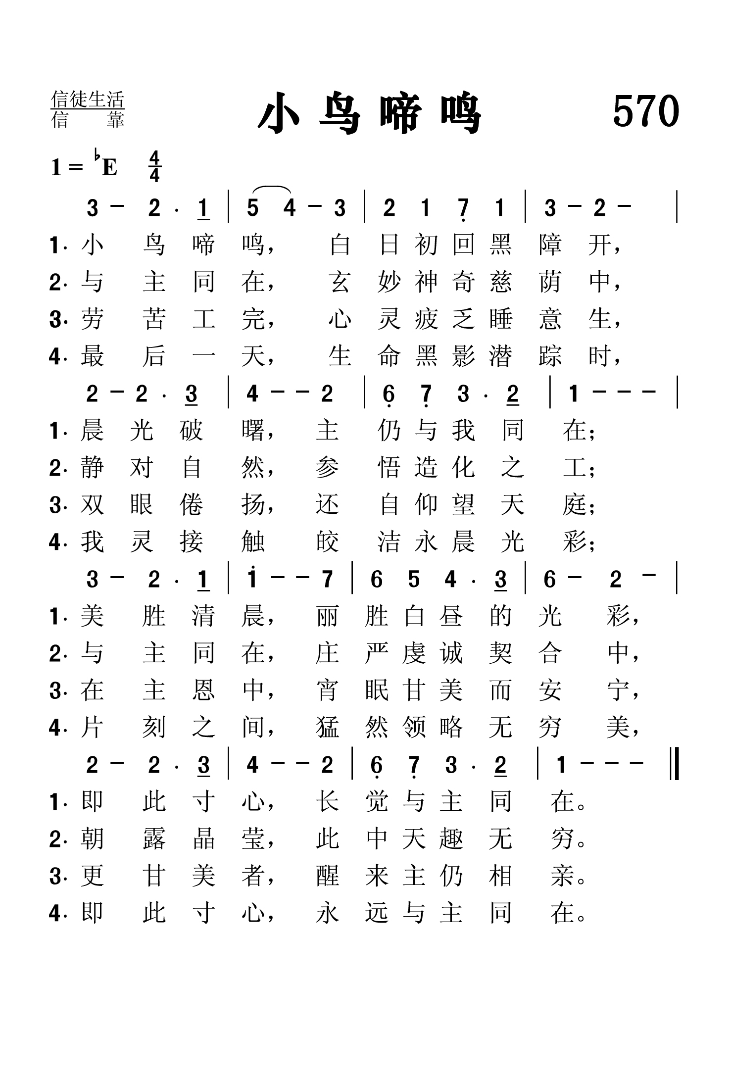第570首 小鸟啼鸣Still,Still with Thee,When Purple Morning Breaketh 哈利雅特.比彻.斯托(Harriet Beecher Stowe,1811-1896)作词(1855年);门德尔松(F.Mendelssohn,1809-1847)作曲;刘廷芳 杨荫浏合译(1932年) 小鸟啼鸣,白日初回黑障开, 晨光破曙,主仍与我同在; 美胜清晨,丽胜白昼的光彩, 即此寸心,长觉与主同在。 与主同在,玄妙神奇慈荫中, 静对自然,参悟造化之工; 与主同在,庄严虔诚契合中, 朝露晶莹,此中天趣无穷。 劳苦工完,心灵疲乏睡意生, 双眼倦扬,还自仰望天庭; 在主恩中,宵眠甘美而安宁, 更甘美者,醒来主仍相亲。 最后一天,生命黑影潜踪时, 我灵接触皎洁永晨光彩; 片刻之间,猛然领略无穷美, 即此寸心,永远与主同在。 词作者斯托夫人是十九世纪美国最著名的女作家,写过45本书,特别是《汤姆叔叔的小屋》(《黑奴吁天录》),为解放黑人制造舆论,先后被翻译成23种文字。她出生于牧师家庭,早年当过教师,后一生从事文字工作。他对黑人的不幸遭遇深表同情,曾在她的住宅收容被奴隶主驱逐的黑人。她从基督徒的敬虔和正义感出发,对社会的不公平表示极度的愤慨,予以口诛笔伐。她的著作以小说为主,也写过若干热情奔放的诗歌和教会圣诗。《小鸟啼鸣》是她她投稿于她兄弟比彻牧师所编的圣歌集。歌词美丽、优雅,表达了她完全奉献的精神和个人与主亲密无间的欢欣。她说:“我希望看见那无法描述的美丽,在凌晨和清早、在我似睡非睡之际来临,使我感觉到于主亲近”。她每天4点就起床享受小鸟啼鸣的美景。就是在这样宁静甜蜜的气氛中,她写下了这首隽永的诗歌。 这首诗所选的曲调是德国伟大的作曲家门德尔松《无词歌》钢琴曲的第二曲,名为《安慰(Consolation)》。 门德尔松是犹太籍的基督徒,是一位与贝多芬,莫扎特,海登等平名的音乐大师,38岁就英年早逝。他12岁就创作一首钢琴四重奏;20岁就组织演出几乎被人遗忘的巴赫作品《马太受难曲》。他一生写过许多宗教音乐,最著名的有清唱剧《伊莱贾》,《圣保罗》和《耶稣基督》(未完成)。 《颂赞诗歌》88首《新生王歌》,502首《常住爱中》,《赞美诗》(506版)499首《全能圣天父》也是门德尔松作曲的。