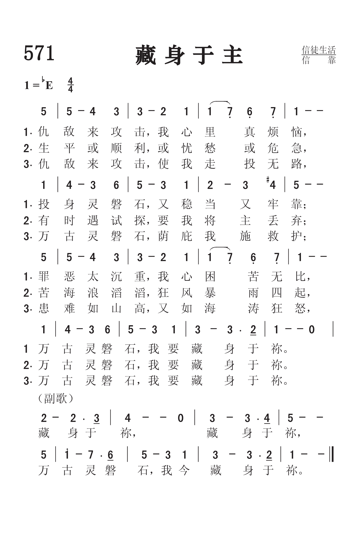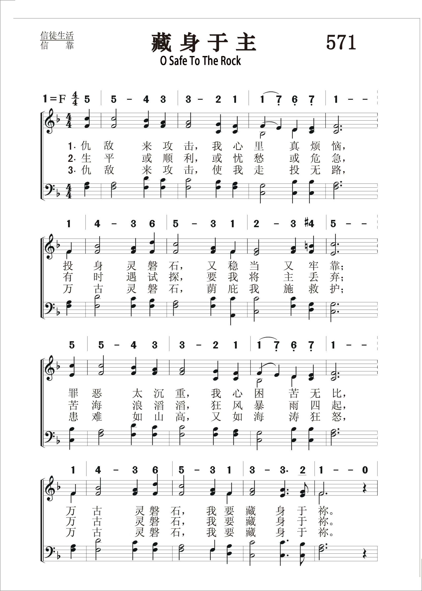 第571首 藏身于主O Safe to the Rock 库欣(WOCushing, 1823-1902)作词,桑基(Ira D.Sankey,1840-1908)歌简介 仇敌来攻击,我心里真烦恼,投身灵磐石,又稳当又牢靠, 罪恶太沉重,我心困苦无比,万古灵磐石,我要藏身于祢。 生平或顺利,或忧愁或危急,有时遇试探,要我将主丢弃; 苦海浪滔滔,狂风暴雨四起,万古灵磐石,我要藏身于祢。 仇敌来攻击,使我走投无路,万古灵磐石,荫庇我施救护; 患难如山高,又如海涛狂怒,万古灵磐石,我要藏身于祢。 藏身于祢,藏身于祢,万古灵磐石,我今藏身于祢。 库欣创作这首赞美诗,是出于诗61:2“我心里发昏的时候,我要从地极求告你,求你领我到那比我更高的磐石”的感动。 他自己曾说:“这首诗系1876年写于纽约的莫拉维亚,是不少的眼泪,内心的挣扎,和心灵饥渴的产物,为世人所不知道的。当时桑基催促我写一些诗来支持他传福音的工作,于是我就恳求赐给我一些可以荣耀祂名的诗歌。《藏身于主》 就是这样诞生的,由桑基为之配乐,使之如添双翼。” 本诗1894年编入桑基的赞美诗集时,所用的标题是《作我坚固的磐石,拯救我的保障》(诗31:2)。 词作者库欣出生于美国新英格兰,自幼信主;青年时代受奋兴布道的影响,献身事奉主,担任牧师圣职。1870年他47岁时,不幸患病,健康恶化。后来疾病虽愈,但口以不能说话,无法再宣传主道,于是求主赐下写作圣诗的才能。此后,他以惊人的毅力写了圣诗三百余首,感动了许多人。他以坚强的信心,在世上又生活了三十三年,去世时80岁。他的圣诗多由鲁特、桑基、劳里等福音派圣诗作曲家为他配曲。 曲作者桑基生于美国宾夕法尼亚州,自幼参加教会活动。17岁时,他的父亲说:“我看这孩子将来除了每天在腋下夹着一本赞美诗到处歌唱之外,不会找别的工作。”的确,他经常在教会的主日学中教唱赞美诗,后来果然成为一位世界著名的福音圣诗歌唱家。他曾担任宾夕法尼亚州青年会的总干事。为建造青年会会址,他募集了4万美元。后来他与慕迪(Moody)同工,在布道会上教唱福音诗歌,也曾编辑并创作过许多首赞美诗。他曾经将他的作品编辑好,准备出版,但一次失火将他的原稿烧毁。1906年他眼睛失明后,还出版了一本《我的生平及福音赞美诗的故事》。在书中说:“我不是一个音乐家,也不是一个歌唱家,我从来没有学过声乐,也没有受过艺术教育,但我对所唱诗歌的每一句和每一字都深有体验。我每唱一首诗都必须把它唱到每一个听众的心里。。我常感到好的旋律易找,但好的歌词却不易找。” 桑基一生创作了几十首福音赞美诗,其中三十首至今仍在教会的聚会中传唱。