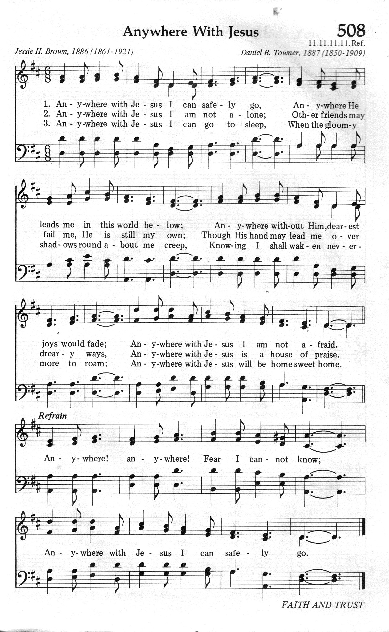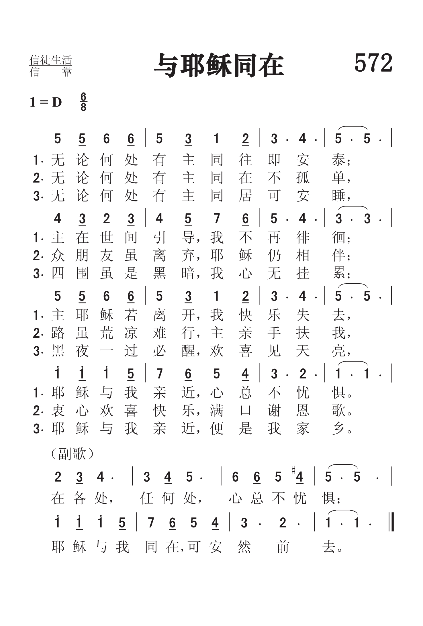 第572首 与耶稣同在Anywhere With Jesus 词作者杰西.庞兹(Jessie .Brown Pounds,1861,8,31-1921,3,3,作第一,二节,于1887年)和海伦.亚力山大(Helen C.Alexander,1877,1,10-1969,3,1,作第三,四节,约于1915年),曲作者汤纳(Daniel Brink Towner,1850-1919年,作于1887年) 1无论何处有主同往即安泰,主在世间引导我不再徘徊; 主耶稣若离开,我快乐失去,耶稣与我亲近心总不忧惧。 无论何处有主同在不孤单,众朋友虽离开,耶稣仍作伴; 路虽荒凉难行,主亲手扶我,衷心欢喜快乐,满口谢恩歌。 无论何处有主同居可安睡,四围虽是黑暗,我心无挂累, 黑夜一过必醒,欢喜见天亮,耶稣与我亲近,便是我家乡。 在各处,任何处,心总不忧惧,耶稣与我同在可安然前去。 杰西.庞兹出生于美国俄亥俄州希兰市,自幼体弱多病,在家接受教育,15岁开始写作投稿,1896年与庞兹牧师结婚。一位编辑发现了她的才华,鼓励她从事了诗歌的创作。她一生共写了400多首赞美诗,9本专著,50部康塔塔和小歌剧的歌词。 海伦.亚力山大出生于英国伯明翰的富豪之家,曾在德国接受高等教育,专修音乐。1904年7月,她与著名宗教音乐家查理. 亚力山大结合。丈夫于1920年去世以后,她于1924年再婚。 汤纳于1850年3月5日生于美国宾文法尼西亚州罗马市,先跟身为著名教授的父亲,后从约翰.霍华德,乔治.韦布学音乐。曾任多家圣乐团的指挥。因善唱男高音和指挥合唱,于1885年应慕迪邀请,参加其布道团工作。1893年在芝加哥慕迪圣书学院音乐系主任,为教会培养音乐人材,在美国中西部地区产生很大的影响。1900年田纳西大学授予他音乐博士学位。他一生作曲2000余首,参加编印14种以上的圣诗集。1919年10月3日在密苏里州的布道会上领唱时逝世。 《颂赞诗歌》第552首《信而顺服》,也是汤纳作曲的。