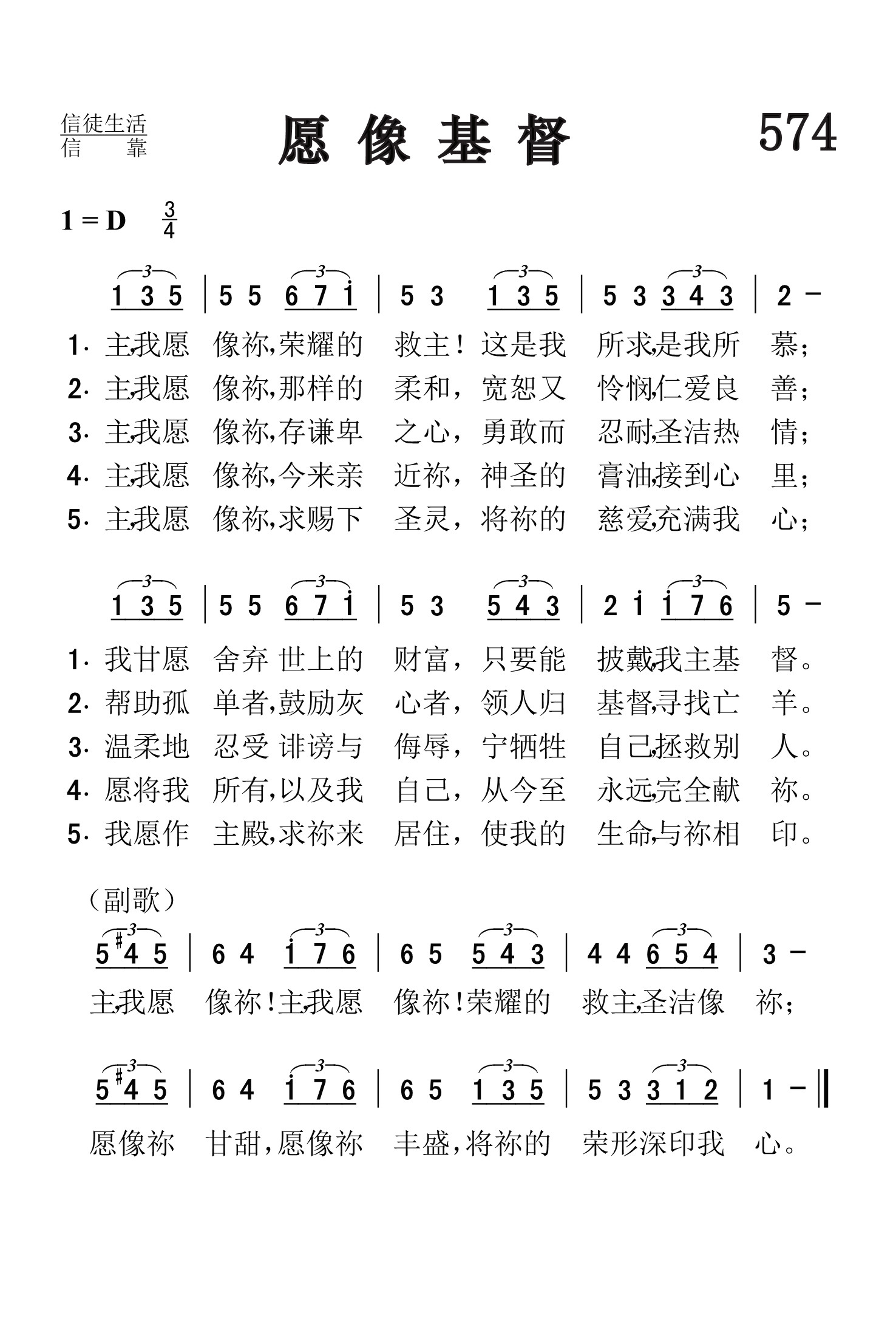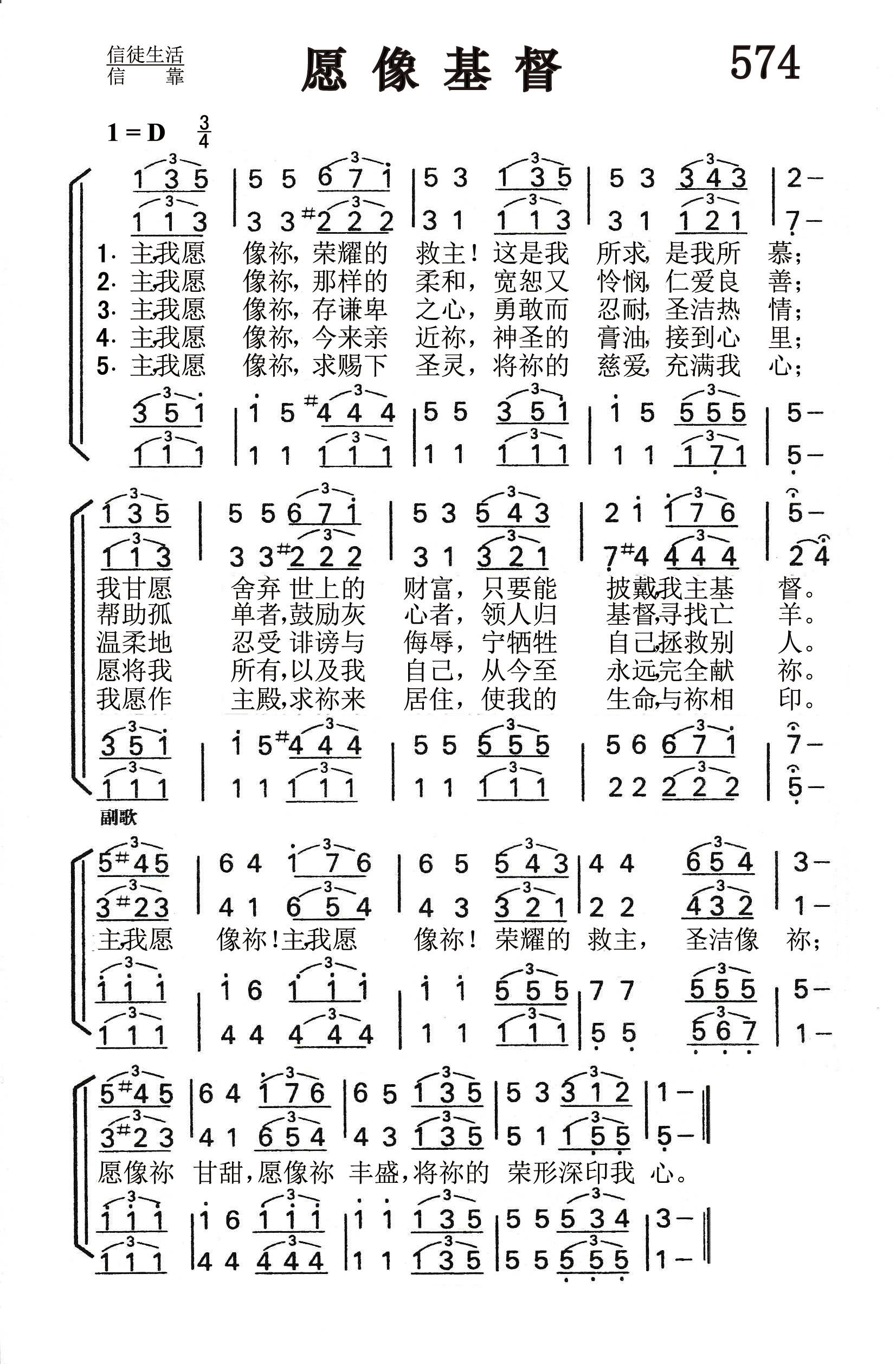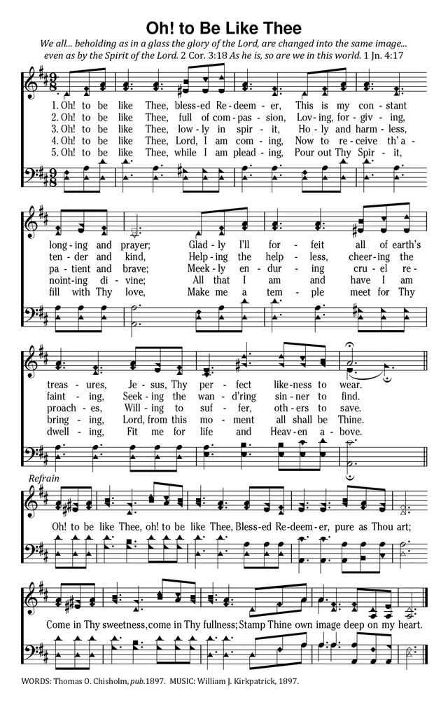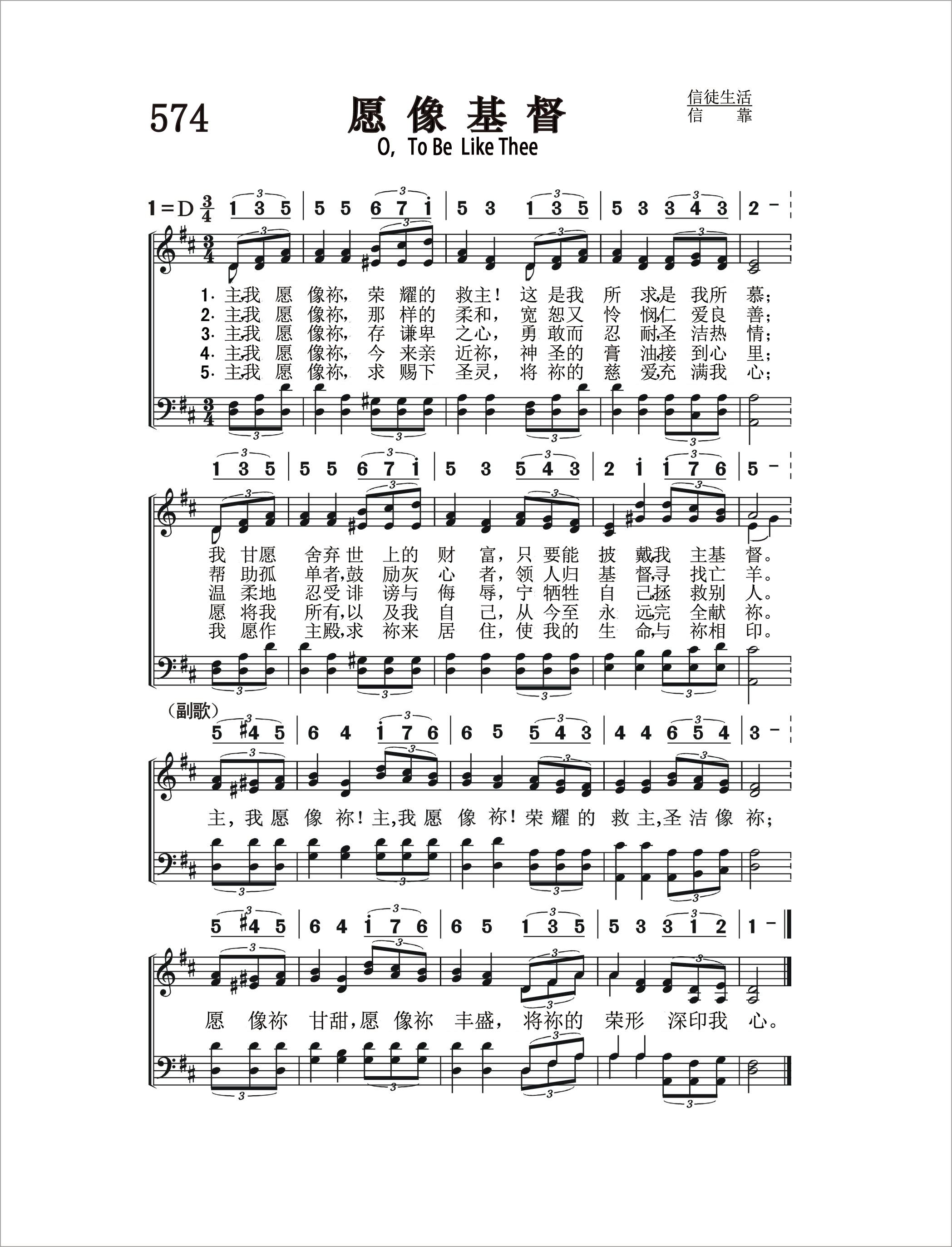 第574首愿像基督O,to beLike Thee 奇舒姆(Thomas.O.Chisholm,1866,7,29-1960,2,29)作词,柯克帕特里克(W.J.Kirkpatrick,1838,2,27-1921,9,20)作曲 主,我愿像祢,荣耀的救主!这是我所求,是我所慕; 我甘愿舍弃世上的财富,只要能披戴我主基督。 主,我愿像祢,那样的柔和,宽恕又怜悯,仁爱良善; 帮助孤单者,鼓励灰心者,领人归基督,寻找亡羊。 主,我愿像祢,存谦卑之心,勇敢而忍耐,圣洁热情; 温柔地忍受诽谤与侮辱,宁牺牲自己,拯救别人。 主,我愿像祢,今来亲近祢,神圣的膏油,接到心里; 愿将我所有,以及我自己,从今至永远,完全献祢。 主,我愿像祢,求赐下圣灵,将祢的慈爱,充满我心; 我愿作主殿,求祢来居住,使我的生命与祢相印。 主我愿像祢!主我愿像祢!荣耀的救主圣洁像祢; 愿像祢甘甜,愿像祢丰盛,将祢的荣形深印我心。 “这新人在知识上渐渐更新,正如造他主的形象”(西3:10)。 作者27岁的时候,在亨利.马利逊牧师所领的奋兴会中得到了重生的经历。这收诗歌表达了他获得主的救恩之后,发自心灵深处的祈祷。 词作者奇舒姆出生于美国肯塔基州的农村,没有受过多少学校教育,靠着自己的勤奋好学,16岁就在乡村小学当上教员。他21岁出任当地周报的编辑,27岁蒙恩重生,经马利逊牧师介绍,任《五旬节先锋》杂志主编。1903年,他就任美以美会牧师。后因健康原因辞职退休,但继续从事诗歌创作,共写了1200余首,发表了800余首,其中有许多被配上了曲调。 第24首《你的信实广大》,423首《浪子回家》和第461首《为主而生活》也是奇舒姆作词的。 曲作者柯尔帕特里克是美国音乐出版家,宗教音乐作曲家。他出生于爱尔兰,自幼跟他父亲学音乐,以后受教于几个名师,青年时移居美国。南北战争时他参军,任军乐队吹笛手。1862年至1872年在美国费城做家具商,并在美以美会担任义工,曾任美国费城美以美会唱诗班指挥。同时他还作曲。他在1859年21岁时即开始编辑出版赞美诗工作,以后与斯托克顿.斯威尼合编出版约一百多部宗教音乐集和书刊。他谱写了不少信徒所喜爱的福音歌曲。 《颂赞诗歌》435首《主啊我正回家》(兼作词),166首《至宝佳音》,98首《领我到髑髅地》,532首《抛碇于灵盘》,289首《高声福音号声》,232首《忍耐等候》,79首《马槽歌》,26首《仍愿高唱》,《赞美诗》(505版)294首《信靠耶稣》,也是柯克帕特里克作曲的。