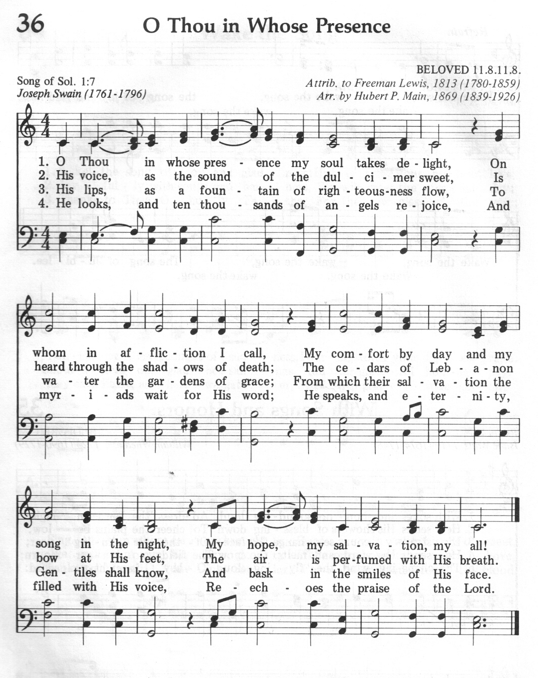 第575首在恩主面前O Thou in Whose Presence 斯温(Joseph Swain,1761-1796,4,14)作词,刘易斯(Freeman Lewis,1780-1859)作曲,梅因(Hubert Platt Main, 1839,8,17-1925,10,9)改编(1689年) 在恩主的面前,我心常鼓舞,遇患难时向祂求呼, 白昼赐安慰,黑夜我灵歌,救赎希望全在乎主。 主慈声至美妙,如琴瑟奏弦,穿透死亡阴云无边; 黎巴嫩香柏,都伏于祂脚前,救主芬芳洋溢诸天。 主恩言如泉源,公义常涌流,恩典林园浇灌不休, 全地众罪人,藉此得蒙拯救,在主面前长沐恩佑。 主慧眼常垂顾,天使同欢欣, 亿万生灵恭听妙音; 主施恩发言,慈声千古响应, 颂赞归主永世无尽。 本诗的原来标题是《藉着基督的恩典和能力描绘祂》,共有九节,是《雅歌》部分章节的意译。词作者斯温出生于英国伯明翰,自幼父母双亡,作雕刻匠的学徒,因购买了一本圣书,认真研读而认识真理。1873年5月11日受洗加入浸信会,1791年6月2日到伦敦东街主持教会,1792年2月8日接受牧者圣职,蒙上帝赐福,信徒人数迅速增加,后因病而英年早逝。 《赞美诗》505版第416首《天国景象》也是斯温作词的。 梅因出生于美国康涅狄格州。其父原为一音乐学校老师,音乐造诣甚高,声音洪亮。梅因11岁就开始在他父亲的学校读书,直到1854年前往纽约市工作,协助已成为乐谱出版商的父亲。他的好友中有当时著名的作曲家布里斯托。他喜爱音乐,16岁就开始作曲。他精通和声学,写过一千首以上的音乐作品,包括福音歌曲,圣歌和一般歌曲,编辑过赞美诗。他是纽约几个重要音乐团体的会员,多年担任圣诗班指挥和司琴。 他收藏甚广,强记博闻。无数的调名,作者姓名,生卒年月,版权期限他都记得一清二楚。在美国,几乎没有一个人像他那样对教会音乐如此熟悉,尤其是美国出版的教会音乐。这对出版界是个极大的帮助。