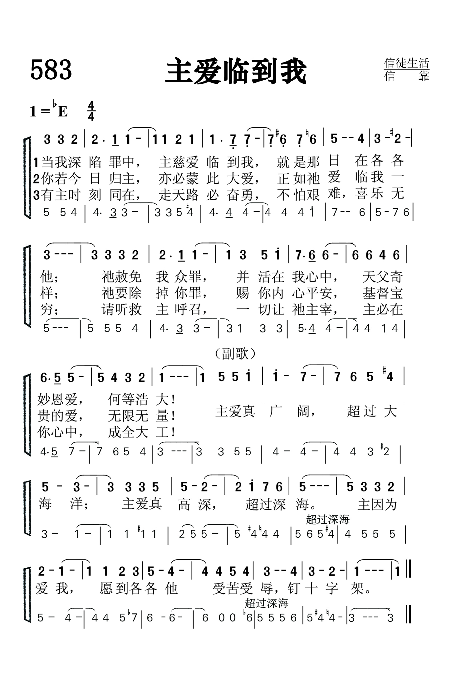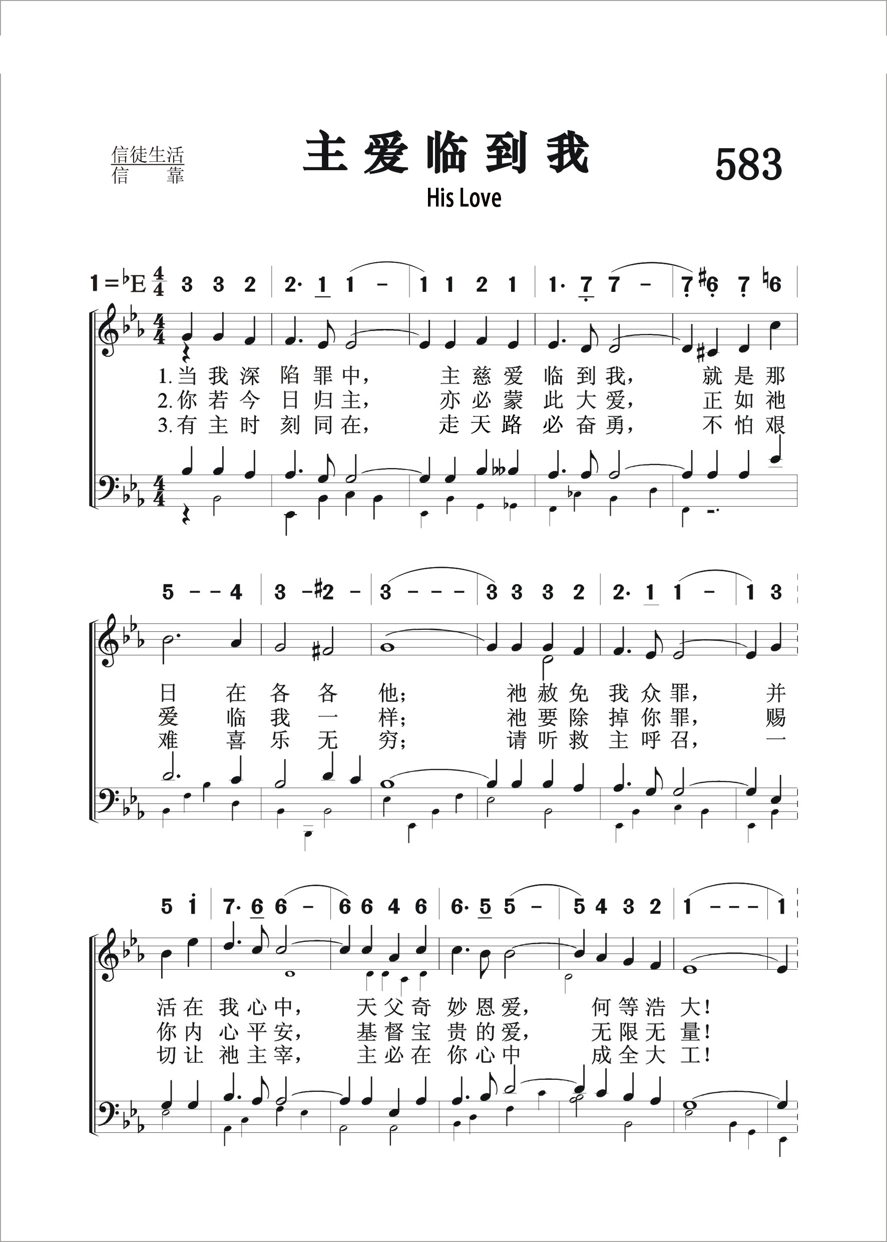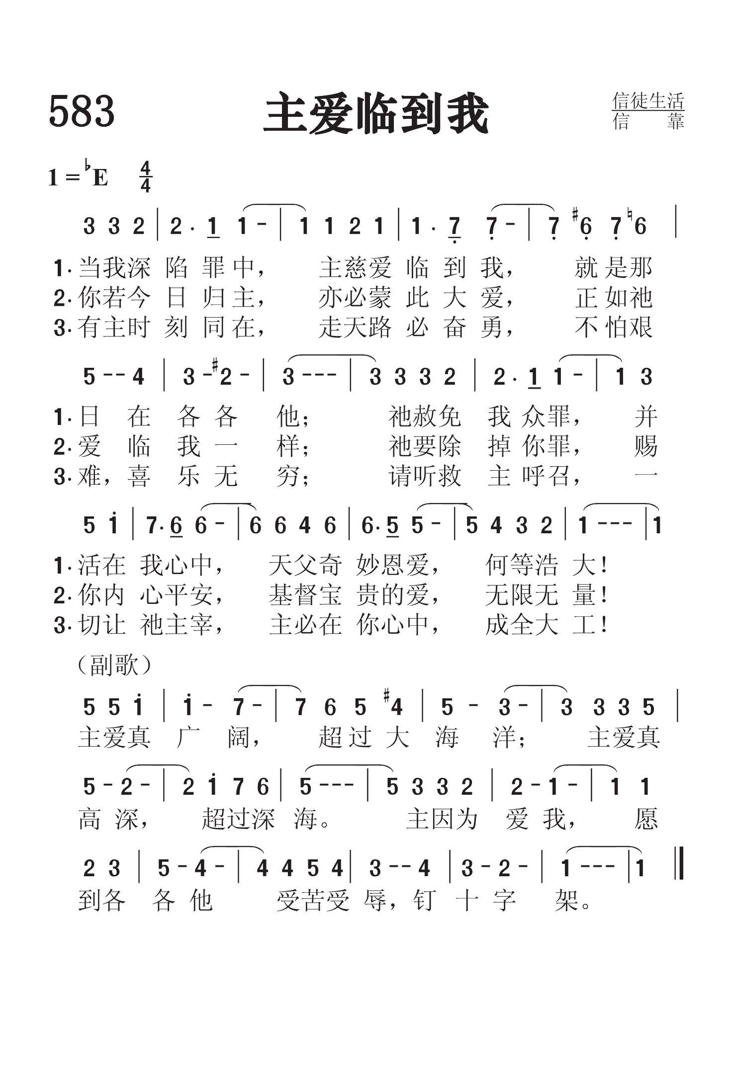 第583首 主爱临到我His Love 玛丽.卡洛林.罗宾斯(Mary Carolyn Robbins)作词作曲 (《青年圣歌》(三)56首) 当我深陷罪中,主慈爱临到我,就是那日在各各他; 祂赦免我众罪,并活在我心中,天父奇妙恩爱,何等浩大! 你若今日归主, 亦必蒙此大爱,正如祂爱临我一 样; 祂要除掉你罪, 赐你内心平安,基督宝贵的爱,无限无 量! 有主时刻同在, 走天路必奋勇,不怕艰难,喜乐无穷; 请听救主呼召, 一切让祂主宰,主必在你心中,成全大 工! 主爱真广阔, 超过大海洋; 主爱真高深, 超过深海。 主因为爱我, 愿到各各他受苦受辱,钉十字架。 这首诗歌讴歌了各各他的大爱临到一个人时所要产生的奇妙效能。主为拯救我们,甘心到各各他受苦受辱,偿付了我们的赎价。当圣灵把这伟大的爱启示在我们心里时,这爱会除掉我们的一切罪孽过犯,使我们脱胎换骨,成为一个全新的人。我们活在无罪的喜乐之中,是何等快乐平安。我们行走天路会不怕艰险。我们会让基督作我们的主宰,以成全祂的工作。
