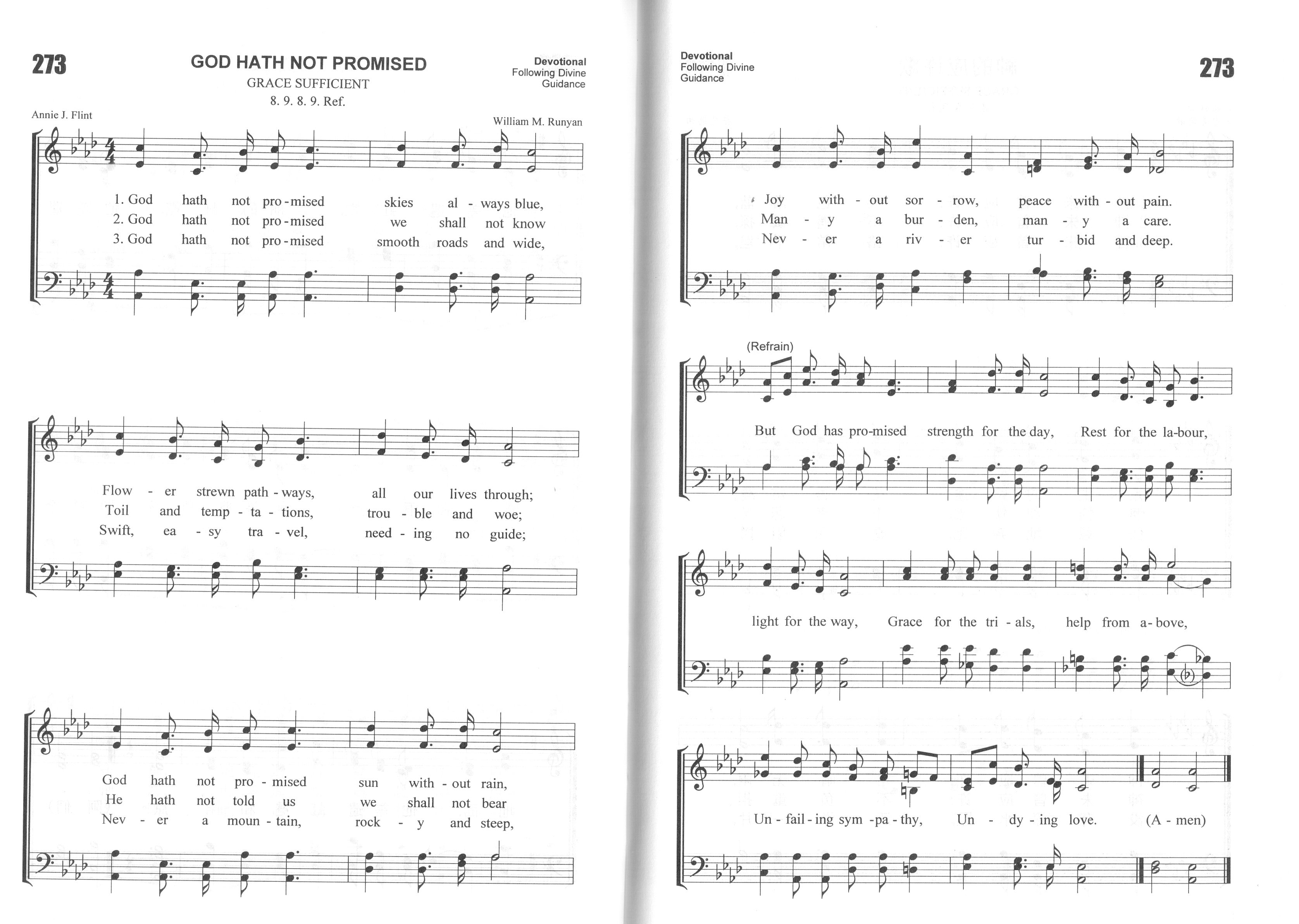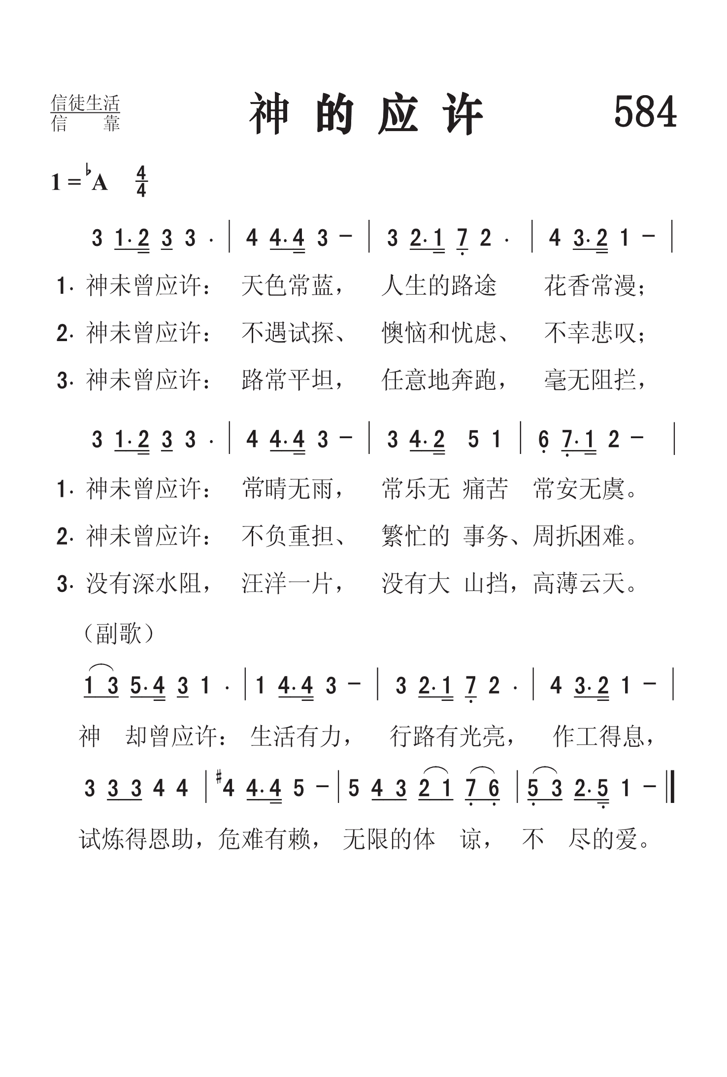 第584首 神的应许God Hath Not Promised 弗林特(Annie Johnson Flint,1866-1932)作词,鲁尼恩(William M. Runyan,1870-1957)作曲 神未曾应许:天色常蓝,人生的路途花香常漫; 神未曾应许:久晴无雨,常乐无痛苦常安无虞。 神未曾应许:不遇试探、懊恼和忧虑、不幸悲叹; 神未曾应许:不负重担,无繁忙事务、周折\困难。 神未曾应许:路常平坦,任意地奔跑,毫无阻拦, 没有深水阻,汪洋一片,没有大山挡,高薄云天。 神却曾应许:生活有力,行路有光亮,作工得息, 试炼得恩助,危难有赖,无限的体谅,不尽的爱。 词作者安妮.弗林特三岁丧母,遭到寄养家庭的虐待,经邻居告发后,被弗林特夫妇收养。安妮在八岁时信主,九岁时开始写诗,少女时曾作曲、演奏钢琴。 廿岁时养父母双亡。不久她因关节炎发作而不能教书,陷于贫病交迫、无人照顾之困境。 以后四十年,她一直生活在痛苦中,肢体变形,手指关节毁损,艰辛地握笔在打字机上打下诗句。 安妮的基督徒朋友力劝她凭信心求上帝医治。 但经过切心的读经祷告后,她得出结论是:“上帝可以医治,但祂对每一个人的旨意不同。上帝要以她的软弱来荣耀祂,祂的恩典是够她用的。” 她因此而顺服。 安妮的诗引用上帝的真理加上她切身的体验,因此广受读者的欢迎;她的诗常被印在贺卡和墙饰上。 曲作者鲁尼恩是慕迪圣书学院的音乐教师。 他在1891年被卫理公会按立为牧师。十多年后,因听力日渐失聪而辞职,后在出版社编写宗教杂志与诗集。他作的曲中最著名的是《祢的信实广大》(Great Is Thy Faithfulness,24首)。