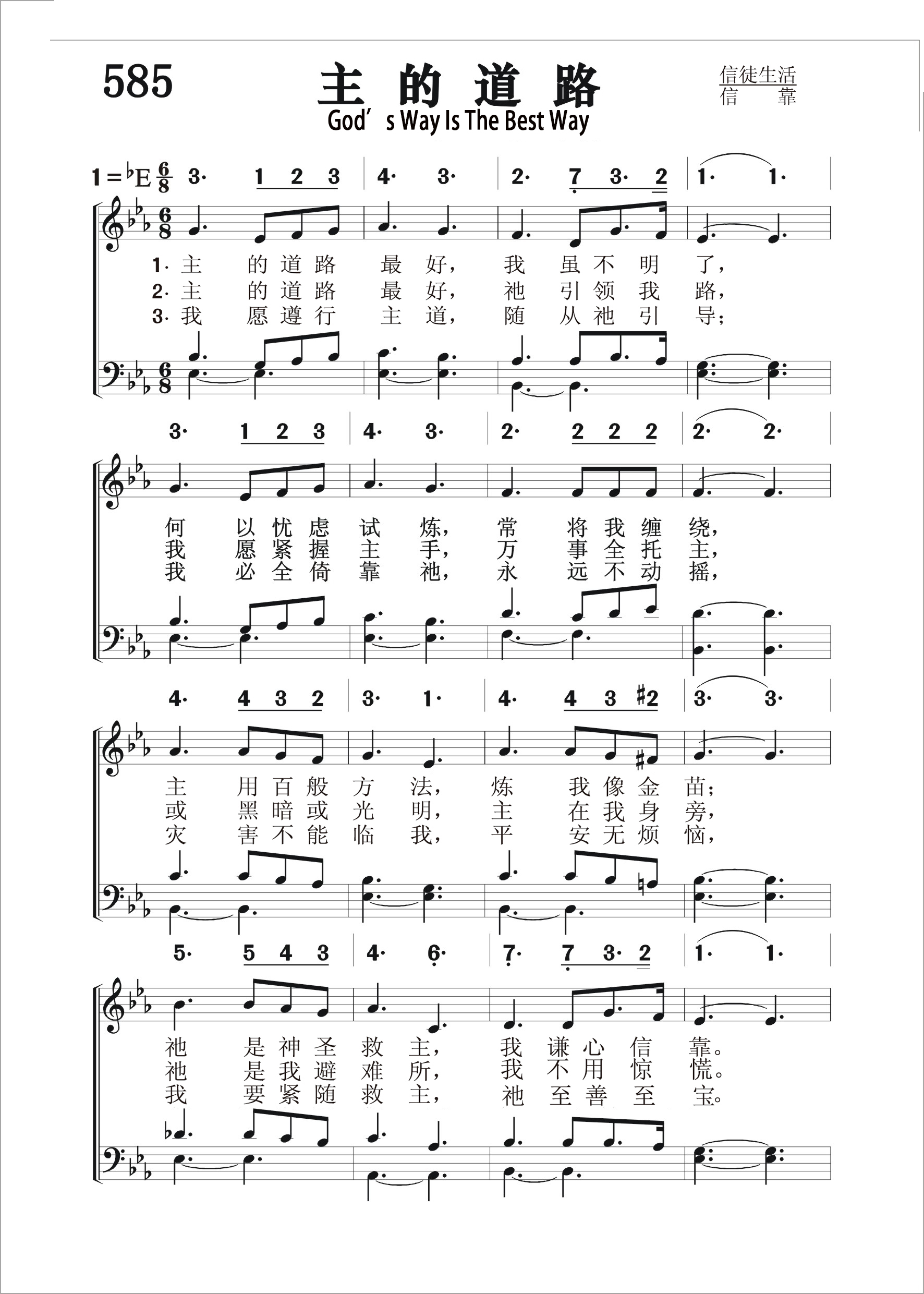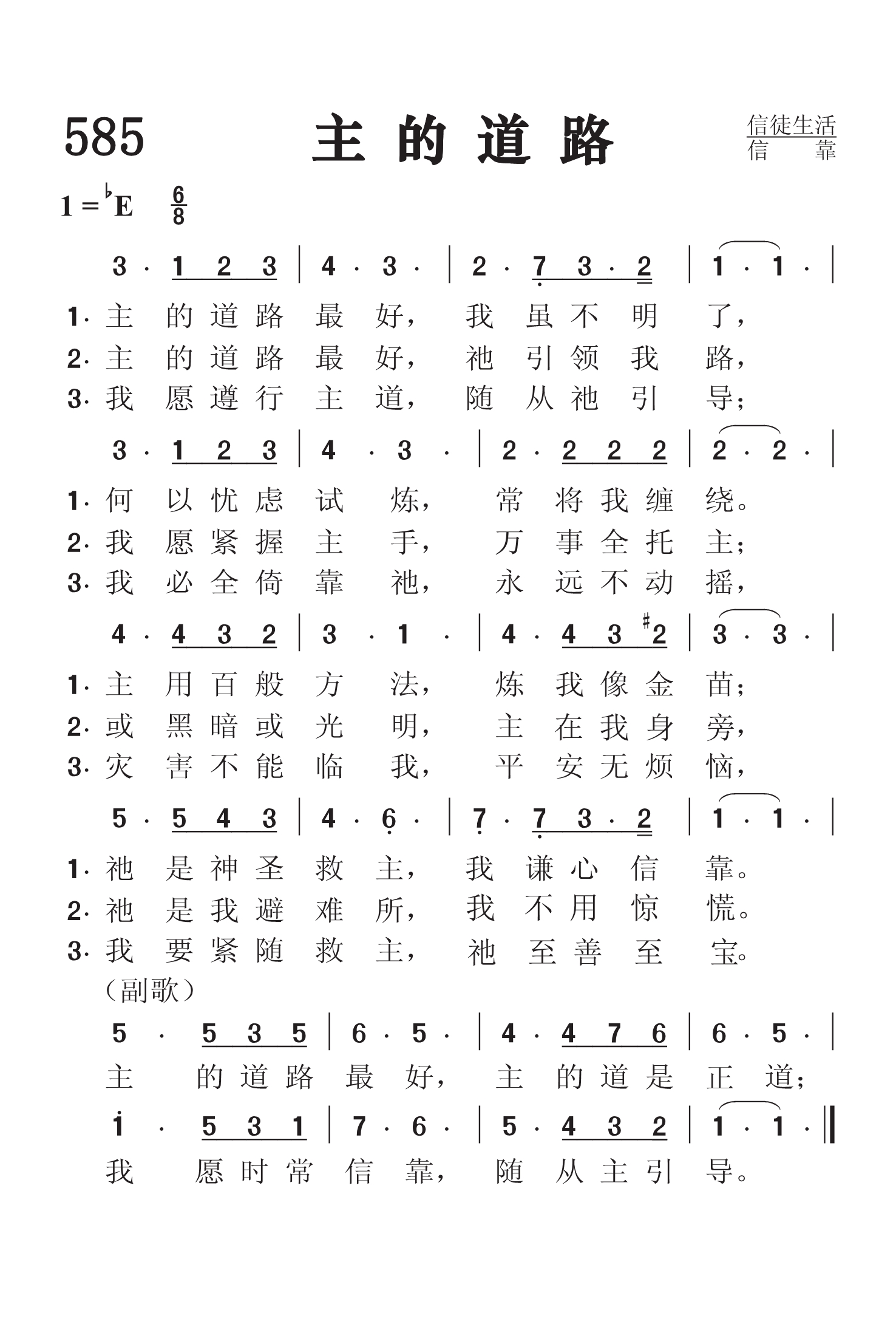 第585首主的道路God’s Way Is the Best Way 丽达.利奇(Lida Shivers Leech,1873,7,12-1962,3,4)作词作曲 主的道路最好,我虽不明了, 何以忧虑试炼,常将我缠绕。 主用百般方法,炼我像金苗; 祂是神圣救主,我谦心信靠。 主的道路最好,祂引领我路, 我愿紧握主手,万事全托主; 或黑暗或光明,主在我身旁, 祂是我避难所,我不用惊慌。 我愿遵行主道,随从祂引导; 我必全倚靠祂,永远不动摇, 灾害不能临我,平安无烦恼, 我要紧随救主,祂至善至宝。 主的道路最好,主的道是正道; 我愿时常信靠,随从主引导。 女作曲家丽达.利奇的童年是在美国的新泽西州度过的。后来她就读于哥伦比亚大学和坦布尔大学。她是坎登市卫理公会教堂的司琴,并担任布道礼拜的伴奏。她一生共创作赞美诗曲调500余首。这首《主的道路》的歌词也是她所写的,表达了她对于救主引导的顺服和信心。第514首《将来主必解释》是丽达.利奇作词的。