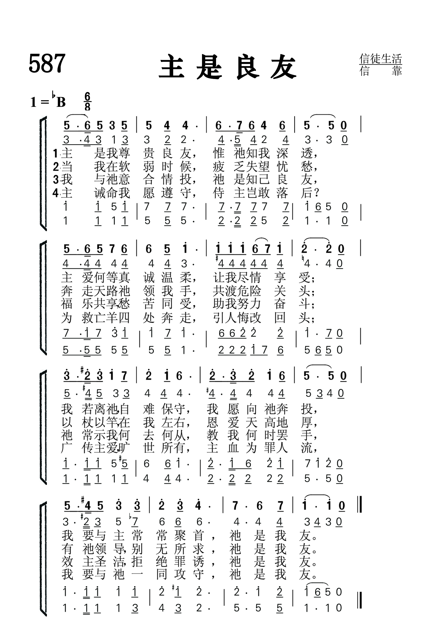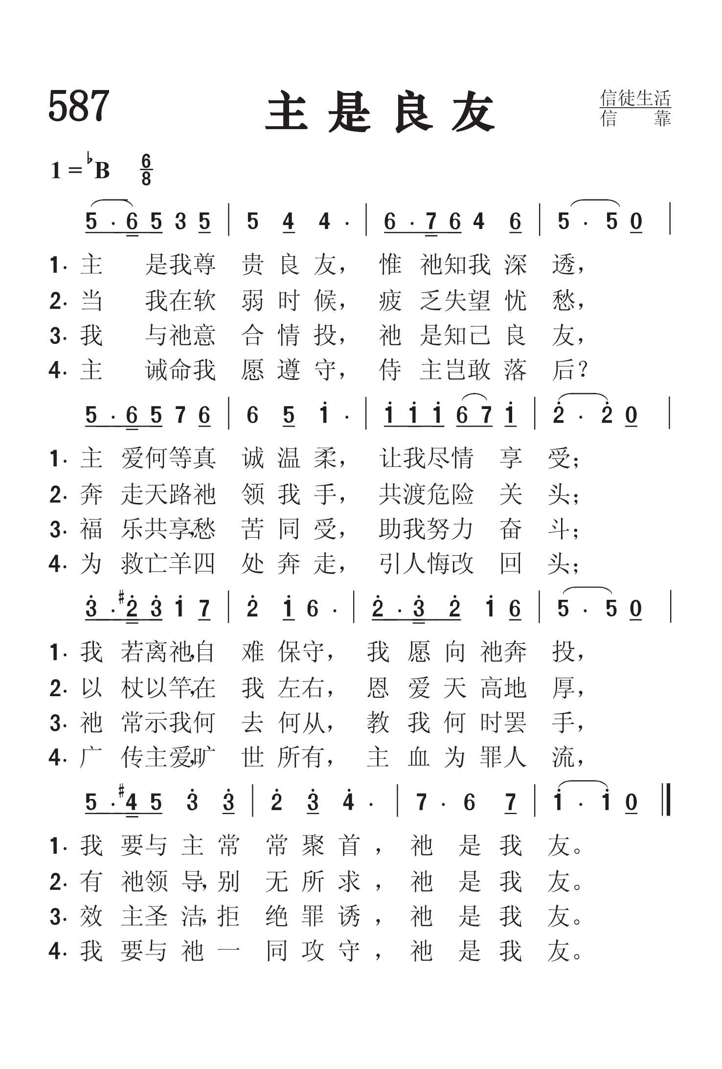 第587首 主是良友He Is My Frisnd 林证耶 作词(写于印度尼西亚) 苏佐扬 作曲(1951年写于香港) 主是我尊贵良友,惟祂知我深透, 主爱何等真诚温柔,让我尽情享受; 我若离祂,自难保守,我愿向祂奔投, 我要与主常常聚首 , 祂是我友。 当我在软弱时候,疲乏失望忧愁, 奔走天路祂领我手, 共渡危险关头; 以杖以竿,在我左右,恩爱天高地厚, 有祂领导, 别无所求,祂是我友。 我与祂意合情投,祂是知己良友, 福乐共享,愁苦同受,助我努力奋斗; 祂常示我何去何从,教我何时罢手, 效主圣洁,拒绝罪诱,祂是我友。 主诫命我愿遵守,侍主岂敢落后? 为救亡羊四处奔走,引人悔改回头; 广传主爱,旷世所有,主血为罪人流, 我要与祂一同攻守, 祂是我友。 词作者林证耶牧师为华人海外传道的先锋,在中国宣教历史上,创下了一项壮举。他自小体弱多病,父母以为他养不活,就撇下了他。但是上帝怜悯他。有一位德国的传教士同情他、收留他,资助他读书,让他读完小学、中学之后,又送他到建道神学院读神学。这位德国传教士为何那么爱林证耶呢?因为他出生于德国这个基督教国家,但却没有在德国听过福音,反而到了中国才听了福音、信了主。他很想报答中国人,栽培能够代替他到中国传福音的人,结果他找了林证耶。林证耶在建道神学院毕业以后,就到海外南洋一带做传道士。他先到锡江学习印度尼西亚语,协助一家华语教会及朱醒魂牧师,后来到了婆罗洲(Borneo,即东加里曼丹)向当地人传福音。 那些当地人尚属半开化的,是杀人、食人、猎人头的民族,非常可怕。但林证耶牧师为着上帝给他的异象与宣召,就和妻子孤单地进到这些深山野岭去。他们进到原始森林里,翻山越岭,在三马林达租了一间小屋,向那些部落传福音。大森林根本没有路,伸手不见五指,白天已被密麻麻的树木围着,根本没路可走。他们就冒着生命危险,进到他们那里,三番四次受到土人的攻击及陷害。他们在那里做了十多年工作。后来一位林光明牧师也进去与他们同工,结果带领了三千多人信主,建立了当地达雅人(Dayak)的教会。那些土人怎样信主呢?他们原先曾得到香港总部每月寄来的生活费。但是第二次世界大战时,一切经济来源停止了。他们逼不得已,在耕田、做小买卖、替人补习中文之外,仍然做传福音的工作。 曲作者苏佐扬牧师出生于香港的九龙,原藉广东。他11岁开始学口琴,12岁学弹风琴,两年之内熟背二百多首圣诗曲谱后,14岁开学作曲。其后又学会了十余种中西乐器。当年宋尚节、赵君影等名牧布道会时,常请他司琴或领唱。16岁,他在宋尚节博士初来香港布道时,决志献身。18岁进入山东华北神学院念神学。 苏佐扬于1937年毕业于山东华北神学院,毕业后,日本战事开始,自1937-1948年间在中国十九省奔驰为主作工,经历许多困难,但从不灰心。先在中国各省自由传道,30岁在甘肃被按立为牧师,1948年终返香港,先后在香港、澳门两地牧会、教学四年。 1953年春,他辞去了受薪的职务,开始过信心的生活,准备去海外为主作工,当时他亲友都为他担心“一家七口何以养生”?神赐给他两句话:“红海面前自有路,约但河边不需桥”,神的话永远有效。自1953-1961年间,他足迹遍日本、菲律宾、新几内亚、澳大利亚、新加坡、马来西亚、泰国、越南、印度尼西亚等地。1962-1976年间,他在欧美四十六国家及地区向华人布道。他有语言天份,能用英语、普通话、广东话,闽南语、潮州话、客语及上海话讲道。此外他也懂十多种欧亚语言。他的座右铭是“只对主忠心,不问人褒贬”。 苏牧师凭信心于1942年创办《天人之声季刊》及1963年开办“天人神学院”(现只办海外函授科)。至今他已出版了卅多种书籍,他用圣书经文谱写了许多短歌,约有五百首,他立志要将音乐的恩赐为主所用,除短歌外,尚作有天人圣诗二百二十首。