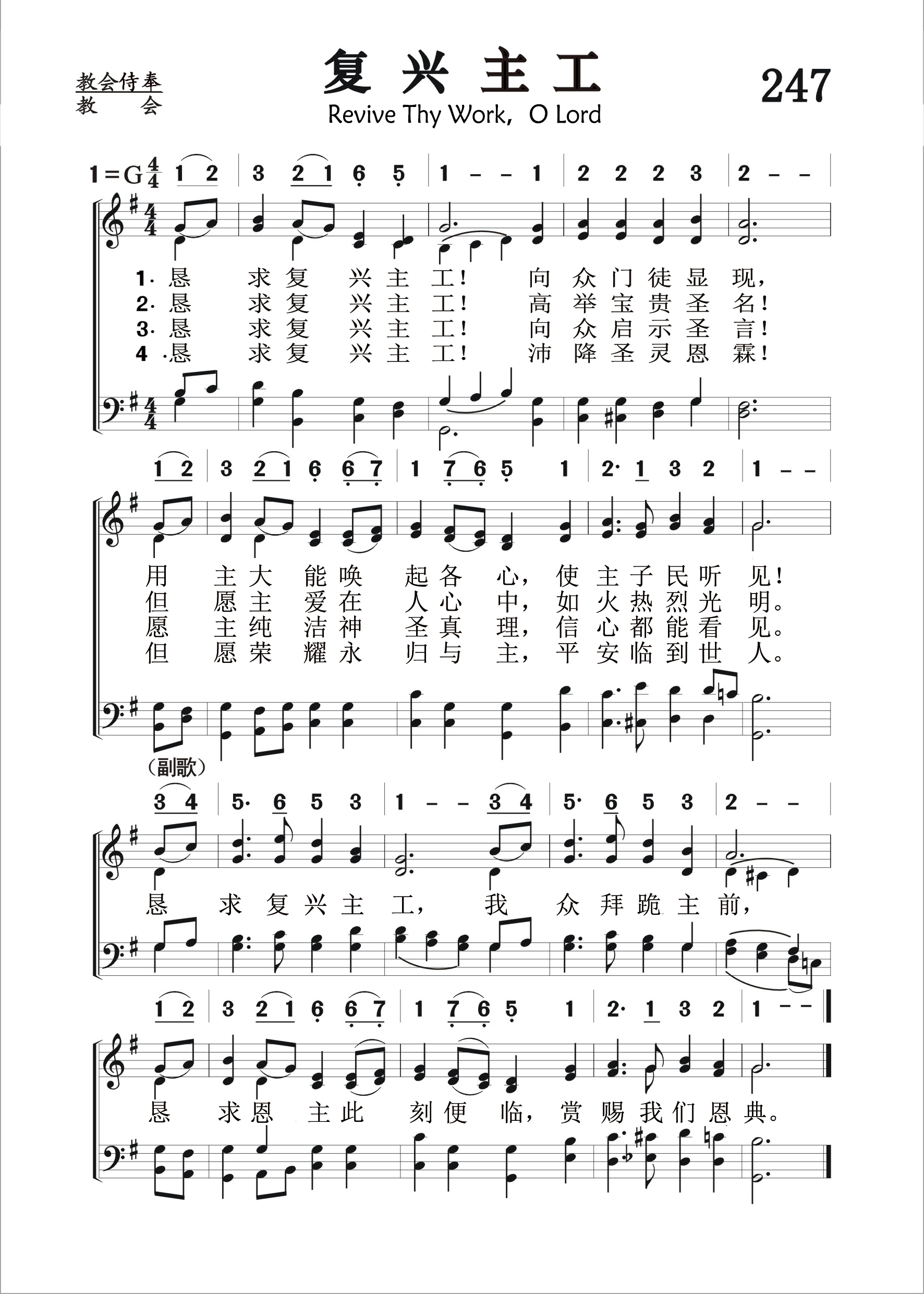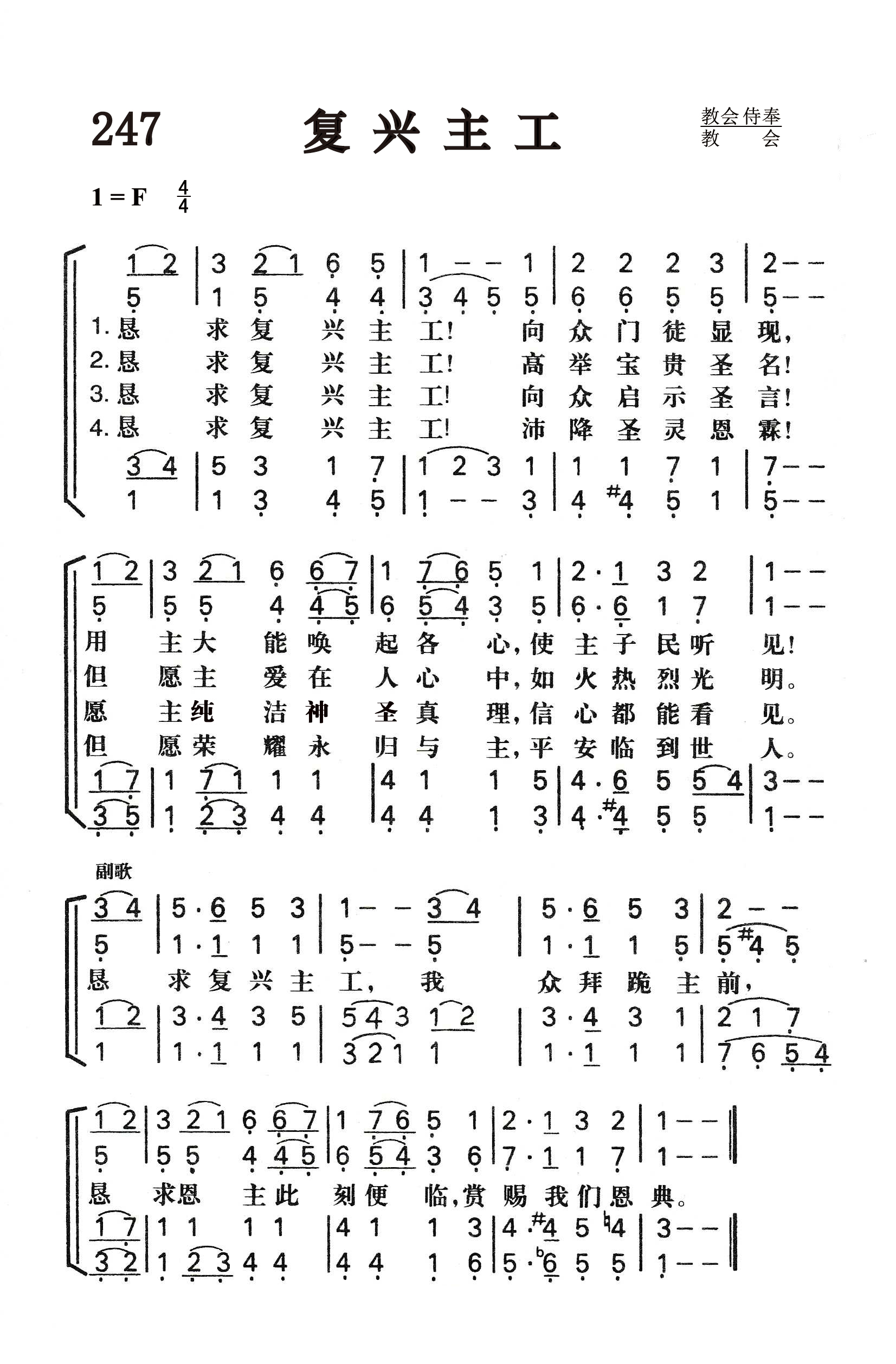第247首 复兴主工Revive Thy Work,O Lord 米德莱恩(Albert Midlane,1825,1,23-1909)作词(1860年),克罗斯比改编,多恩(William H.Doane,1832,2,3-1915,12,23,见第30首介绍)作曲 恳求复兴主工!向众门徒显现, 用主大能唤起各心,使主子民听见! 恳求复兴主工! 高举宝贵圣名! 但愿主爱在人心中,如火热烈光明。 恳求复兴主工! 向众启示圣言! 愿主纯洁神圣真理,信心都能看见。 恳求复兴主工!沛降圣灵恩霖! 但愿荣耀永归与主,平安临到世人。 本诗的词作者是英国普利茅斯弟兄会的米德莱恩。他出生于英国,很小就被父亲抛弃。虔诚的母亲把他抚养成人。他自幼喜欢写诗。九岁就能出口成章。一位主日学的教员鼓励他写作,帮助他修改和出版。长大以后,家境困难,他以打铁为业。后来他参加了弟兄会,倍加热心,严于律己。他一生共写过五百余首圣诗。因感戴自己曾得到主日学教员的帮助,他特别重视为儿童写作。 米德莱恩晚年生活穷困。英国许多儿童为感谢他所写这么多优美的诗歌,就为他举行一次大募捐。 《复兴主工》是米德莱恩根据先知哈巴谷的祷告:“耶和华啊,求你在这些年间复兴你的作为”(哈3:2)写成的,最先发表在1860年出版的《布道者圣诗集》。副歌是克罗斯比后加的。曲调是多恩应桑基之约特为本诗所谱的,选入桑基所编的《圣诗与独唱》。 克罗斯比是美国才华出众,负有盛名的福音女诗人。她出生六个月时因庸医,误诊而双目失明。15岁时她就读于纽约最早的一所盲童学校。1847-1858年,她留在该校教授英语语法,修辞学,罗马史和美国历史。她少年时代就开始写诗,24岁时出版了《盲女与她的诗》,引起美国文坛的注意。1850年灵性奋兴的经验,使她集中全力专写圣诗,后在福音圣诗作曲家和编辑布雷得伯里的鼓励下,立志以创作福音圣诗作为自己的终生事业,于是与纽约一家出版社签订合同,每周写圣诗三首,结果写了5929首。此外,她还为布利斯写525首,为桑基写237首,为劳里写219首,为多恩写1500首。她一生共写了8440首圣诗,堪称为最多产的圣诗作家。 曲作者多恩是富有才华的音乐家,克罗斯比的多年合作者。他出生于美国康涅狄格州普理斯顿市,14岁就带领唱诗班,青年时代与他父亲经营布店,以后转任机器厂厂商。因他服务态度很好,受到市民的欢迎,曾被选为市政委员。他业余为福音圣诗谱曲达二千多首。其中有不少经典之作。