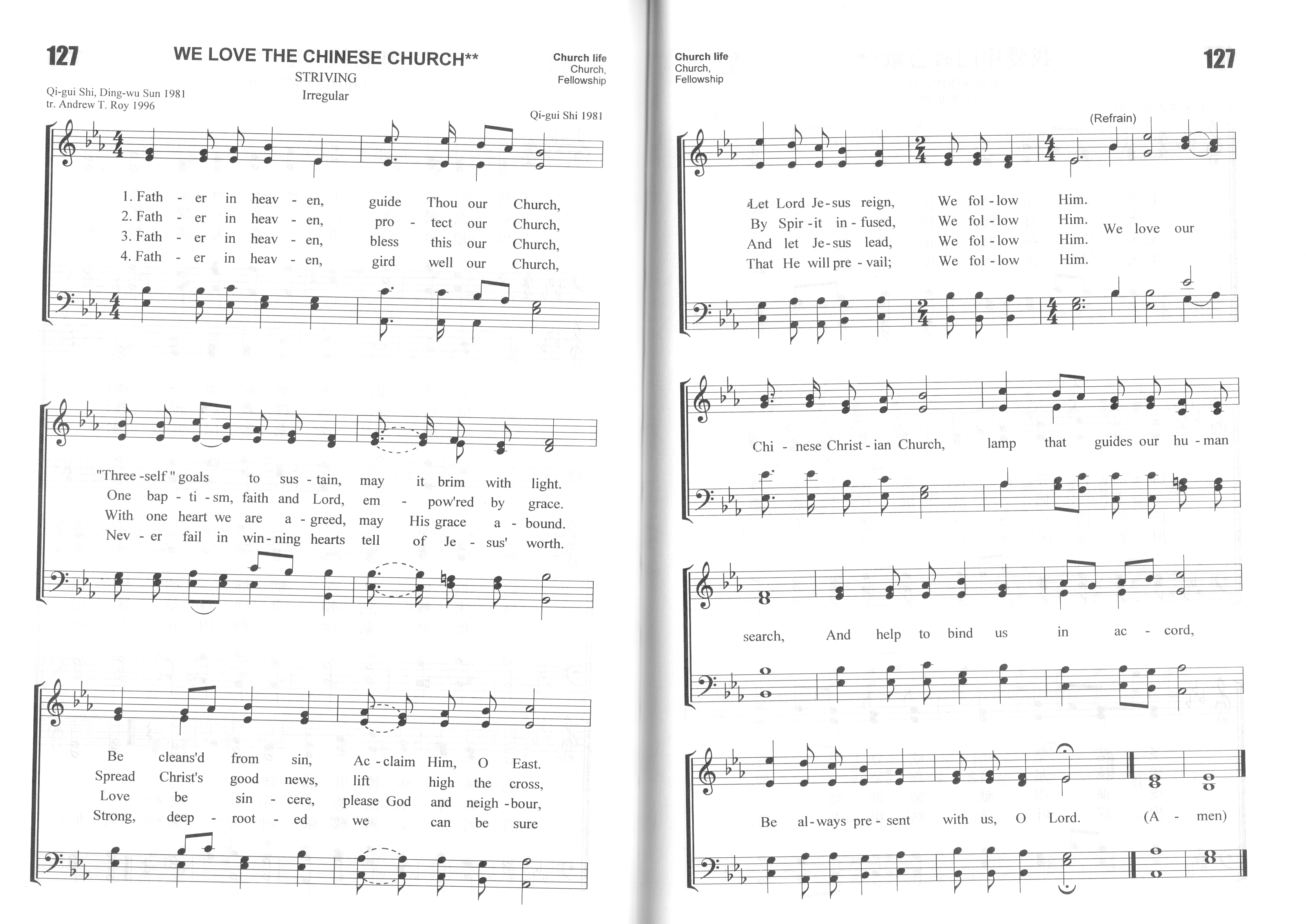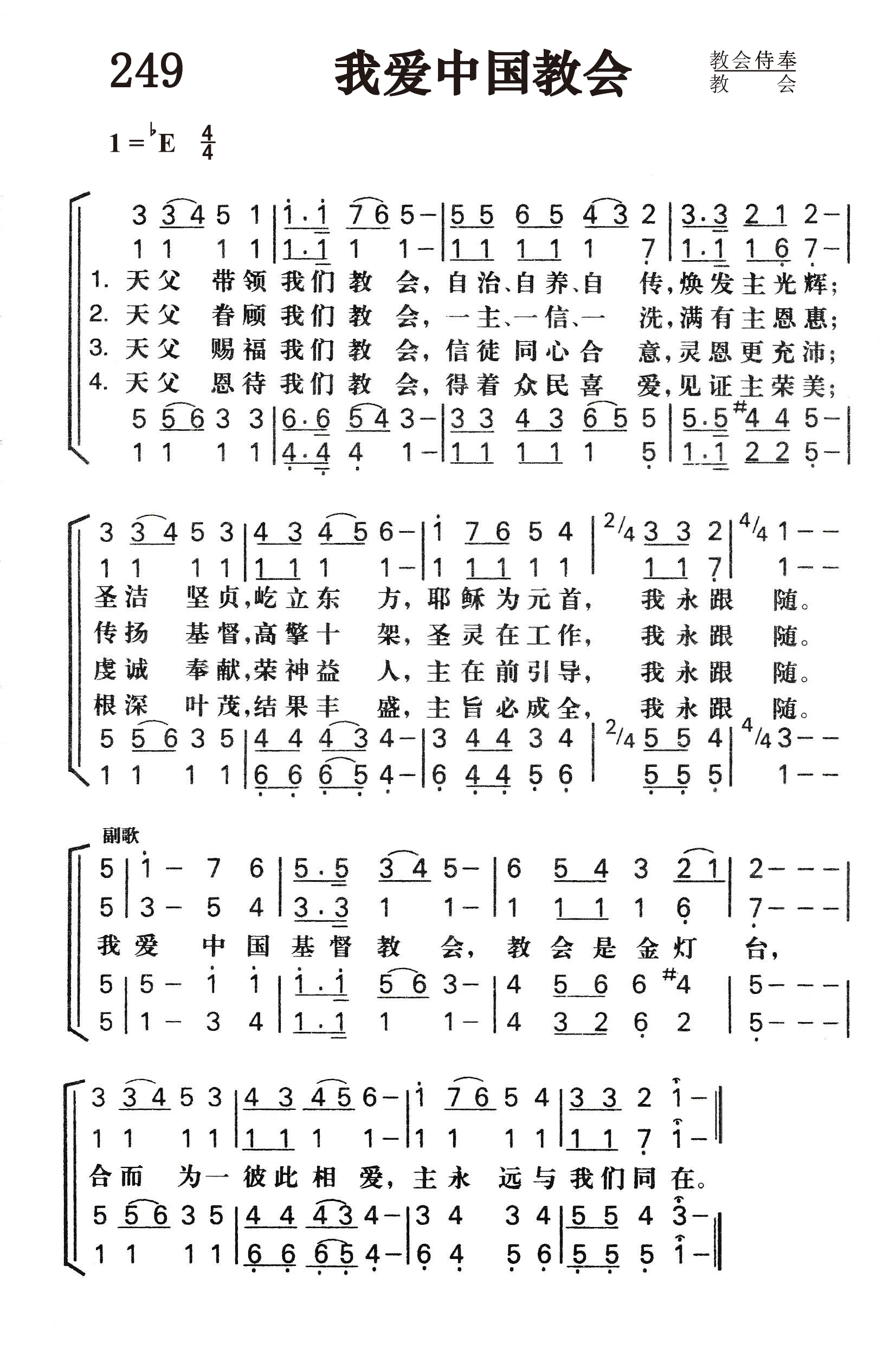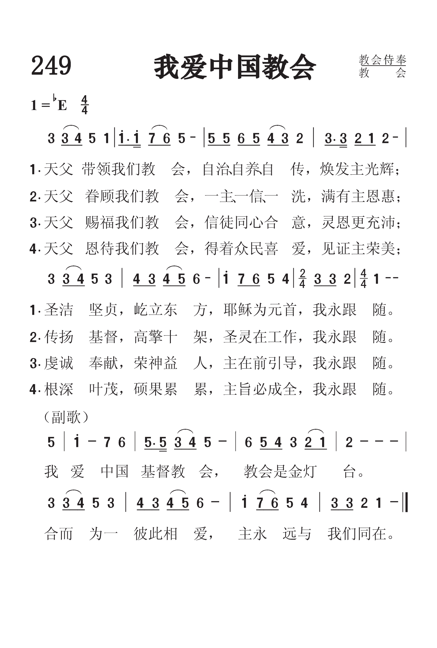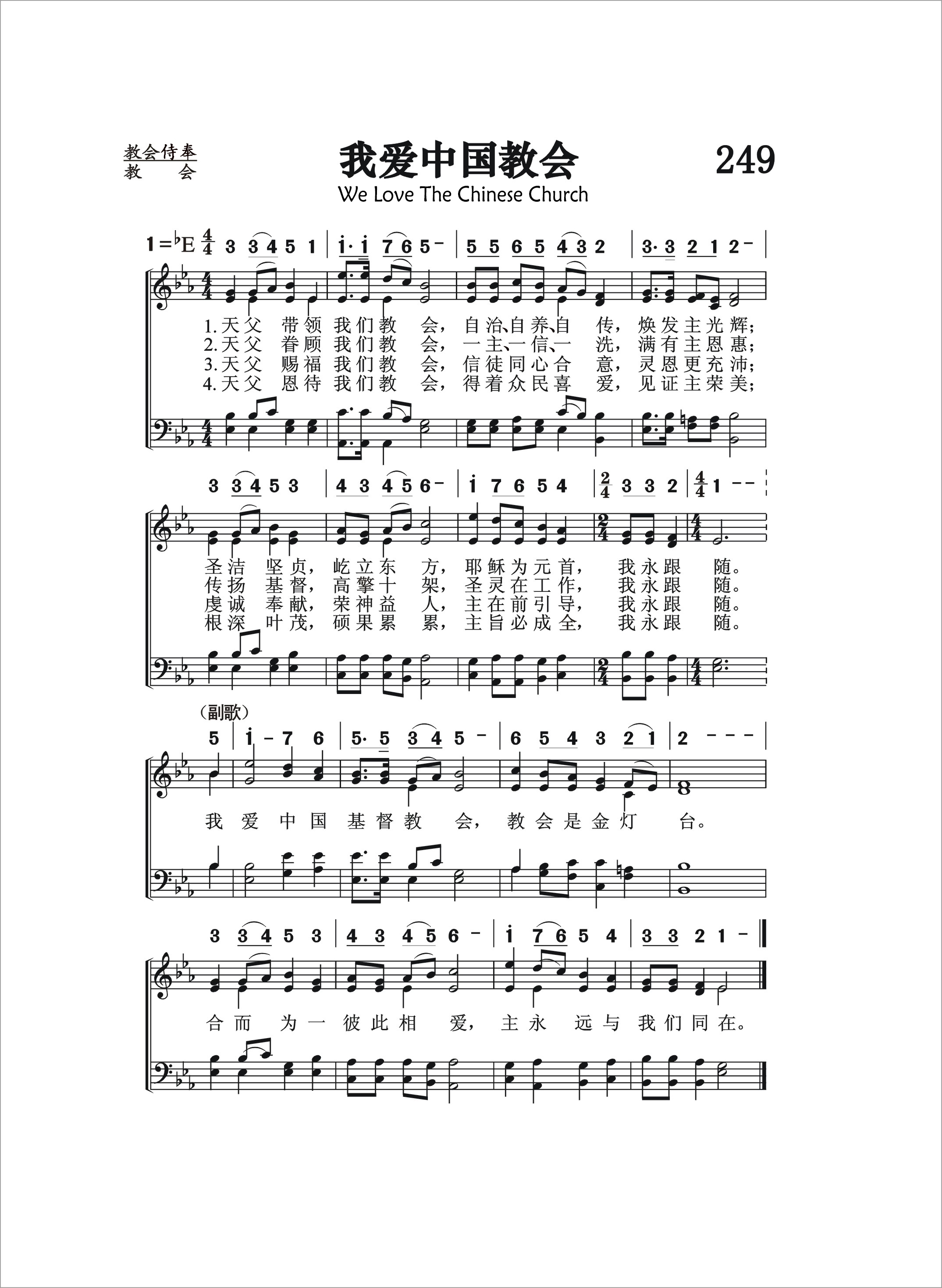 第249首 我爱中国教会We Love the Chinese Church 史奇圭(1929-),孙定武(1941-) 作词(1981年),史奇圭 作曲(1981年) 天父带领我们教会,自治自养自传,焕发主光辉; 圣洁坚贞,屹立东方,耶稣为元首,我永跟随。 天父眷顾我们教会,一主一信一洗,满有主恩惠: 传扬基督,高擎十架,圣灵在工作,我永跟随。 天父赐福我们教会,信徒同心合意,灵恩更充沛: 虔诚奉献,荣神益人,主在前引导,我永跟随。 天父恩待我们教会。得着众民喜爱.见证主荣美; 根深叶茂,硕果累累,主旨必成全,我永跟随。 我爱中国基督教会,教会是金灯台。 合而为一彼此相爱,主永远与我们同在。 史奇圭出生于苏州的一个基督徒家庭。父亲史襄哉教授曾任《普天颂赞》编辑委员。史奇圭自幼爱好音乐,1953年毕业于金陵神学院,后在上海教会工作。1955年被按立为牧师。1980年以后参加《赞美诗》新编的编辑部工作,并任沐恩堂的主任牧师。1992年当选为中国基督教协会第三届常委。他的圣诗创作甚丰,其中不乏优秀之作。 《我爱中国教会》是史奇圭为上海黄浦区基督教代表大会的召开而创作的。原来只有一节。2-4节是沐恩堂唱诗班成员孙定武后来补写的。