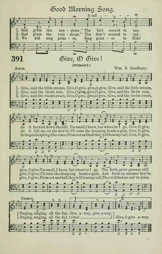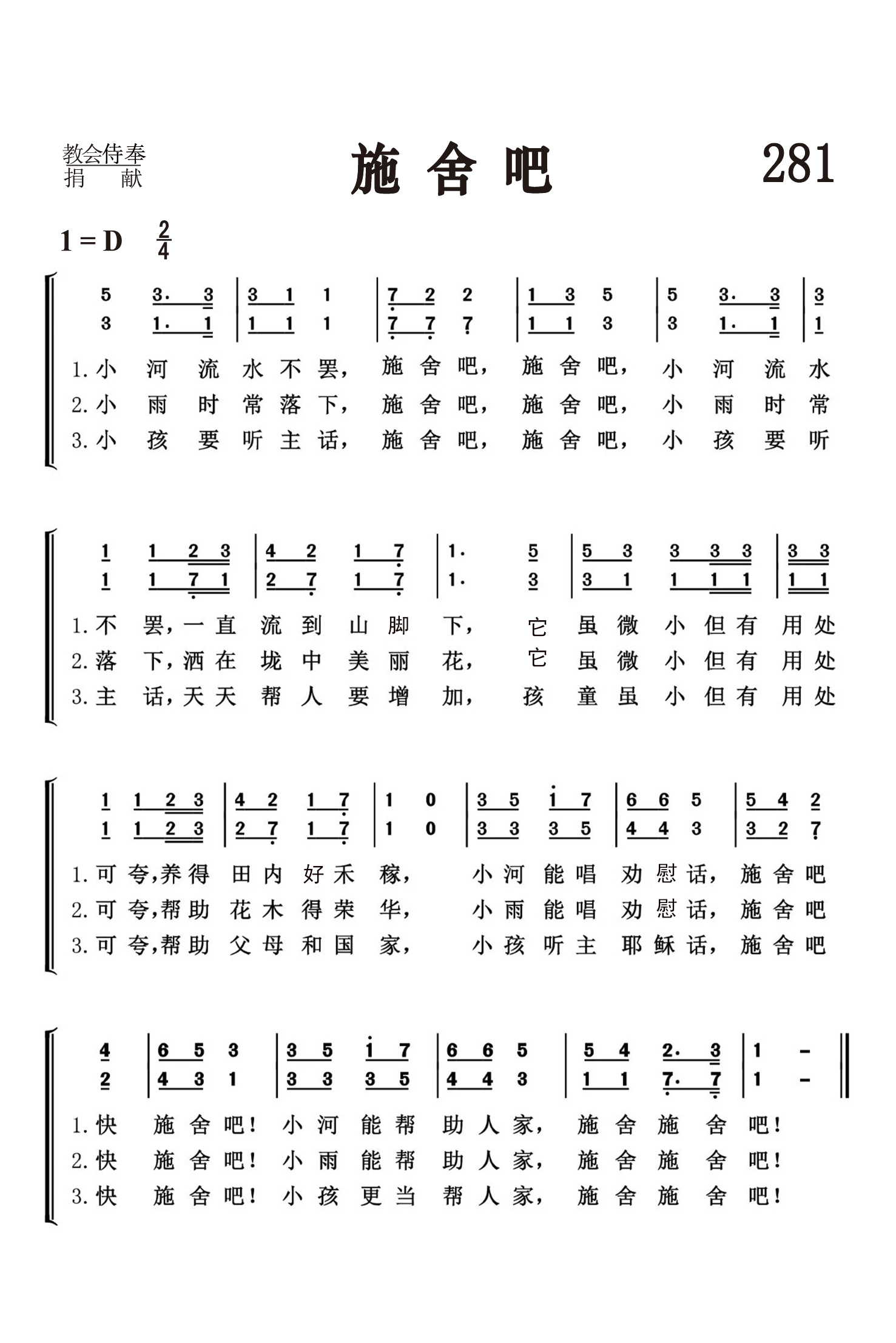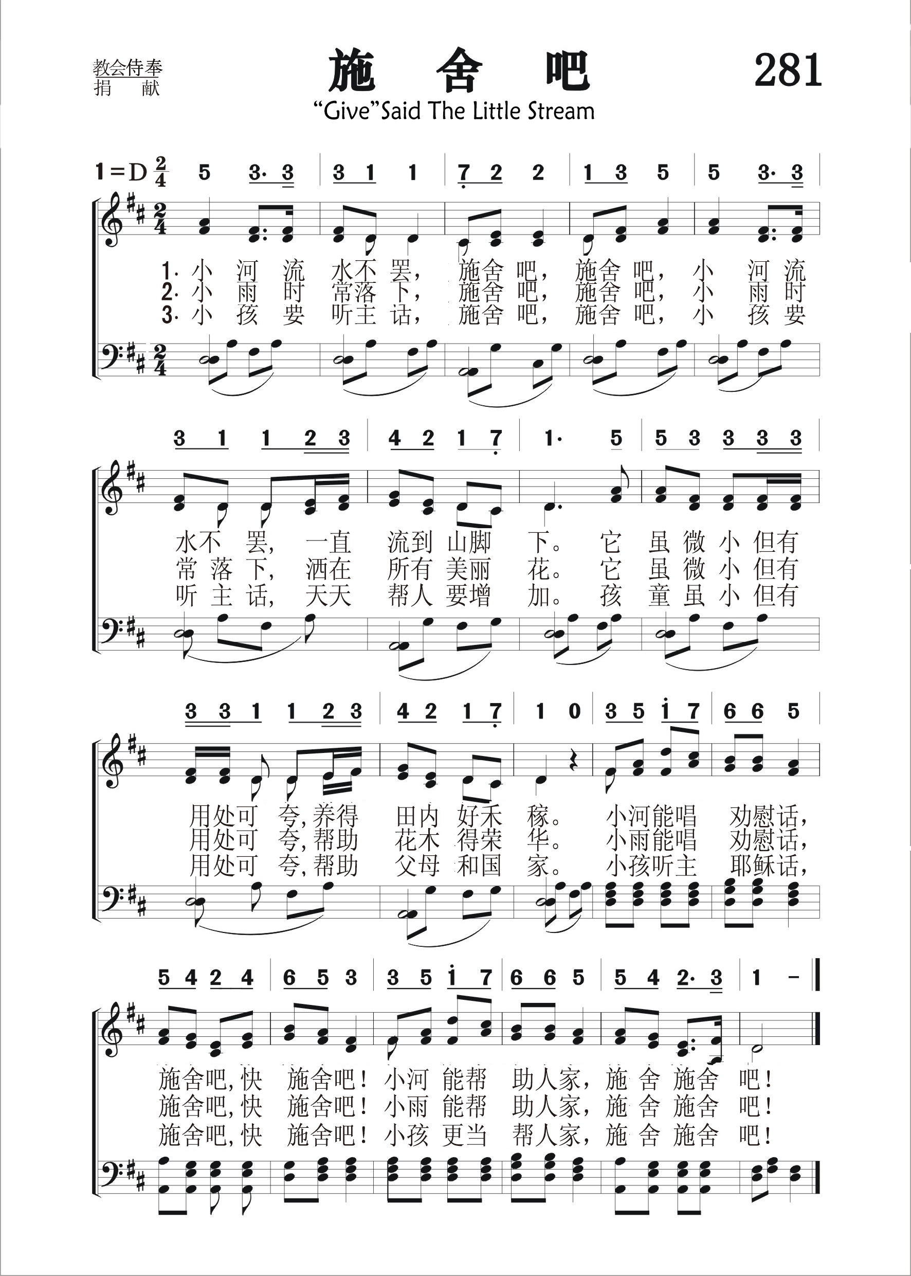 第281首施舍吧 “Give”Said the Little Stream 克罗斯比 (1820-1915年),布雷德伯里(W.B.Bradbury,1816,10,6-1868,1,8)作曲 小河流水不罢,施舍吧,施舍吧, 小河流水不罢,一直流到山脚下, 它虽微小,但有用处可夸,养得田内好禾稼。 小河能唱劝慰话.施舍吧,快施舍吧l 小河能帮助人家,施舍施舍吧! 小雨时常落下.施舍吧,施舍吧, 小雨时常落下,洒在所有美丽花。 它虽微小但有用处可夸,帮助花木得荣华。 小雨能唱劝慰话,施舍吧,快施舍吧! 小雨能帮助人家,施舍施舍吧! 小孩要听主话.施舍吧.施舍吧, 小孩要听主话,天天帮人要增加。 孩童虽小但有用处可夸,帮助父母和国家。 小孩听主耶稣话,施舍吧,快施舍吧!小 孩更当帮人家.施舍施舍吧! 这是一首儿童的赞美诗。诗歌以涌流不息,施舍不停的小河为比喻,说明施比受更为有福的伟大真理。小孩若能从小听从主的话语,助人为乐,尽已所能地作有益于他人的事情,他们一定能蒙受更大的福气。 词作者克罗斯比是美国才华出众,负有盛名的福音女诗人。她出生六个月时因庸医,误诊而双目失明。15岁时她就读于纽约最早的一所盲童学校。1847-1858年,她留在该校教授英语语法,修辞学,罗马史和美国历史。她少年时代就开始写诗,24岁时出版了《盲女与她的诗》,引起美国文坛的注意。1850年灵性奋兴的经验,使她集中全力专写圣诗,后在福音圣诗作曲家和编辑布雷得伯里的鼓励下,立志以创作福音圣诗作为自己的终生事业,于是与纽约一家出版社签订合同,每周写圣诗三首,结果写了5929首。此外,她还为布利斯写525首,为桑基写237首,为劳里写219首,为多恩写1500首。她一生共写了8440首圣诗,堪称为最多产的圣诗作家。 曲作者布雷德伯里出生于美国缅因州约克。他14岁以前没有接触过风琴,钢琴。1830年随家迁往波士顿,才接触这些乐器。他参加了梅森的唱诗培训班,后来与梅森在师范研究所共事。他在工作中表现了杰出的音乐天才,曾任浸信会数个会堂的管风琴师和唱诗班指挥,待遇菲薄,年薪仅25美元,但他却毫不计较。他后来到纽约教儿童唱歌,并向中学生介绍音乐,讲解乐理。1847年他获得机会去德国深造,跟名师学习,返美后专任音乐教师。他在1841-1867的二十六年时间里,平均每年出两本赞美诗集,总计59本,销量达二百万册以上。 1854年,他自己成立钢琴制造厂。1917年该厂并入纳普音乐工厂。他所编写的许多音乐书籍和圣诗曲调,已在世界各地广泛流传。