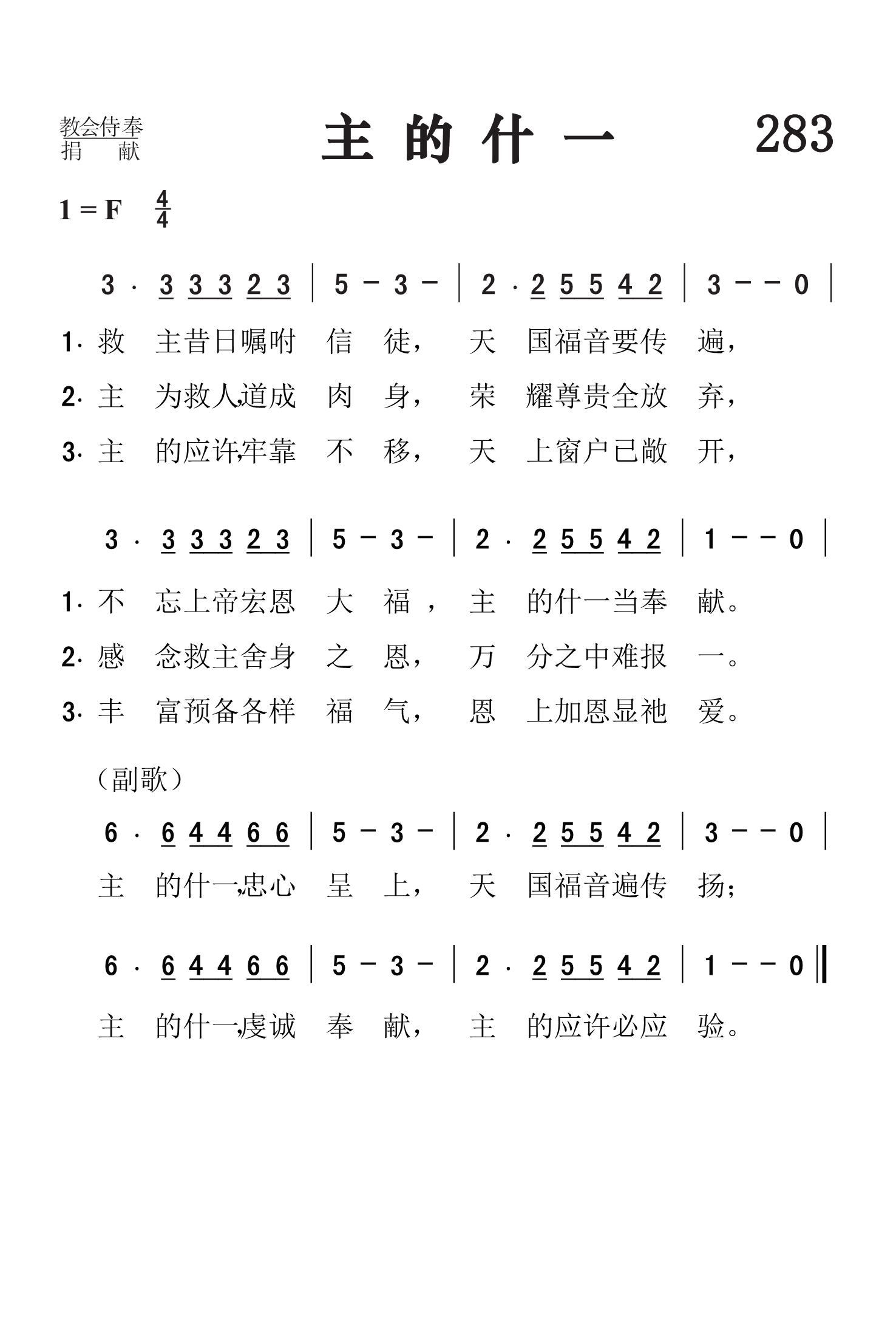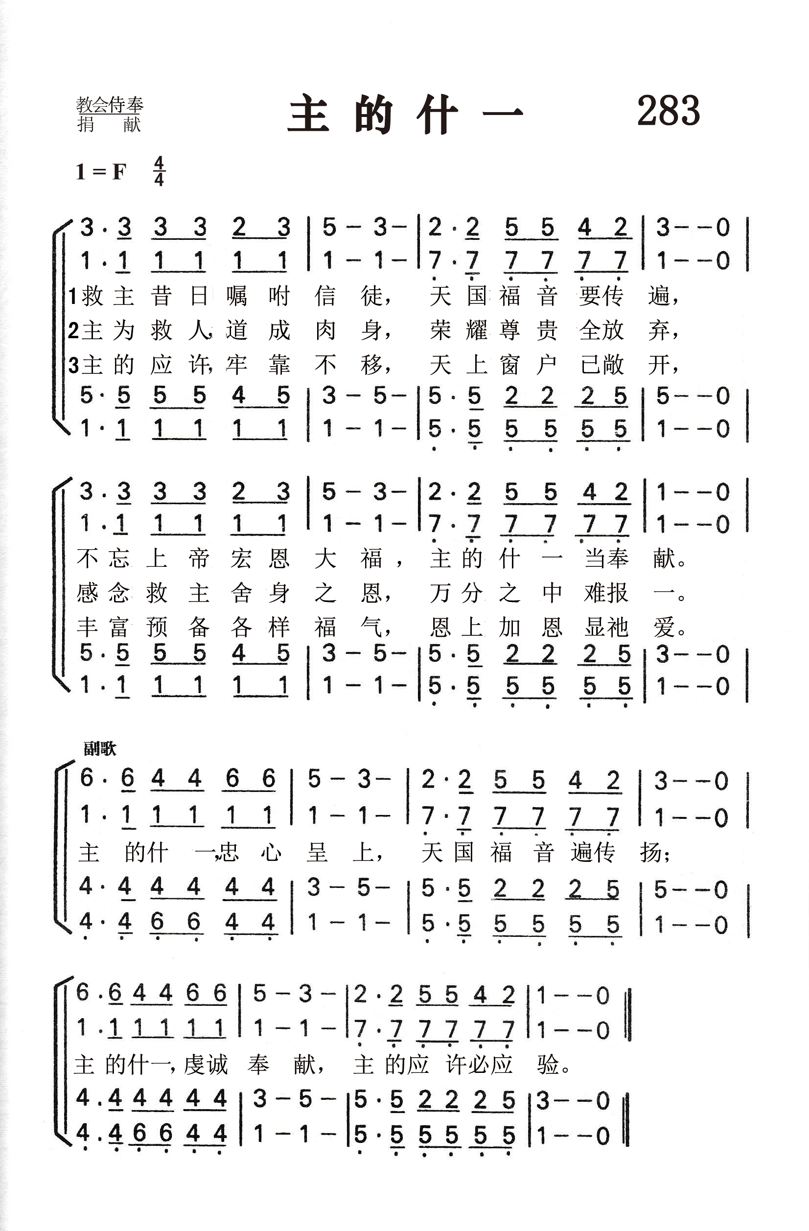 第283首主的什一The Lord’s Tithe 布利斯(P.P.Bliss 1838,7,9-1876,12,29)作曲 救主昔日嘱咐信徒,天国福音要传遍, 不忘上帝宏恩大福 , 主的什一当奉献。 主为救人,道成肉身, 荣耀尊贵全放弃, 感念救主舍身之恩,万分之中难报一。 主的应许,牢靠不移, 天上窗户已敞开, 丰富预备各样福气,恩上加恩显祂爱。 主的什一,忠心呈上, 天国福音遍传扬; 主的什一,虔诚奉献, 主的应许必应验。 这首诗歌的主题是提醒人交纳十分之一的神圣义务,好让主所应许的福气降临在每一个基督徒身上。本诗的词作者不详。 圣诗音乐家布利斯原是美国卫理公会的平信徒。他出身贫寒,但生性酷爱音乐。在他10岁的时候,有一天被一所房子里传出来的风琴声所吸引,就贸然进去,要求里面的阔太太再弹一曲,竟然因他衣杉褴褛而被赶出去。但他仍不灰心,继续学习唱歌和作曲。他曾谱了一首曲子寄给音乐家鲁特,请求指点,并要求鲁特:如果认为这首歌写得还可以,就送给他一支笛子,因他实在买不起。鲁特不但送他笛子,还写了一封信,鼓励他努力自学。 布利斯先是在一所木刻镜框商店做学徒,同时业余继续自学音乐。后来,他终于考上纽约市的音乐师范大学。毕业后,他搬到芝加哥,以他的音乐天赋事奉上帝,在教会中教唱诗班,自己编曲。谱曲,并且还独唱,然后再教会众齐唱。他的嗓音优美动听,音域宽广,唱起歌来很容易感动人。布利斯写圣诗的特点是主题广泛,灵感丰富,词曲并茂,通俗易晓。一件偶然的事故,一篇动人的故事,一次讲道的感受,一节经文的启发,都可以成为他的题材。有时是主题,歌词,旋律于刹那间同时在脑海中形成。比如他听见牧师讲约翰福音第三章16节的讲题后,便写成了一首《进恩门》(《颂赞诗歌》127首)的名歌。他先随惠特尔在美国各地布道,以后自编《福音诗歌》,并与桑基合编《圣诗与独唱》。他将稿费所得全部捐给了布道团。1876年因火车失事,他为营救他的夫人及孩子而遇难。他在世的时间虽然短暂,但他没有辜负上帝的托付,留下了很多福音圣诗。 1876年,布利斯夫妇在美国俄亥俄州因火车失事遇难。