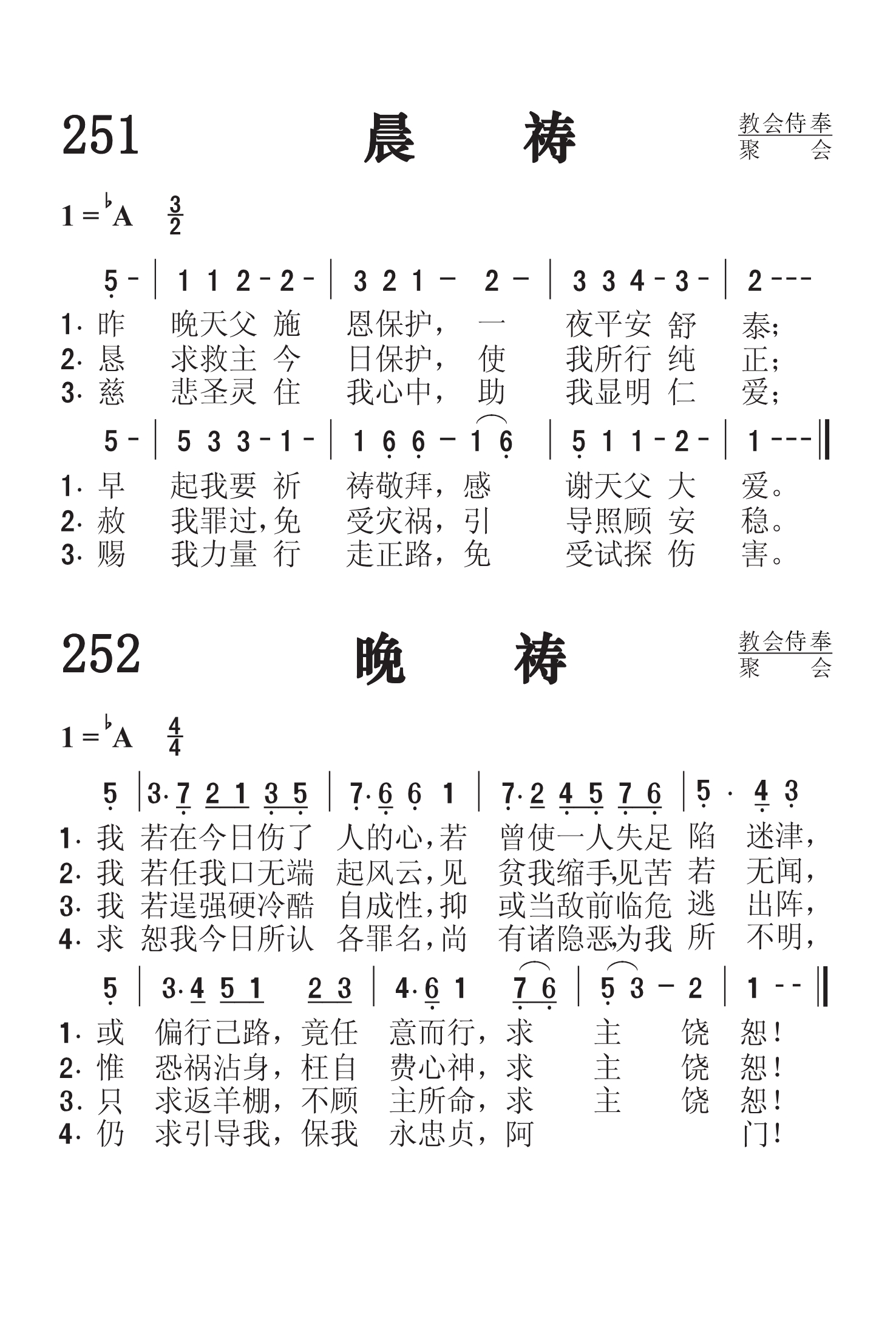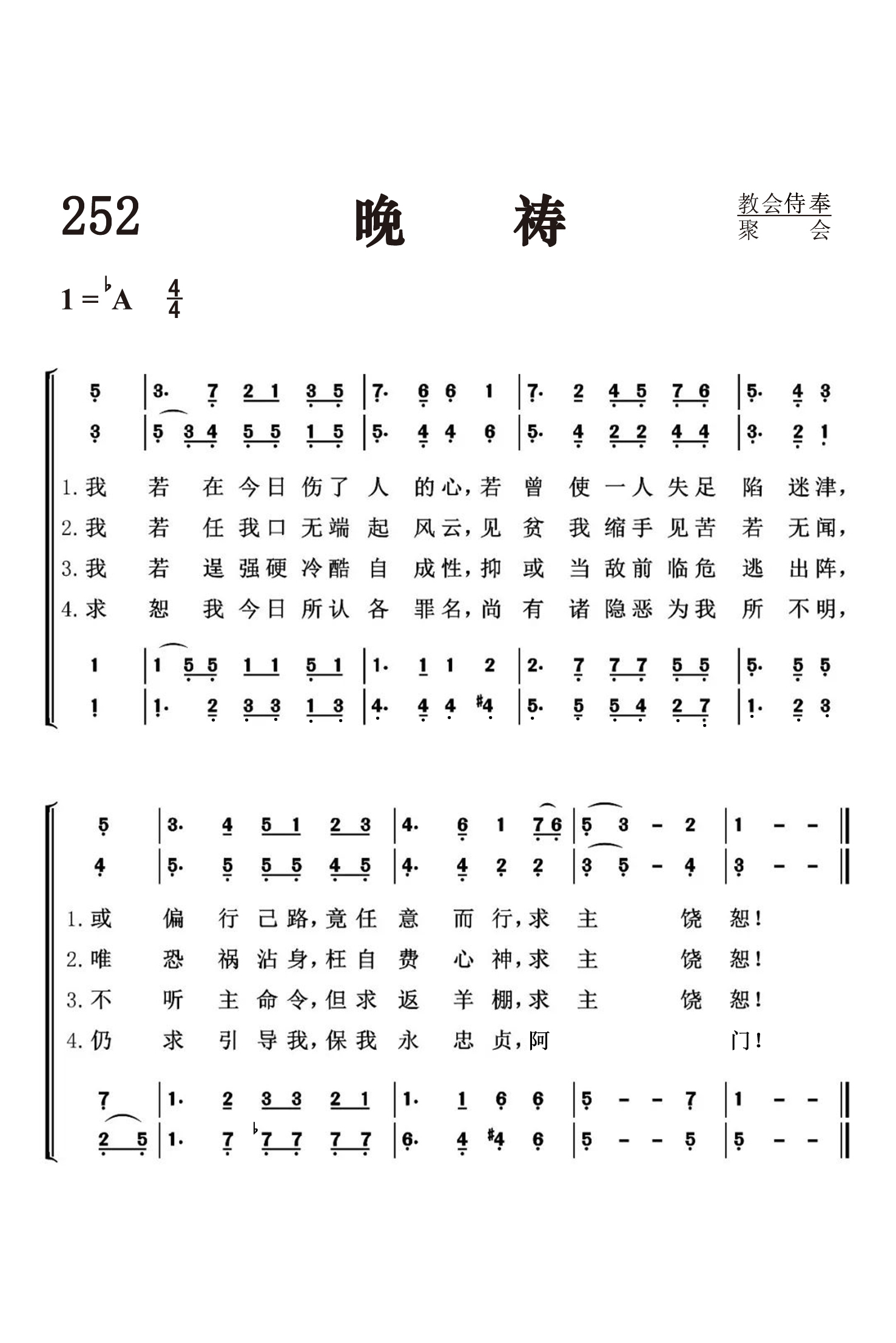 第252首 晚祷If I Have Wounded Any Soul Today 巴特斯比(C.M.Battersby)作词,加布里埃尔(C.H.Gabriel,1856,8,18-1932,9,15)改编并作曲(1911年) 我若在今日伤了人的心,若曾使一人失足陷迷津, 或偏行己路,竟任意而行,求主饶恕。 我若任我口无端起风云,见贫我缩手见苦若无闻, 惟恐祸沾身,枉自费心神,求主饶恕。 我若逞强硬冷酷自成性,抑或当敌前临危逃出阵, 只求返羊棚,不顾主命令,求主饶恕。 求恕我今日所认各罪名,尚有诸隐恶为我所不明, 仍求引导我.保我永忠贞,阿们。 这首优美的晚祷诗歌吐露了每一个虔诚基督徒的心声和期盼。当夜幕徐徐下降之际,我们屈膝在主的面前,对一天的生活进行认真的反省。我们有没有因非基督化的言行而使主的名受到亏损?我们有没有在考验和试探中失败,而让我们的主伤心,使祂的伤痕重新受创?我们需要再次仰望主的怜悯。求祂赦免我们的罪孽,使我们与祂的交流重新畅通无阻,使我们带着赦罪的平安进入梦乡。 加布里埃尔是20世纪20年代美国布道团中最受欢迎的自学成才歌唱家和作曲家。他在美国南方衣阿华州农场中长大,平生爱音乐,好唱歌,自己在家里学习,在一架破旧的小风琴上弹奏。16岁时就自告奋勇到附近音乐学校教唱,成绩显著,不久被正式聘为教员。从此,他更努力学习,精益求精,终于成为一个有名的作曲家,业余时间还兼任旧金山一个卫理公会礼拜堂的音乐指导。1895年迁居芝加哥,继续写作、编曲,曾编印出版过好几本乐谱。