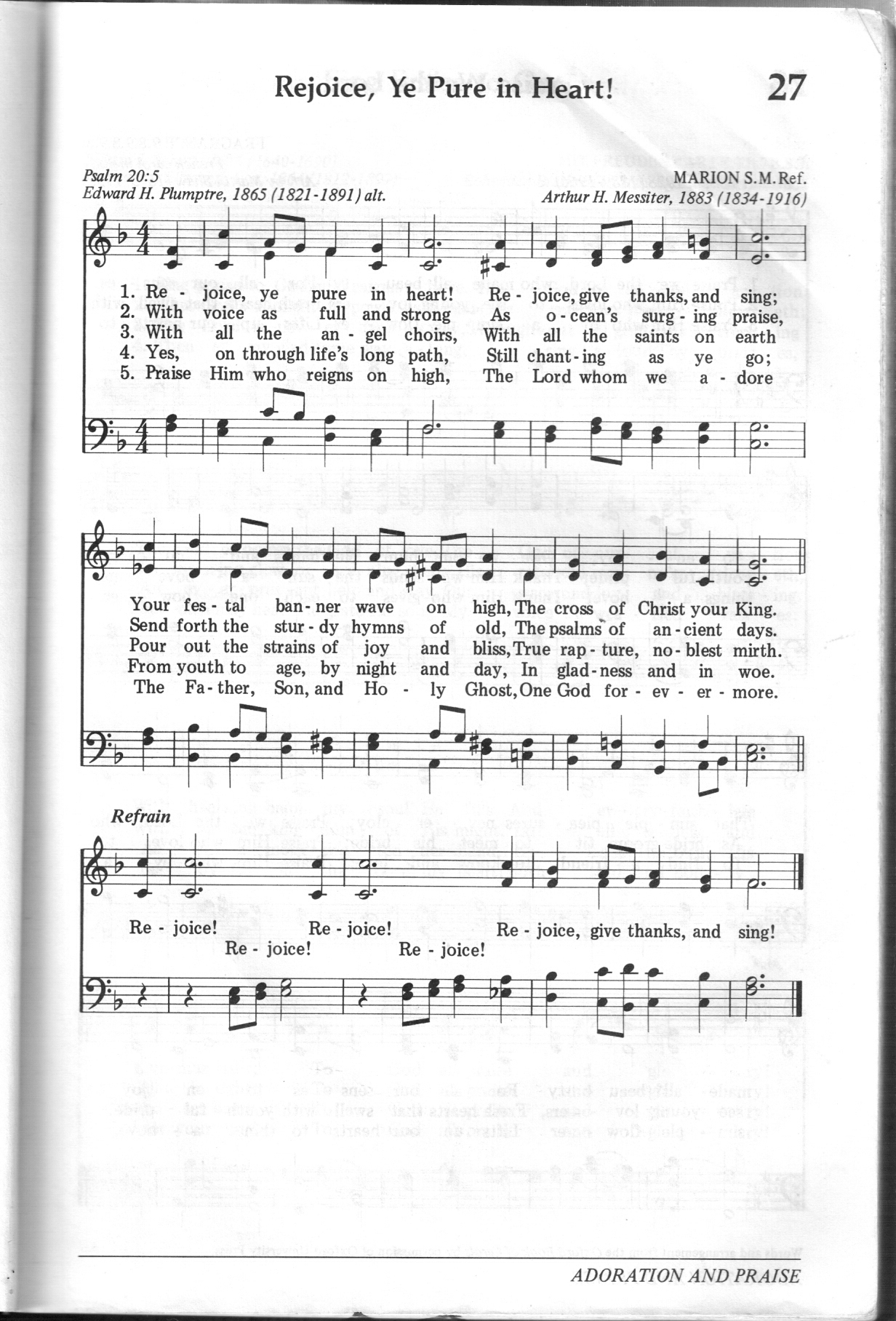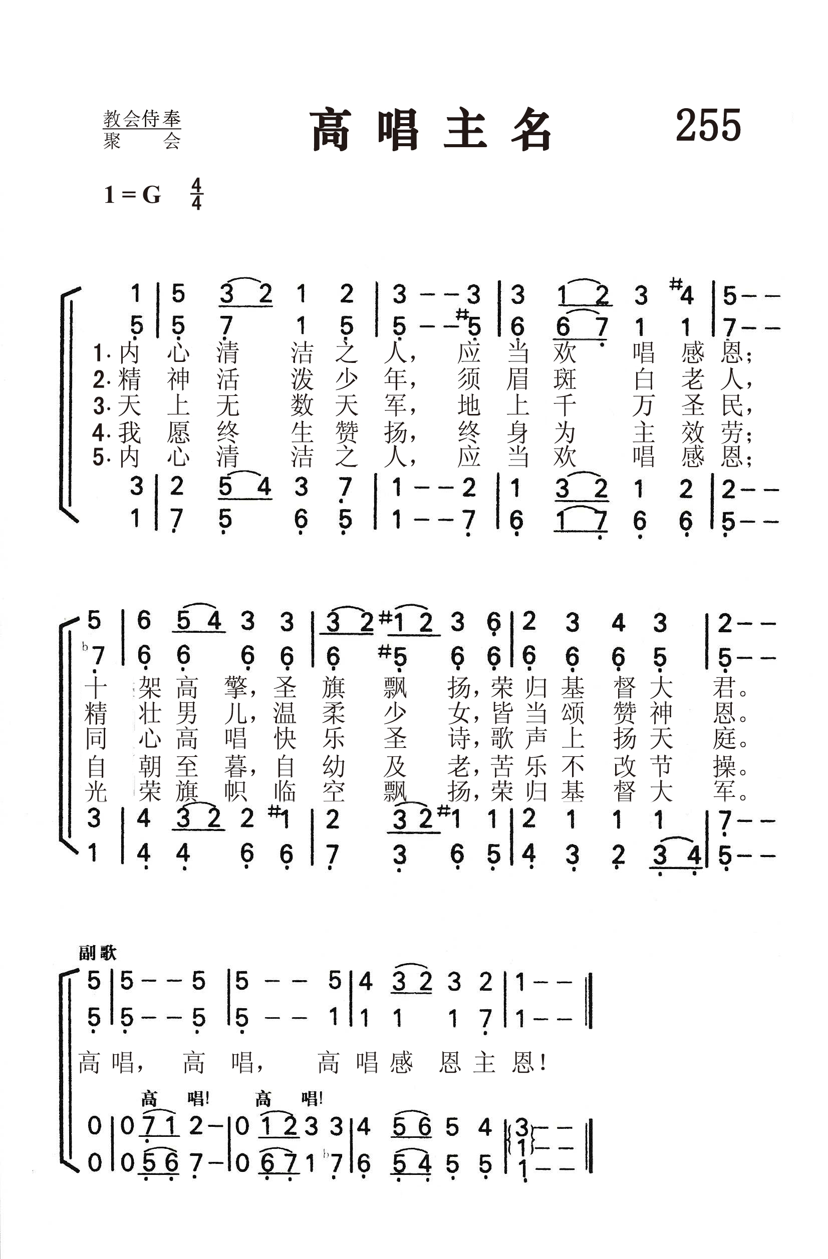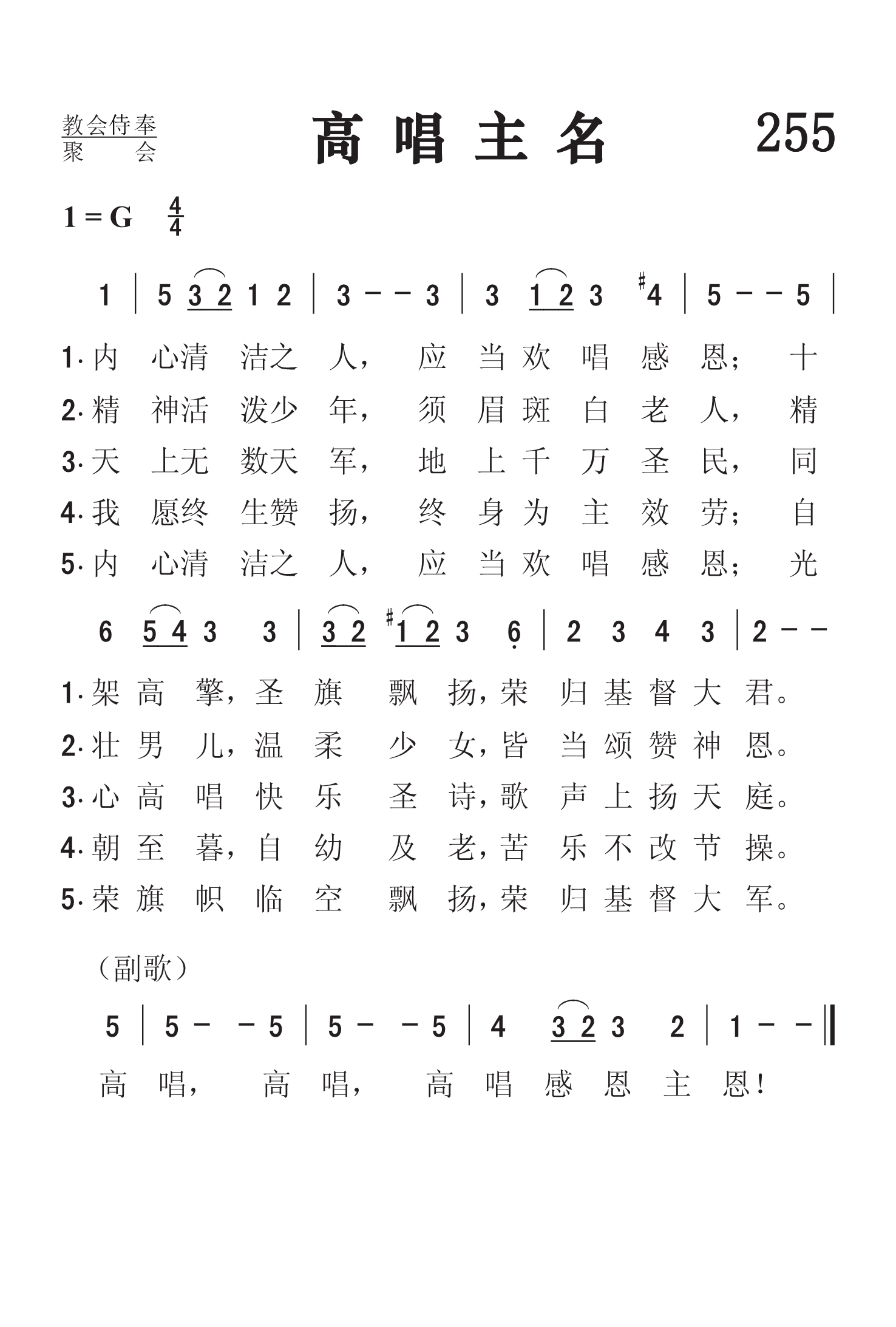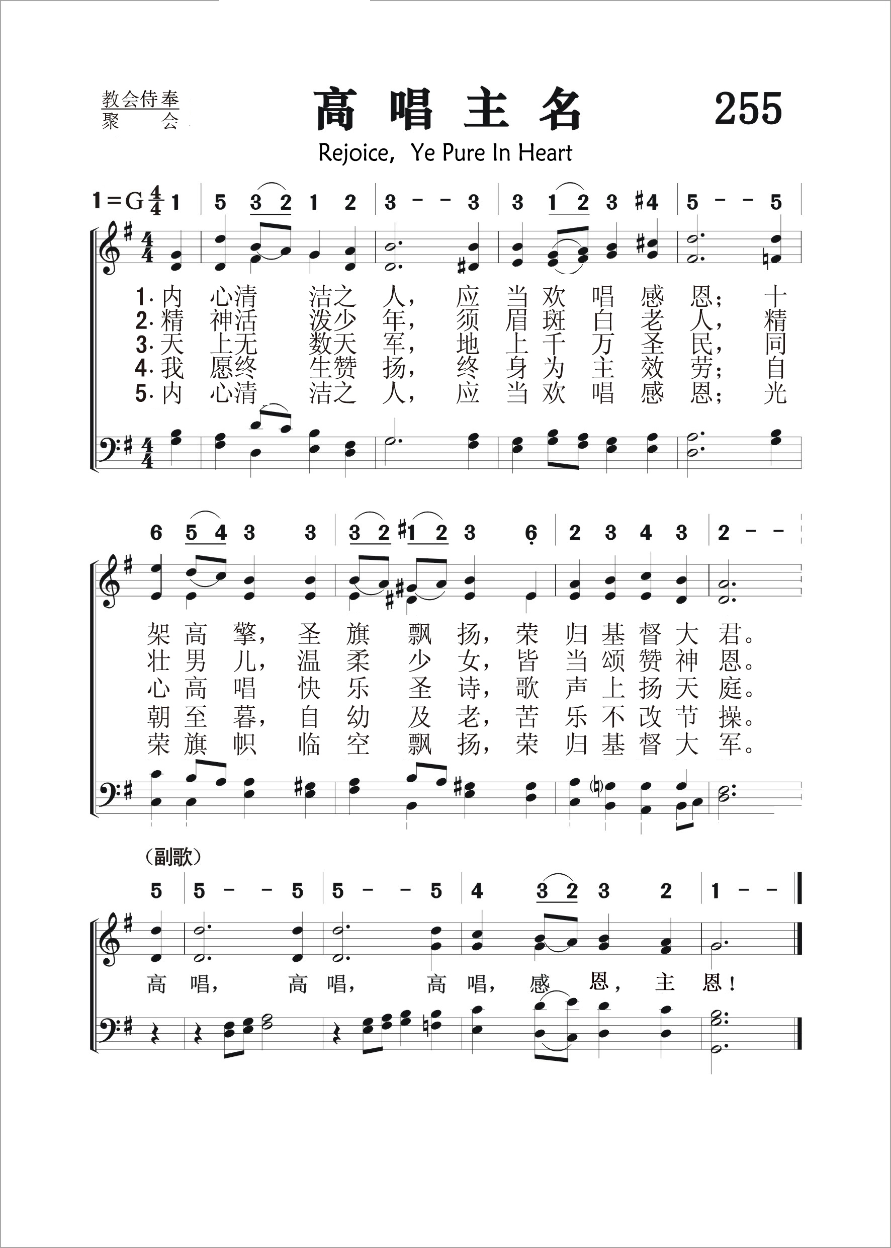 第255首 高唱主名Rejoice,Ye Pure in Heart 普伦普特里(E.H.Plumptre,1821-1891)作词;梅西特(A.H.Messiter,1838-1916)作曲(1883年) 内心清洁之人,应当欢唱感恩; 十架高擎,圣旗飘扬,荣归基督大君。 精神活泼少年,须眉斑白老人, 精壮男儿,温柔少女.皆当颂赞神恩。 天上无数天军,地上千万圣民. 同心高唱快乐圣诗,歌声上扬天庭。 我愿终生赞扬,终身为主效劳; 自朝至暮,自幼及老,苦乐不改节操。 内心清洁之人,应当欢唱感恩; 光荣旗帜临空飘扬,荣归基督大军。 欢欣,欢欣,欢欣歌唱感恩! 普伦普特里是英国圣公会牧师。这是一首进堂赞美诗,是作者于1865年为英国彼得堡罗夫教堂的圣诗班而写的。原诗共有十节,包括最后一节的三一颂,发表于《古今圣诗》的附录曲中。 普伦普特里是英国著名牧师和教育家。他在牛津大学毕业后就担任圣职,并兼任牛津大学皇家学院教授,是旧约圣书的重译者之一。后来他担任威尔士大学教务长。他又是一位多产的作家,作品涉及古典文学,历史,人物传记,圣书,诗歌等。他写的圣诗虽然不多,但是典雅优美,热情奔放,很受欢迎。他也曾将一些拉丁文赞美诗译成英语。 梅西特出生于英国,自幼喜欢音乐,17岁起接受专业方面的训练,1851年前往美国,参加纽约圣公会三一堂圣诗班,三年以后,受聘为该堂圣诗班指挥兼管风琴师。在他的努力下,这支圣诗班成为美国最出色,最负盛名的圣诗班。他在该堂工作了31年,退休后继续从事圣乐方面的写作,终身为主服务。