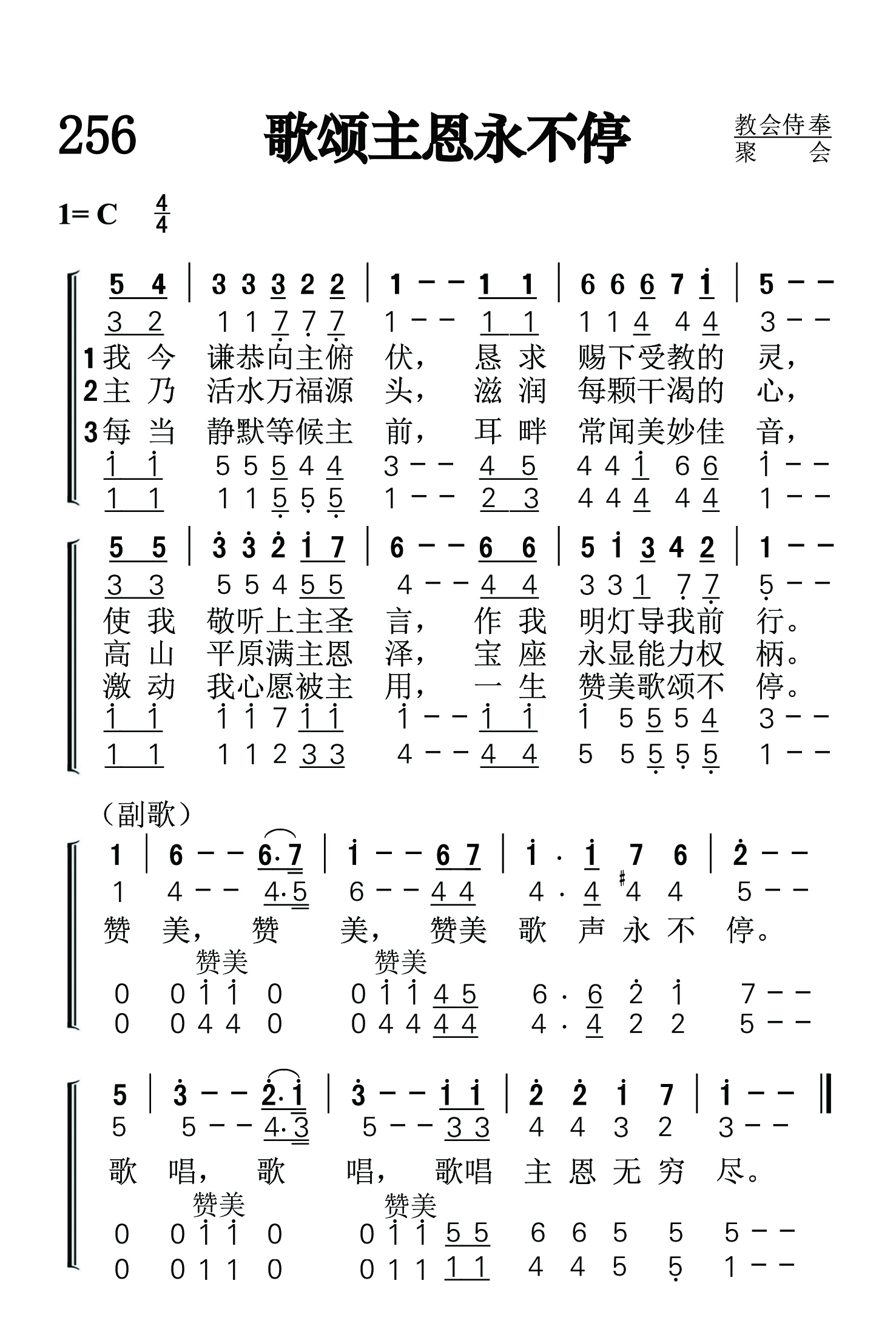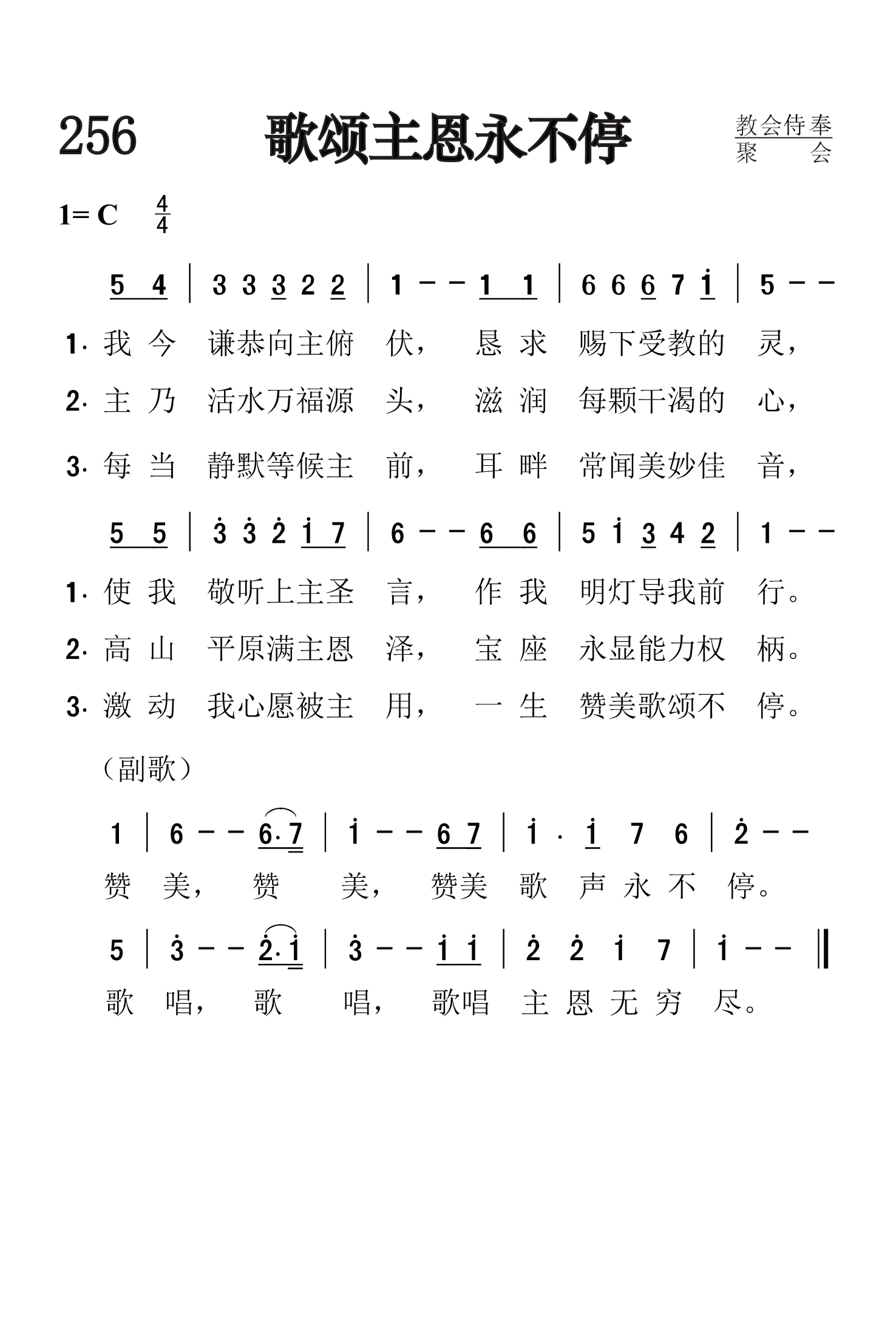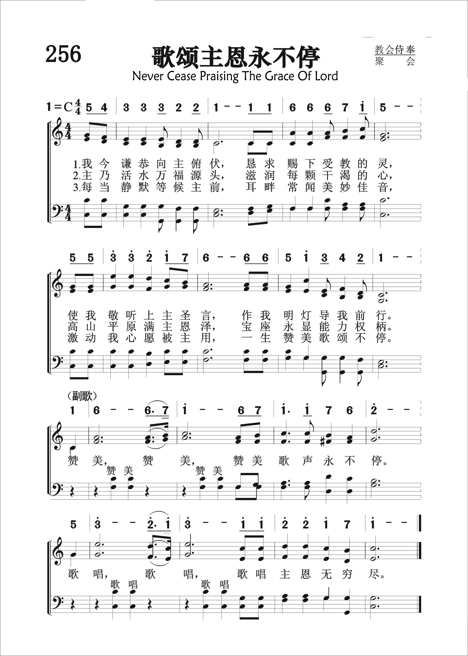 第256首歌颂主恩永不停,Never Cease Praising the Grace of Lord 段毓贞(1930-2001)作词,林声本作曲 我今谦恭向主俯伏,恳求赐下受教的灵, 使我敬听上主圣言,作我明灯导我前行。 主乃活水万福源头,滋润每颗干渴的心, 高山平原满主恩泽,宝座永显能力权柄。 每当静默等候主前,耳畔常闻美妙佳音, 激动我心愿被主用,一生赞美歌颂不停。 赞美,赞美,赞美歌声永不停。 歌唱,歌唱,歌唱主恩无穷尽。 词作者段毓贞出生于一个基督徒家庭中。一岁丧父,二岁丧母。全家六个子女,最大的才14岁,数她最小,只能依靠三个姐姐当童工来维持清贫的生活。她是在教会环境内长大的。8岁时,就参加儿童礼拜,听圣书故事,背金句,也学会了不少赞美诗。后来,一度因家境困难,被送到教会办的伯特利孤儿院去就读。15岁时,随大姐去杭州,白天当练习生,晚上读夜校。1945年她受洗归主,1950年就读中国神学院,1952年就读金陵神学院,1955年毕业,在上海浸信会书局工作。1956年任基督教联合书局助理编辑,主编主日学初级教材。她是林声本牧师的妻子。二人在圣诗创作方面互相促进。她长期从事辅导唱诗班的工作,曾创作不少赞美诗与经文短歌。《赞美诗》新编151首《清早敬拜歌》(1982年),330首《历代妇女多圣贤》(1982年)和《尽心尽意爱众人》(1982年)是段毓贞作词作曲的。 曲作者林声本是段毓贞的丈夫,1947年进广州浸信会神学院学习。毕业后进上海中华浸信会神学院教会音乐系深造,从师马革顺教授专攻音乐。1954年从南京金陵神学院毕业以后,在上海旅沪广东浸信会传道。1980年被按立为牧师,后在上海景灵堂工作。林声本擅长钢琴,年轻时就担任唱诗班指挥,为赞美诗谱曲。他是中国基督教圣诗委员会委员,《圣歌选集》的责任编辑。