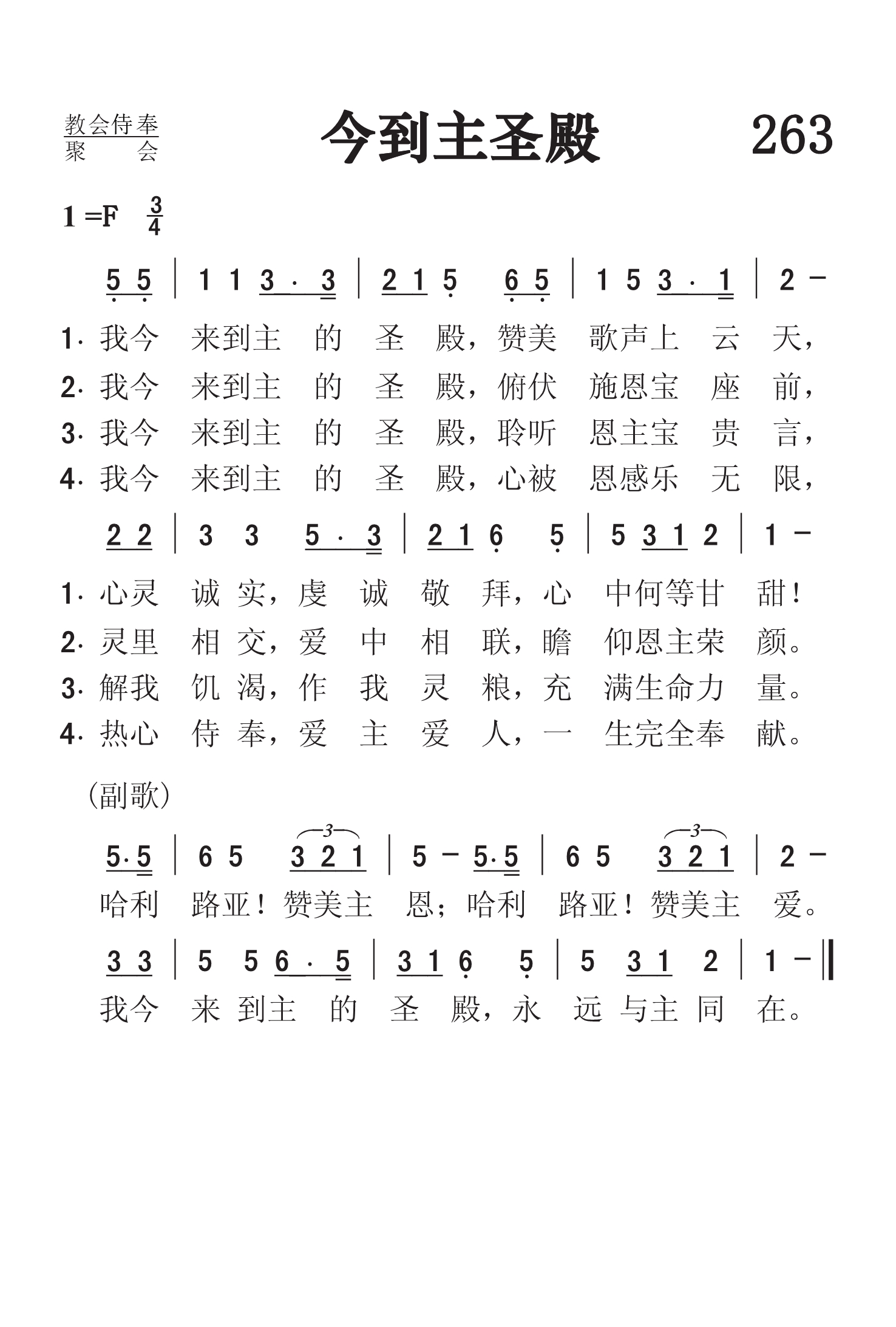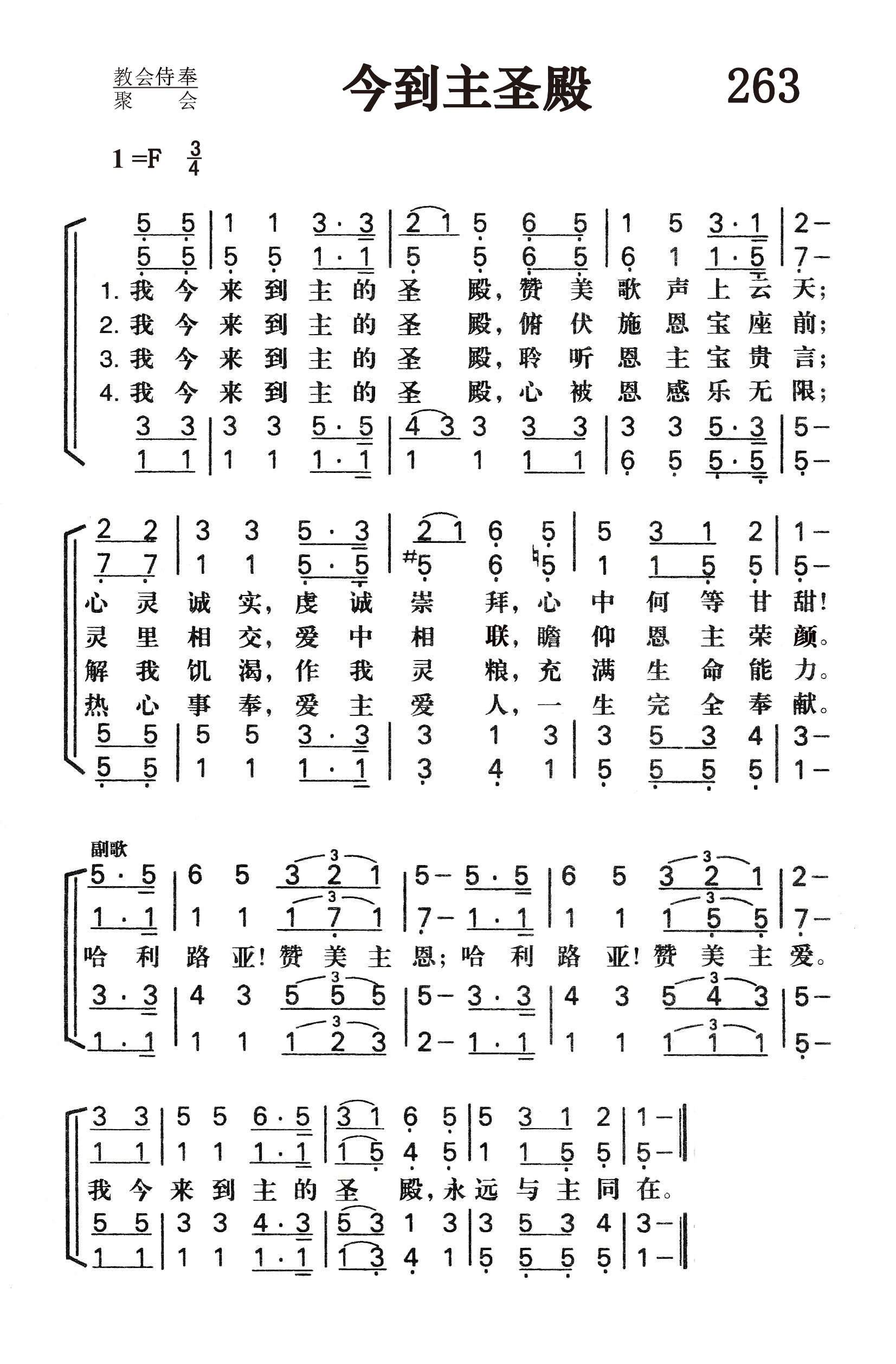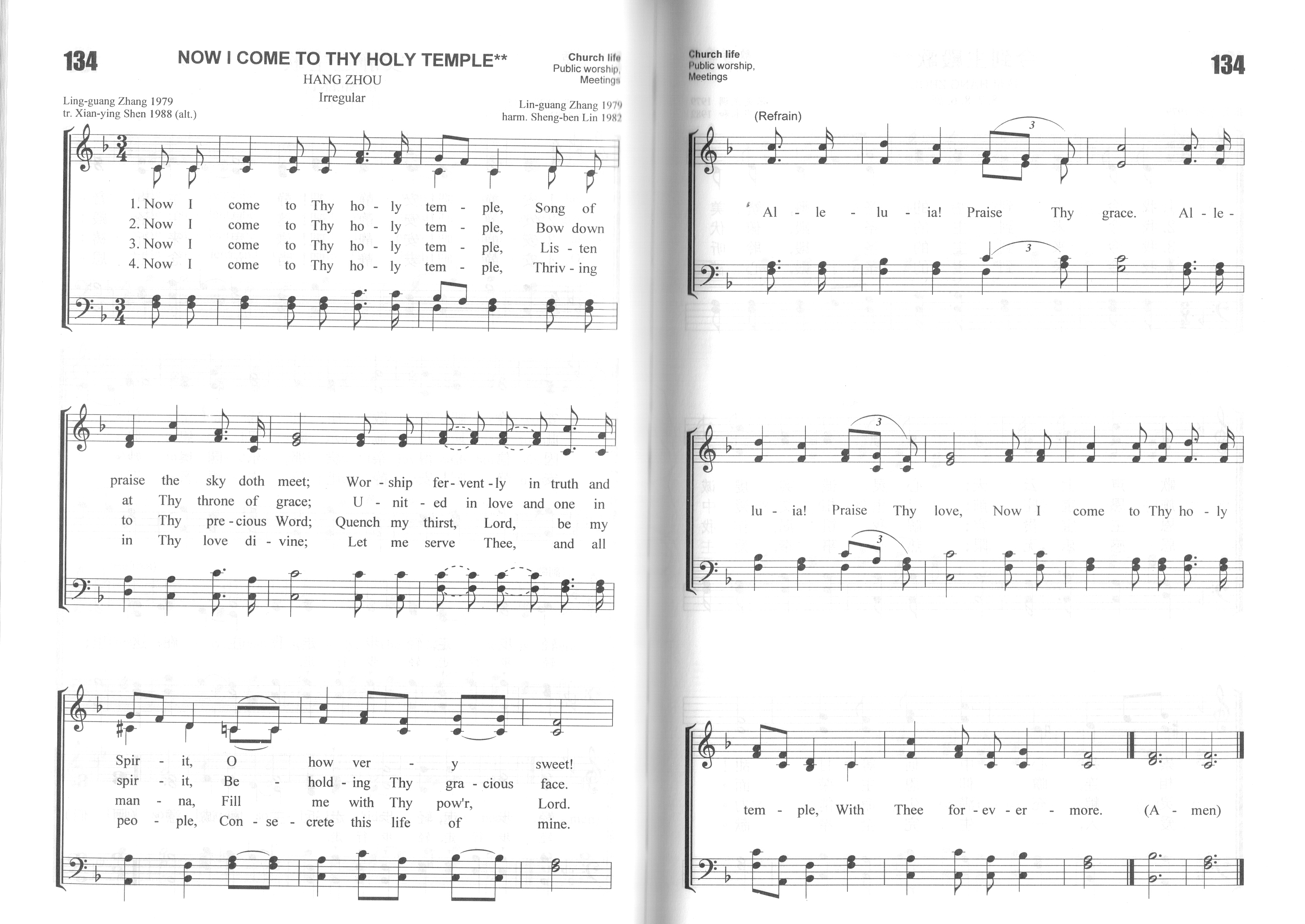 第263首 今到主圣殿Now I Come to Thy Holy Temple 张灵光(1925-1987,7,19)作词作曲(1979年),林声本配和声(1982年) 我今来到主的圣殿,赞美歌声上云天, 心灵诚实,虔诚敬拜,心中何等甘甜! 我今来到主的圣殿,俯伏施恩宝座前, 灵里相交,爱中相联,瞻仰恩主容颜。 我今来到主的圣殿,聆听恩主宝贵言, 解我饥渴,养我灵命,充满生命能力。 我今来到主的圣殿,心被恩感乐无限, 热心侍奉,爱主爱人,一生完全奉献。 哈利路亚!赞美主恩。哈利路亚!赞美主爱。 我今来到主的圣殿,永远与主同在。 张灵光出生与浙江仙居县的一个牧师家庭,从小喜欢唱歌,常与父母和十个兄弟姐妹一同歌唱赞美。他熟读圣书,十几岁就会讲道。年青时因逃避抓壮丁,只身离家,所到之处仍不忘为主作工,创作赞美诗。他1948年献身,1951年毕业于杭州中国神学院,后在杭州崇一堂传道。1956年被按立为牧师,负责杭州全市圣歌团的工作。 张灵光一生勤奋学习。在音乐方面完全是自学成材的。这首诗歌是张灵光有感于动乱之后,基督教恢复在教堂礼拜而创作的。 林声本1947年进广州浸信会神学院学习。毕业后进上海中华浸信会神学院教会音乐系深造,从师马革顺教授专攻音乐。1954年从南京金陵神学院毕业以后,在上海旅沪广东浸信会传道。1980年被按立为牧师,后在上海景灵堂工作。林声本擅长钢琴,年轻时就担任唱诗班指挥,为赞美诗谱曲。他是中国基督教圣诗委员会委员,《圣歌选集》的责任编辑。