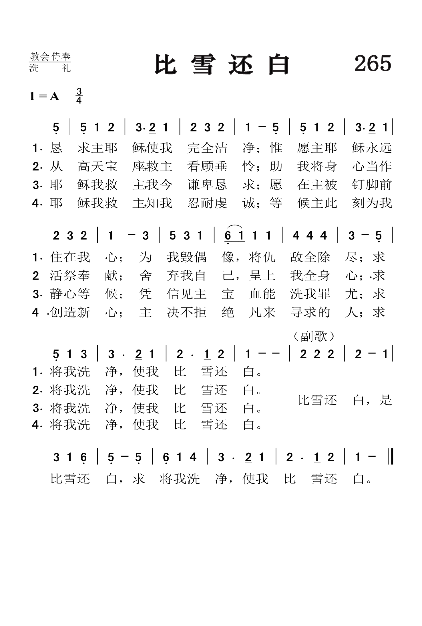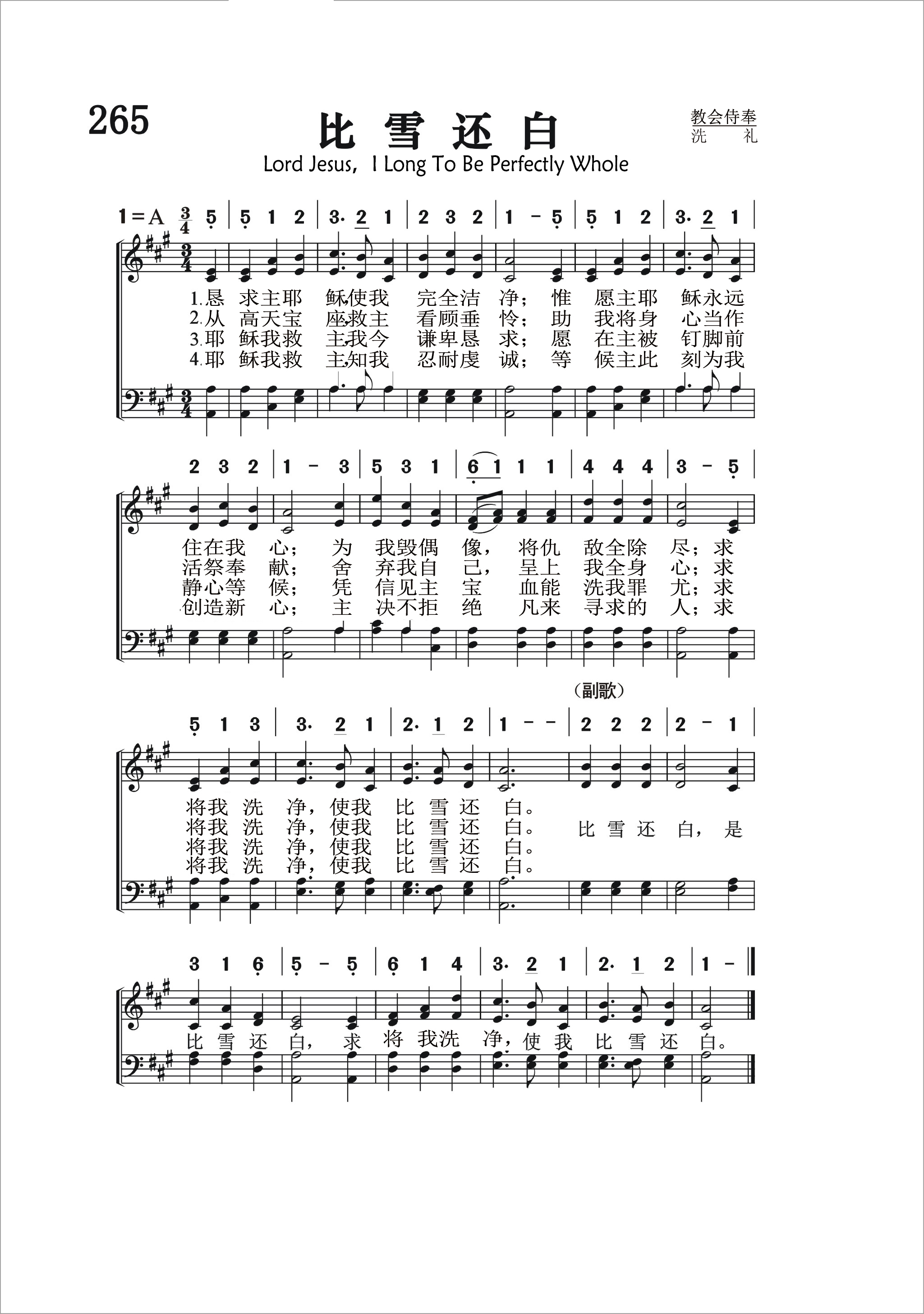 第265首 比雪还白Lord Jesus,I Long to Be Perfectly Whole 尼科尔森(James Nicholson,1828-1876,11,6)作词,费希尔(W.G.Fischer, 1835,10,14-1912,8,12)作曲 恳求主耶稣, 使我完全洁净;惟愿主耶稣永远住在我心; 为我毁偶像,将仇敌全除尽;求将我洗净,使我比雪还白。 从高天宝座,救主看顾垂怜;助我将身心当作活祭奉献; 舍弃我自己,呈上我全身心;求将我洗净,使我比雪还白。 耶稣我救主,我今谦卑恳求;愿在主被钉脚前静心等候; 凭信见主宝血能洗我罪尤;求将我洗净,使我比雪还白。 耶稣我救主, 知我忍耐虔诚;等候主此刻为我创造新心; 主决不拒绝凡来寻求的人;求将我洗净,使我比雪还白。 比雪还白,是比雪还白,求将我洗净,使我比雪还白。 这是一首百唱不厌的通用诗歌,从一开始“敬求主耶稣,使我完全清洁,”就吐露了信徒盼望得到洁净的祈愿,和对于主宝血无限功效的信心。作者肯定有过出生入死,离罪归圣的属灵经验。他深知主的宝血对于基督徒每日生命的重要性,所以就用诗的语言把这宝贵的恩典表达出来。诗句流畅,朗朗上口。本诗的副歌,几乎逐字引录了《诗篇》51:7的语句:“求你洗涤我,我就比血更白”。 这首诗歌戚戚动人的语句,加上费希尔所配的优美旋律,使它很快成为受人喜爱。词作者尼科尔森出生在爱尔兰,1850年移居美国,先后在费城和华盛顿市任邮局职员,热心布道和教会主日学工作,业余组织唱诗班并担任领唱,是美以美会的热心信徒。这首诗最初发表在《快乐之歌》1872年第四期上。556首《我主是我光》也是尼科尔森作词。 曲作者费希尔,这首诗所用的曲调是美国业余圣诗作曲家费希尔所谱,调名《信赖(TRUSTING)》。费希尔出生于美国马里兰州,原籍德过,从青年时代起就对音乐感兴趣,曾在美国费城说德语的一座教堂里学唱诗;一度从事装订图书工作,并继续在夜校学音乐。他钢琴弹的很好,也指挥合唱团,并任钢琴商店的推销员。许多堂会请他教唱诗和指挥唱诗班。他一生谱写了约200首福音圣诗曲调。 第 325首《主的故事》(1869年)和452首《来就十架》也是费希尔作曲的。