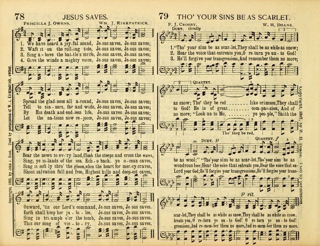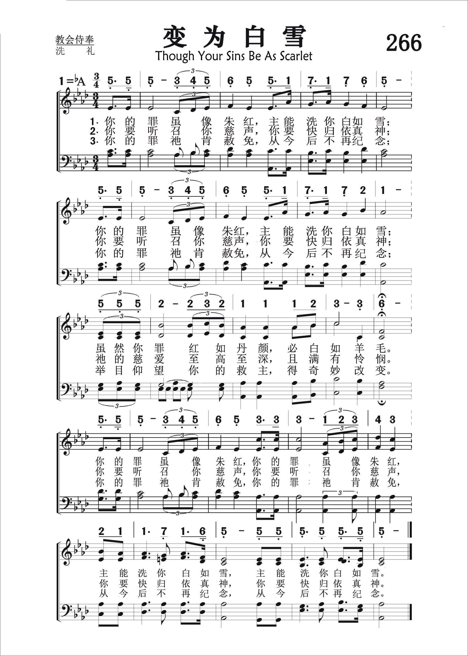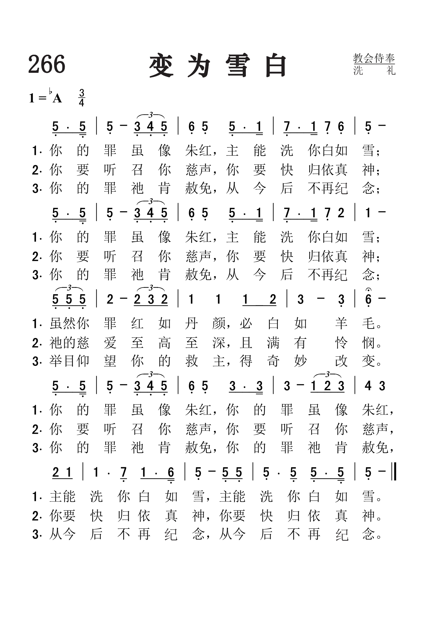 第266首 变为雪白Though Your Sins Be as Scarlet 克罗斯比(1820-1915年)作词,多恩(William H.Doane,1832,2,3-1915,12,23)作曲 你的罪虽像朱红,主能洗你白如雪; 虽然你罪红如丹颜,必白如羊毛。 你要听召你慈声,你要快归依真神; 祂的慈爱至高至深,且满有怜悯。 你的罪祂肯赦免,从今后不再记念; 举目仰望你的救主,得奇妙改变。 词作者克罗斯比是美国才华出众,负有盛名的福音女诗人。她出生六个月时因庸医,误诊而双目失明。15岁时她就读于纽约最早的一所盲童学校。1847-1858年,她留在该校教授英语语法,修辞学,罗马史和美国历史。她少年时代就开始写诗,24岁时出版了《盲女与她的诗》,引起美国文坛的注意。1850年灵性奋兴的经验,使她集中全力专写圣诗,后在福音圣诗作曲家和编辑布雷得伯里的鼓励下,立志以创作福音圣诗作为自己的终生事业,于是与纽约一家出版社签订合同,每周写圣诗三首,结果写了5929首。此外,她还为布利斯写525首,为桑基写237首,为劳里写219首,为多恩写1500首。她一生共写了8440首圣诗,堪称为最多产的圣诗作家。 曲作者霍华德多恩是富有才华的音乐家,克罗斯比的多年合作者。他出生于美国康涅狄格州普理斯顿市,14岁就带领唱诗班,青年时代与他父亲经营布店,以后转任机器厂厂商。因他服务态度很好,受到市民的欢迎,曾被选为市政委员。他业余为福音圣诗谱曲达二千多首。其中有不少经典之作。