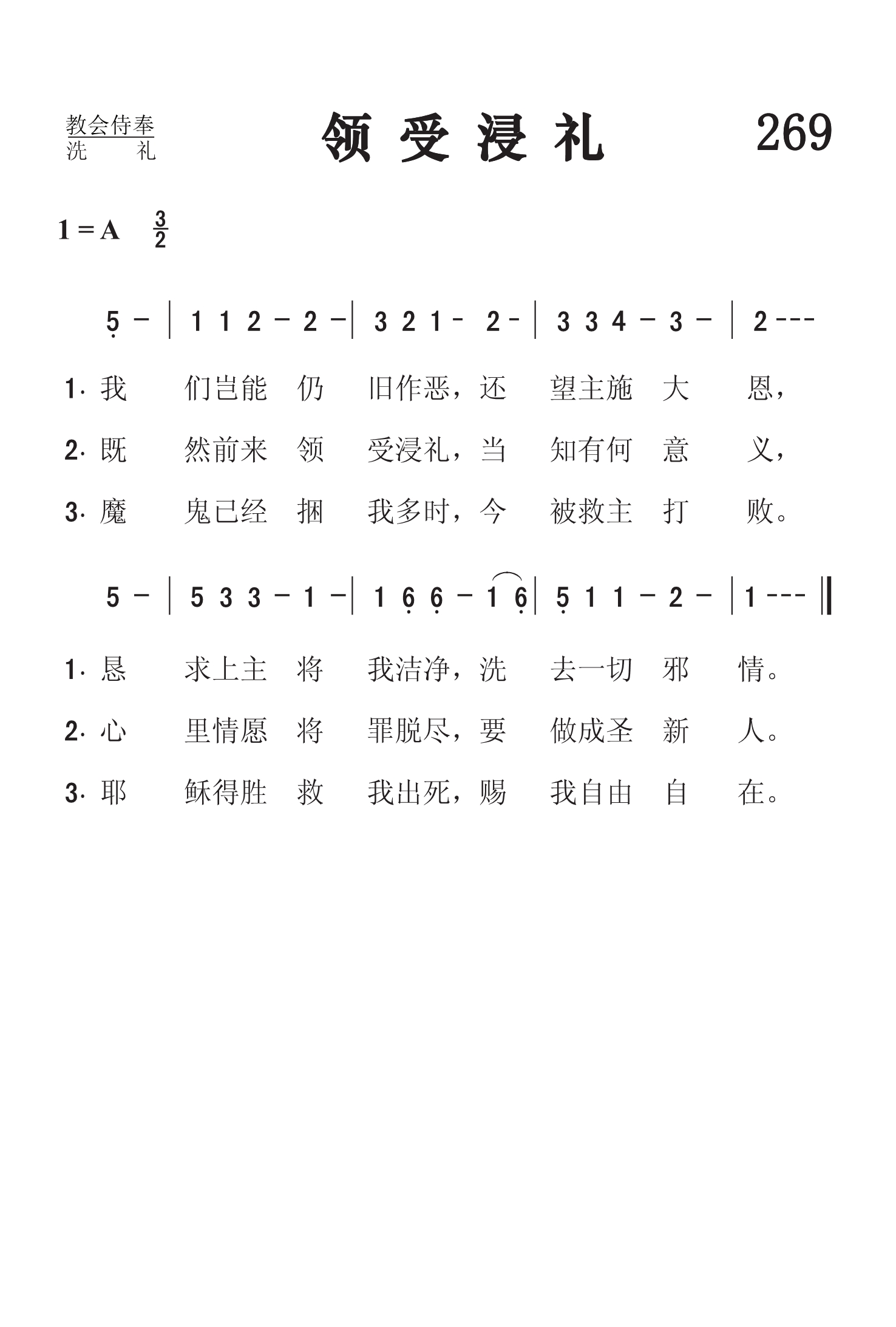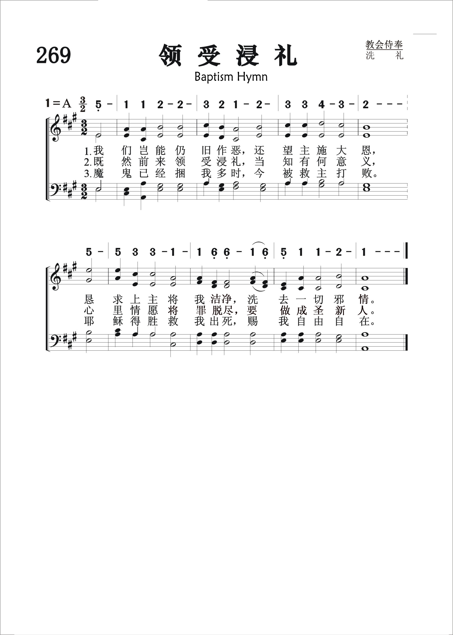 269首 领受浸礼Baptism Hymn 格莱泽(Carl C.Glaser,1784,5,4-1829,4,16)作曲 我们岂能仍旧作恶.还望主施大恩, 恳求上主将我洁净,洗去一切邪情。 既然前来领受浸礼,当知有何意义, 心里情愿尽脱罪恶,要做成圣新人。 魔鬼已经捆我多时.今被救主打败。 耶稣得胜救我出死,赐我自由自在。 这首为浸礼所用的诗歌。词作者佚名,曲调采用英文赞美诗《基督颂歌》(C.S)第413首。曲作者格莱泽出生于德国魏森费尔斯,自幼跟父亲学习音乐,曾在来比锡大学学习法律,后来却成为音乐教师和合唱指挥,并开办音乐书店,印制乐谱。他精通钢琴和小提琴,同时还是优秀的词曲作家。