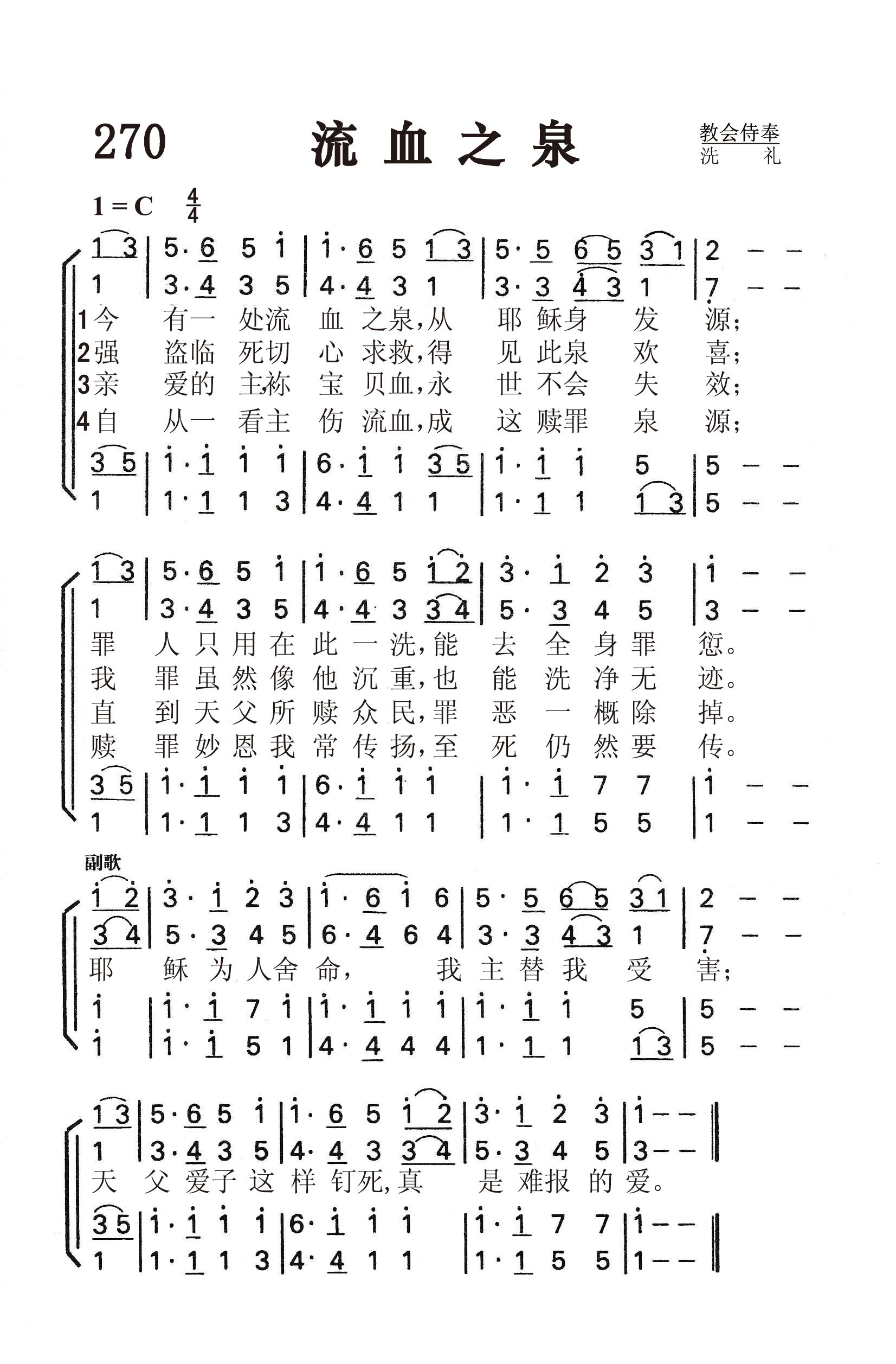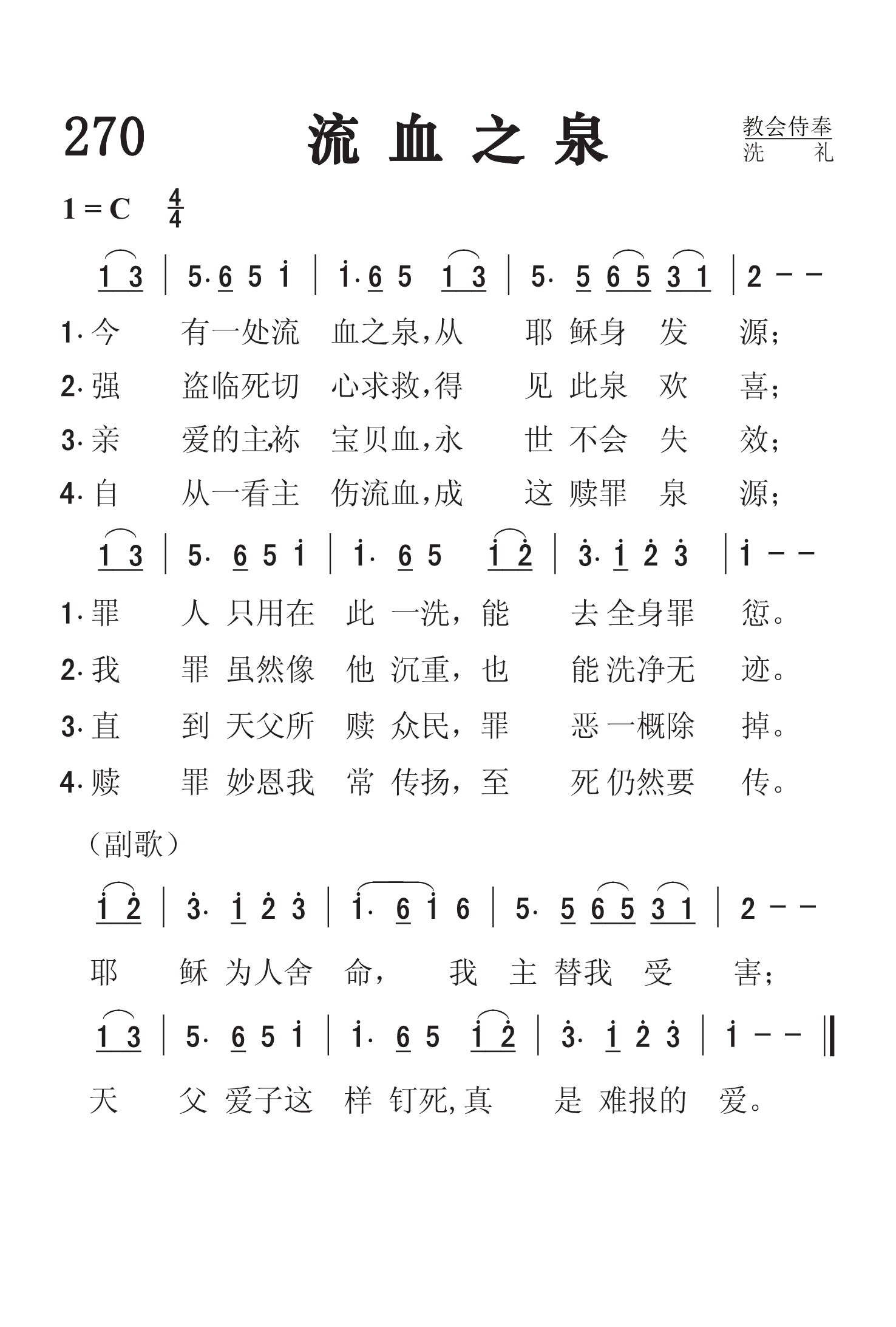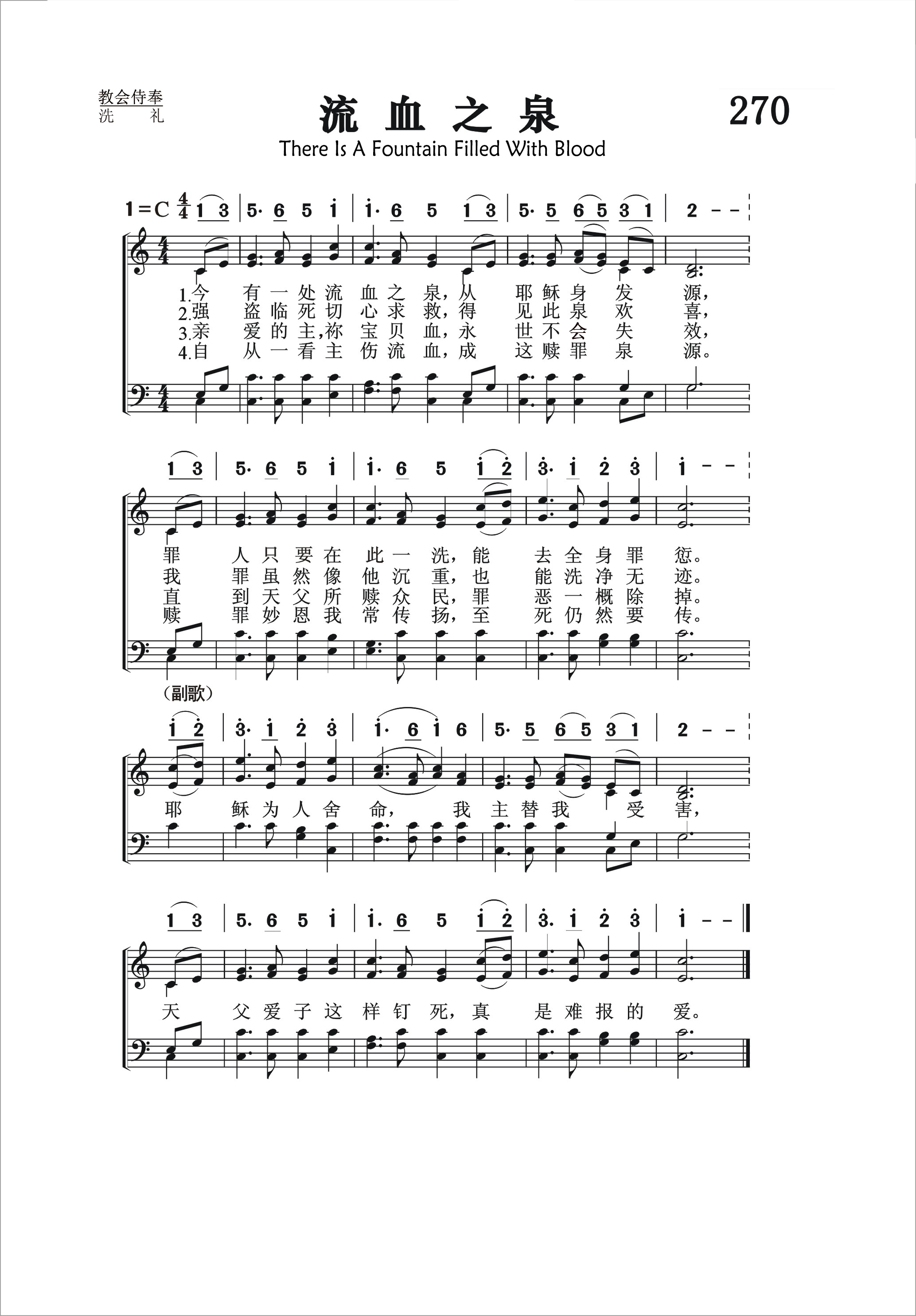第270首流血之泉There is a Fountain Filled with Blood 考珀(W.Cowper,1731-1800)作词,梅森(Lowell Mason,1792,7,8-1872,8,11)编配 今有一处流血之泉,从耶稣身发源, 罪人只用在此一洗,能去全身罪愆。 强盗临死切心求救,得见此泉欢喜, 我罪虽然像他沉重.也能洗净无迹。 亲爱的主,祢宝贝血,永世不会失效, 直到天父所赎众民,罪恶一概除掉。 自从一看主伤流血,成这赎罪泉源, 赎罪妙恩我常传扬,至死仍然要传 耶稣为人舍命,我主替我受害, 天父爱子这样钉死,真是难报的爱 “那日必给戴维家和耶路撒冷的居民开一个泉源,洗除罪恶与污秽”(《撒迦利亚书》第13章第1节)。 这首《 流血之泉》,曾感动无数罪人认识救主宝血洗除罪污的功效。原诗共有七段。 词作者考珀是英国著名的诗人。他的诗集和所翻译的《荷马史诗》一直是脍炙人口的佳作。他于1731年11月15日出生于英国圣公会一位牧师的家庭,六岁时遭母亲遗弃,造成他忧郁寡言,性情孤僻。在学校读书时,他常受同学欺负,经常在半夜里梦呓惊醒。长大后他学习法律,曾任律师9年,负责调查商业破产的案件。社会上的尔虞我诈,成败无常,使他恐惧不已;报考上议院秘书时,又担心不被录取;家庭方面不同意他和表妹结婚,以至他一度精神失常,有了轻生的念头。有一次他于晨曦中驾车前往离家不远的河边,打算了结此生。他在阴雾中兜了几个圈,怎么也找不到出路,最后决定孤注一掷,跳下去了事,谁知落脚之地正是自家门口。进门之后,顿悟上帝奇妙搭救,遂握笔疾书感恩诗歌一首,即五〇五版《赞美诗》55首《上帝神迹》(1772年)。 考珀每当旧疾复发,悲观厌世,失望消沉之时,总会向他的主投靠。1767年,他迁居奥尔尼,与福音派牧师牛顿成为莫逆。牛顿牧师为他准备了房间,使他能从事写作。这首《流血之泉》,就是他在牛顿牧师家中写成的。此诗与先知《撒迦利亚书》第十三章第1节的预言:“那日必给大卫家和耶路撒冷的居民开一个泉源,洗除罪恶与污秽”相呼应。它曾感动许多罪人认识救主宝血“能洗净一切罪污”。他还尽力协助教会圣工。除与牛顿合编《奥尔尼诗集》以外,还从事诗歌创作和翻译,尤其是所译盖恩夫人的圣诗备受欢迎。他虽然一生多病,曾精神失常。但他的诗文中却没有颓唐和忧郁的气氛。他的圣诗反映出个人的敬虔和感恩的心情,就是他所写的普通诗歌也富有宗教的色彩,以热爱自然、温顺和平的浪漫气息而着称。他的长诗《约翰.吉尔本》和《流亡》表现了一个心绪烦恼,屡遭折磨的人在暗中的挣扎,但他始终保持头脑的清醒。他的《书信》被列为最受人喜爱的英语作品之一。 英国文学家兼医生古德(John Mason Good)也非常喜爱《流血之泉》,经常背诵,临终时还要女儿为他吟唱这首诗。 这首诗采用了一首美国西部民歌的旋律,经梅森配上和声并加上副歌,使它更赋有诗意,以致深深打动人心。 《赞美诗》(505版)还收有考珀作词的《敬听主声》(189首)和《紧随主行》(358首)。 编配者梅森出生于美国马萨诸塞州的梅德菲尔德。幼年在校时就喜欢音乐,16岁时已成了乡村教堂唱诗的指挥。1812年迁居乔治亚州,在一家银行当办事员,同时在长老会礼拜堂任管风琴师及唱诗班指挥,并开始学习和声学和作曲。他自编了一本《圣乐曲调集》,送到好几家印刷长和出版社去,虽然讲明不要稿费,也没有一家肯承印。后经波士顿亨德尔.海顿音乐社出资代印,结果销路之广,出人意料,大大鼓舞了梅森,使他决定以音乐为他的终生事业。1827年他迁居波士顿,当选为亨德尔及海顿学会主席,并任教堂唱诗班指挥十四年。1829年编辑出版了第一本《儿童赞美诗》。他为了培养训练儿童唱诗,创办成立波士顿音乐学院,专门训练儿童唱歌。1834年又在音乐学院内成立了培训儿童音乐的教师培训班。他还负责出版音乐杂志,编辑出版了80多种诗歌集,创作诗歌曲谱1126首,改编496首,对提高美国的音乐水平,改善教会圣乐方作出突出贡献,为19世纪美国音乐界最有影响的人物。1835年纽约大学授予他第一位音乐博士学位,以表钦仰。