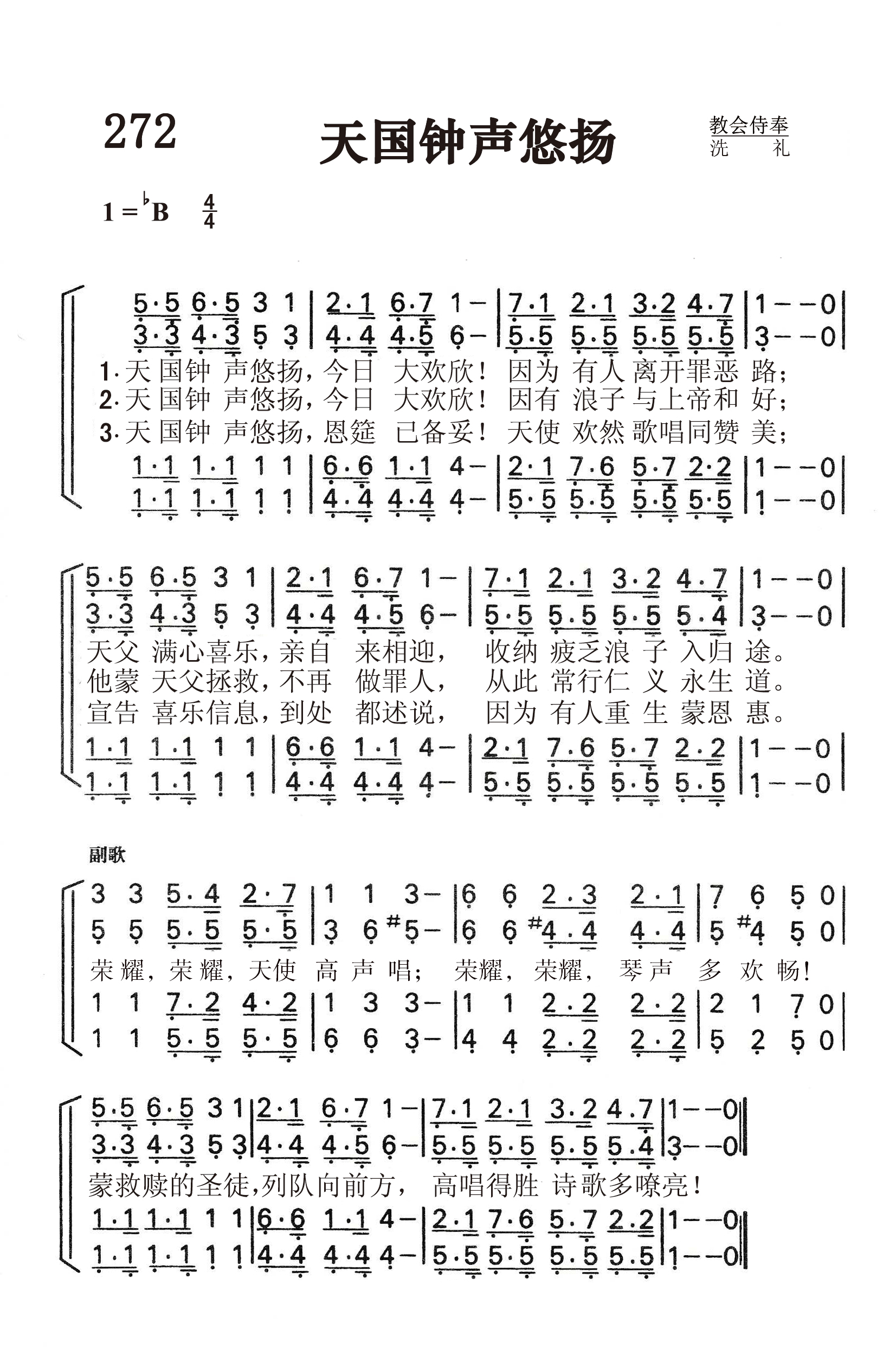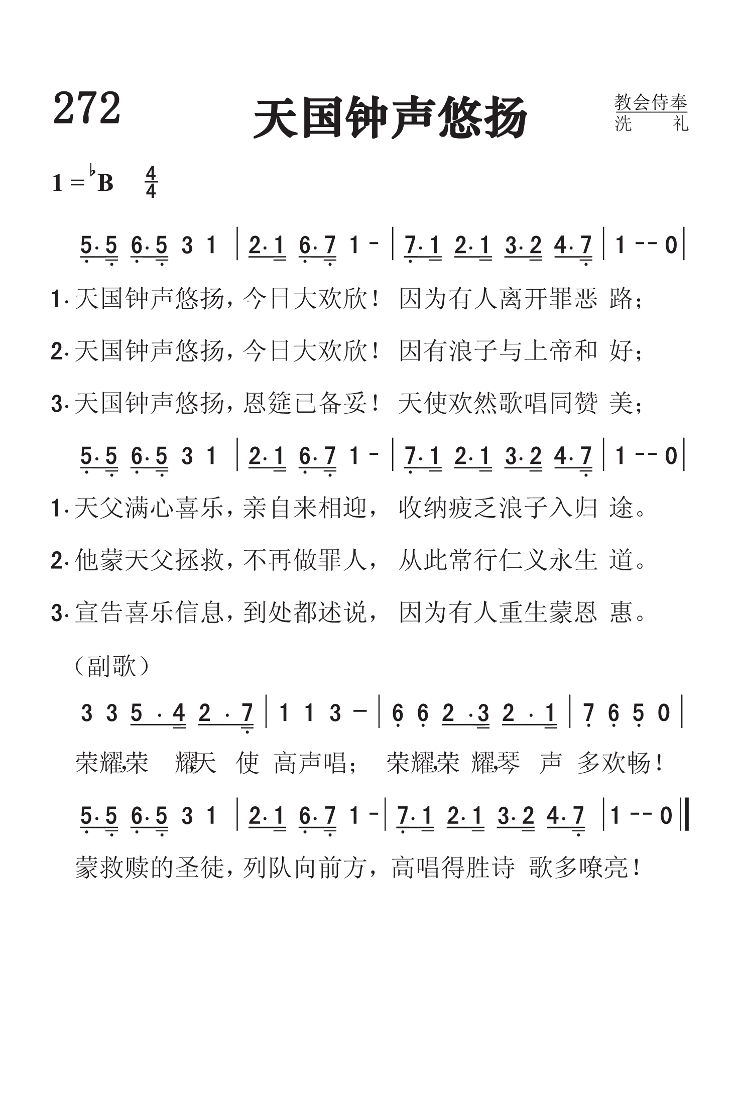 第272首天国钟声悠扬Ring the Bells of Heaven 库欣(WOCushing, 1823-1902)作词,鲁特(G.F.Root.1820-1895)作曲 天国钟声悠扬,今日大欢欣!因为有人离开罪恶路; 天父满心喜乐,亲自来相迎,收纳疲乏浪子入归途。 天国钟声悠扬,今日大欢欣!因有浪子与上帝和好; 他蒙天父拯救,不再做罪人,从此常行仁义永生道。 天国钟声悠扬,恩筵已备妥!天使欢然歌唱同赞美; 宣告喜乐信息,到处都述说,因为有人重生蒙恩惠。 荣耀,荣耀,天使高声唱;荣耀,荣耀,琴声多欢畅! 蒙救赎的圣徒,列队向前方,高唱得胜诗歌多嘹亮! “一个罪人悔改,在天上也要这样为他欢喜,较比为九十九个不用悔改的义人欢喜更大”(路15:7)。 这是一首先有乐谱,再创作歌词的赞美诗,原为鲁特所作的世俗歌曲《荣耀,荣耀》。库欣得到了乐谱以后,其激昂明快的旋律深深打动了他,在他的脑海里不住地萦绕,挥之不去。他说:“我很想用这个旋律为主日学或教会的其它聚会配一首赞美诗。当我想到天上的钟声唤醒地上的罪人悔改时,在天上一定有大喜乐。我仿佛听到了天国的钟声。于是作了这首歌词。这真是美妙有福的经验。天国的钟声似乎还在响着。” 有一位英国小姑娘,父母非常爱她,但她得了重病,就要去世了。在她离世前的几天,她要父母把同学都请来,到她病床前为她唱这首《天国钟声悠扬》。她临终前对她的母亲说:“妈妈请听!天国的钟声响了,天上的歌声有多快乐!”然后就安然去世了。 人的生命在上帝眼中是极为宝贵的。为了救赎我们,祂甚至让祂无罪的儿子付出了血的代价。我们只有在十字架的光照下,才能认识到人生命的全部价值。但愿我们都能在这首圣诗的启发和鼓舞下,积极投身到救灵工作中去,一同盼望赎民的大家庭在天上团圆的欢乐日子。 词作者库欣出生于美国新英格兰,自幼信主;青年时代受奋兴布道的影响,献身事奉主,担任牧师圣职。1870年他47岁时,不幸患病,健康恶化。后来疾病虽愈,但口以不能说话,无法再宣传主道,于是求主赐下写作圣诗的才能。此后,他以惊人的毅力写了圣诗三百余首,感动了许多人。他以坚强的信心,在世上又生活了三十三年,去世时80岁。他的圣诗多由鲁特、桑基、劳里等福音派圣诗作曲家为他配曲。 曲作者鲁特是美国19世纪著名音乐家。在他来改行谱写和出版福音圣诗歌曲之前,就已经是一位遐尔闻名,家喻户晓的作曲家,因为他所谱的《自由战歌》,《健儿们前进》是当时北方军队的进行曲,几乎人人都会唱,至今仍相当流行,并且已经有人将之配到赞美诗中来。鲁特长期从事圣乐教学和创作,一生共着有75部宗教歌曲的乐谱和几百首赞美诗,包括与盲诗人克罗斯比合作编着宗教歌剧《花后》。