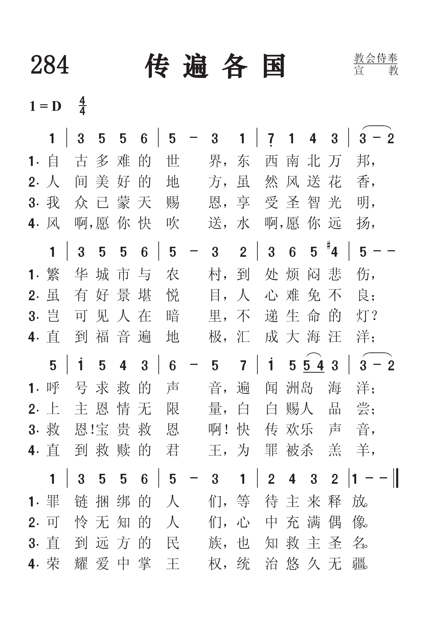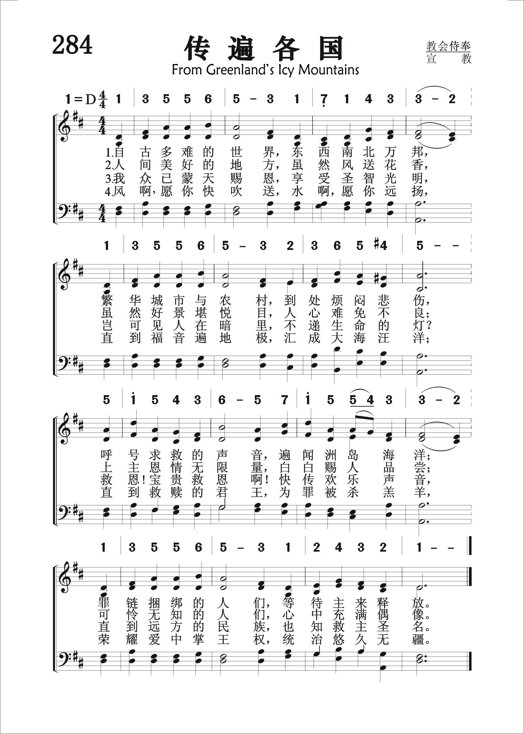 第284首 传遍各国From Greenland’s Icy Mountains 希伯(R .Heber,1783,4,21-1826.4.26)作词(1819年),梅森(Lowell Mason,1792,7,8-1872,8,11)作曲(1823年) 自古多难的世界,东西南北万邦, 繁华城市与农村,到处烦闷悲伤, 呼号求救的声音,遍闻洲岛海洋; 罪链捆绑的人们,等待主来释放。 人间美好的地方,虽然风送花香, 虽然好景堪悦目,人心难免不良; 上主恩情无限量,白白赐人品尝: 可怜无知的人们,心中充满偶像。 我众已蒙天赐恩,享受圣智光明, 岂可见人在暗里,不递生命的灯 救恩!宝贵救恩啊!快传欢乐声音, 直到远方的民族.也知救主圣名。 风啊,愿你快吹送,水啊,愿你远扬, 直到福音遍地极,汇成大海汪洋; 直到救赎的君王,为罪被杀羔羊, 荣耀爱中掌王权,统治悠久无疆。 这首著名的布道诗歌,出于英国圣公会青年牧师希伯之手。他用自己的一生,履行了诗歌中的誓言,最后客死异乡,安息在传道的岗位上。 1918年的一个夜晚,36岁的希伯坐在同为牧师的岳父斯普利博士的书房里,讨论他老人家将要传讲是信息。斯普利对希伯说:“我下周要为海外宣教会作募捐讲道。” 希伯问:“您要传达什么讲题呢?” 斯普利回答说:“当然是主耶稣伟大的使命--你们往普天下去,传福音给万民听(可16:15)。讲章已经准备好了,只差一首与之配合的诗歌。可惜我才华横溢的女婿竟帮不上我的忙”。希伯连忙请老人家稍安勿噪,随即拿着纸笔在书房的小桌子旁边坐下。经过短时间的思索,便挥笔直书,十五份钟以后,三段歌词一气呵成。 希伯把写好的歌词逐段念给他岳父听,老人家边听边点头称许说:“写得妙极了,足能为我的讲道添光生色,使整堂聚会效果大增。” 希伯诗兴未尽,不听岳父的劝阻,继续写完最后一段,把全诗的意境推到高潮。 本诗的视野极为广阔,用短短的几段把福音的大园地展示读者眼前。从冰雪皑皑的格陵兰,到印度的珊瑚海岸。从烈日炎炎的非洲,到遥远的山乡海岛。大千世界,芸芸众生,在罪恶的锁链之中,渴望基督福音的救度。 由于这首诗歌的韵律是新的,没有现成曲调可套,有一位妇女就把歌词带给年仅31岁的银行职员梅森谱曲,他竟在半个小时之内就完成了。这原是一首F大调的女高音独唱圣诗,在美国波士顿首唱以后,迅速传开,被誉为不朽的诗章和旋律之一。 圣乐音乐家梅森出生于美国马萨诸塞州的梅德菲尔德。幼年在校时就喜欢音乐,16岁时已成了乡村教堂唱诗的指挥。1812年迁居乔治亚州,在一家银行当办事员,同时在长老会礼拜堂任管风琴师及唱诗班指挥,并开始学习和声学和作曲。他自编了一本《圣乐曲调集》,送到好几家印刷长和出版社去,虽然讲明不要稿费,也没有一家肯承印。后经波士顿亨德尔.海顿音乐社出资代印,结果销路之广,出人意料,大大鼓舞了梅森,使他决定以音乐为他的终生事业。1827年他迁居波士顿,当选为亨德尔及海顿学会主席,并任教堂唱诗班指挥十四年。1829年编辑出版了第一本《儿童赞美诗》。他为了培养训练儿童唱诗,创办成立波士顿音乐学院,专门训练儿童唱歌。1834年又在音乐学院内成立了培训儿童音乐的教师培训班。他还负责出版音乐杂志,编辑出版了80多种诗歌集,创作诗歌曲谱1126首,改编496首,对提高美国的音乐水平,改善教会圣乐方作出突出贡献,为19世纪美国音乐界最有影响的人物。1835年纽约大学授予他第一位音乐博士学位。