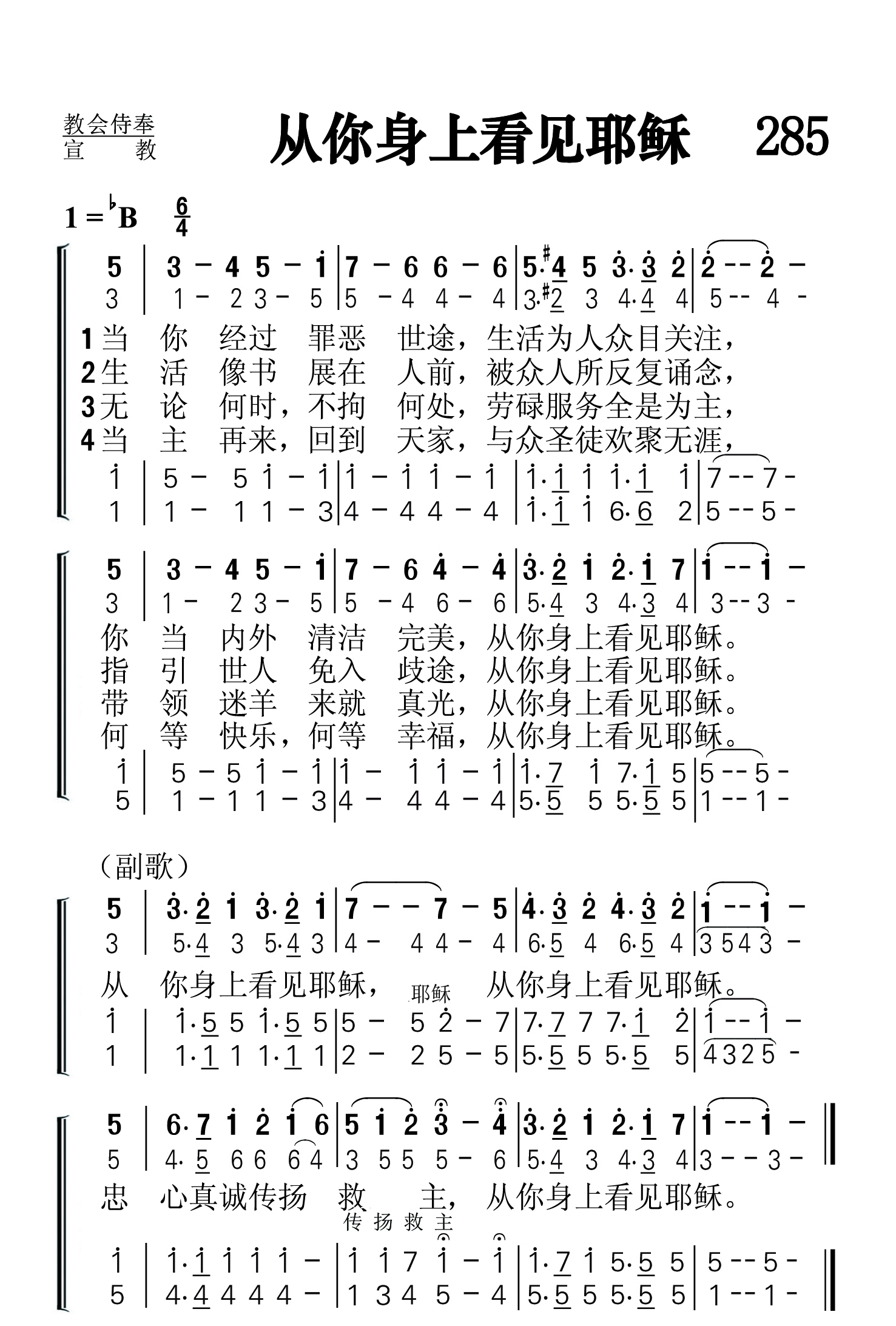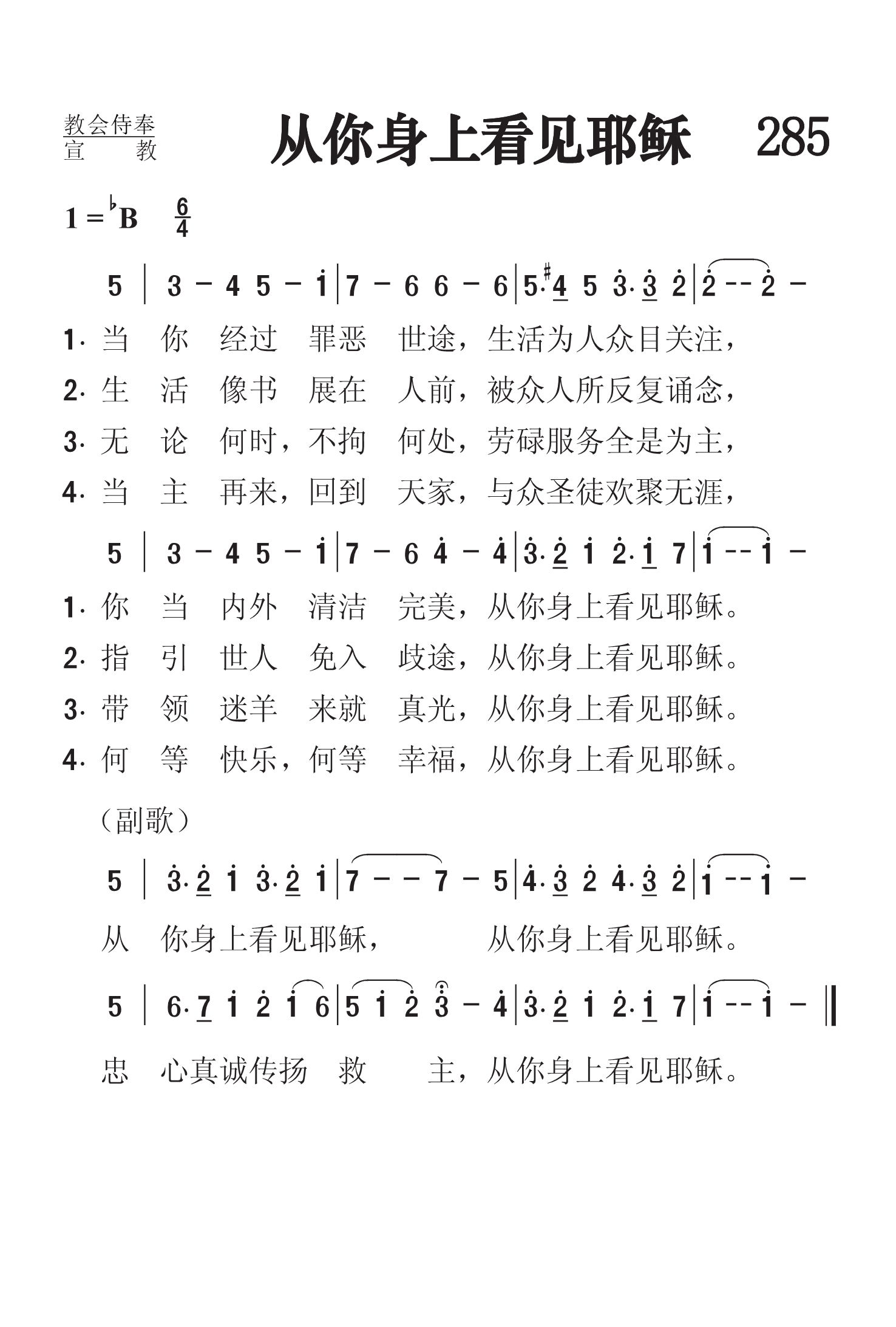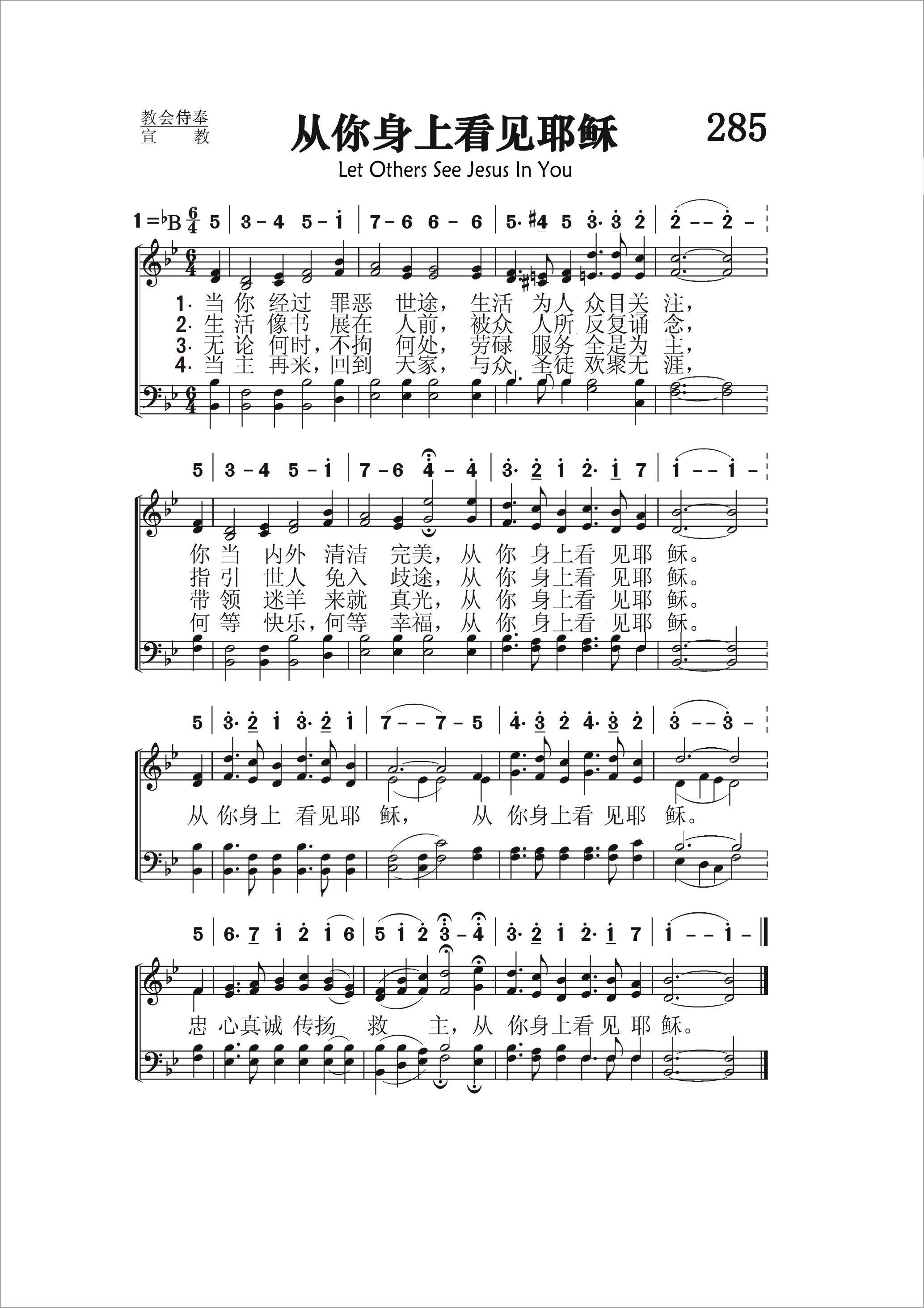 第285首 从你身上看见耶稣Let Others See Jesus in You 麦金尼(Baylus Benjamin Mckinney,1886.7.22-1952.9.7年)作词作曲(1924年) 当你经过罪恶路途,生活为人众目关注, 你当内外清洁完美,从你身上看见耶稣。 生活像书展在人前,被众人所反复诵念, 指引世人免入歧途,从你身上看见耶稣。 无论何时,不拘何处,劳碌服务全是为主, 带领迷羊来就真光,从你身上看见耶稣。 当主再来回到天家,与众肢体欢聚无涯, 何等快乐,何其幸福,从你身上看见耶稣。 从你身上看见耶稣,从你身上看见耶稣。 忠心真诚传扬救主,从你身上看见耶稣。 麦金尼是美国歌唱家,诗歌作家,教师和音乐编辑。曾用化名马大.安妮斯(他母亲的名字)和吉恩.劳思(他妻子的名字)。他发表过赞美诗歌词168首,曲谱89首。从1937至1948年间,他编过五本赞美诗集。他66岁那年在北卡罗莱纳州出席完一个音乐会议回家途中出车祸身亡。 《颂赞诗歌》454首《求大复兴》和504首《搀主钉痕手》也是麦金尼作词作曲的。
