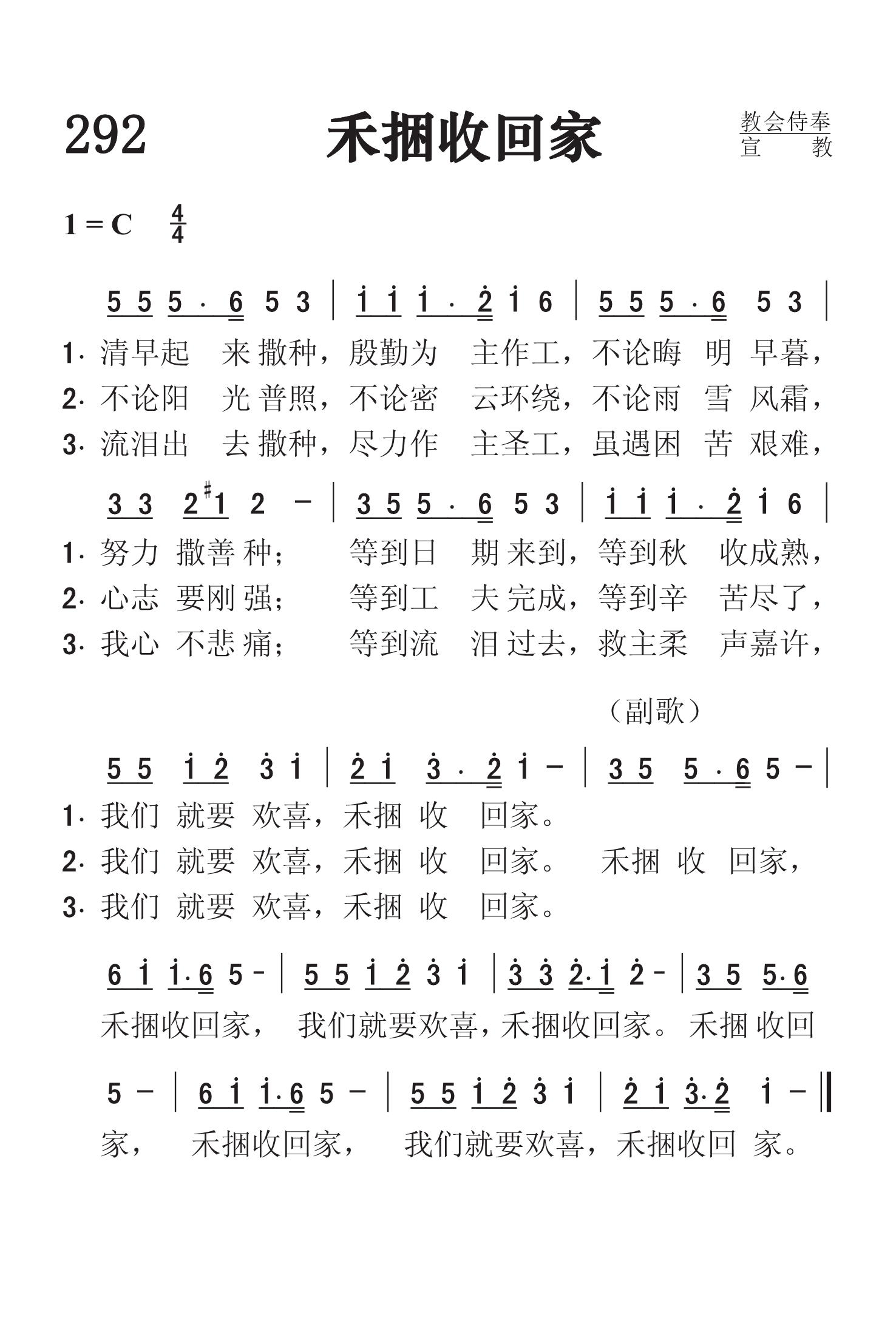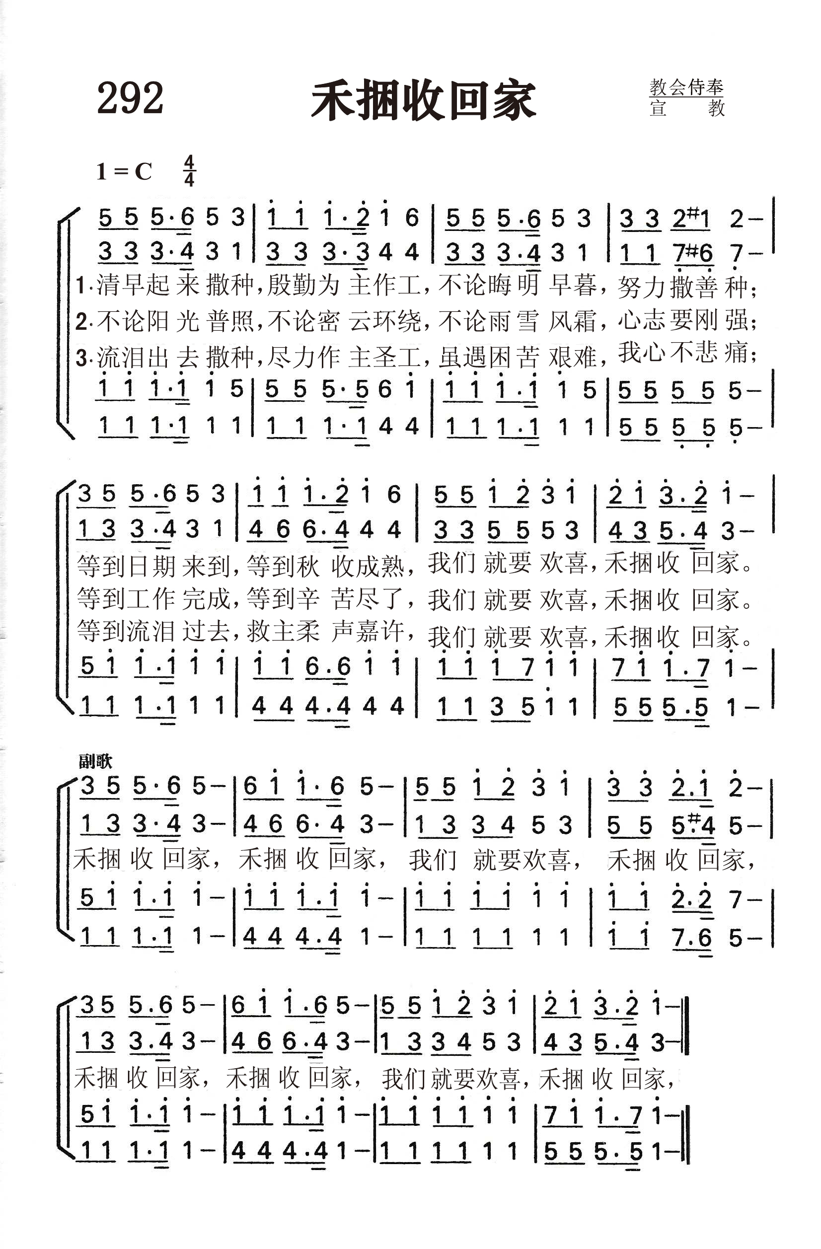 第292首禾捆收回家Bringing in the Sheaves 诺尔斯.肖(K.Shaw,1834,10,31-1878,6,7)作词,迈因纳(G.A.Miner,1845,12,7-1904,1,30)作曲 清早起来撒种,殷勤为主作工, 不论晦明早暮,努力撒善种, 等到日期来到,等到秋收成熟, 我们就要欢喜,禾捆收回家。 不论阳光普照,不论密云环绕, 不论雨雪风霜,心志要刚强, 等到工夫完成,等到辛苦尽了, 我们就要欢喜,禾捆收回家。 流泪出去撒种,尽力作主圣工, 虽遇困苦艰难,我心不悲痛, 等到流泪过去,救主柔声嘉许, 我们就要欢喜,禾捆收回家。 捆收回家,禾捆收回家, 我们就要欢喜,禾捆收回家, 禾捆收回家,禾捆收回家, 我们就要欢喜,禾捆收回家。 这首富有田园气息的赞美诗,反映了福音园地里丰收的喜悦。词作者诺尔斯.肖是美国南方农民的儿子。12岁那年,父亲就身患重病而不治。弥留之际,他把孩子叫到床前嘱咐说:“我就要走了。我把唯一的家产——这把小提琴留给你。你要用它来谋生,奉养母亲,照顾两个妹妹,还要用它来荣耀上帝,随时准备去见祂。”诺尔斯.肖含泪送走了父亲。他白天在田地里辛劳,晚上则在各种宴会和舞会上演奏小提琴。不久他发现音乐所得的收入远远超过务农,于是就弃农经商。他的物质生活日益丰富,但灵性上却日趋软弱。后来他想起了父亲遗言的第二部分,就奋起追求,不断进步,用他的歌声和琴声来赞美主的恩典,引人归主,终于成为誉满南方各州的音乐布道家。 本诗是诺尔斯.肖结合自己务农的经历和布道救人归主的喜悦而写的。有一次,他与另一位元音乐布道家费尔莫牧师进行交流。谈论传道工作的艰辛和救人归主所带来的喜乐。费尔莫牧师曾于1847年出版一本《基督徒诗篇》,几年之内再版十余次,取得了良好的布道效果。诺尔斯.肖根据《诗篇》126:5,6的经句:“流泪撒种的,必欢呼收割。那带种流泪出去的,必欢欢喜喜带禾捆回来”,创作了这首《禾捆收回家》。他还自己配上了曲调,但已失传。现在所通用的,为美国圣乐作曲家迈因纳所谱。副歌也是他后加的,使主题更加明确。迈因纳毕业于军校,曾参加过南北战争,战后从事音乐工作,担任音乐教师和音乐会指挥。后帮助创办迈因纳乐器公司,制造钢琴和风琴。他是浸信会的热心信徒,为主日学的主管,还创作过不少音乐作品。