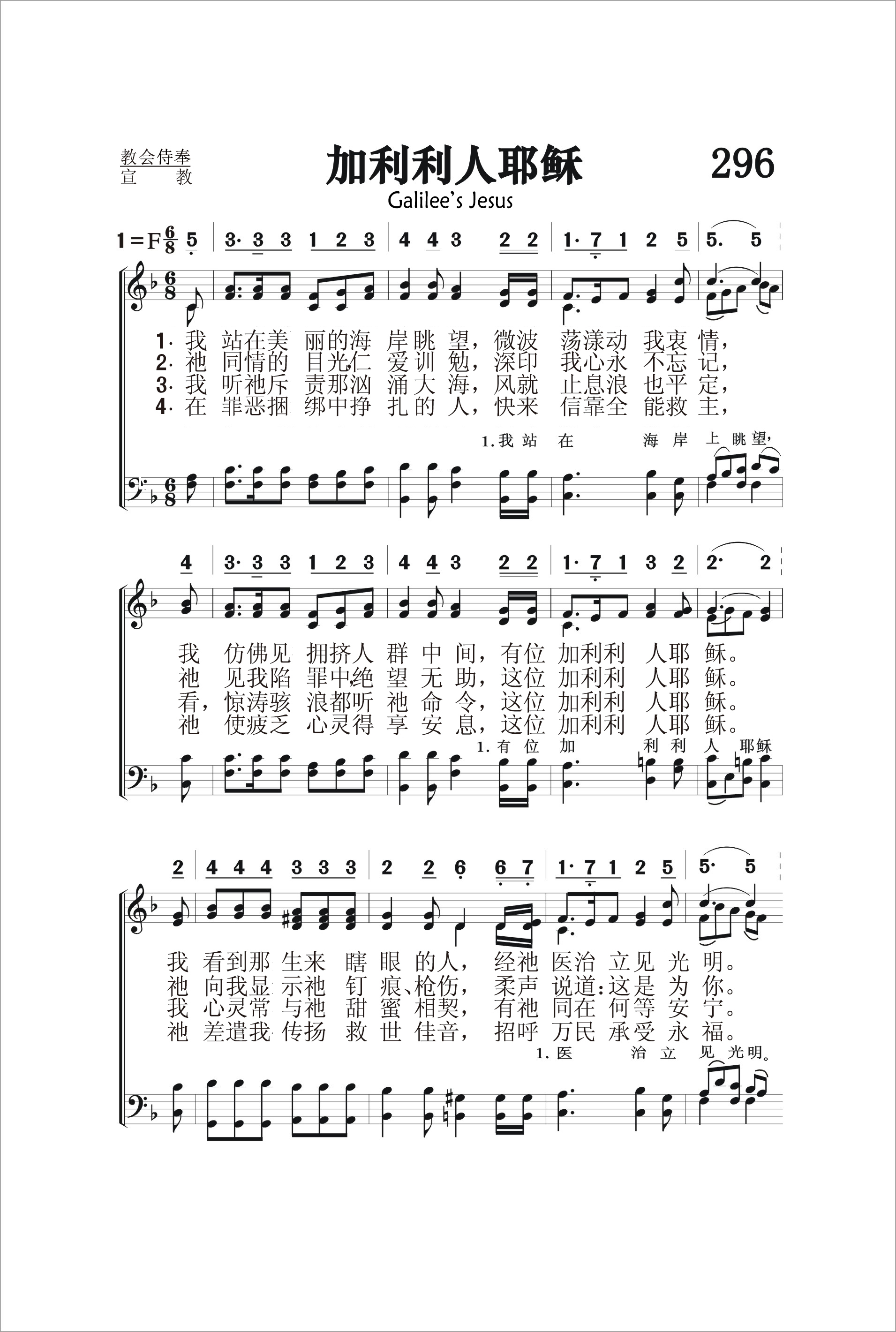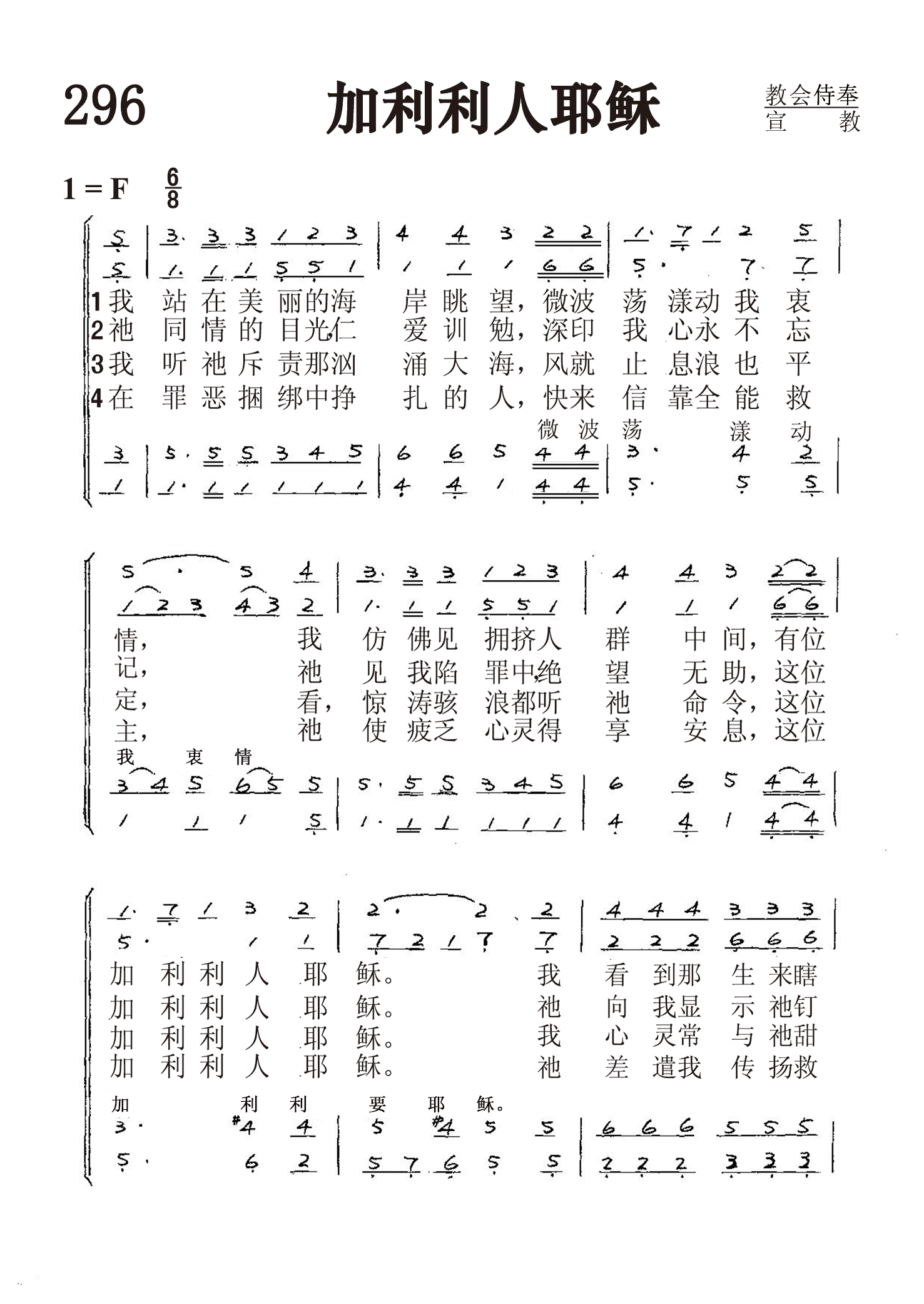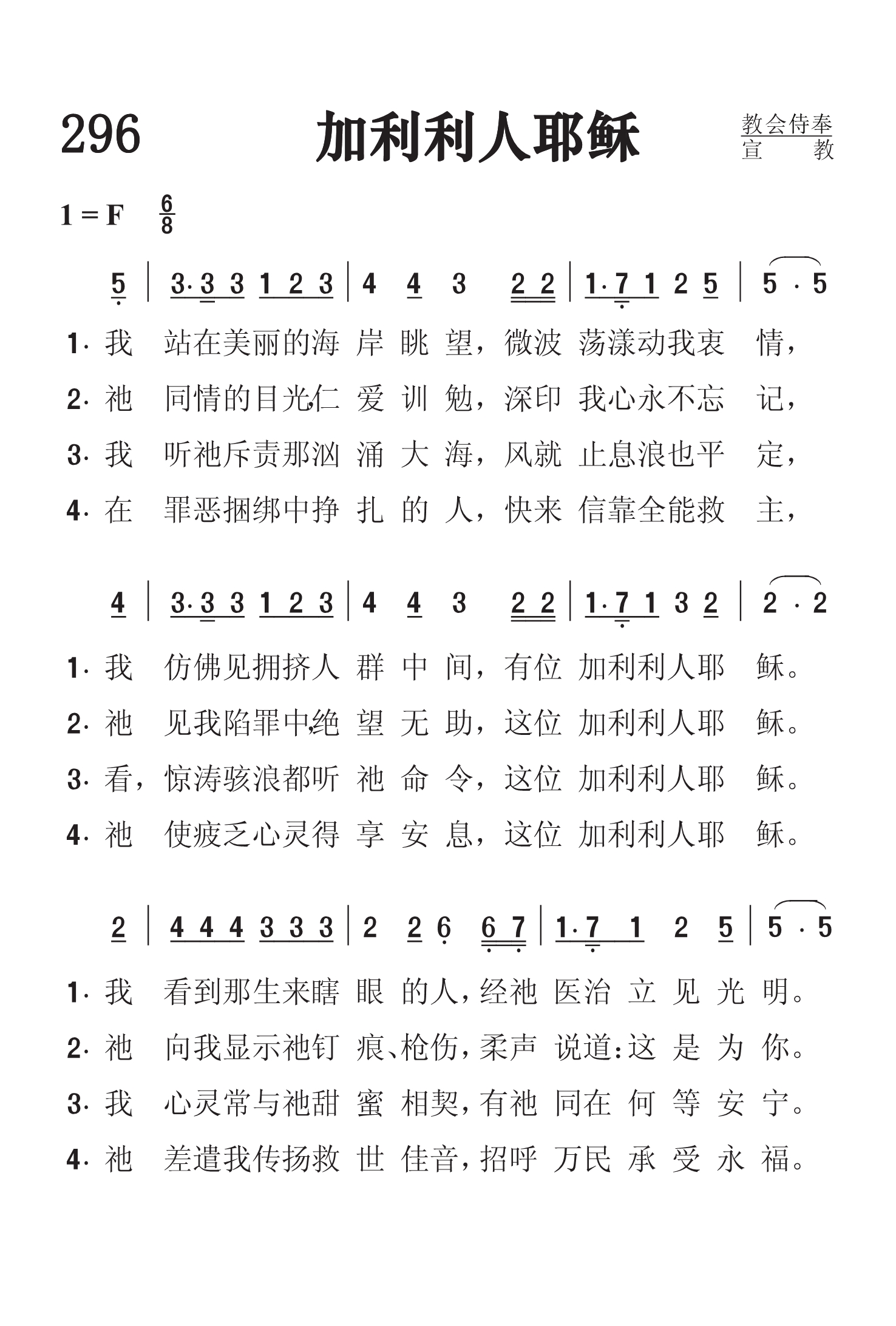 第296首 加利利人耶稣Galilee’s Jesus 莫里斯夫人(Lelia Nayor Morris,1862,4,15-1929,7,23)作词作曲 我站在美丽的海岸眺望.微波荡漾动我衷情, 我仿佛见拥挤人群中间.有位加利利人耶稣。 我看到那生来瞎眼的人,经祂医治立见光明。 祂彰显大能使瘸者行走,这加利利人耶稣。 何等温柔又慈爱的恩主,我怎能不尽心爱慕 我接受祂作我的救主,是加利利人耶稣。 2祂同情的目光仁慈慰勉,深印我心永不忘记, 祂见我陷罪中绝望无助,这位加利利人耶稣。 祂向我显示他钉痕、枪伤,柔声说道:这是为你。 我俯伏祂足前重担全脱,这加利利人耶稣。 何等温柔又慈爱的恩主,我怎能不尽心爱幕 我接受祂作我的救主,是加利利人耶稣。 3我听祂斥责那汹涌大海,风就止息浪也平定, 看,惊涛骇浪都听祂命令,这位加利利人耶稣。 我心灵常与祂甜蜜相契,有祂同在何等安宁。 因祂大能膀臂护我生命,这加利利人耶稣。 何等温柔又慈爱的恩主,我怎能不尽心爱慕 我接受祂作我的救主,是加利利人耶稣。 4在罪恶捆绑中挣扎的人,快来信靠全能救主, 祂使疲乏心灵得享安息,这位加利利人耶稣。 祂差遣我传扬救世佳音,招呼万民承受永福。 只要你接受并和祂同住,这加利利人耶稣。 朋友啊!你愿否永远爱祂,那温柔又慈爱恩主 请接受祂作你的救主,哦!加利利人耶稣。 作者莫里斯是一位美国热心爱主的女信徒。她自幼丧父,两姐妹由母亲经营一间杂货店维持生计,抚养成人。后来她与莫里斯结婚。夫妇二人志同道合,积极参加教会的各项活动,主持各种聚会,关心帮助信徒。莫里斯夫人还充分发挥自己的音乐天赋,创作了一千五百多首赞美诗,其中有许多都是她自己谱曲的。她的诗歌意境优美,旋律热情奔放,脍炙人口,深受欢迎。到了晚年,她虽然双目失明,爱主的心仍丝毫没有减退。她以乐观的精神继续传道创作,直到她歇下劳苦的担子,安息在主怀里。