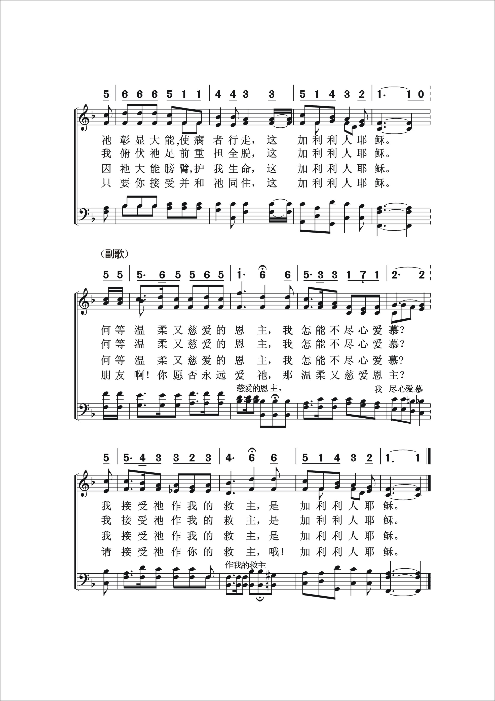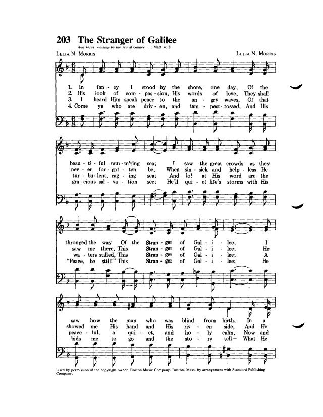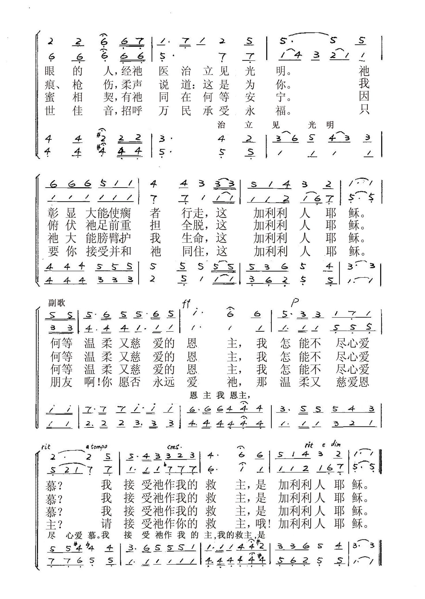 第296首 加利利人耶稣Galilee’s Jesus 莫里斯夫人(Lelia Nayor Morris,1862,4,15-1929,7,23)作词作曲 我站在美丽的海岸眺望.微波荡漾动我衷情, 我仿佛见拥挤人群中间.有位加利利人耶稣。 我看到那生来瞎眼的人,经祂医治立见光明。 祂彰显大能使瘸者行走,这加利利人耶稣。 何等温柔又慈爱的恩主,我怎能不尽心爱慕 我接受祂作我的救主,是加利利人耶稣。 2祂同情的目光仁慈慰勉,深印我心永不忘记, 祂见我陷罪中绝望无助,这位加利利人耶稣。 祂向我显示他钉痕、枪伤,柔声说道:这是为你。 我俯伏祂足前重担全脱,这加利利人耶稣。 何等温柔又慈爱的恩主,我怎能不尽心爱幕 我接受祂作我的救主,是加利利人耶稣。 3我听祂斥责那汹涌大海,风就止息浪也平定, 看,惊涛骇浪都听祂命令,这位加利利人耶稣。 我心灵常与祂甜蜜相契,有祂同在何等安宁。 因祂大能膀臂护我生命,这加利利人耶稣。 何等温柔又慈爱的恩主,我怎能不尽心爱慕 我接受祂作我的救主,是加利利人耶稣。 4在罪恶捆绑中挣扎的人,快来信靠全能救主, 祂使疲乏心灵得享安息,这位加利利人耶稣。 祂差遣我传扬救世佳音,招呼万民承受永福。 只要你接受并和祂同住,这加利利人耶稣。 朋友啊!你愿否永远爱祂,那温柔又慈爱恩主 请接受祂作你的救主,哦!加利利人耶稣。 作者莫里斯是一位美国热心爱主的女信徒。她自幼丧父,两姐妹由母亲经营一间杂货店维持生计,抚养成人。后来她与莫里斯结婚。夫妇二人志同道合,积极参加教会的各项活动,主持各种聚会,关心帮助信徒。莫里斯夫人还充分发挥自己的音乐天赋,创作了一千五百多首赞美诗,其中有许多都是她自己谱曲的。她的诗歌意境优美,旋律热情奔放,脍炙人口,深受欢迎。到了晚年,她虽然双目失明,爱主的心仍丝毫没有减退。她以乐观的精神继续传道创作,直到她歇下劳苦的担子,安息在主怀里。