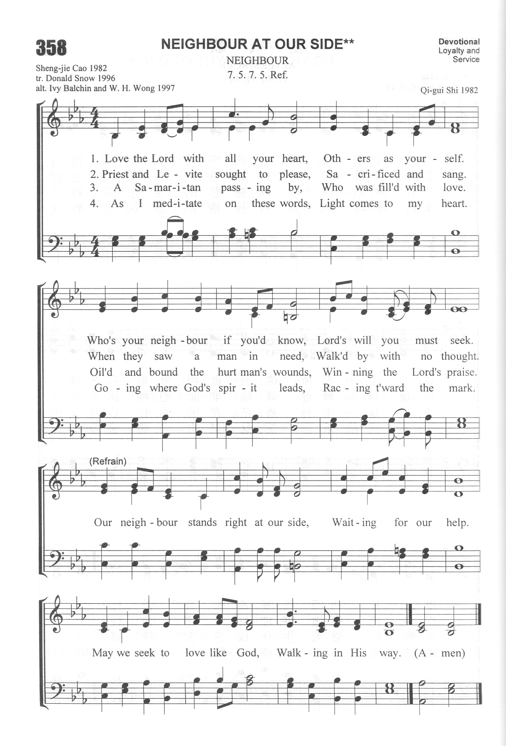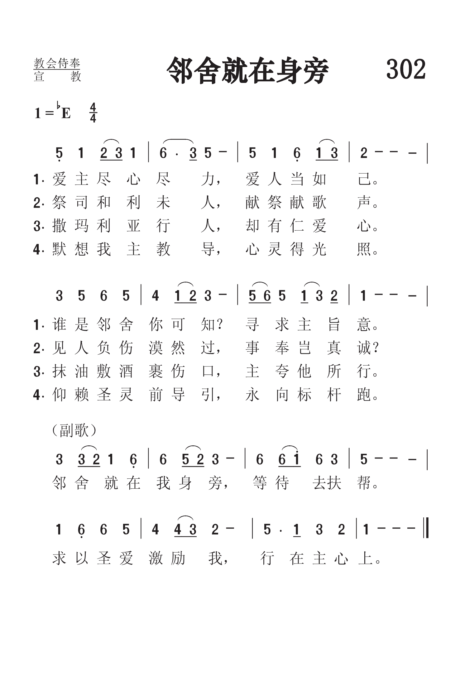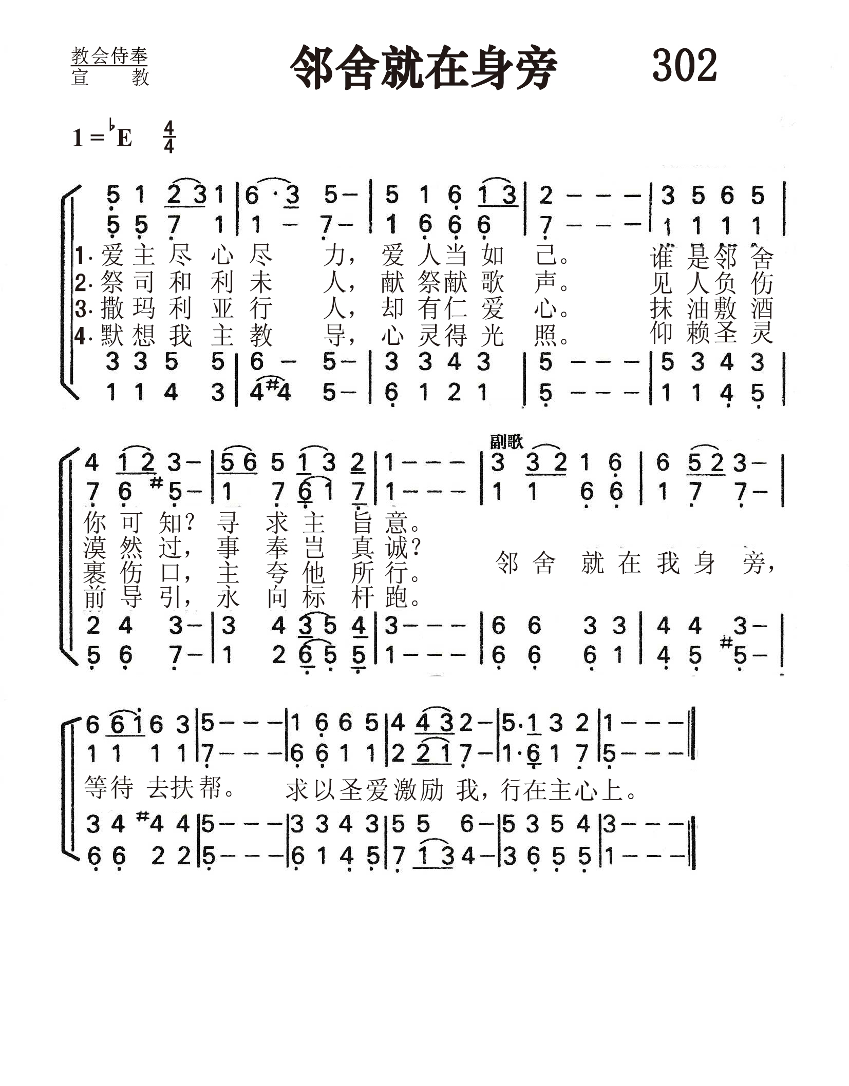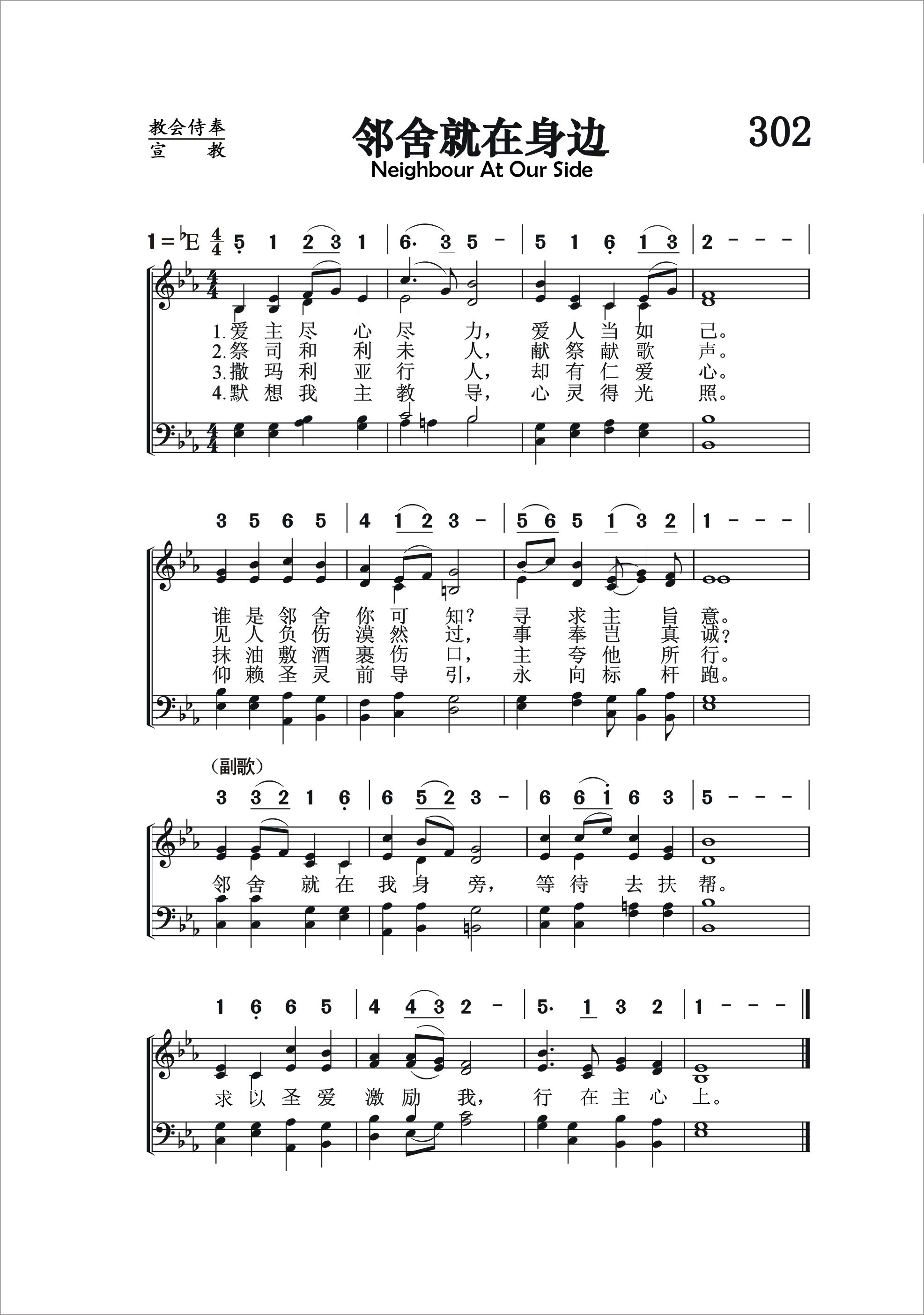 第302首 邻舍就在身旁Neighbour at Our Side 曹圣洁 作词(1982年),史奇圭 作曲(1982年) 爱主尽心尽力,爱人当如己。 谁是邻舍你可知寻求主旨意。 祭司和利未人,献祭献歌声。 见人负伤漠然过。事奉岂真诚? 撒玛利亚行人,却有仁爱心。 抹油敷酒裹人伤,主夸他所行。 默想我主教导,心灵得光 照。 仰赖圣灵前导引,永向标杆跑。 邻舍就在我身旁,等待去扶帮。 但求圣爱激励我,行在主心上。 词作者曹圣洁1931年出生于上海。抚养她成人的外祖母和母亲都是热心的基督徒。曹圣洁少年时代起就在教会任司琴,主日学教员。1949年她从上海进德女子高中毕业以后,进入圣公会中央神学院学习。1953年,她从金陵神学院毕业。五十年代,她在上海圣彼得堂,怀恩堂等传道。1980年任中国基督教协会副总干事。1988年被按立为牧师。1992年被选为中国基督教协会副会长。曹圣洁自幼学习钢琴,精通基督教圣乐,是《赞美诗》新编的主要编写人之一。除了本诗之外,342首《求主开启》和《赞美诗》新编里的《颂主恩光歌》也是她作词的。 曲作者史奇圭1929年出生于苏州一个基督徒家庭。父亲史襄哉教授曾任《普天颂赞》编辑。史奇圭从小爱好音乐。他在东吴大学附中读高中时就决心献身于主。1949年他进金陵神学院学习,曾帮助该院教授黄素贞推进圣乐工作。1953年毕业后在上海教会工作。1955年被按立为牧师。198年参加《赞美诗》新编的编辑。还担任过沐恩堂主任牧师。