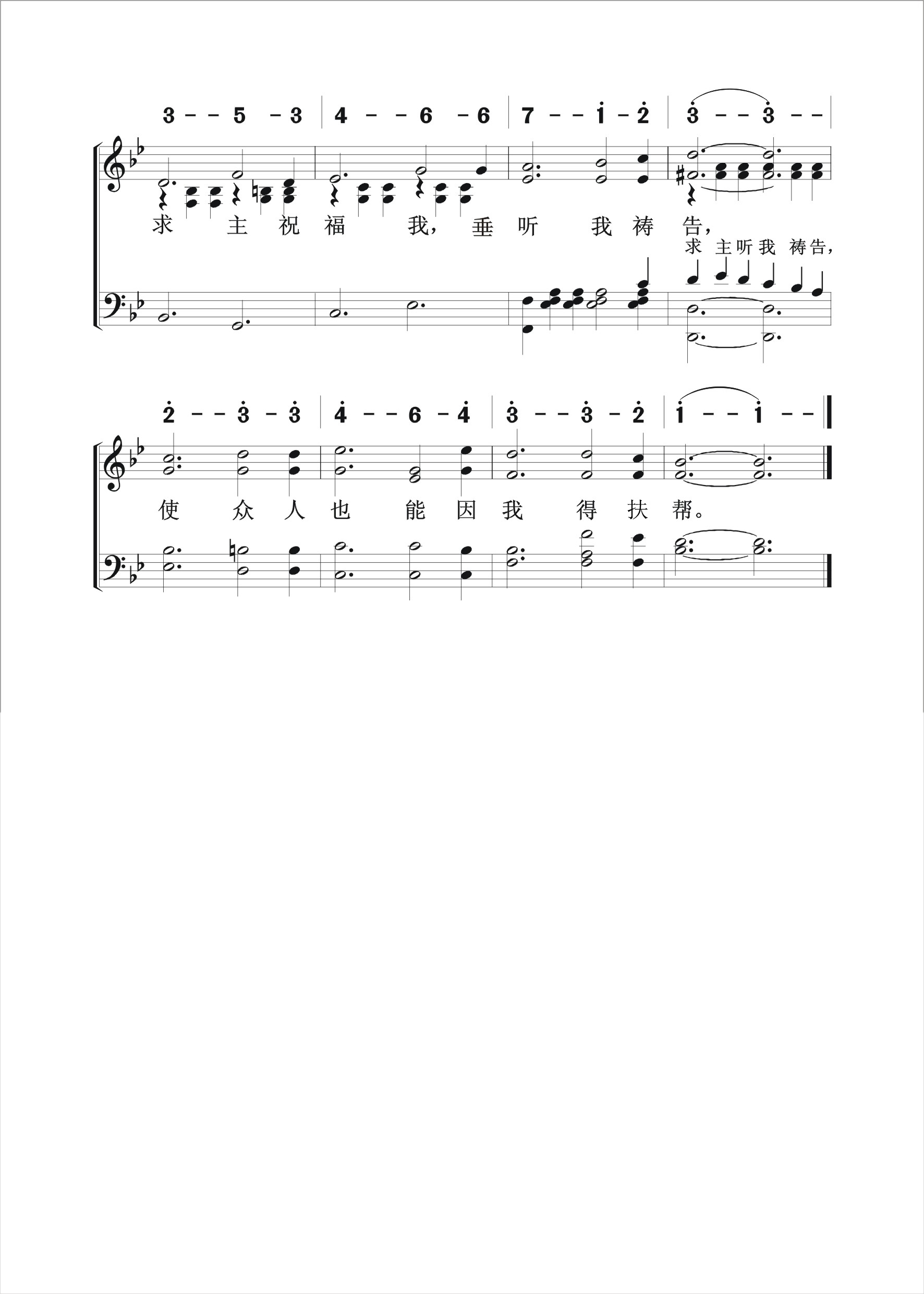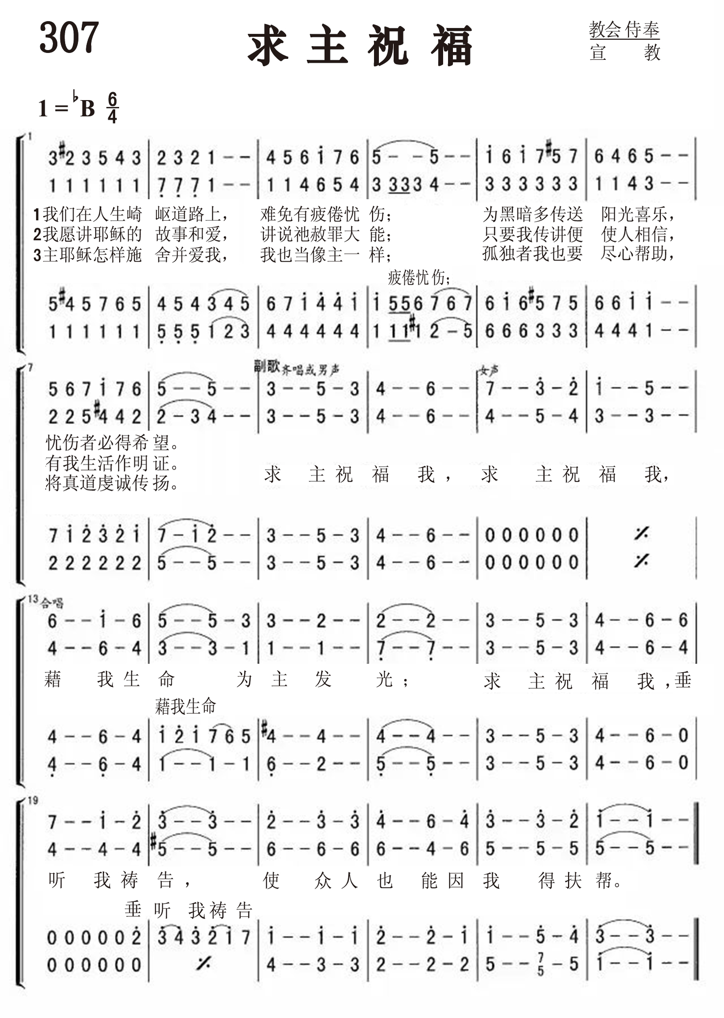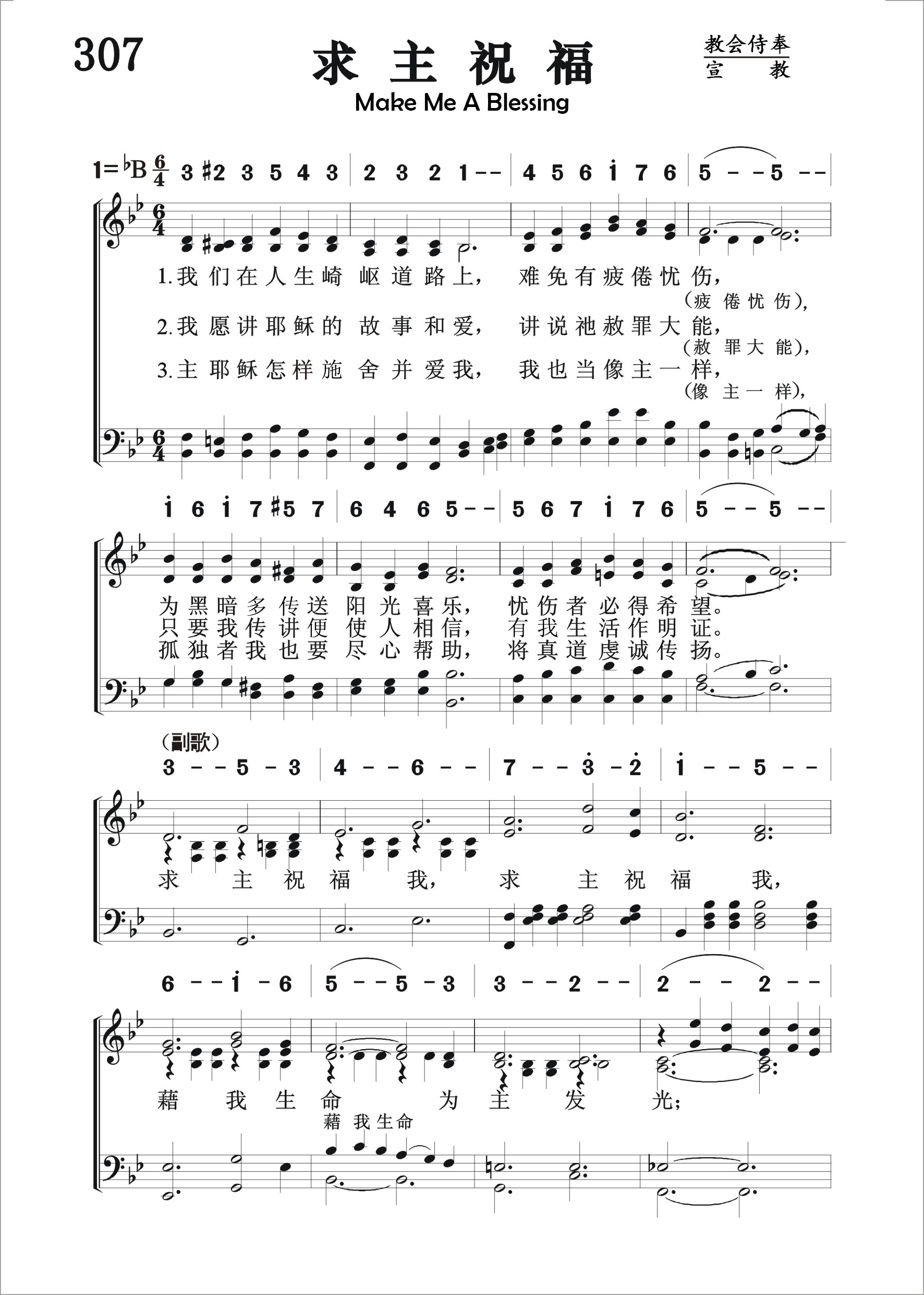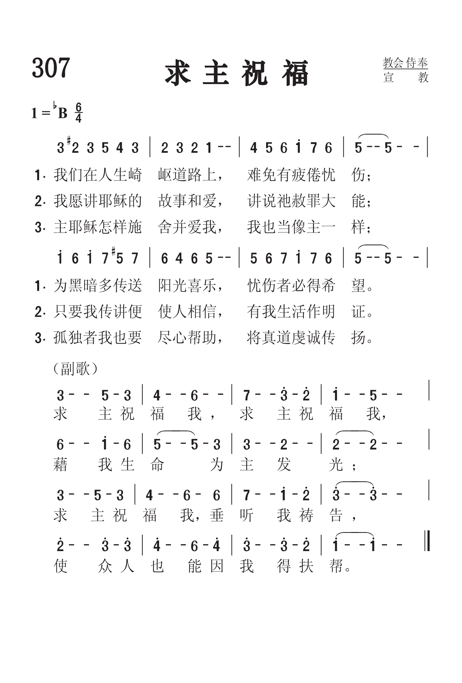 第307首求主祝福Make Me a Blessing 威尔逊(Ira B. Wilson,1881,9,6-1950,4,3)作词(1909年),舒勒(George S. Schuler, 1882,4,18-1973)作曲(1924年) 我们在人生崎岖道路上,难免有疲倦忧伤; 为黑暗中人送阳光喜乐,忧伤者必得希望。 我愿讲耶稣的故事和爱,讲说祂赦罪大能; 只要我传讲会使人相信,因有生活作明证。 主耶稣怎样舍己并爱我,我也当像主一样, 孤独者我也要尽心帮助,将真道虔诚传扬。 求主祝福我,求主祝福我,藉我生命为主发光; 求主祝福我,垂听我祷告,使众人也能因我得扶帮。 词作者威尔逊出生于美国爱荷华州,曾随他姊姊学小提琴,风琴与和声学。 1902年进慕迪圣书学院,接受布道音乐的训练。他有许多笔名,1905年,任出版公司编辑,编印合唱歌曲及数本圣乐杂志。 曲作者舒勒出生于纽约,就读于芝加哥音乐学院及慕迪圣书学院,并在该校执教四十年。退休后在出版公司任编辑,作了许多福音诗歌,并编印钢琴和风琴乐谱。据说本曲原稿送给出版公司时,曾被退回,舒勒斥资制版,印了一千份,当时几乎亏损。 直到著名布道家迪布尔(George Dibble)在俄亥俄州克里夫兰国际主日学会议时介绍本诗,才使之不胫而走。
