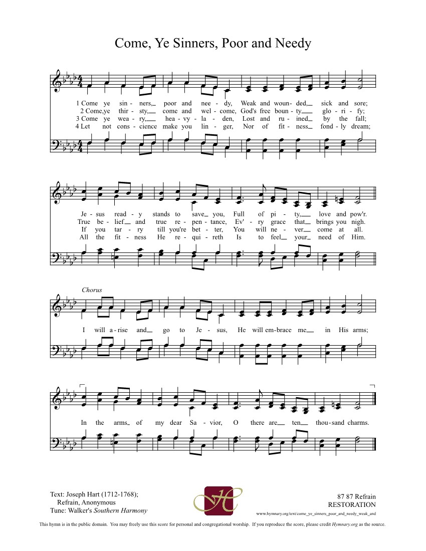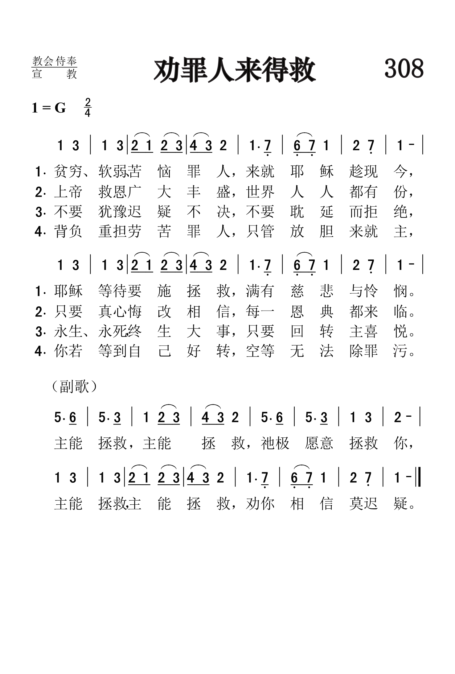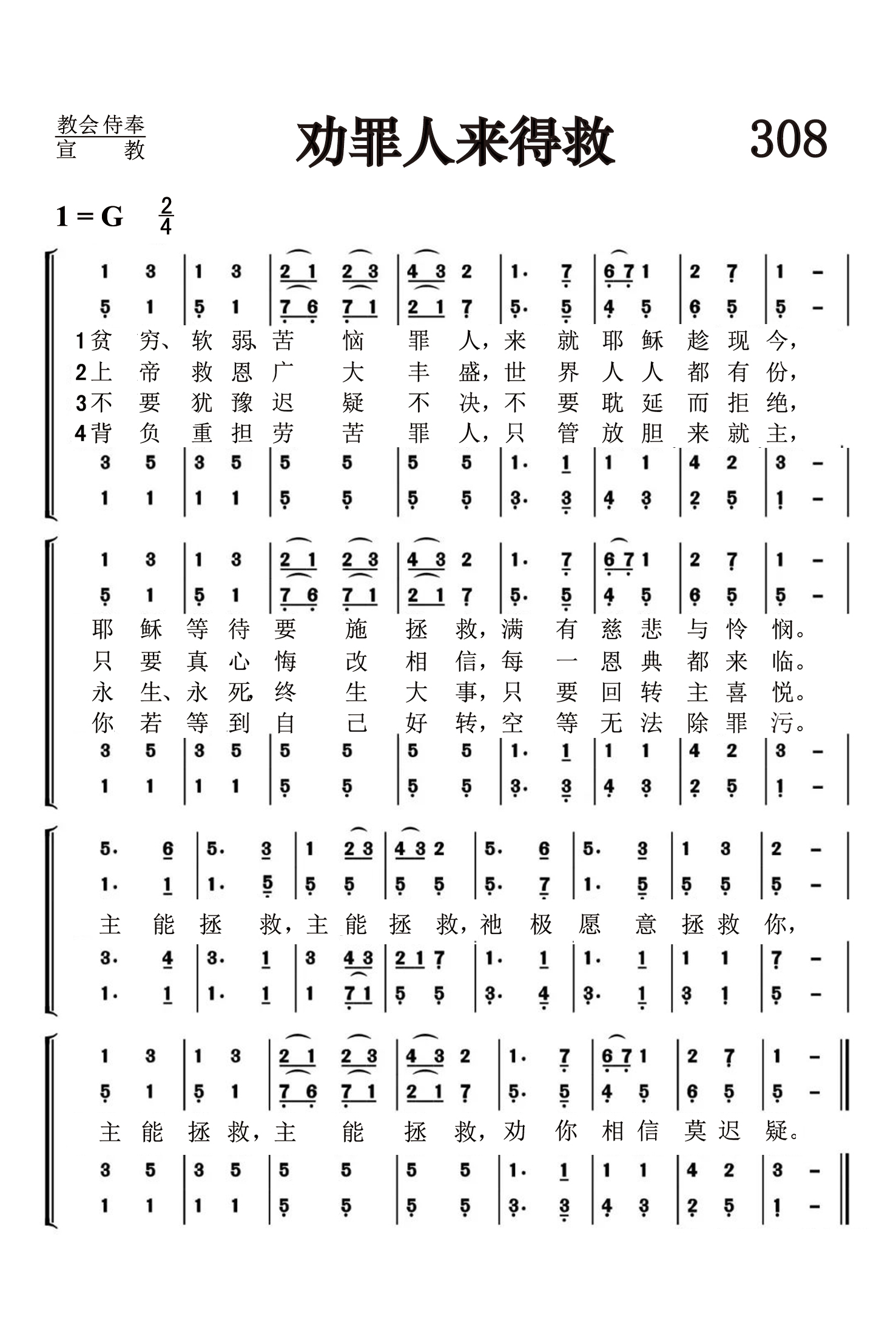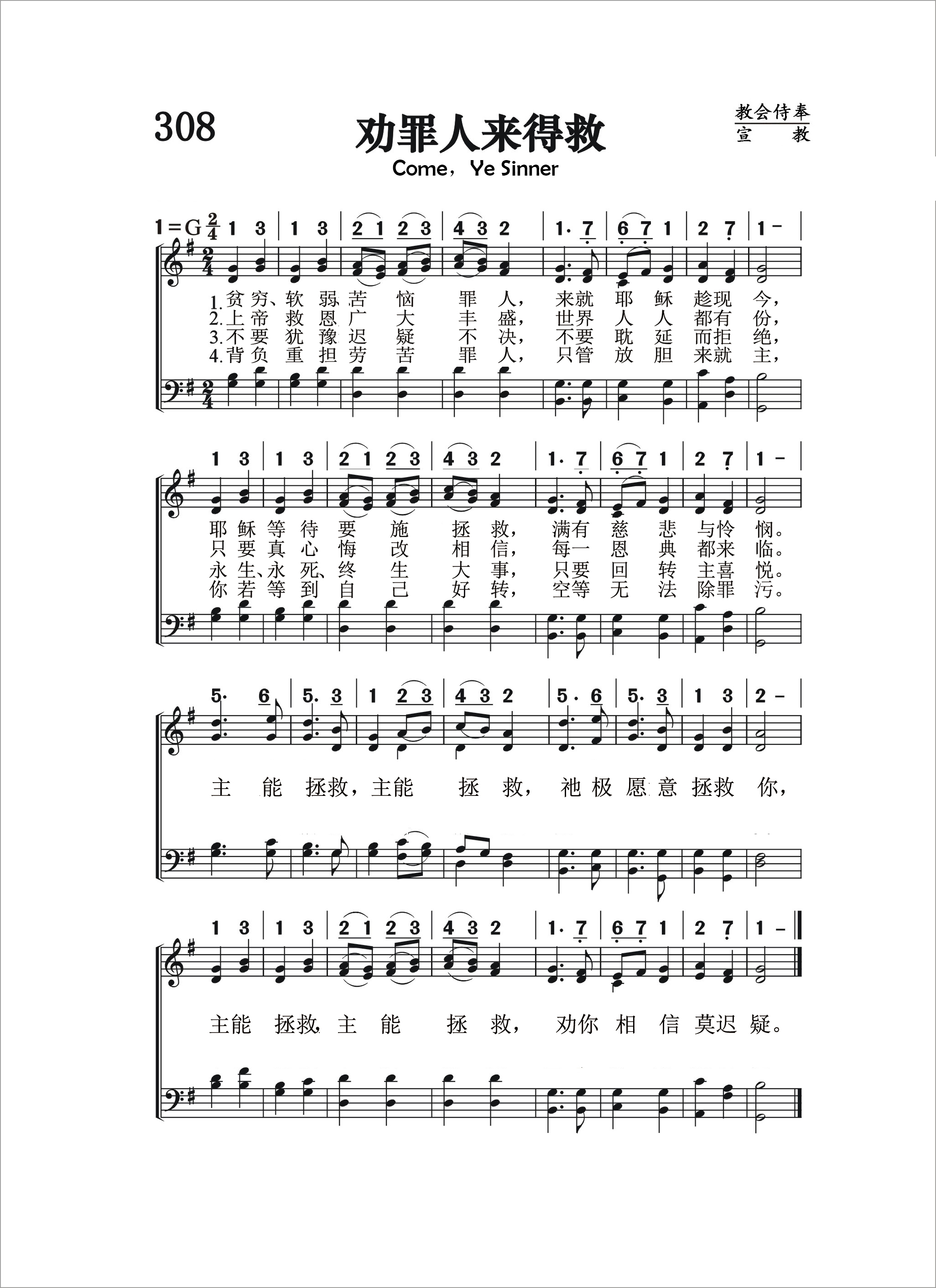 第308首劝罪人来得救Come,Ye Sinner 约瑟夫.哈特(Joseph Hart,1712-1768)作词,英戈尔斯(I.Ingalls)作曲 贫穷\软弱\ 苦恼罪人,来就耶稣趁现今, 耶稣等待要施拯救,满有慈悲与怜悯。 上帝救恩广大丰盛,世界人人都有份, 只要真心悔改相信,每一恩典都来临。 不要犹豫迟疑不决,不要耽延而拒绝, 永生\ 永死,终生大事,只要回转主喜悦。 背负重担劳苦罪人,只管放胆来就主, 你若等到自己好转,空等无法除罪污。 主能拯救,主能拯救,祂极愿意拯救你, 主能拯救,主能拯救,劝你相信莫迟疑。 这首诗歌是英国约瑟夫.哈特牧师的代表作品。哈特出身在伦敦敬虔热心的基督徒家庭,受过良好的教育,曾多年担任中学语文教师。他对于基督教持怀疑态度。到了二十八九岁竟至完全不信了,还写书反对教会,批评教会的不合理现象。可是他内心却矛盾重重,毫无平安。他在忽视圣灵的感动,放纵私欲的状况中度过了十几年的光阴。1757年的一个下午,他偶然到莫拉维亚教堂去,听牧师宣讲启示录3:10“你既遵守我忍耐的道,我必在普天下人受试探的时候,保守你,免去你的试炼”。结果大受感动,还没有走到家就觉得自己的情感软化到不可思议的程度,便五体投地跪在上帝面前。他体验到灵里突然其来又明显可知的转变,犹如重担从肩上卸下来。于是他决定终身为主服务。 哈特后来在公理会的一个会堂任牧职,为弥补过去虚度的光阴,他努力工作,不辞辛劳,使该会信徒日日增加,蔚然成为伦敦一个大教会。他是一位热诚的布道家,尤其在圣诗的写作上他投入大量的精力。至1768年他去世时,前来送葬者达二万人。主持追思礼拜的牧师说:“哈特牧师好比一头牛,在负轭耕作时倒下了。他甘心乐意负耶稣的轭,想你们宣讲基督,不计个人生死。” 哈特生前曾着有圣诗一部,初版时190余首,再版时又补充了82首,并附有七种不同的《荣耀颂》。他的诗多以布道的呼声为主题。 曲作者英戈尔斯生平不详。