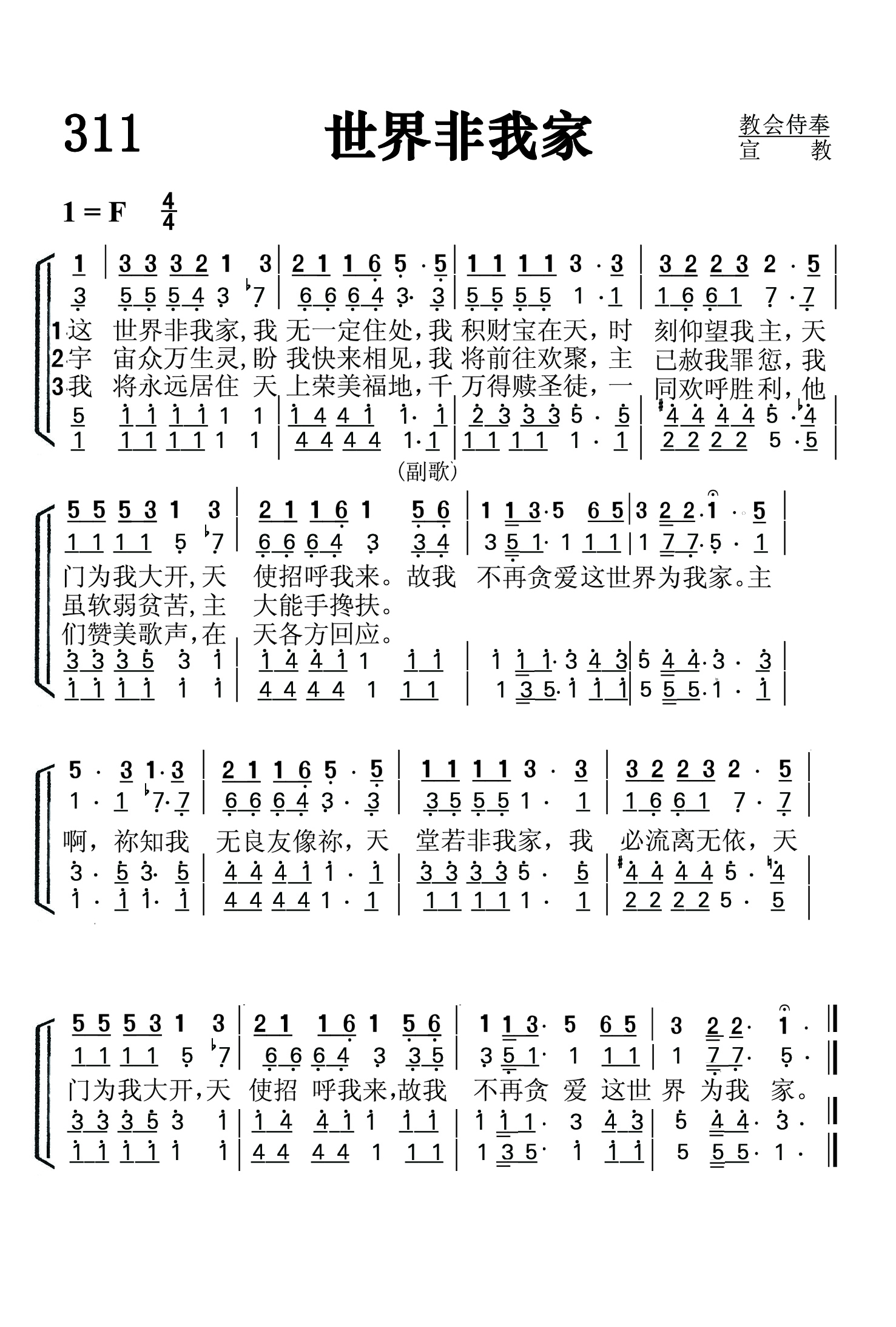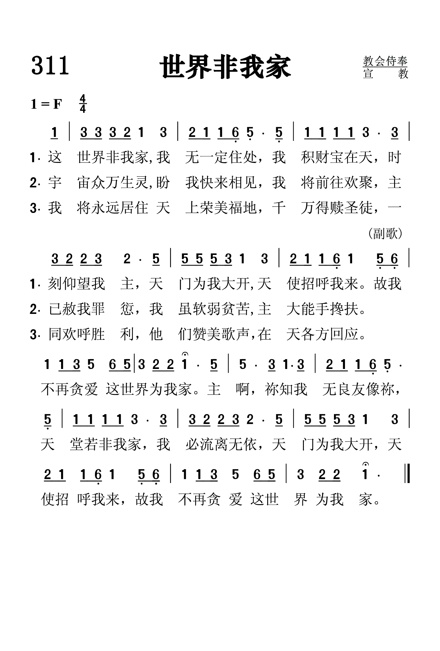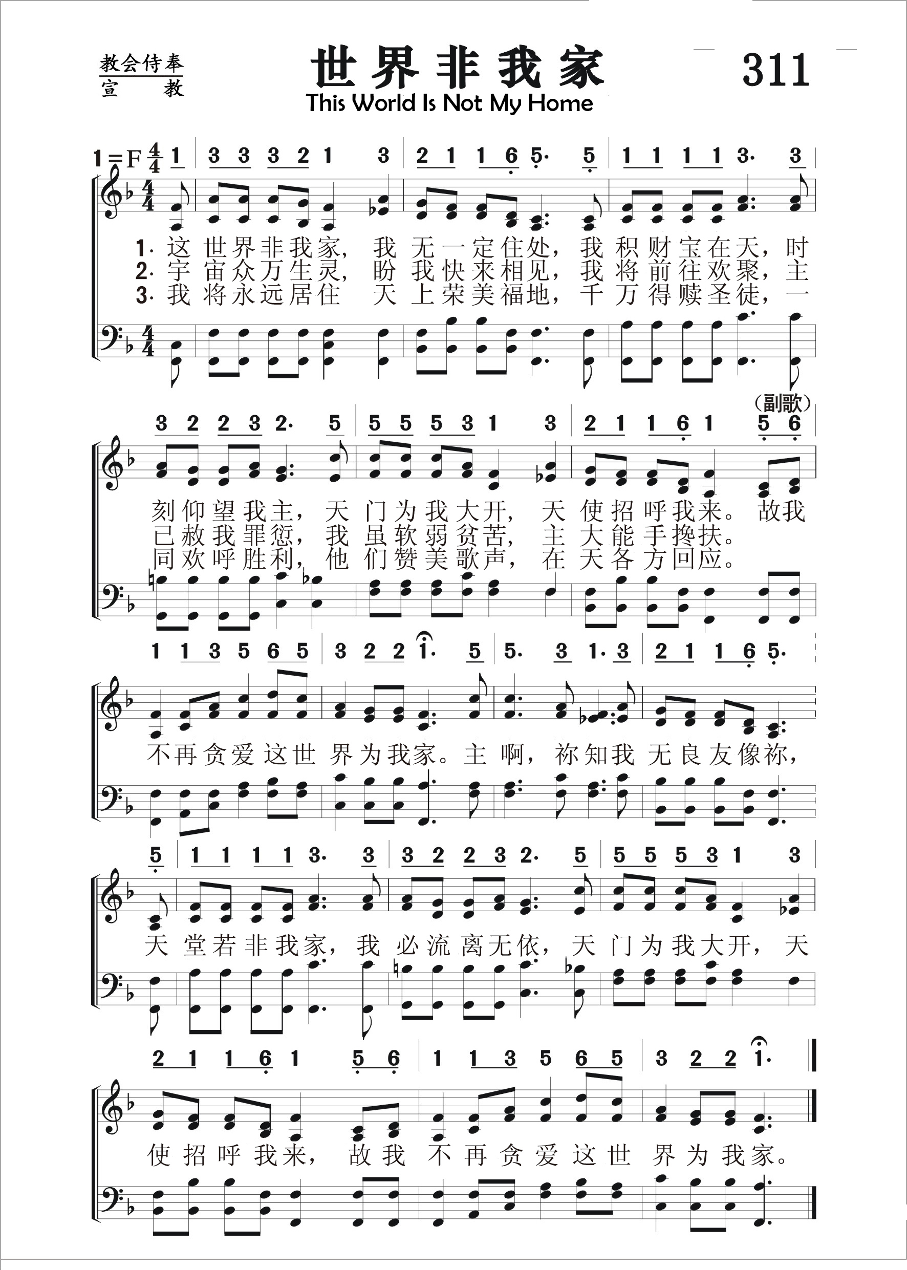 第311首世界非我家This World Is Not My Home 黑人灵歌,布伦利(Albert Edward Brumley,1905,10,29-1977,11,15)改编 这世界非我家,我无一定住处, 我积财宝在天,时刻仰望我主, 天门为我大开,天使呼召迎接。 故我不再贪爱这世界为我家。 宇宙众万生灵,盼我快来相见, 我将前往欢聚,主已赦我罪愆, 我虽软弱贫苦,主大能手搀扶。 故我不再贪爱这世界为我家。 我将永远居住天上荣美福地, 千万得赎圣徒,一同欢呼胜利, 他们赞美歌声,在天各方回应。 故我不再贪爱这世界为我家。 主啊,祢知我无良友像祢, 天堂若非我家,我必流离无依, 天门为我大开,天使招呼我来, 故我不再贪爱这世界为我家。 这是一首著名的黑人灵歌。我们不知道真正的作者。那是在崇拜中会众自内心发出有韵律的歌声契合而成。艾伯特将这首黑人灵歌改编成简易、明确、活泼、轻快的圣诗。艾伯特1905年出生在美国印第安人区,童年以采摘棉花为生,自幼希望进入音乐界,十七岁开始学习音乐。他经历过两次世界大战,深感生命的脆弱,故以“地上的一切荣华富贵都是过眼云烟,转眼成空,惟有天国才是永生的福乐”为诗歌主题居多。他的诗歌词句简易,含意深湛,曲调轻快,战争期间风行一时,也是现代信徒向往天国的有力见证。改编者布伦利出生于美国俄克拉荷马州斯派罗,曾就读于阿肯色州哈德福音乐学院,参加哈德福四重唱组合。后在欧扎克的音乐学校任教。但他的大部分时间是在密苏里州的鲍威尔生活。1931,他录制了他最流行的歌曲之一《我要飞》。他为哈德福一家出版公司任专职作家达35年之久,后他自己创建一家音乐公司。他一生共创作了800多首福音诗歌和其他诗歌。