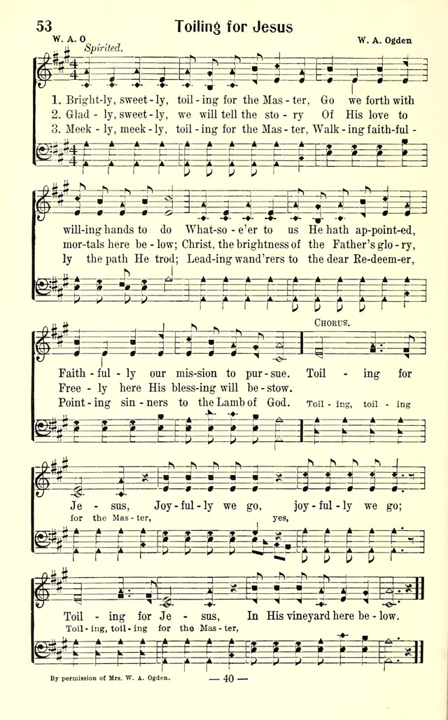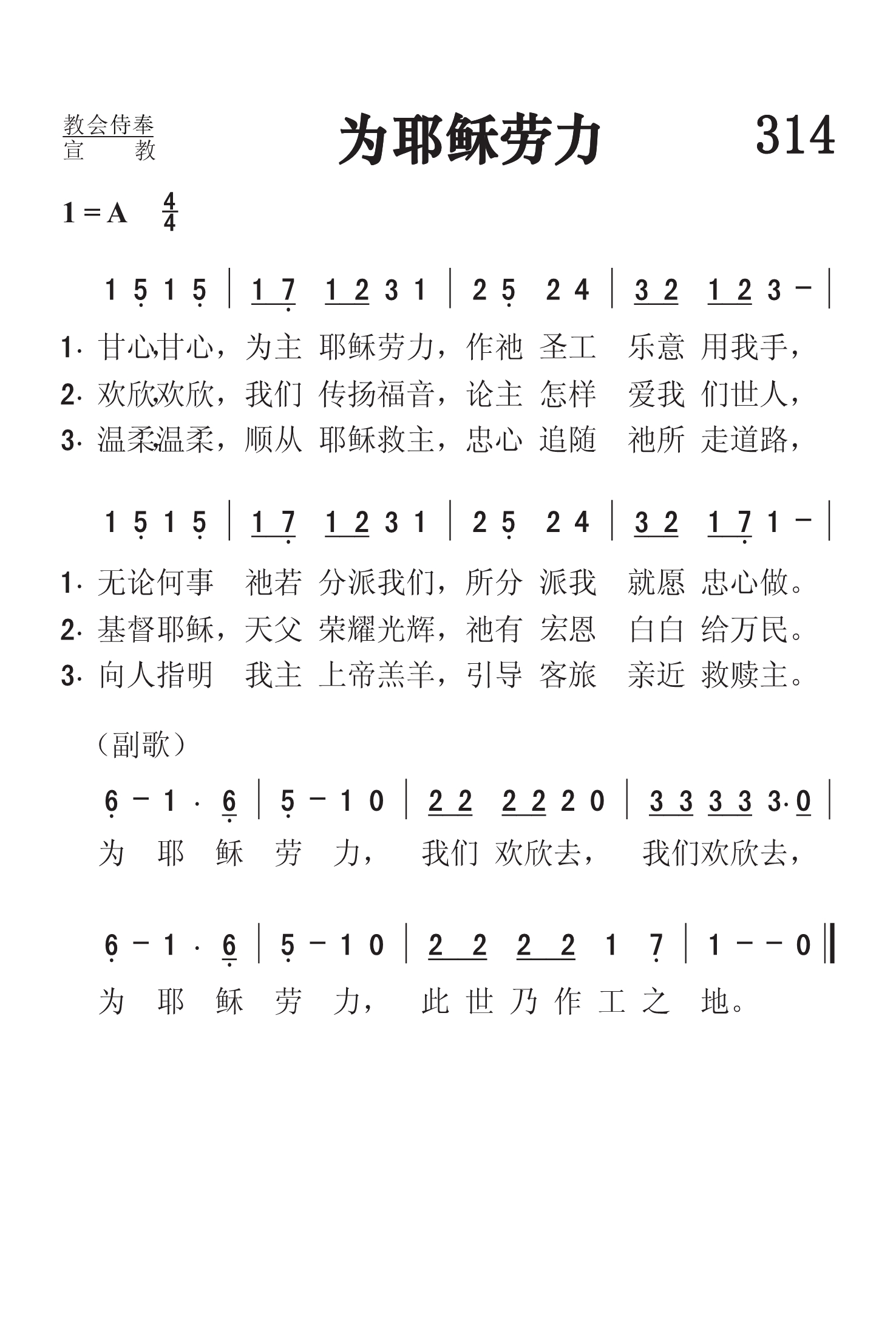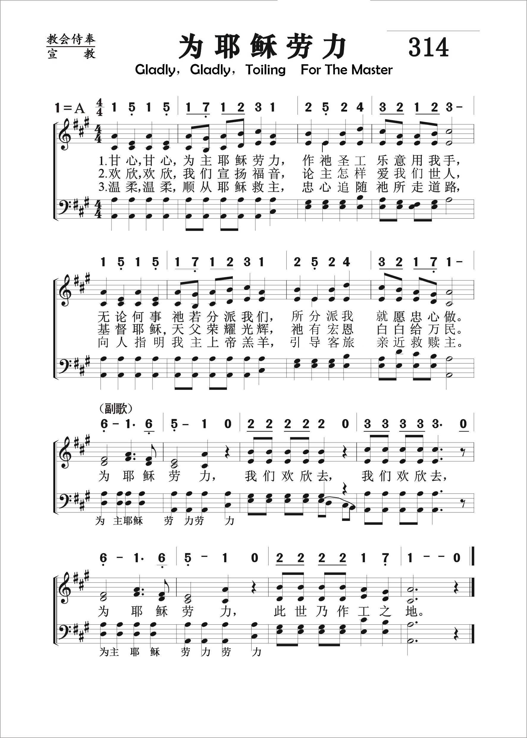 第314首 为耶稣劳力Gladly,Gladly,Toiling for the Master W.A.奥格登(W.A.Ogden,1841,10,10-1897,10,14)作词作曲 甘心,甘心,为主耶稣劳力,作祂工作乐意用我手, 无论何事祂若分派我们,所分派我就愿忠心做。 欢欣,欢欣,我们宣扬福音,讲论救主如何爱世人, 基督耶稣.天父荣耀光辉,祂赐洪恩白白给万民。 温柔,温柔,顺从耶稣救主,忠心跟随祂所走道路, 向人指明我主上帝羔羊,引导客旅亲近救赎主。 为耶稣劳力,我们欢欣去,我们欢欣去! 为耶稣劳力,此世乃作工之地。 这首诗歌表达了信徒为耶稣服务的欢乐心情。当他们被主十字架的大爱所感动,因主耶稣的恩典而得救以后,自然会心中火热,巴不得把给自己带来那么大好处的福音信息传给一切尚未听到的人。他们觉得能参与救人的圣工,是他们人生最大的福气。所以他们能不辞劳苦,不畏艰辛,满腔热情地向同胞指出那“除去世人罪孽的”“上帝的羔羊”。 奥格登生于美国俄亥俄州富兰克林县,6岁时随家迁往印地安纳州,8岁进当地音乐学校学习,10岁就熟悉教会音乐,具有惊人的记谱能力。18岁时,他参加了圣诗班。内战爆发后,他投笔从戎,在部队里组织了一个男声合唱团,遐迩闻名。战后他回家继续学习音乐,并开始创作歌曲。1870年,他出版了第一部诗集,很受欢迎,销量达五十万册。除了作曲以外,他还在多家学校任教,并曾担任俄亥俄州多拉多市公立学校的音乐主管。他所创作的许多圣诗歌词和曲谱至今仍被人传唱。