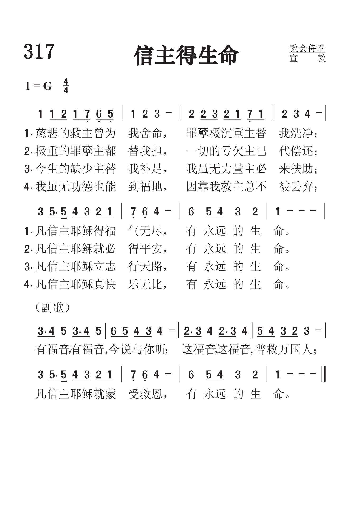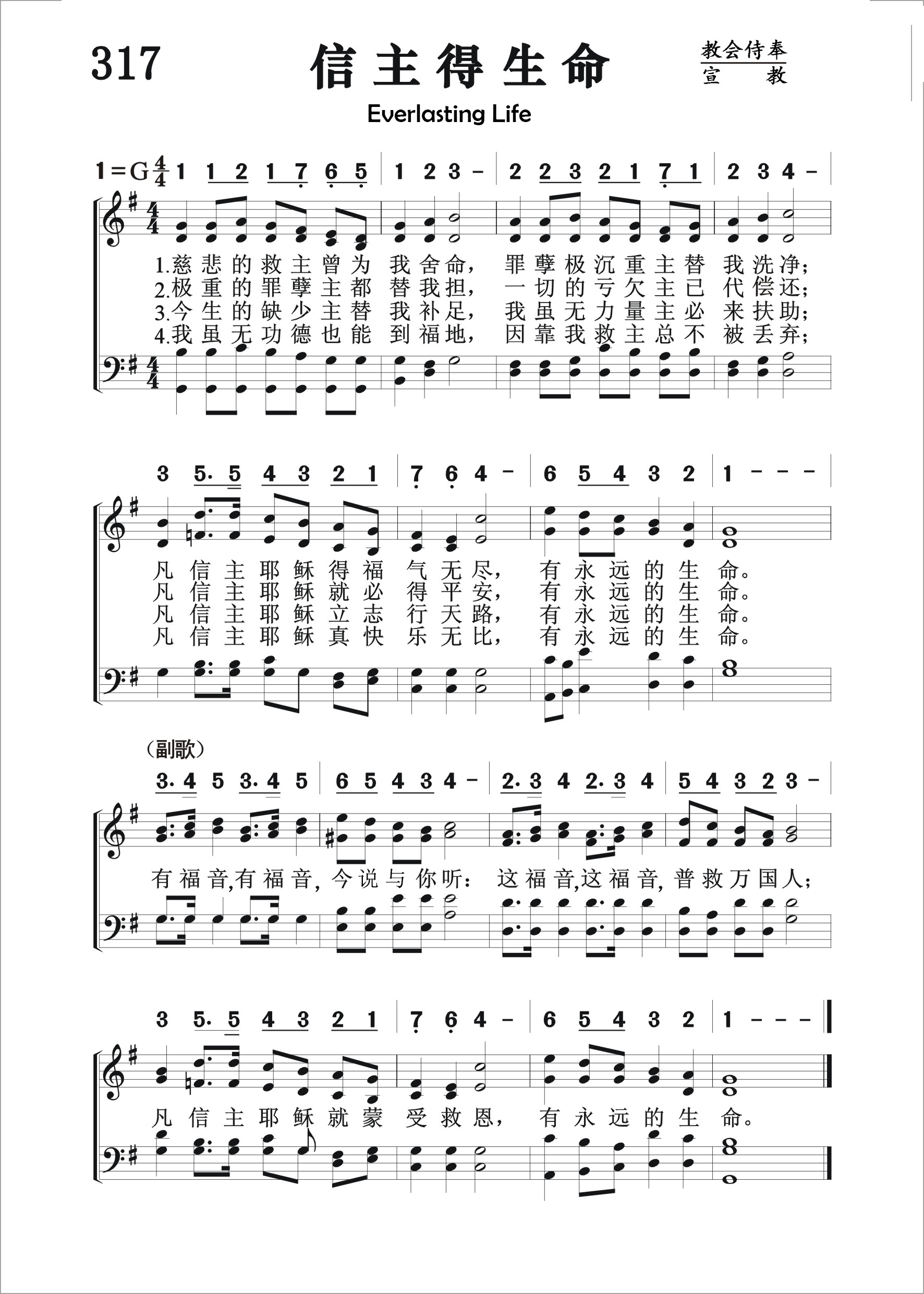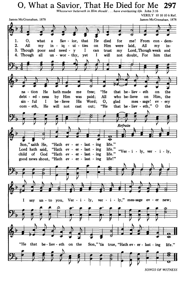 第317首 信主得生命 Everlasting Life 麦格雷纳汉(James McGranahan,1840,7,4-1907,7,9)作词作曲 慈悲的救主曾为我舍命,罪孽极沉重主替我洗净; 凡信主耶稣得福气无尽,有永远的生命。 极重的罪孽主都替我担,一切的亏欠主已代偿还: 凡信主耶稣就必得平安,有永远的生命。 令生的缺少主替我补足,我虽无力最主必来扶助; 凡信主耶稣立志行天路,有永远的生命。 我虽无功德也能到福地,因靠我救主总不被丢弃; 凡信主耶稣真快乐无比。有永远的生命。 有福音,有福音今讲给你听;这福音,这福音普救万国人; 凡信主耶稣就蒙受救恩,有永远的生命。 麦格雷纳汉出生于美国的一个农民家庭,所受的正式教育很有限,却靠自己的努力和爱好,使他在19岁时就出任音乐教师。以后他到纽约州布雷德伯里所办的音乐学校短期学习,接着便参加福音布道团以歌声宣扬主名。1877年,福音歌唱家、作曲者布利斯突然去世,他便与诗人惠特尔合作,组织布道团,旅行美国各地并前往英国,担任唱诗班领唱,以他优美动听的男高音和亲切感人的魅力大获成功。他还首先组织完全是男声的唱诗班,曾与桑基,鲁特,斯特宾斯等人合编出版多本福音诗歌集,其中较有名的有《男声福音圣诗》二卷,《福音圣诗》等。他自己也写诗。