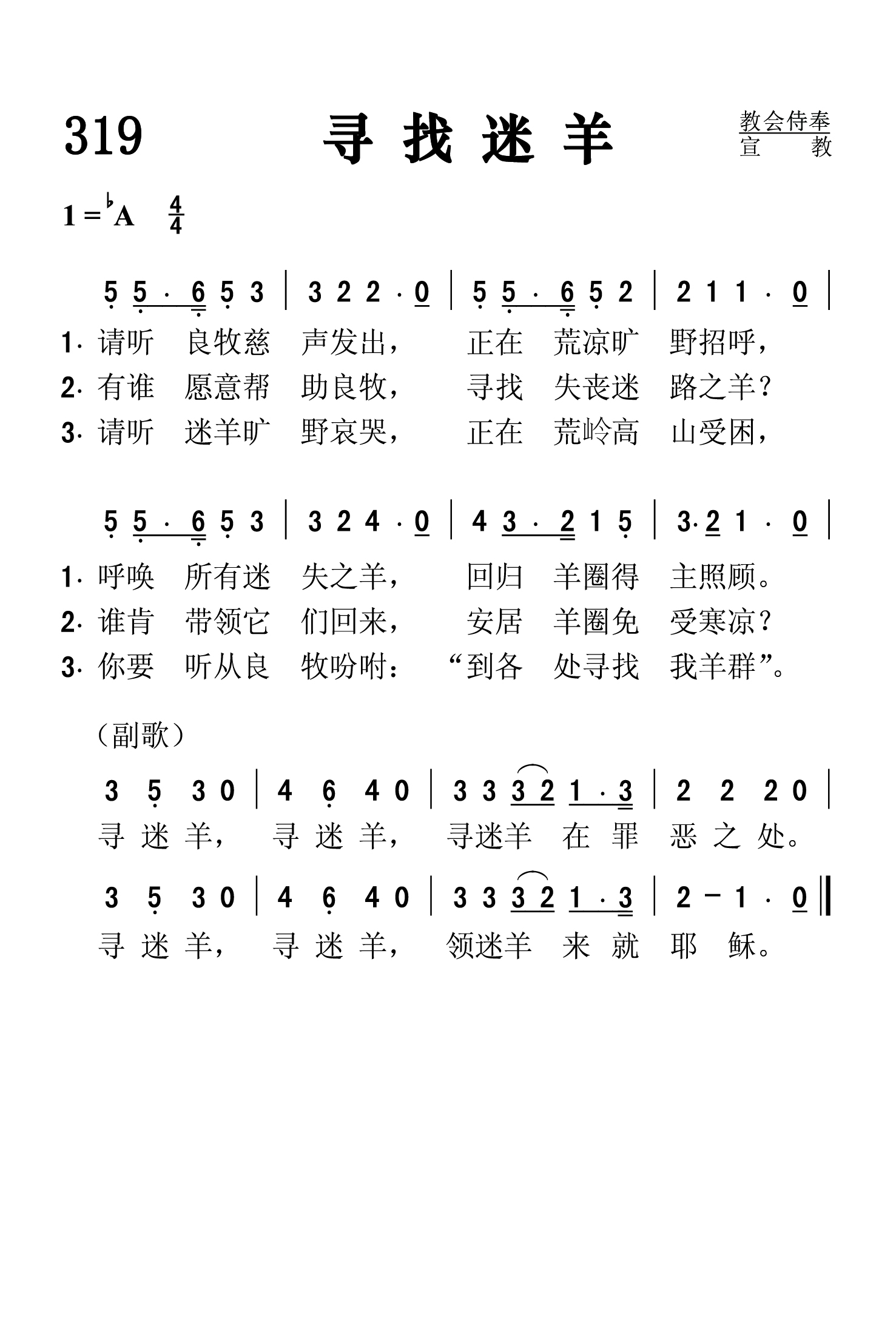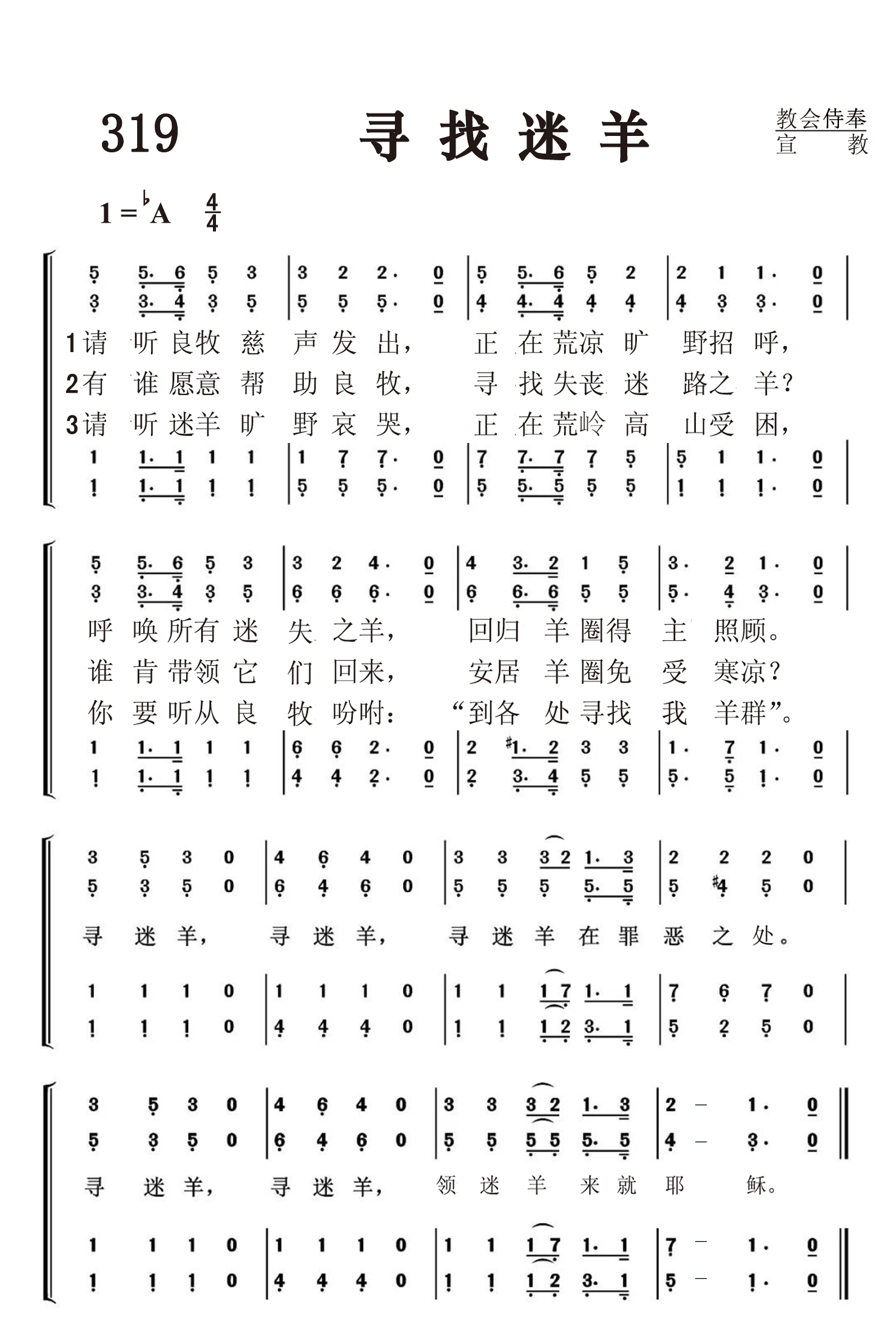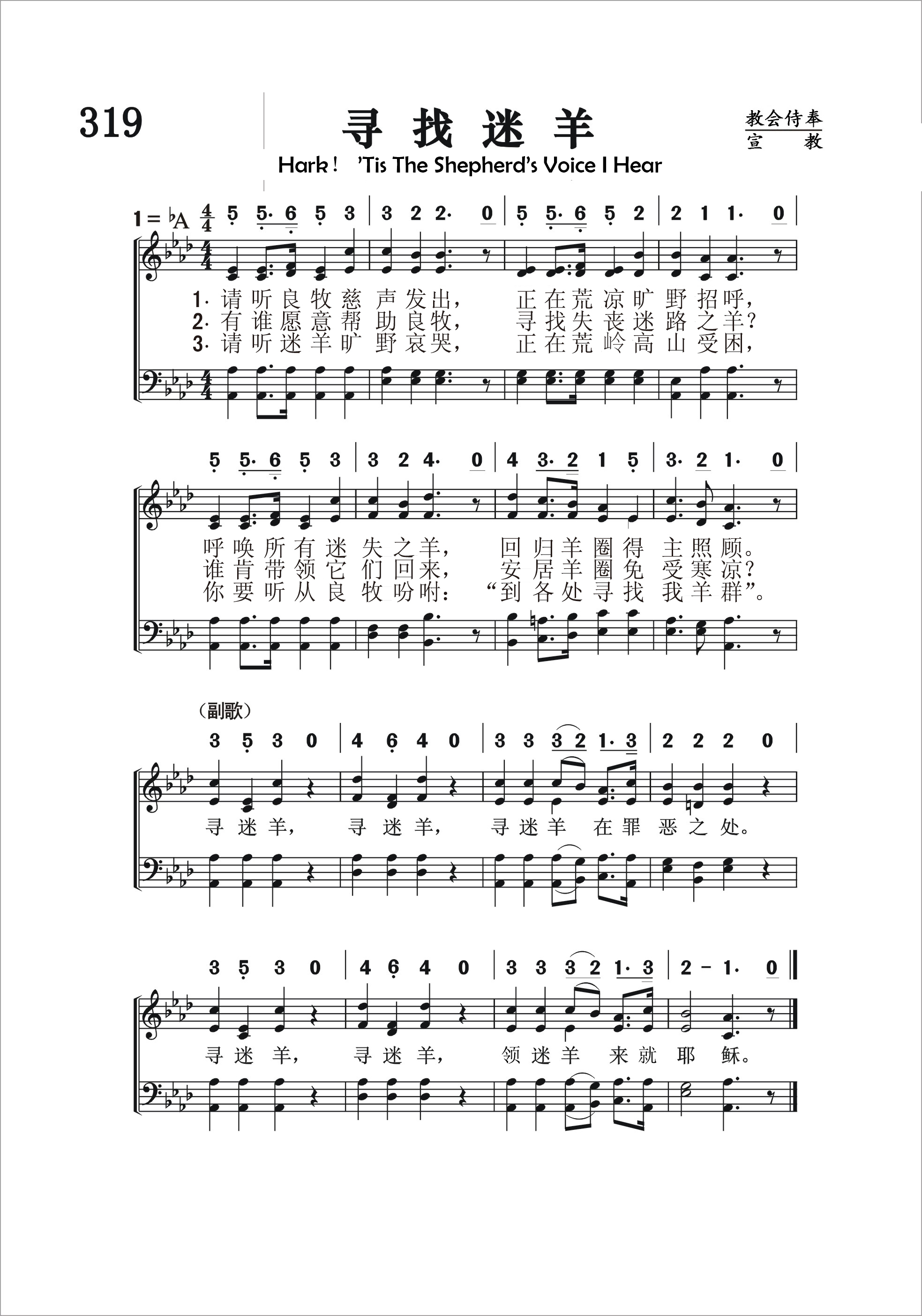 第319首寻找迷羊Hark! ’Tis the Shepherd’s Voice I Hear 托玛斯(Alexcenah Thomas)作词(1885年),奥格登(W.A.Ogden,1841,10,10-1897,10,14)作曲 请听良牧慈声发出,即在凄凉旷野招呼, 呼唤所有迷失之羊,回归羊圈地主照顾。 有谁愿意帮助良牧,寻找失丧迷路之羊, 谁肯带领它们回来,安居羊圈免受寒凉? 请听迷羊旷野哀哭,正在荒岭高山受困, 你要听从良牧吩咐:“到各处寻找我羊群”。 寻迷羊,寻迷羊,寻迷羊在罪恶之处。 寻迷羊,寻迷羊,领迷羊来就耶稣。 “我另外有羊,不是这圈里的;我必须领它们来,它们也要听我的声音,并且要合成一群,归一个牧人”(约10:16)。 这首诗歌形象地描写了良牧耶稣跋山涉水寻找迷路之羊,也就是失丧在罪途之中的人类,把救主不辞辛劳,不畏风险,牵挂,怜悯,关爱罪人的慈悲心肠表达得淋漓尽致。诗歌的最后:“寻迷羊,寻迷羊,寻迷羊在罪恶之处;寻迷羊,寻迷羊,使迷羊来就耶稣。”言简而意赅,鲜明地点出了本诗的主题,予以强调。 词作者托玛斯生平不详。 曲作者奥格登出生于美国俄亥俄州富兰克林县,6岁时随家迁往印地安纳州,8岁进当地音乐学校学习,10岁就熟悉教会音乐,具有惊人的记谱能力。18岁时,他参加了圣诗班。内战爆发后,他投笔从戎,在部队里组织了一个男声合唱团,遐迩闻名。战后他回家继续学习音乐,并开始创作歌曲。1870年,他出版了第一部诗集,很受欢迎,销量达五十万册。除了作曲以外,他还在多家学校任教,并曾担任俄亥俄州多拉多市公立学校的音乐主管。他所创作的许多圣诗歌词和曲谱至今仍被人传唱。 121首《慈爱牧者》,314首《为耶稣劳力》是奥格登作词作曲的。港版第321首《与主同工》是他作词的。