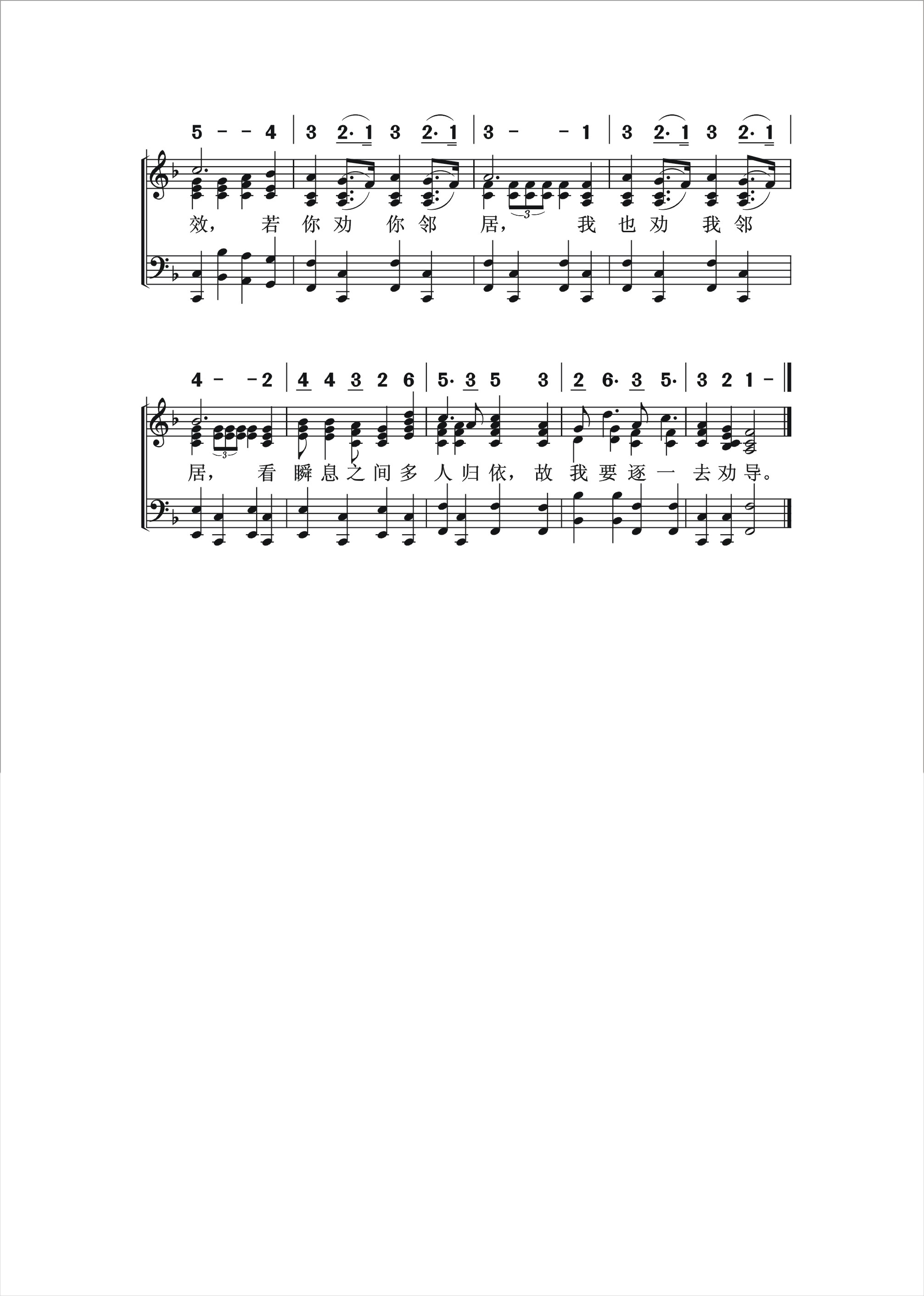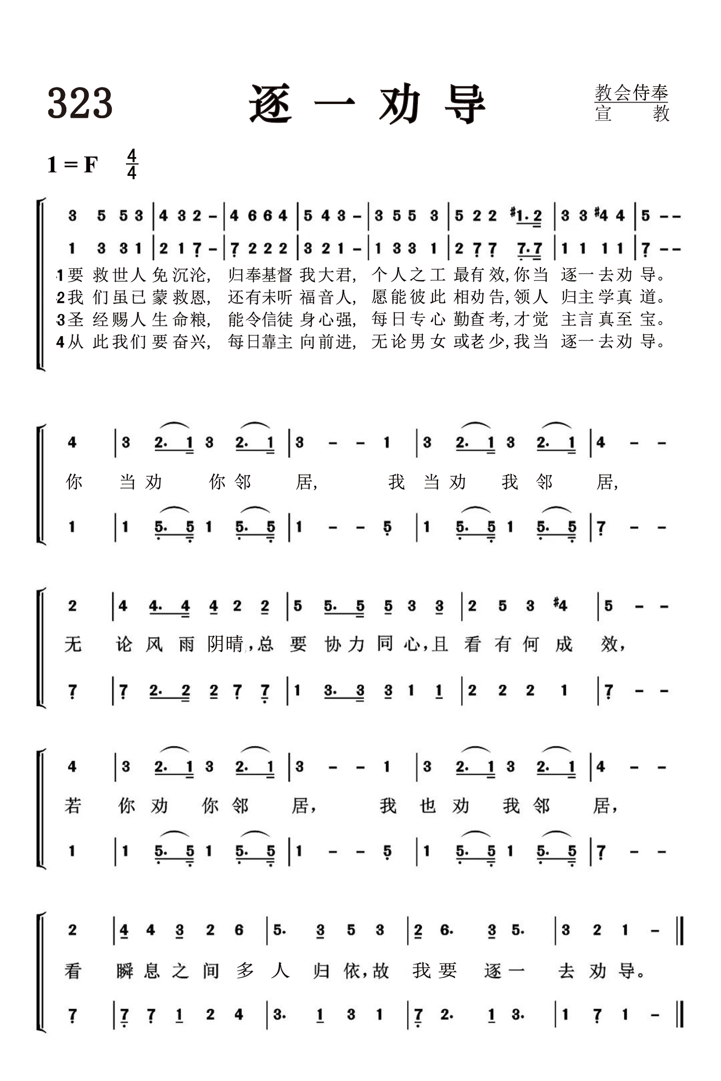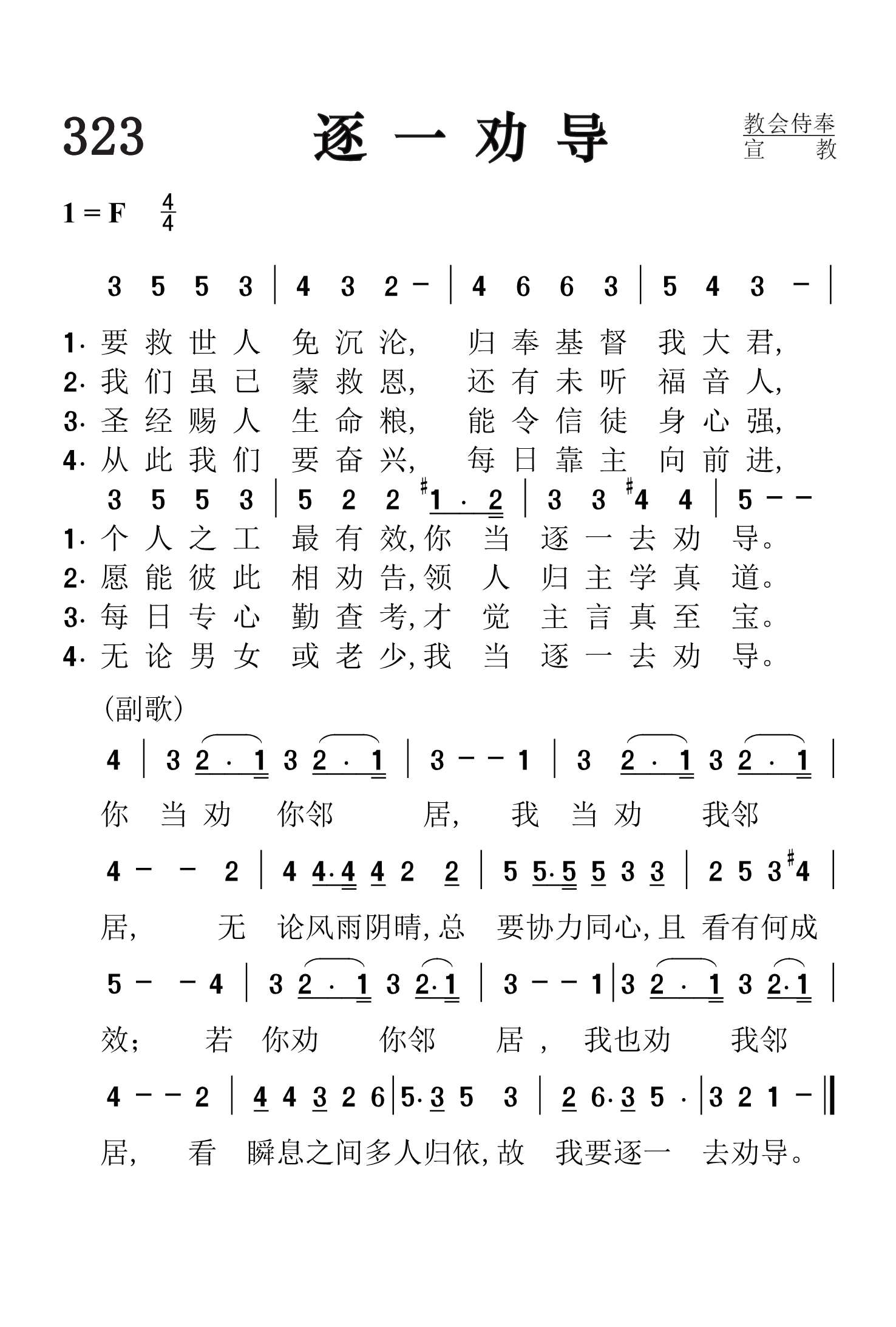 第323首 逐一劝导Win Them One by One 迈尔斯(C.A.Miles,1868,1,7-1946)作词作曲 要救世人免沉沦,归奉基督我大君, 个人之工最有效,你当逐一去劝导。 我们虽已蒙救恩,还有未听福音人, 愿能彼此相劝告,领人归主学真道。 圣书赐人生命粮,能令信徒身心强, 每日专心勤查考,才觉主言真至宝。 从此我们要奋兴,每日靠主向前进, 无论男女或老少,我当逐一去劝导。 你当劝你邻居,我当劝我邻居, 无论风雨阴晴,总要协力同心, 且看有何成效; 若你劝你邻居,我也劝我邻居, 看瞬息之间多人归依,故我要逐一去劝导 这首诗歌把救灵的严肃责任摆在每一个基督徒面前。他们既已蒙受主莫大的恩典,就理应把这种福气介绍给一切未曾听过福音的人,好使他们也能分享得救的快乐。劝人信主的工作需要耐心和恒心。要不怕困难和挫折,深信主必引导和帮助。 作者迈尔斯出生于美国新泽西州,毕业于宾夕法尼亚州大学制药专业,曾任药剂师多年。1898年他弃医从文,在一家出版公司任编辑和经理。在他44岁那年成功地创作了《在园中》(《颂赞诗歌》第403首)之后,他认识到上帝要他发挥这方面的才能,以诗歌来为主做见证。于是他把圣诗创作和编辑作为自己毕生的事业。他还是著名的布道会圣乐指挥。