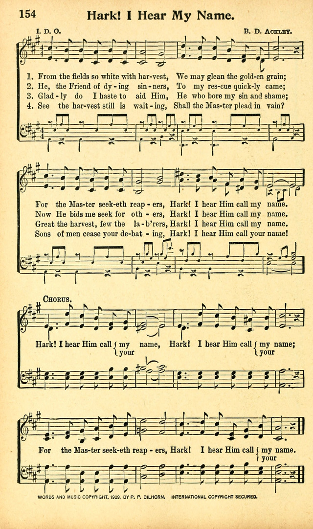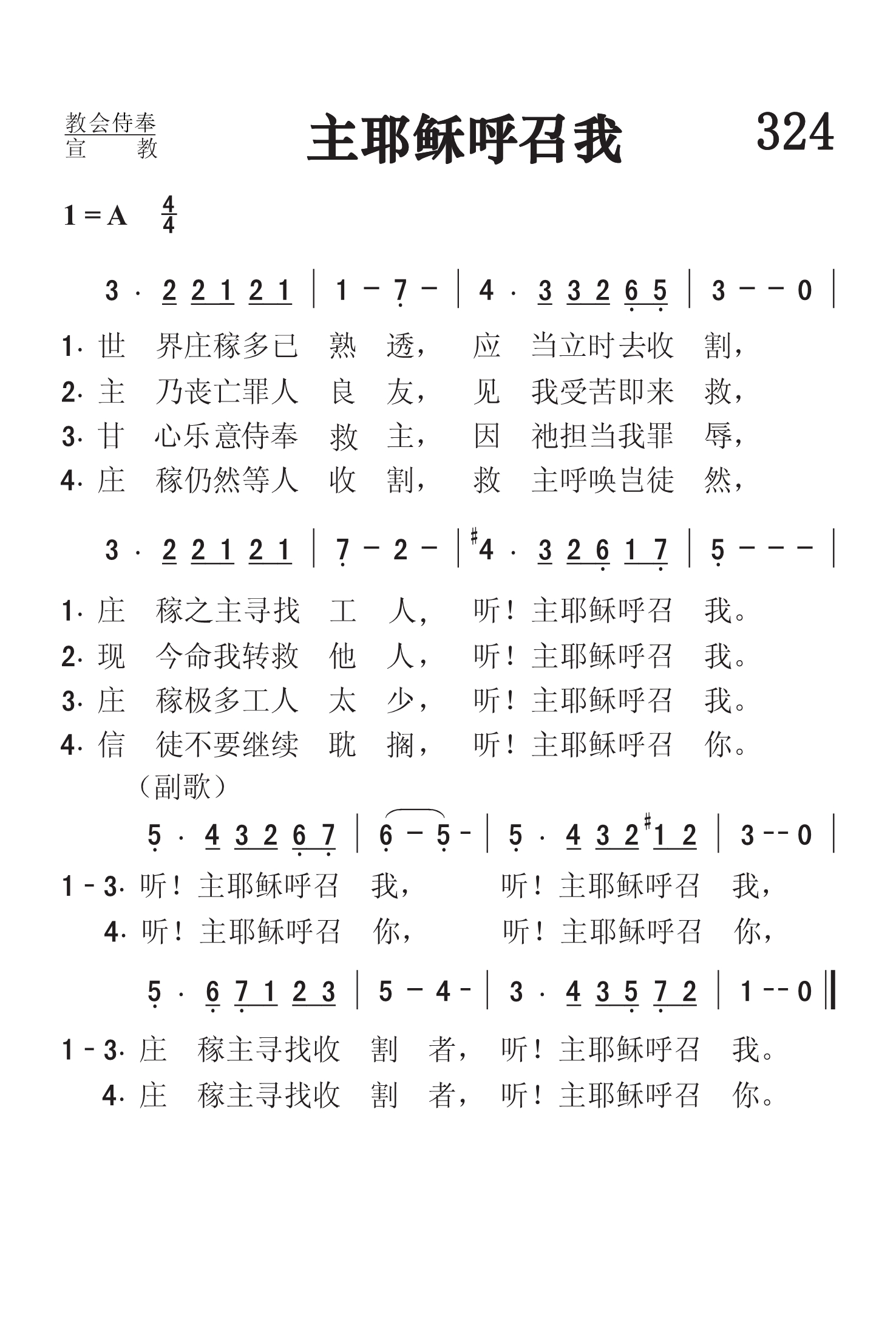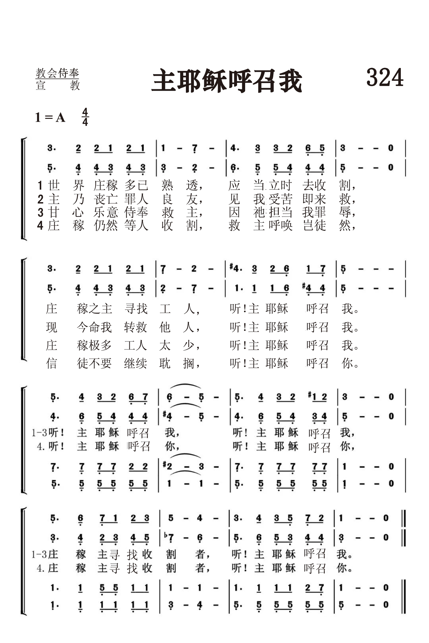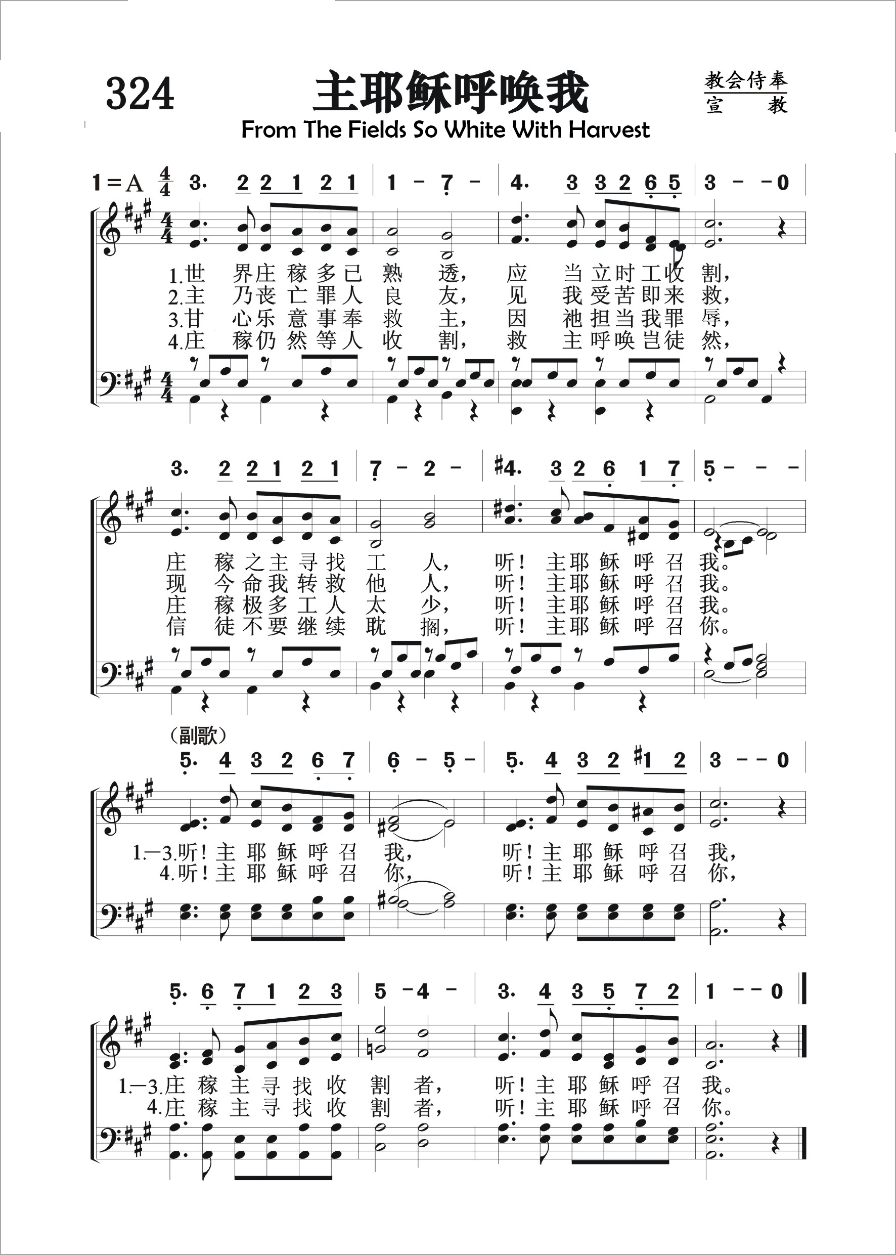 第324首 主耶稣呼召我From the Fields So White With Harvest 奥格登夫人(Ina Duley Ogdon1872,4,3-1964,5,1)作词,A.B.阿克利(Bentley.Deforest.Ackley,1872,9,27-1958,9,3)作曲 世界庄稼多已熟透,应当立时去收割, 庄稼主寻找收割者,听!主耶稣呼召我。 主乃丧亡罪人良友,见我受苦即来救, 现今命我转救他人,听!主耶稣呼召我。 3我甘心乐意事奉主,因祂担当我罪辱, 庄稼极多工人太少,听!主耶稣呼召我。 庄稼仍然等人收割,救主呼唤岂徒然, 信徒不要继续耽搁,听!主耶稣呼召你。 这首诗向我们展示了一幅丰收的景象。经过主耶稣和历代圣徒的辛勤耕耘,福音的种子已经成熟了。收割的日子来到了,可是合格的工人却供不应求。我们这些蒙受了主极大恩典的基督徒,难道不愿意响应主的召唤,进入园地积极从事救灵的工作吗?但愿本诗所发出的诚恳邀请,能打动每一位信徒的心,使他们不再懒惰等待,不再彷徨张望,而是立时行动起来,以帮助同胞为己任。 词作者奥格登夫人出生于美国伊利诺斯州。曾就读于本州格里尔学院。1892-1900年在当地教书。她聪慧好学,善于辞令,经常创作圣诗歌词,与作曲家加布里埃尔长期合作。1896年她与同事詹姆斯. 奥格登结婚。 曲作者本特利.阿克利出生于美国宾夕法尼亚州,是阿尔福雷德. 阿克利(见64首介绍)的哥哥。他很早就显示出音乐的天赋,从小就学会了手风琴,钢琴,单簧管和短笛等乐器。1888年他迁居纽约市以后,为好几个教堂弹奏风琴。1907年,他加入一音乐布道团体,任秘书兼钢琴手,到处奔波达8年之久。他曾创作了福音曲谱达3000多首。