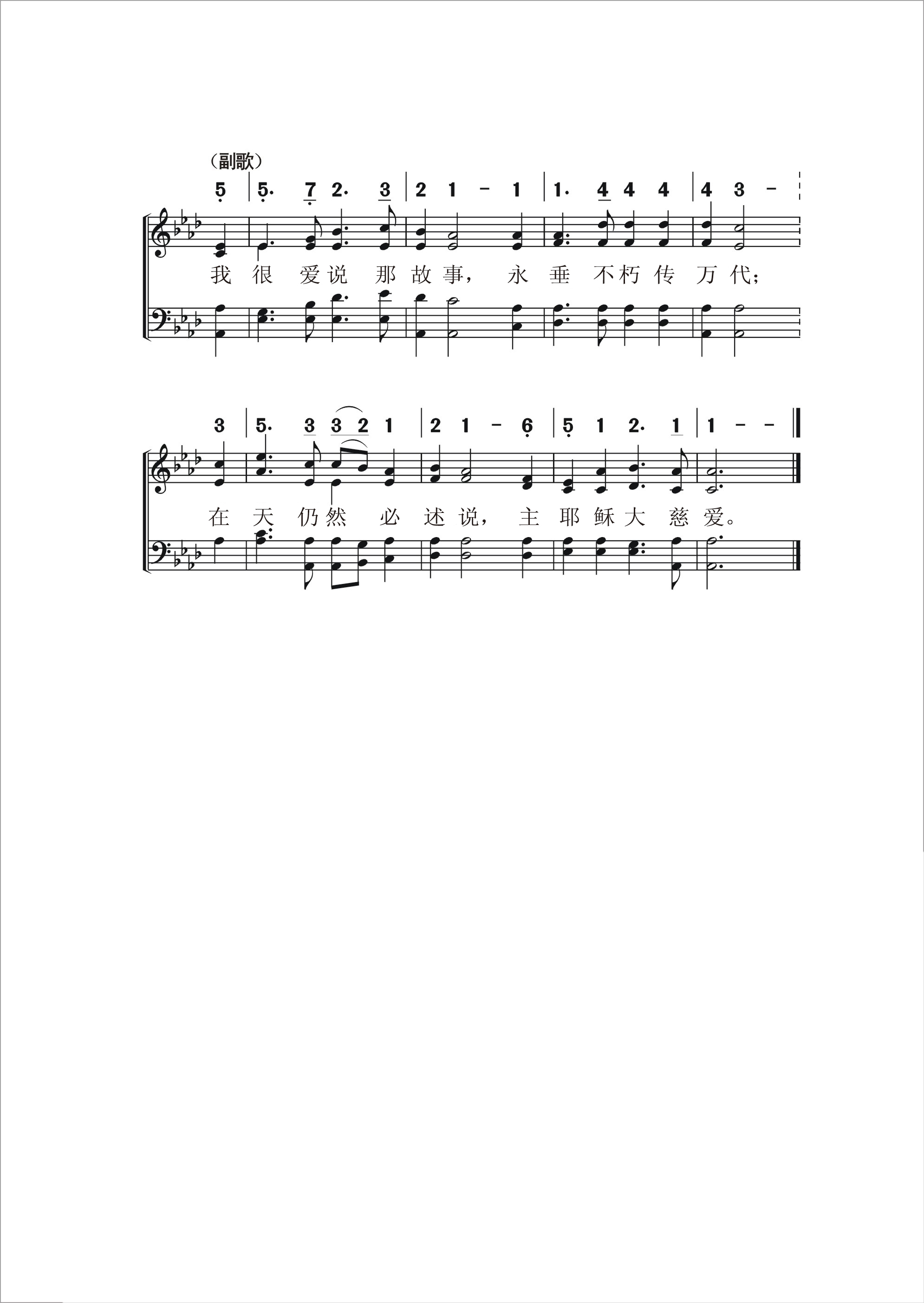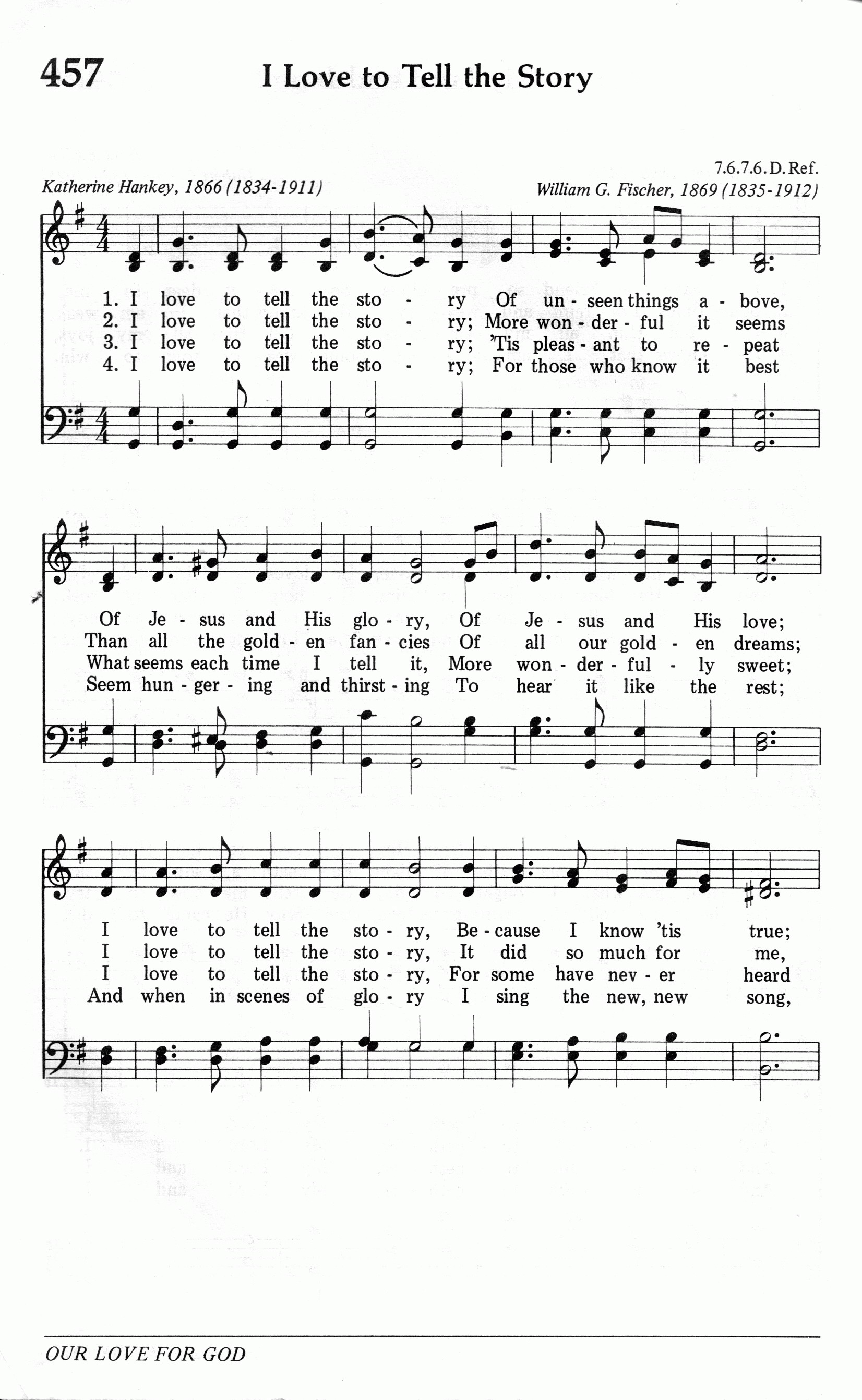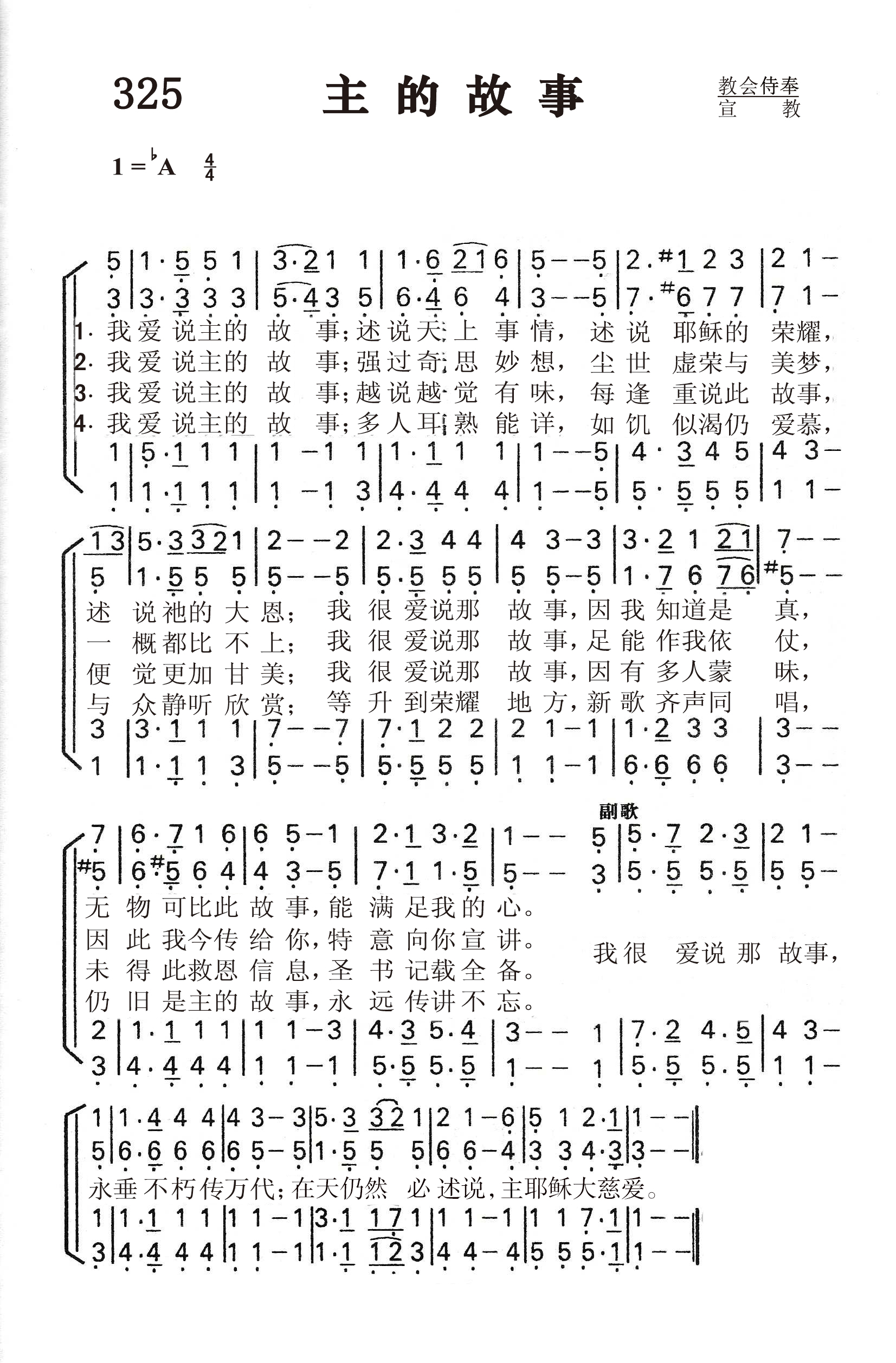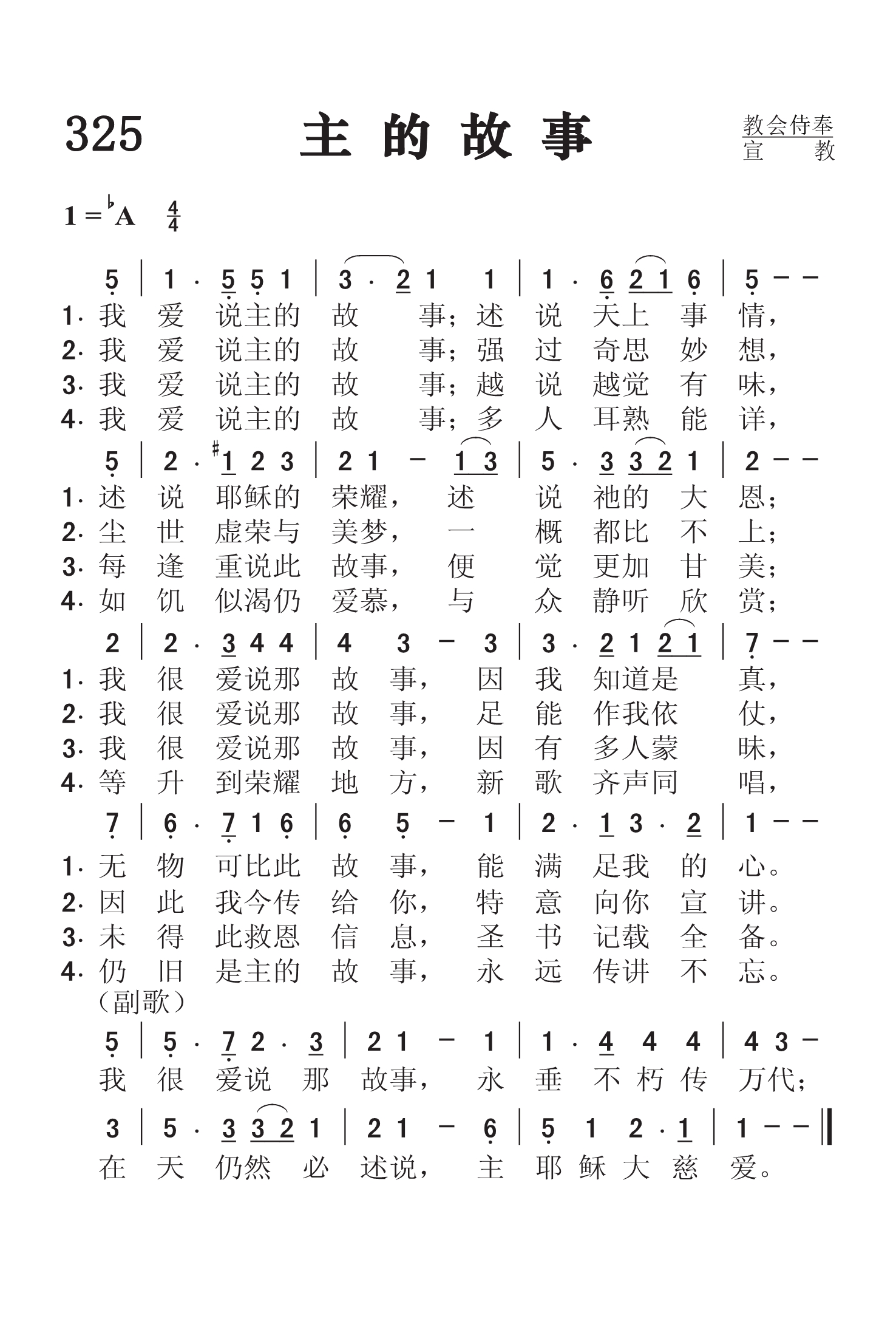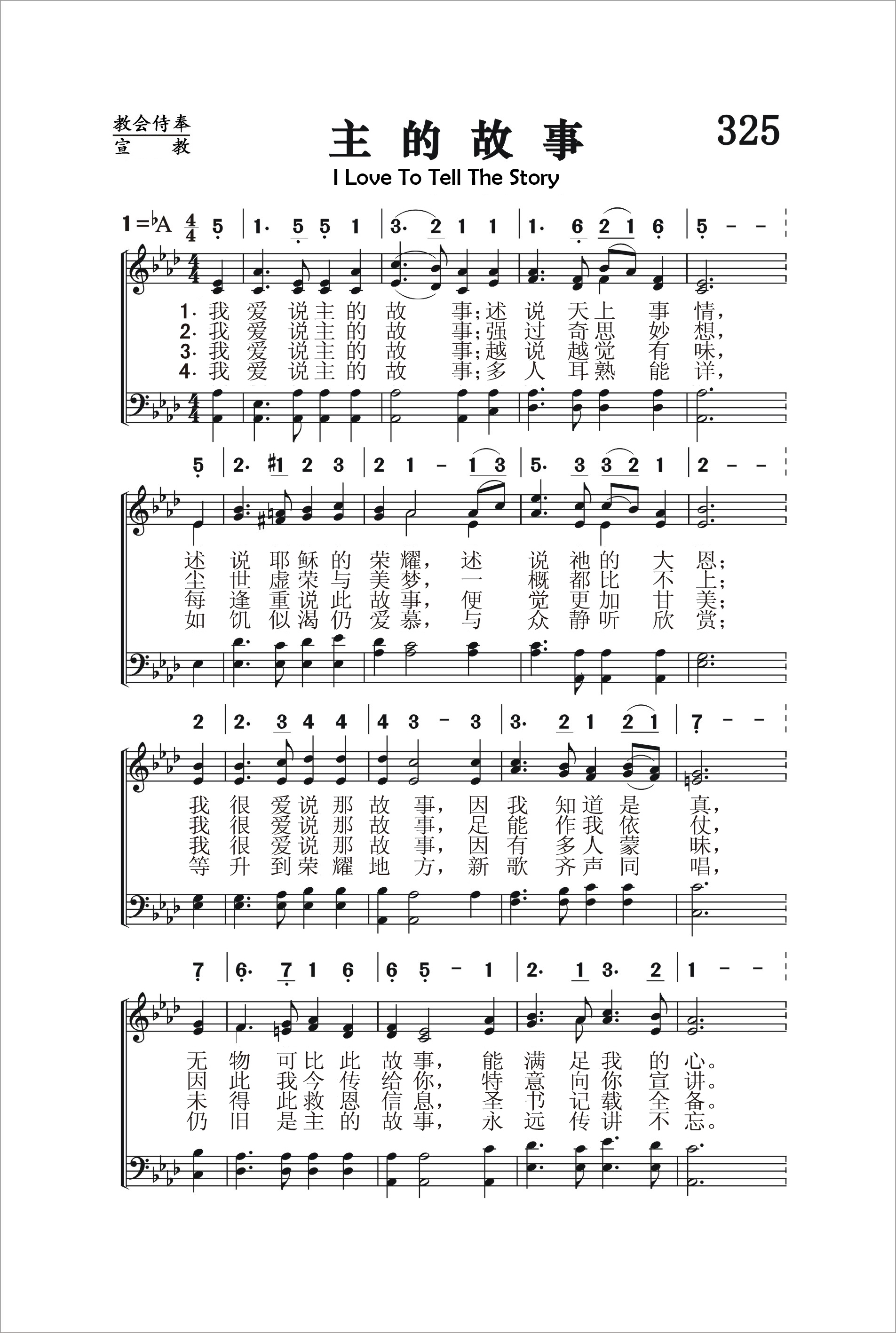 第325首 主的故事I Love to Tell the Story 汉基(K.Hankey,1834-1911,5,9) 作词(1866年) 费希尔(W.G.Fischer, 1835,10,14-1912,8,12)作曲(1869年) 我爱说主的故事,述说天上事情, 述说耶稣的荣耀,述说祂的大恩; 我很爱说那故事,因我知道是真, 无物可比此故事,能满足我的心。 我爱说主的故事,强过奇思妙想, 尘世虚荣与美梦,一概都比不上, 我很爱说那故事,足能作我依仗, 因此我今传给你,特意向你宣讲。 我爱说主的故事,越说越觉有味, 每逢重说此故事,便觉更加甘美; 我很爱说那故事,因有多人蒙昧, 未得此救恩信息,圣书记载全备。 我爱说主的故事,多人耳熟能详, 如饥似渴仍爱慕,与众静听欣赏; 等升到荣耀地方,新歌齐声同唱, 仍旧是主的故事,永远传讲不忘。 我很爱说那故事,永垂不朽传万代; 在天仍然必述说,主耶稣大慈爱。 词作者汉基是英国一位银行职员的女儿。她在中学读书时,就对儿童工作非常热心,义务担任主日学教员。她长大后,专门为商店的服务员们组织查经班。她曾一度到非洲去看护瘫痪的弟弟,从切身的经历中,深深感到人类需要互相帮助,并要把主的道理广传出去。她生平喜欢写作,著有好几本宣传福音的诗文集。《主的故事》是她从一首叙述耶稣生平的长诗中摘选出来的,是最流行的福音圣诗之一,深受儿童,青年和老年人的喜爱。她的另一首著名的赞美诗《请讲悠久的故事》收在《颂赞诗歌》第451首。 曲作者费希尔是美国业余圣诗作曲家。他出生于美国马里兰州,原籍德过,从青年时代起就对音乐感兴趣,曾在美国费城说德语的一座教堂里学唱诗;一度从事装订图书工作,并继续在夜校学音乐。他钢琴弹的很好,也指挥合唱团,并任钢琴商店的推销员。许多堂会请他教唱诗和指挥唱诗班。他一生谱写了约200首福音圣诗曲调。 《颂赞诗歌》 265首《比雪还白》和452首《依傍十架》也是费希尔作曲的。