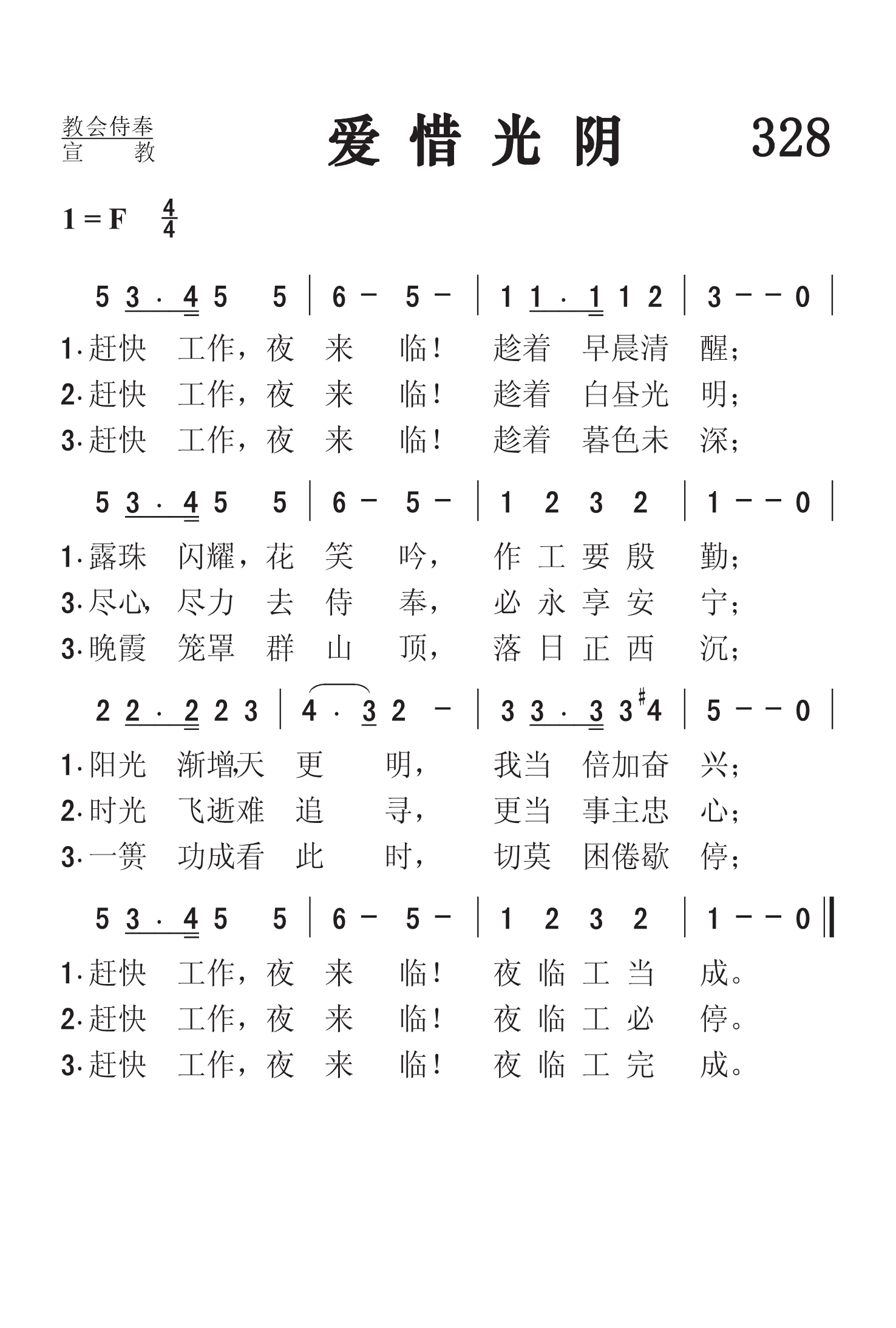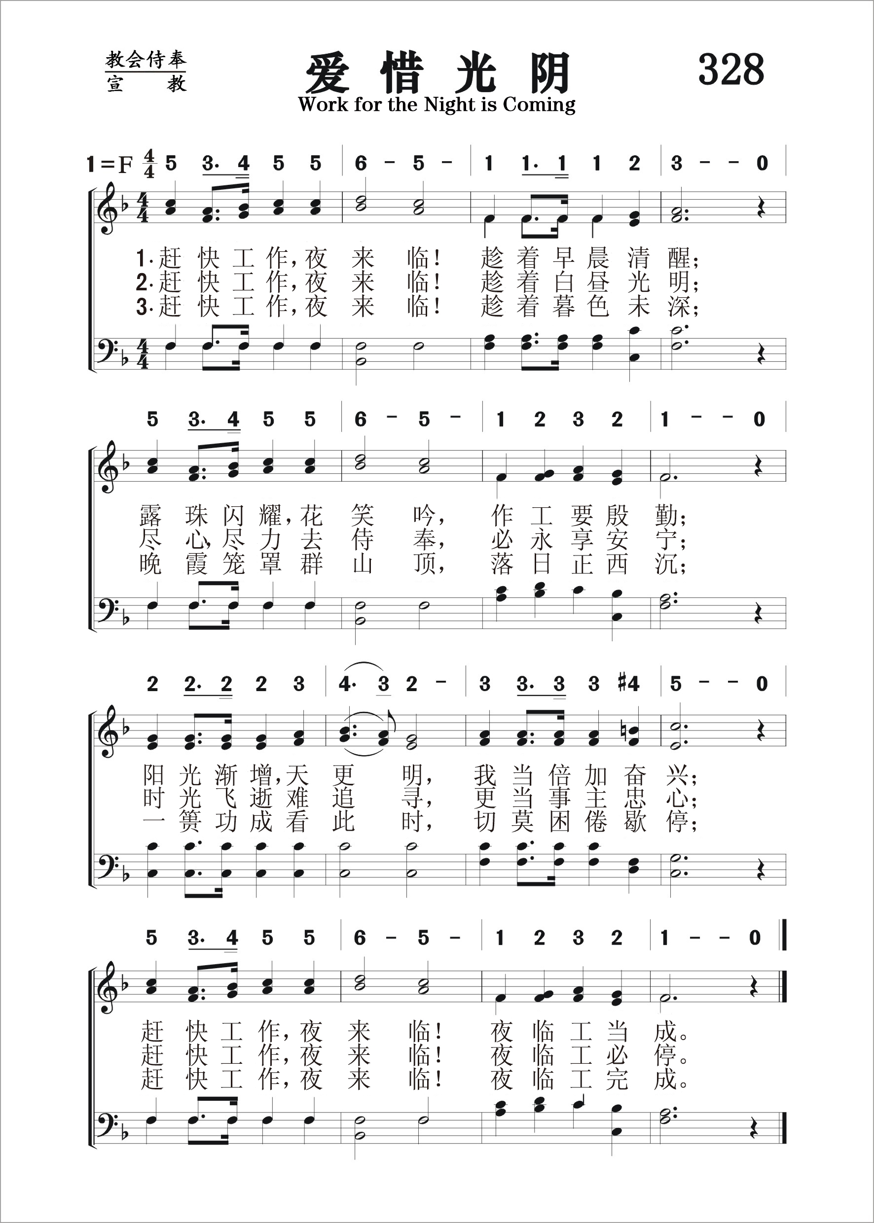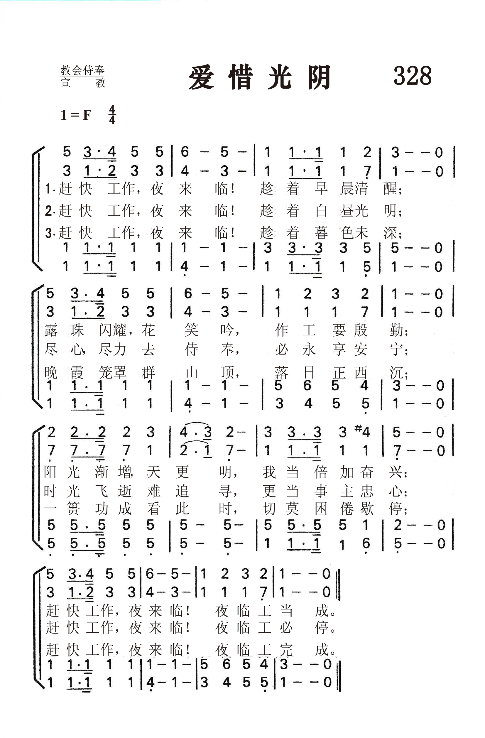 第328首 爱惜光阴Work for the Night is Coming 科格希尔(A.L.Coghill;1836-1904)作词, 梅森(Lowell Mason,1792,7,8-1872,8,11)作曲 赶快工作,夜来临!趁着早晨清醒; 露珠闪耀,花笑吟,作工要殷勤; 阳光渐增,天更明,我当倍加奋兴; 赶快工作,夜来临!夜临工当成。 赶快工作,夜来临!趁着白昼光明; 尽心尽力去侍奉,必永享安宁; 时光飞逝难追寻,更当事主忠心; 赶快工作,夜来临!夜临工必停。 赶快工作,夜来临!趁着暮色未深; 晚霞笼罩群山顶,落日正西沉; 一篑功成看此时,切莫困倦歇停; 赶快工作,夜来临!夜临工完成。 科格希尔夫人是一位英国的女诗人。加拿大人也说她是他们的诗人,因为她是在加拿大写下这首著名的诗歌《爱惜光阴》的。她出生于英国,父亲是位工程师,曾参与修筑加拿大的铁路干线。他们全家于1857年迁往加拿大定居。她自幼就喜欢写诗,爱好文学,常有作品投寄报章杂志。 这首诗劝勉人们趁着早晨,白昼和暮色未深之时赶快工作。创作时她年仅18岁,实在令人惊讶。本诗的经文依据是耶稣所说的话:“趁着白日,我们必须作那差我来者的工;黑夜将到,就没有人能作工了。”(约9:4)。这首诗歌在报纸上发表以后,被桑基选入《圣诗与独唱》一书,由梅森配曲。后被许多赞美诗集争相选用。 科格希尔夫人还先后出版了《森林地带的掠夺》和《橡树与枫叶》两书。她的文艺作品包括六部小说,一本诗集,诗题的范围甚是广泛,证明她的博学。 曲作者梅森出生于美国马萨诸塞州的梅德菲尔德。幼年在校时就喜欢音乐,16岁时已成了乡村教堂唱诗的指挥。1812年迁居乔治亚州,在一家银行当办事员,同时在长老会礼拜堂任管风琴师及唱诗班指挥,并开始学习和声学和作曲。他自编了一本《圣乐曲调集》,送到好几家印刷长和出版社去,虽然讲明不要稿费,也没有一家肯承印。后经波士顿亨德尔.海顿音乐社出资代印,结果销路之广,出人意料,大大鼓舞了梅森,使他决定以音乐为他的终生事业。1827年他迁居波士顿,当选为亨德尔及海顿学会主席,并任教堂唱诗班指挥十四年。1829年编辑出版了第一本《儿童赞美诗》。他为了培养训练儿童唱诗,创办成立波士顿音乐学院,专门训练儿童唱歌。1834年又在音乐学院内成立了培训儿童音乐的教师培训班。他还负责出版音乐杂志,编辑出版了80多种诗歌集,创作诗歌曲谱1126首,改编496首,对提高美国的音乐水平,改善教会圣乐方作出突出贡献,为19世纪美国音乐界最有影响的人物。1835年纽约大学授予他第一位音乐博士学位,以表钦仰。