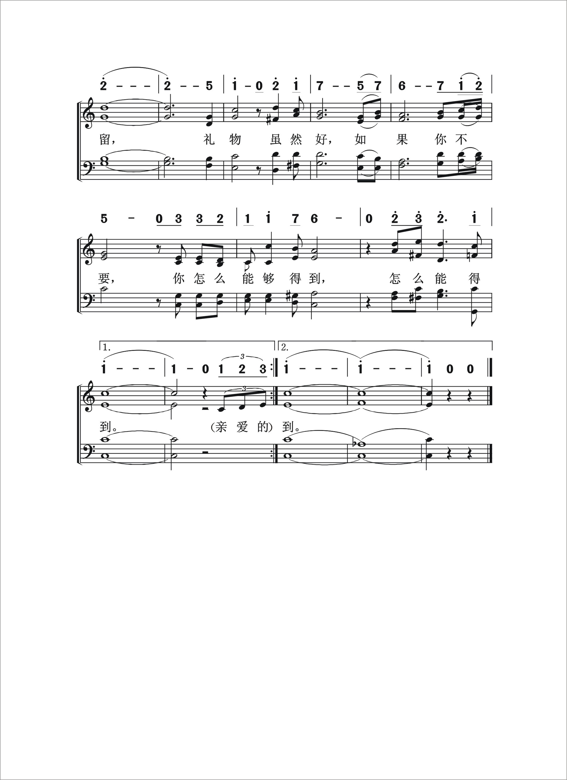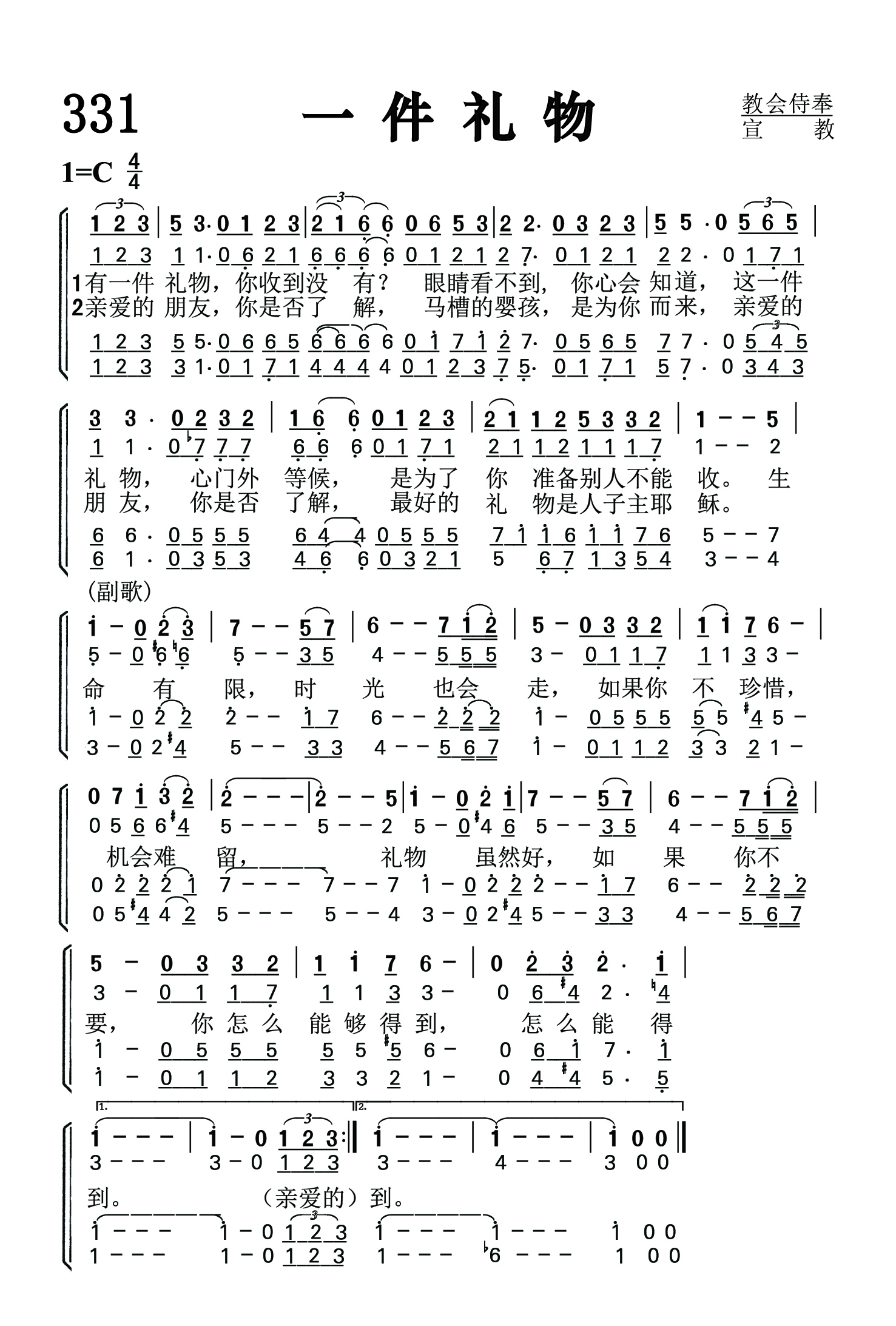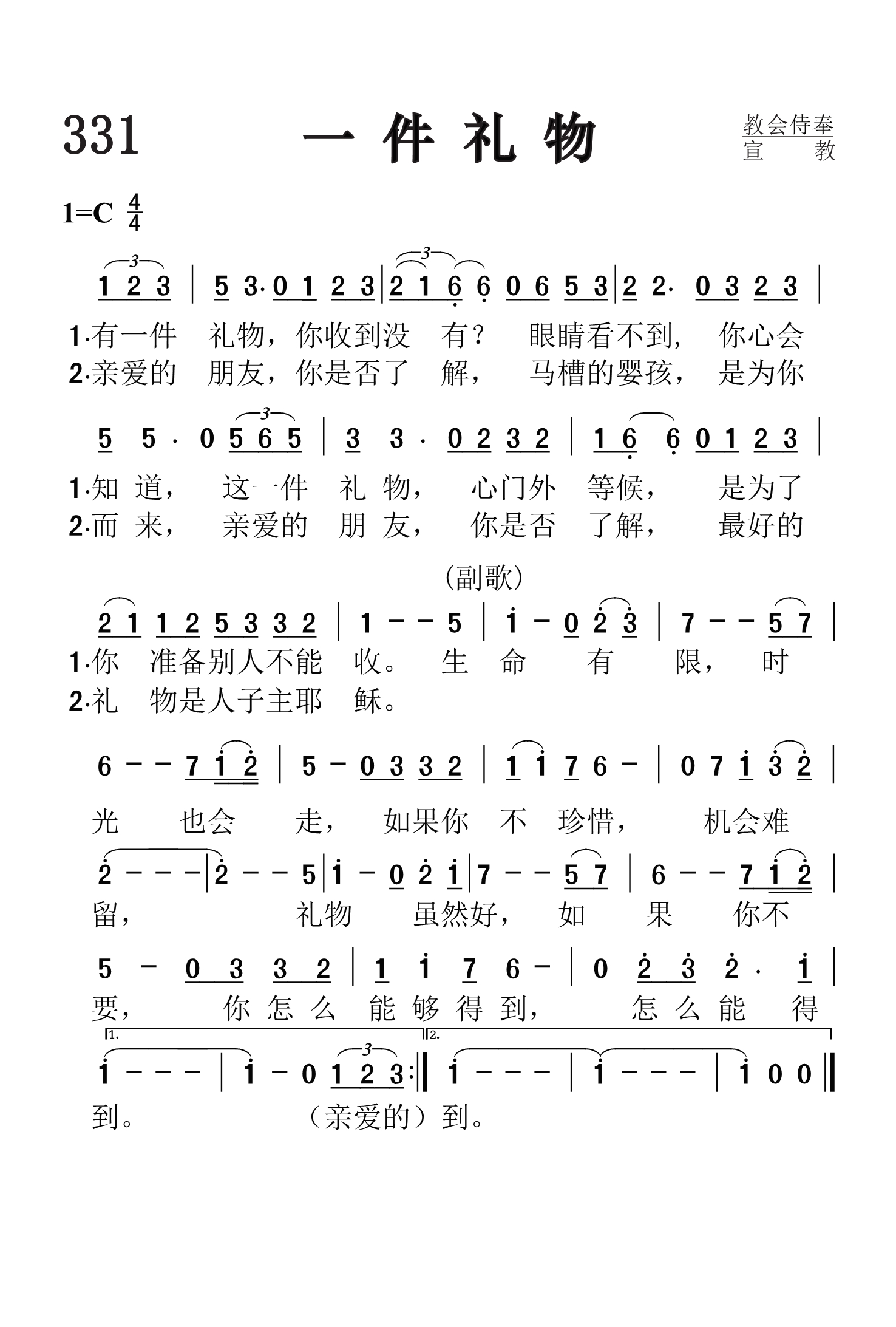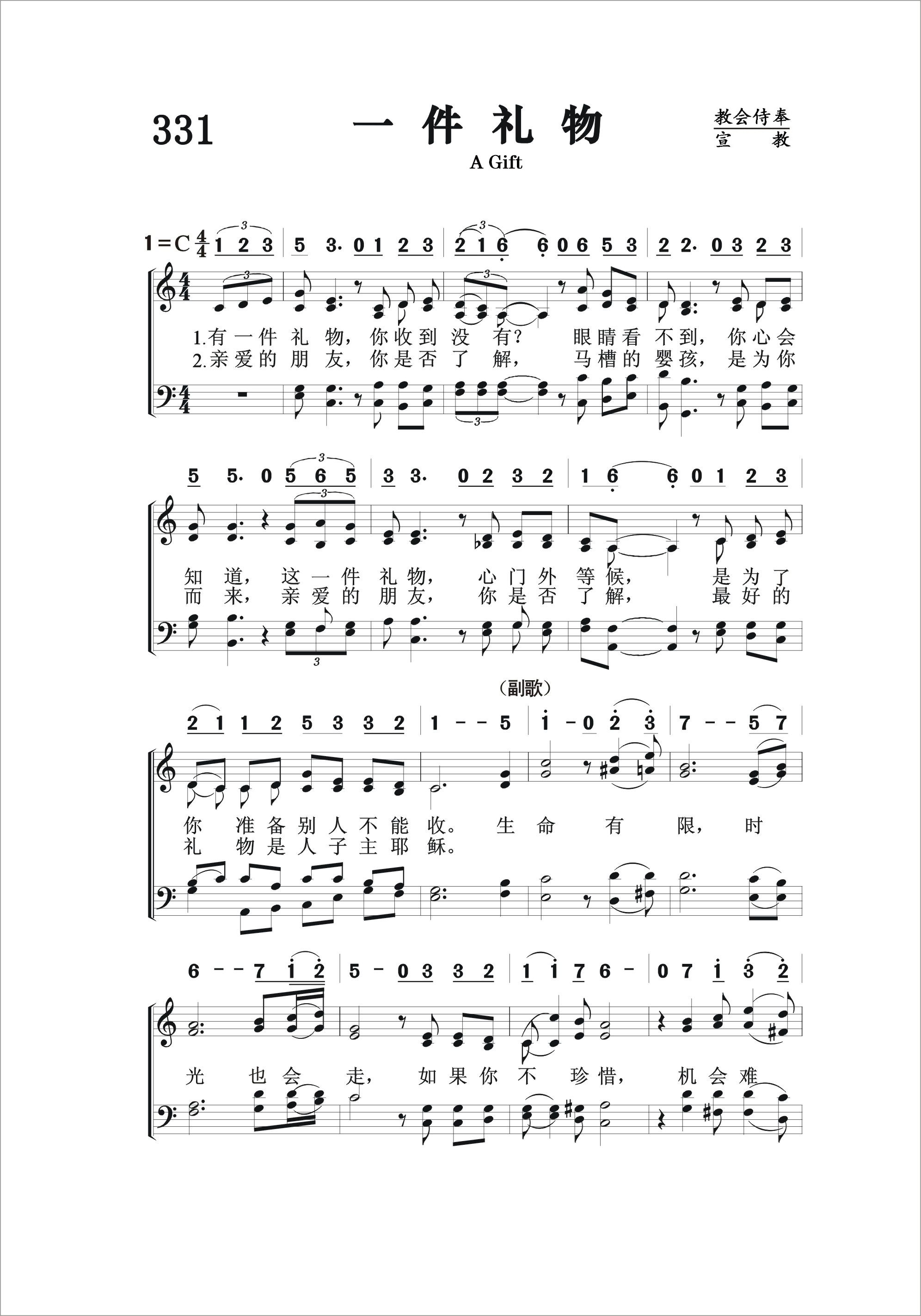 第331首 一件礼物A Gift 叶薇心 作词吴文栋作曲 有一件礼物,你收到没有 眼睛看不到,你心会知道, 这一件礼物,心门外等候, 是为了你准备别人不能收。 亲爱的朋友,你是否了解, 马槽的婴孩,是为你而来, 亲爱的朋友,你是否了解, 最好的礼物是人子主耶稣。 生命有限,时光也会走, 如果你不珍惜,机会难留, 礼物虽然好,如果你不要, 你怎么能够得到,怎么能得到。 天韵合唱团是台湾知名的合唱团体,专业优美的和声却又不失亲切感的演出,贴近人心的旋律与歌词,使他们成为许多大小朋友都喜欢的团体。叶薇心,天韵的资深作词人,写过《野地的花》、《眼光》等多首非常好听的诗歌,在她的笔下,平淡的故事成为动人的歌词,也让她荣获金曲奖的肯定。为叶薇心开启创作之路的,正是她的第一份工作,也是到目前唯一待过的职场─救世传播协会,她更是在天韵合唱团待了27年;从初出社会的小女孩,到现在是公司里的资深员工,叶薇心回首这一路上酸甜苦辣,以及与救世传播协会创办人、天韵合唱团的推手彭蒙惠的师徒之情,更是充满许多欢笑与泪水。 2001年她选择挥别亮丽的舞台走向幕后,却也开始了她新的任务,如今成为一个协助别人的支援者,她也乐此不疲,继续用她的创作去影响他人,温暖世界。