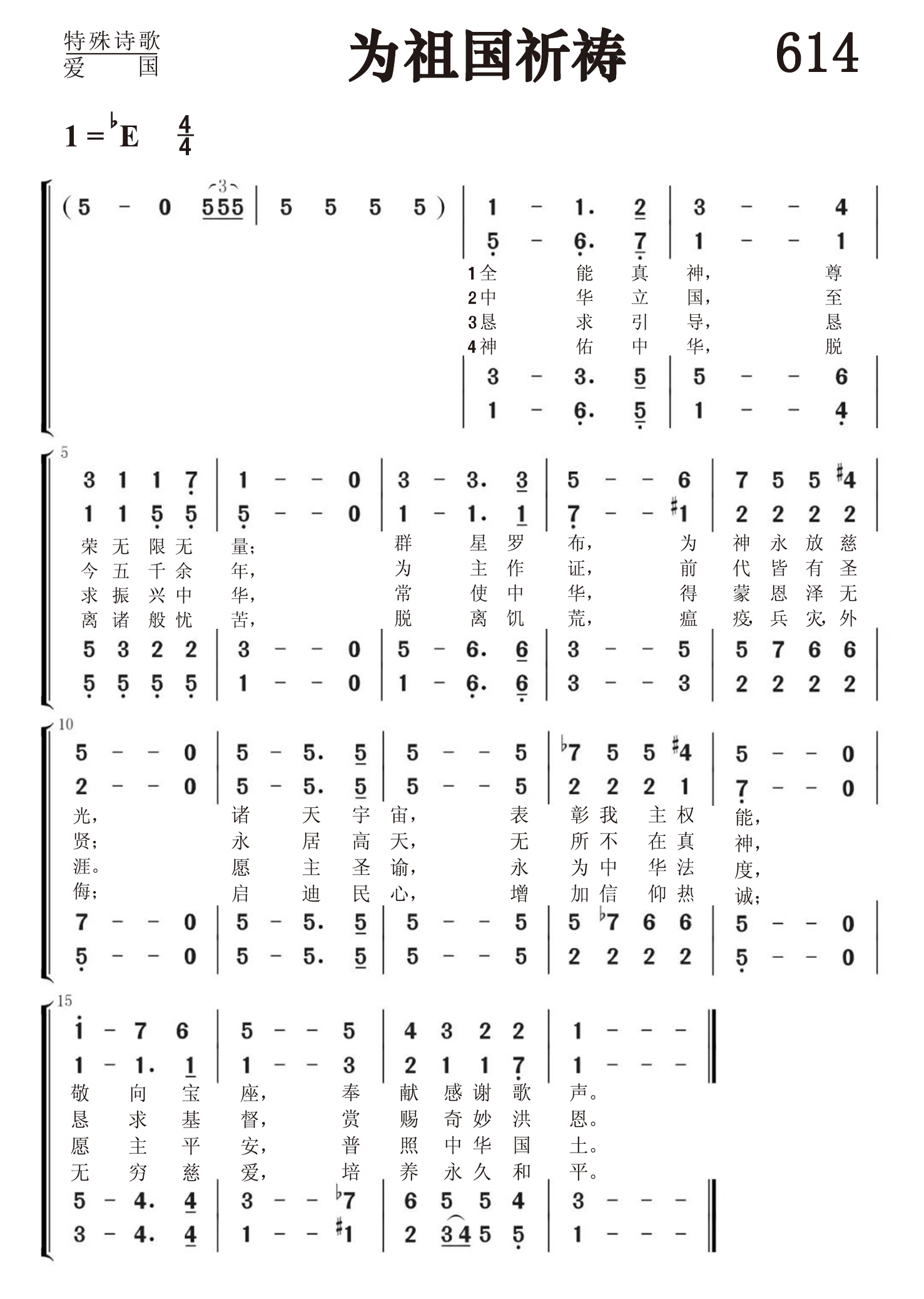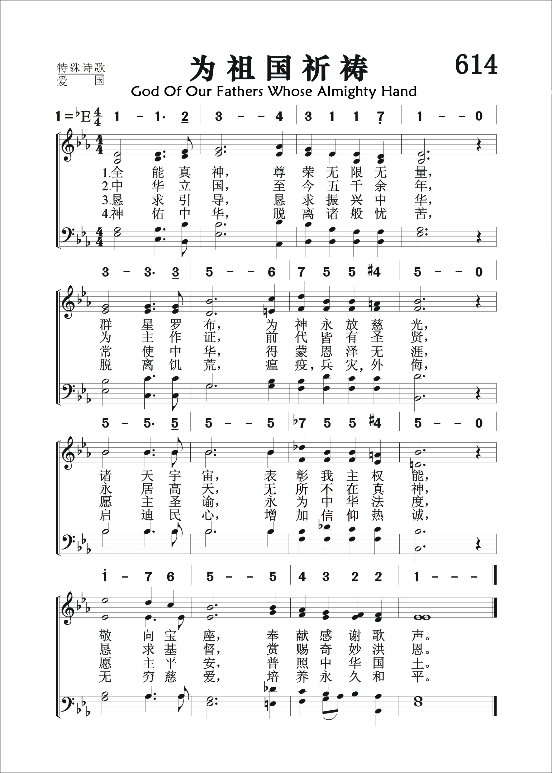 第614首 为祖国祈祷God of Our Fathers Whose Almighty Hand 根据罗伯茨(Daniel C.Roberts,1841,11,5-1907,10,31)原词(1876年)改编,沃伦(George W.Warren,1828,8,17-1902,3,17)作曲(1892年) 全能真神,尊荣无限无量; 群星罗布,为神永放慈光, 诸天宇宙,表彰我主权能, 敬向宝座,奉献感谢歌声。 中华立国,至今五千余年, 为主作证,前代皆有圣贤; 永居高天,无所不在真神, 恳求基督,赏赐奇妙洪恩。 恳求引导,恳求振兴中华, 常使中华,得蒙恩泽无涯。 愿主圣谕,永为中华法度, 愿主平安,惠临中华国土。 神佑中华,脱离诸般忧苦, 脱离饥荒,瘟疫, 兵 灾, 外侮; 启迪民心,增加信仰热诚; 无穷慈爱,培养永久和平。 这首诗歌是罗伯茨应邀为1876年7月4日纪念美国独立宣言发表100周年的大会而写的。 词作者罗伯茨出生于美国纽约长岛。1857年毕业于俄亥俄州凯尼恩学院。内战期间从军。1865年接受圣公会的按立担任圣工,终生从事教牧工作。他还兼任新罕布什尔历史学会会长。诺威其大学授予他神学博士学位。 曲作者沃伦出生于美国纽约奥尔巴尼,毕业于威斯康星州雷辛学院,长期担任教会司琴和唱诗班指挥。因为他在音乐领域的出色贡献,他的母校后来授予他音乐博士学位。
