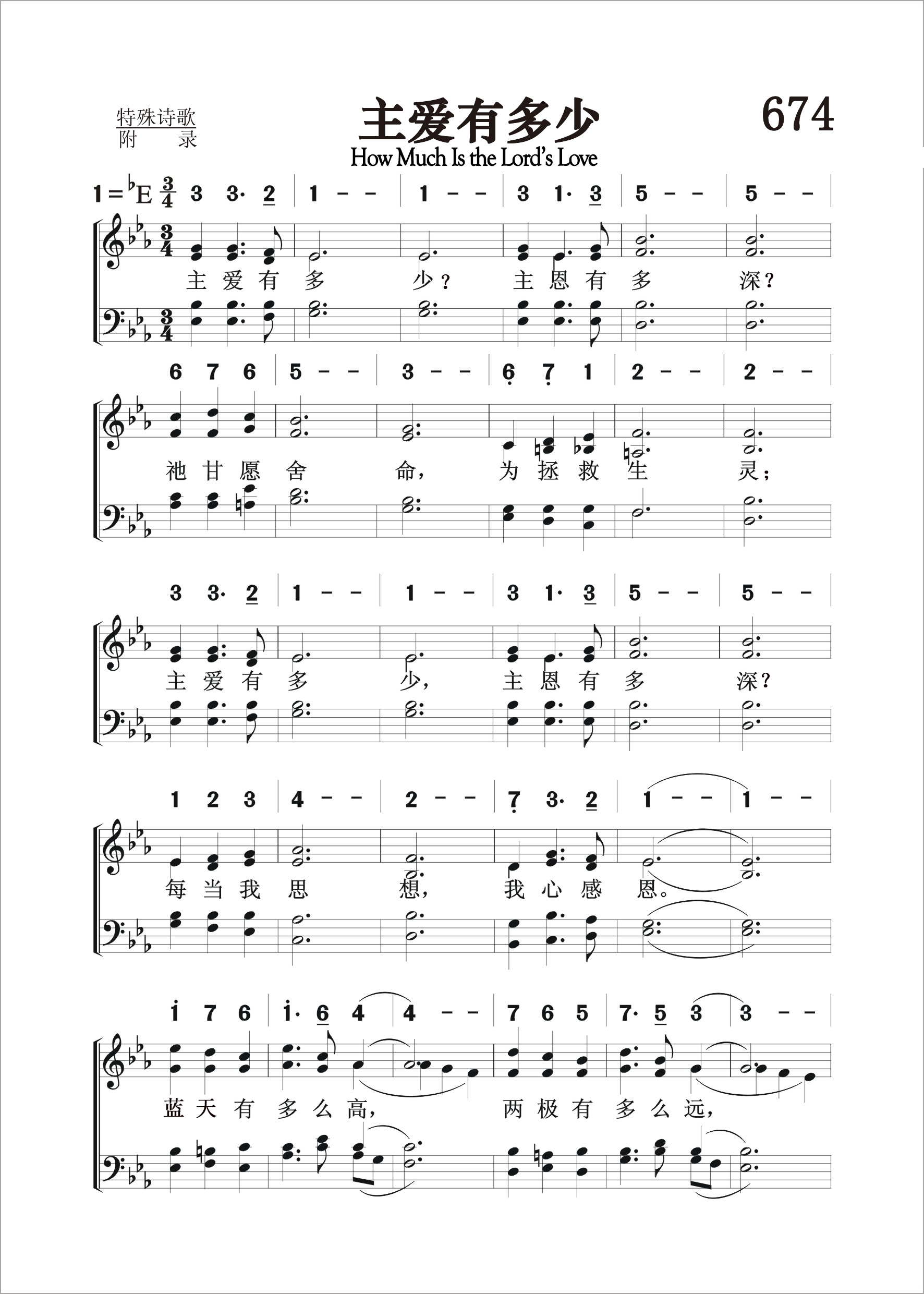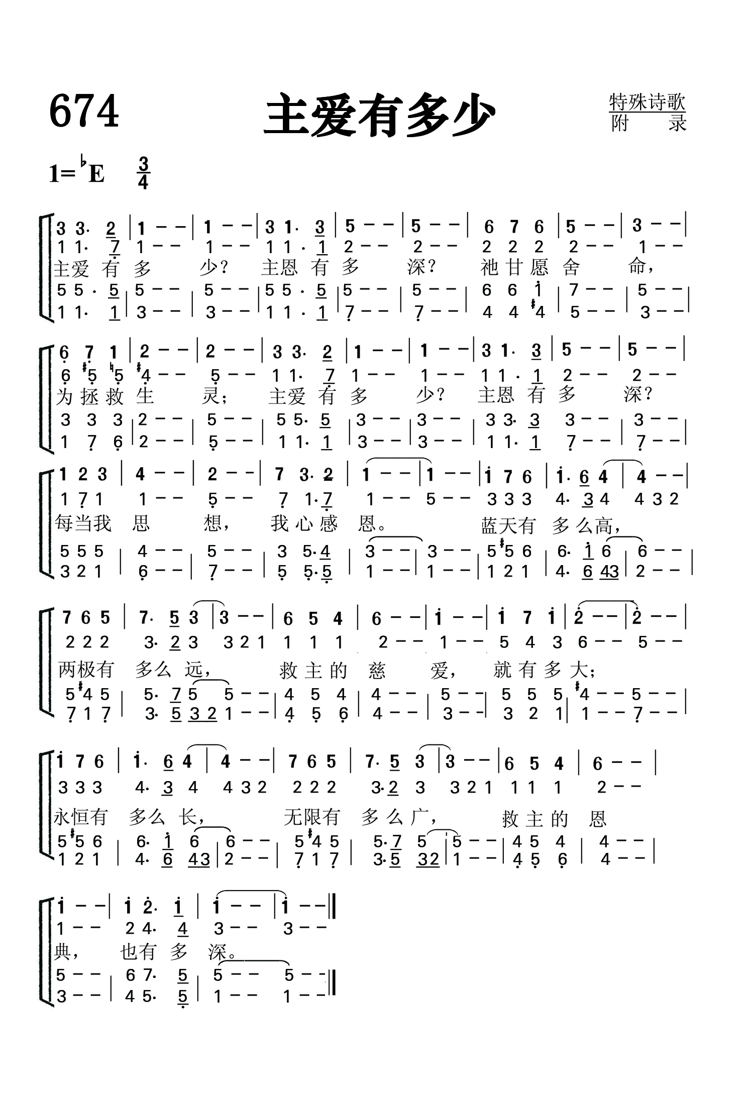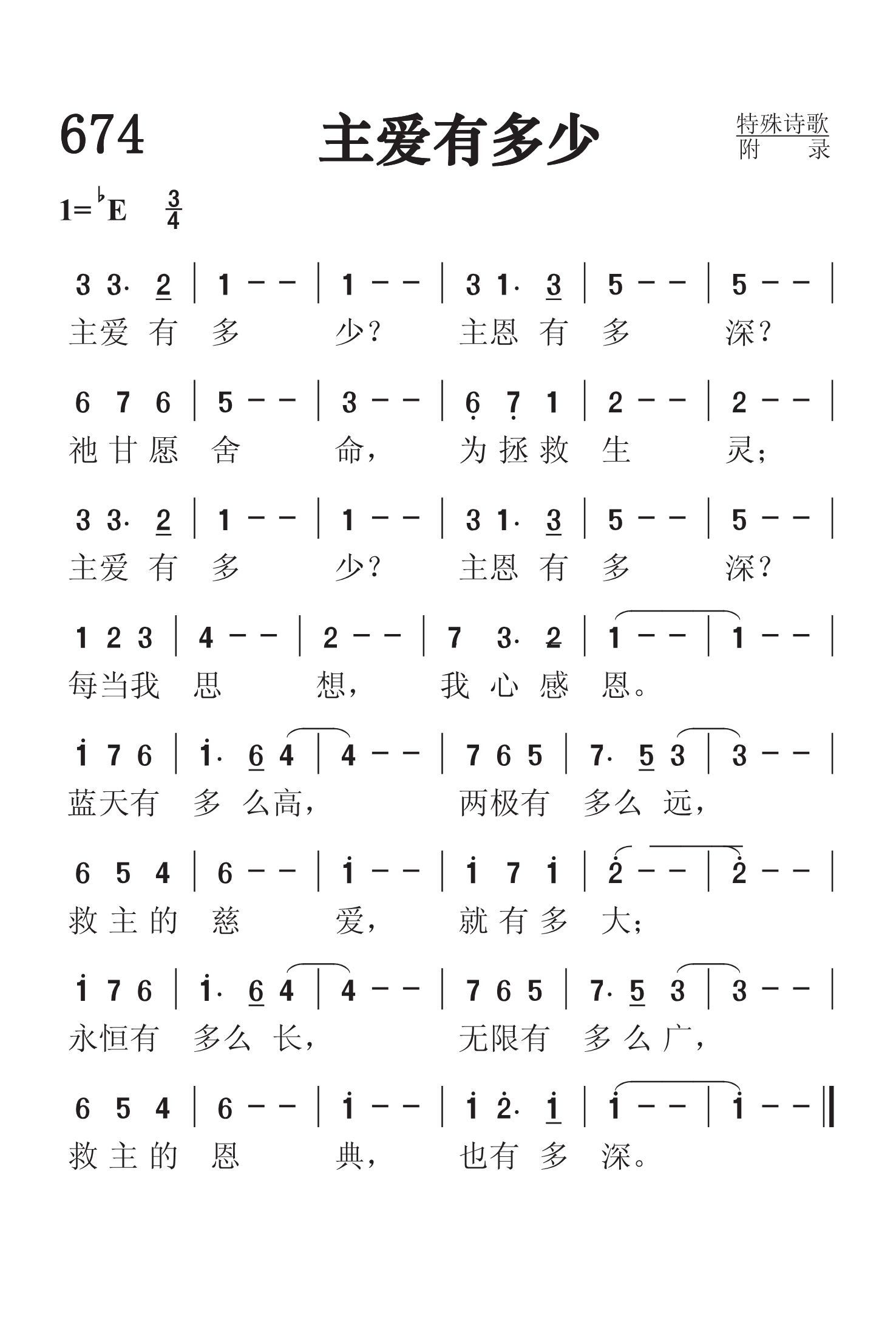 第674首主爱有多少 How Much Is the Lord’s Love 叶薇心 作词徐世贤作曲 主爱有多少,主恩有多深。祂甘愿舍命,为拯救生灵。 主爱有多少,主恩有多深,每当我想,我心感恩。 天地有多么高,两极有多么远,救主的慈爱,就有多大; 永恒有多么长,无限有多么广.救主的恩典,也有多深。 天韵合唱团是台湾知名的合唱团体,专业优美的和声却又不失亲切感的演出,贴近人心的旋律与歌词,使他们成为许多大小朋友都喜欢的团体。叶薇心,天韵的资深作词人,写过《野地的花》、《眼光》等多首非常好听的诗歌,在她的笔下,平淡的故事成为动人的歌词,也让她荣获金曲奖的肯定。为叶薇心开启创作之路的,正是她的第一份工作,也是到目前唯一待过的职场─救世传播协会,她更是在天韵合唱团待了27年;从初出社会的小女孩,到现在是公司里的资深员工,叶薇心回首这一路上酸甜苦辣,以及与救世传播协会创办人、天韵合唱团的推手彭蒙惠的师徒之情,更是充满许多欢笑与泪水。 2001年她选择挥别亮丽的舞台走向幕后,却也开始了她新的任务,如今成为一个协助别人的支援者,她也乐此不疲,继续用她的创作去影响他人,温暖世界。
