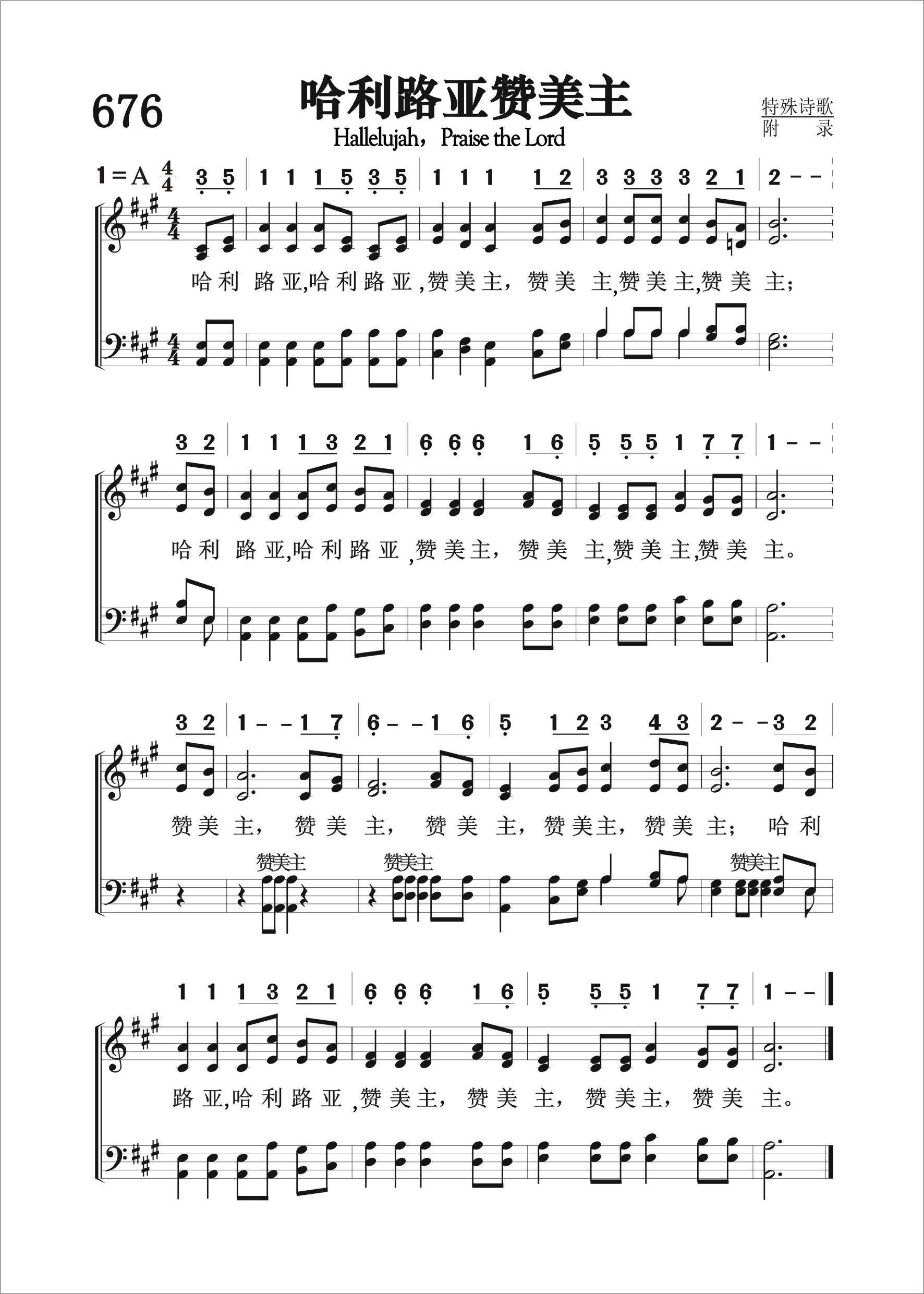 第676首哈利路亚赞美主Hallelujah,Praise the Lord 采用《赞美诗》新编213首《曾否就主歌》的旋律。霍夫曼(Elisha A.Hoffman ,1839,5,7-1929)作曲。 霍夫曼出生于美国宾夕法尼亚州一个福音协会牧师的家庭。他毕业于福音协会联合神学院,音乐方面全靠自修。家里每天早晚二次的礼拜都要唱一二首诗。父母都唱得很好,给他留下深刻的印象。他逐渐感觉到上帝给他一种恩赐,有能力藉着诗歌来表达他的感受和见解。他十八岁就开始写诗,后来竟成多产的福音诗歌作家,总计二千多首,时常兼作词曲,并帮助编印五十种诗歌集,广受欢迎。他在福音派教会担任牧师多年,最后任密西根州一长老会牧师,经常藉着诗歌向成千从未听过的人讲道,使教会兴旺发达。