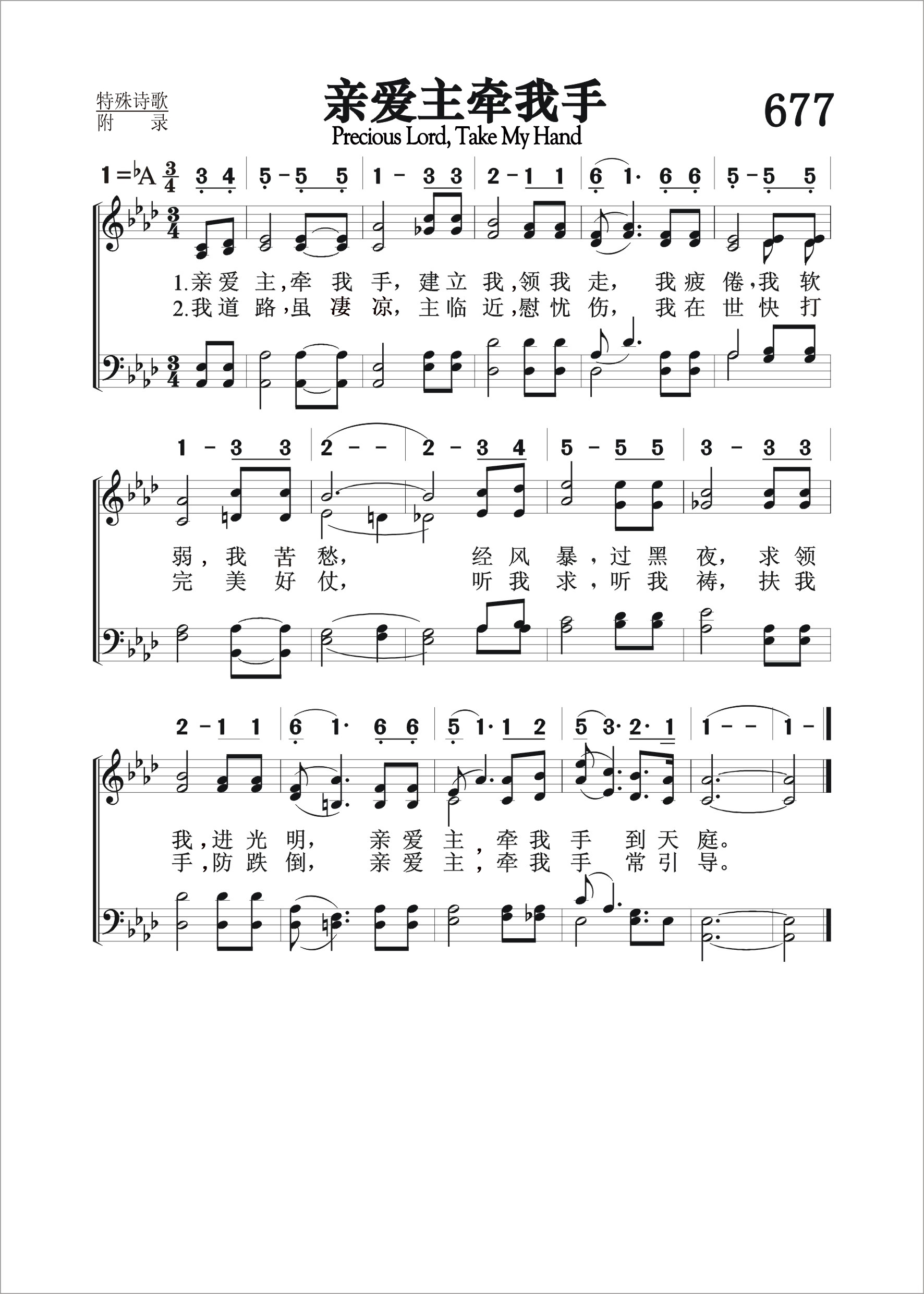 第677首亲爱主牵我手Precious Lord, Take My Hand 多尔西(Thomas A. Dorsey, 1899-1993)作词作曲 亲爱主, 牵我手,建立我, 领我走,我疲倦, 我软弱,我苦愁; 经风暴,过黑夜,求领我,进光明,亲爱主,牵我手到天庭。 我道路, 虽凄凉,主临 近, 慰忧伤,我在世 快打完美好仗; 听我求, 听我祷,扶我手,防跌倒,亲爱主,牵我手常引导。 多少基督徒在心力交瘁下,含泪唱此诗,以泄悲戚,呼求主,牵手扶导前路。 本诗的作者也在这情境下,写了这首曲调柔和撼人心弦的圣诗。 本诗作者多尔西出生在美国佐治亚州。父亲是牧师,母亲是教会的司琴。 他体会到黑人在南方是很少有进展的机会,所以在十多岁时,只身离家去芝加哥音乐界谋生,曾在餐厅弹奏钢琴。 1920年,他进入芝加哥作曲学校。不久他那忧郁色彩的黑人蓝调(Negro Blues)大受欢迎。 1921年秋,他因体弱多病,情绪坠入谷底。他的伯父带他去全国黑人浸信会大会。他深受感动而加入诗班。 他写了些悲吟的福音诗歌,却没有人愿出版。 一年后,多尔西又重操旧业,演奏他的爵士歌曲。 在1920年代中,他已是著名的黑人作曲家,但名利使他远离了 上帝。 1926年他因病萌生自杀的念头,幸获哈利会督及时指破迷津,并助他重拾信心。 可是因他的福音诗歌远不如他的爵士歌曲那么畅销,不久他又走回了娱乐圈。 直到他的版权收入足以养生时,才全时间奉献于圣乐事工。 1931年,他任芝加哥浸信会音乐主任,在各地黑人教会,迅速地推广黑人福音诗歌。1932年,他在密苏里州圣路易市参加一盛大的奋兴会时,收到他父亲电报,传来妻子难产而亡的噩秏。 他即刻回家,抱着初生的儿子感谢上帝,赐给他爱妻遗留的珍宝。 然而数日后婴儿亦夭折了,这双重的打击令他心碎欲绝,数日来他不食不眠,他无法想象失去了家人后,孑然一身,自己如何存活? 他抱怨上帝为何让他深陷痛苦中! 葬礼后,他回到空寂的家,坐在琴旁,随手弹出了这首《亲爱主, 牵我手》。 下一个星期日,他亲自伴奏诗班,在教会中献唱此诗。多尔西是最具影响力的美国黑人福音诗歌作家,共创作了二百五十多首诗歌。