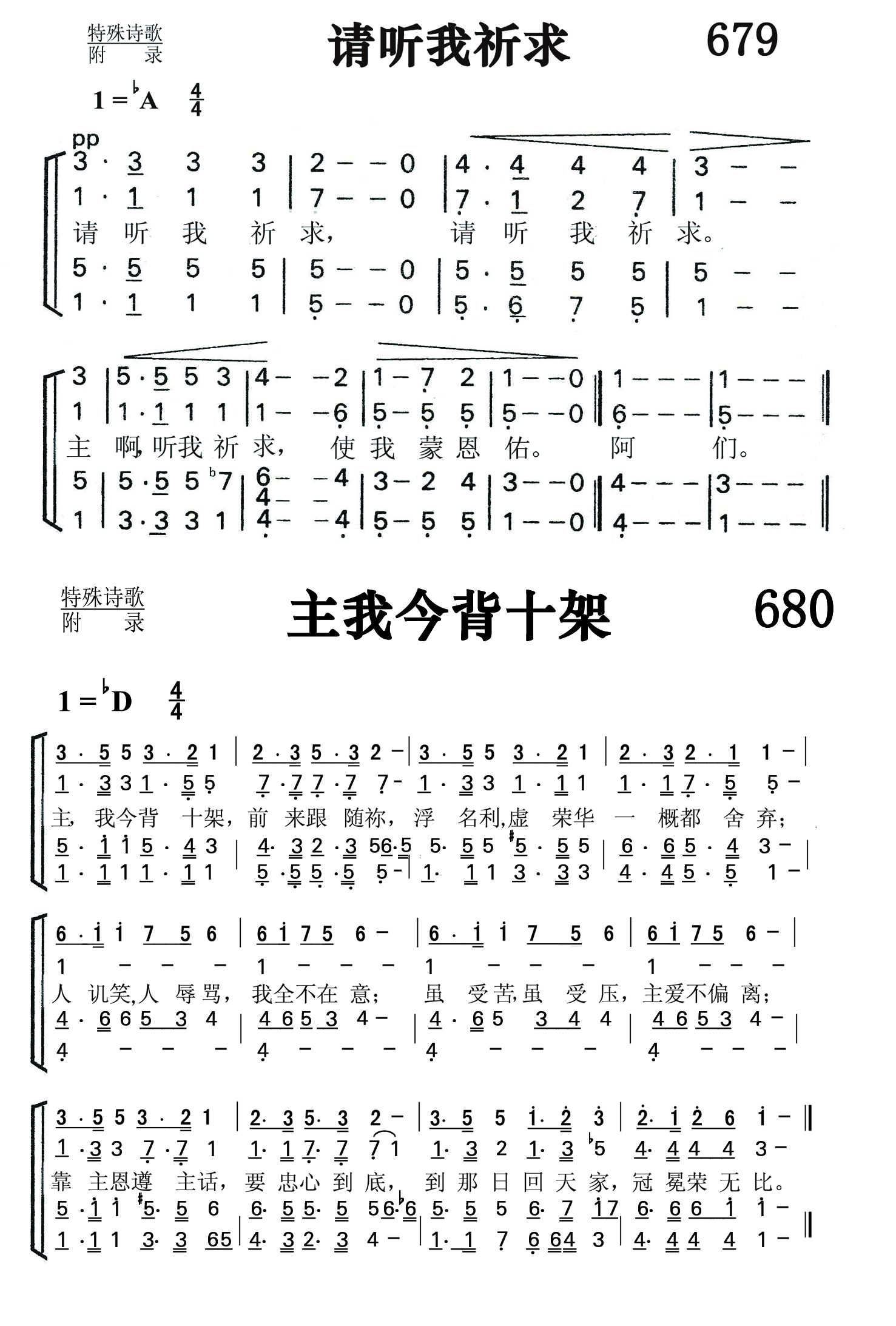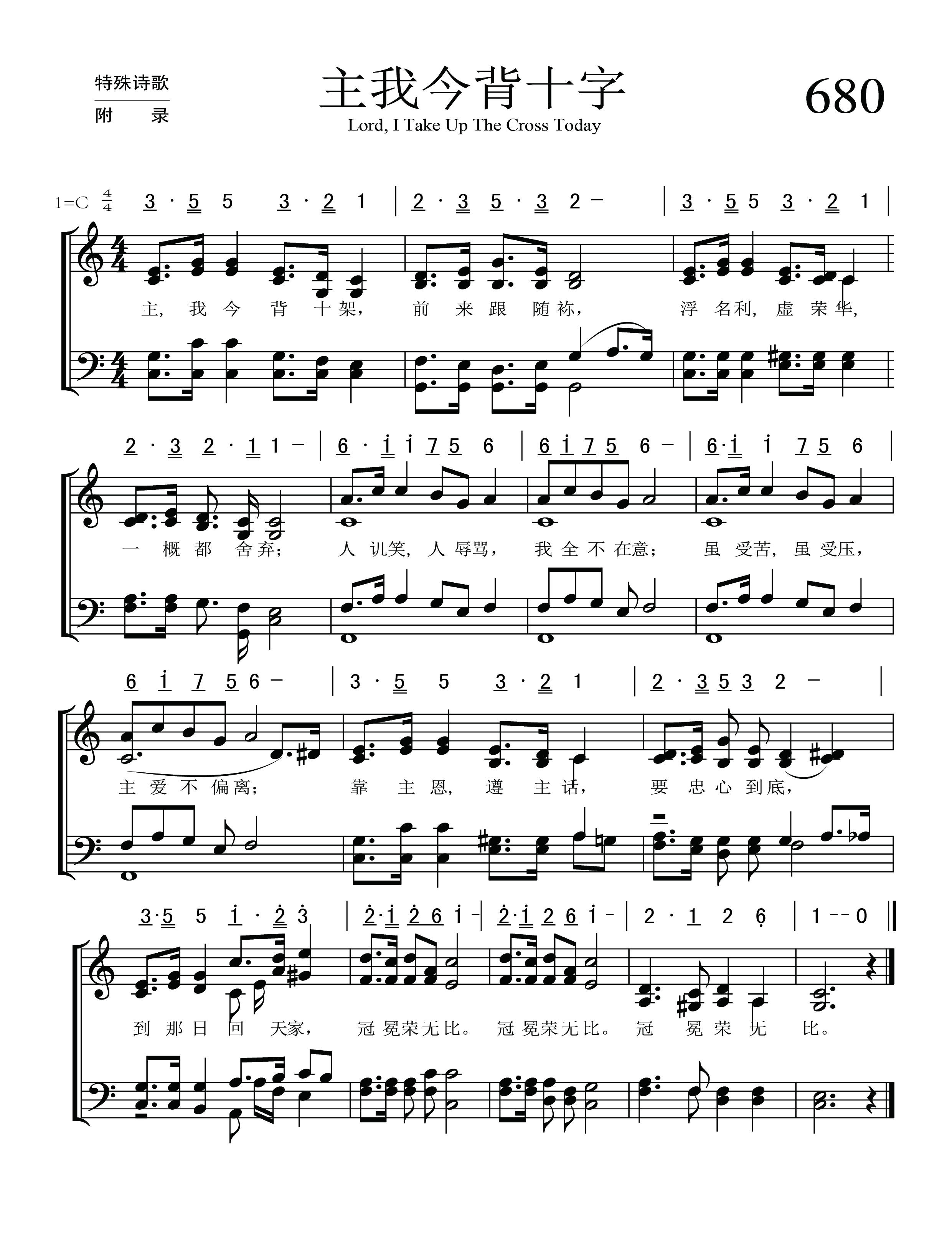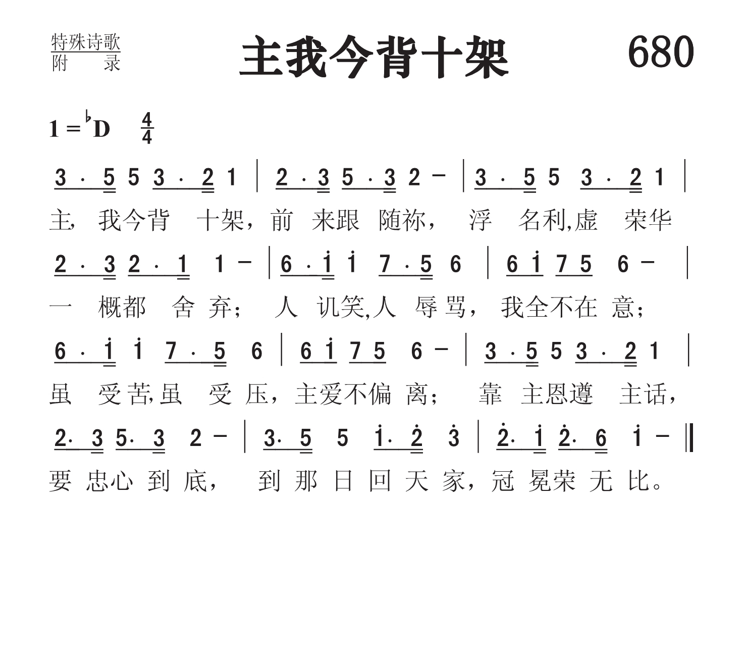第680首 主我今背十字Lord,I Take Up the Cross Today 德沃夏克(Antonín Dvoák,1841年9月8日 --- 1904年5月1日)作曲 主,我今背十架,前来跟随袮,浮名利,虚荣华一概都舍弃; 人讥笑,人辱骂,我全不在意;虽受苦,虽受压,主爱不偏离; 靠主恩,遵主话,要忠心到底,到那日回天家,冠冕荣无比。 安东利奥波德德沃夏克出生生于捷克的布拉格。他是十九世纪重要的作曲家之一,捷克民族乐派的主要代表人物。第九交响曲是他一生中最重要的作品,也是十九世纪民族乐派交响曲的代表作,在整个音乐史上也是不容忽视的杰作。这是第九交响曲的第二乐章,是整部交响曲中最为有名的乐章,经常被提出来单独演奏,其浓烈的乡愁之情恰是他本人身处他乡时对祖国无限眷恋之情的体现;也正因为有了这段旋律,这首交响曲才博得全世界人民的由衷喜爱。这充满对故乡无限深情的美丽旋律被后人填上歌词,而改编成为一首名叫《念故乡》的歌曲,并在全世界广泛流传、家喻户晓。 这首诗歌采用的就是《念故乡》的旋律。