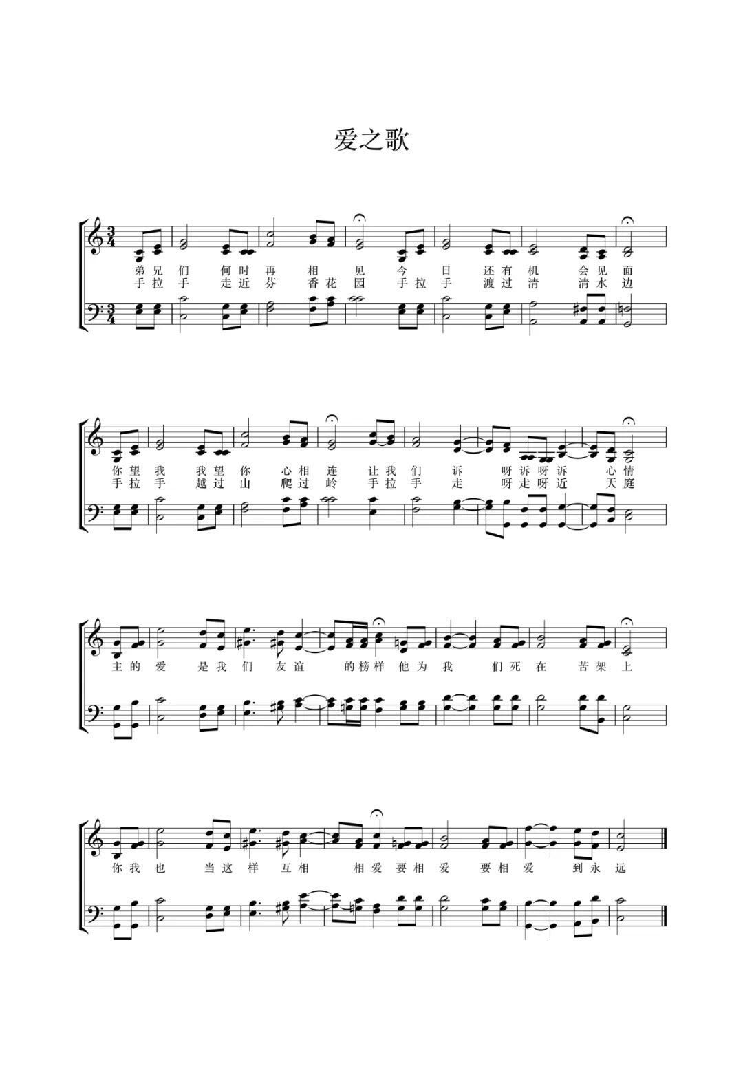 《爱之歌》是陈德和牧师所创作的第一首诗歌。1961年3月的一天,郭俊杰牧师在主里安息,陈牧师从厦门去探访郭俊杰牧师的家人。郭牧师的长子郭隆安牧师与陈牧师在公园里促膝谈心,直到夜深人静。郭隆安牧师希望陈牧师常去协助教会的工作。但由于当时陈牧师在厦门集美水产航海学校工作,无法脱身,郭隆安牧师为此感到伤心。当他们聊到深更半夜从公园里回教会时,陈牧师请郭隆安牧师先去就寝,自己却独自留在礼拜堂里,默想着上帝的爱、基督的十架、兄弟姐妹间的彼此相爱及将来的永生盼望,心中思绪万千,《爱之歌》的词曲瞬间在他的脑海中浮现,他便激动地写下了这首脍炙人口,意味深长的诗歌。“主的爱是我们友谊的榜样,祂为我们死在苦架上,你我也当这样互相爱,要相爱要相爱到永远。