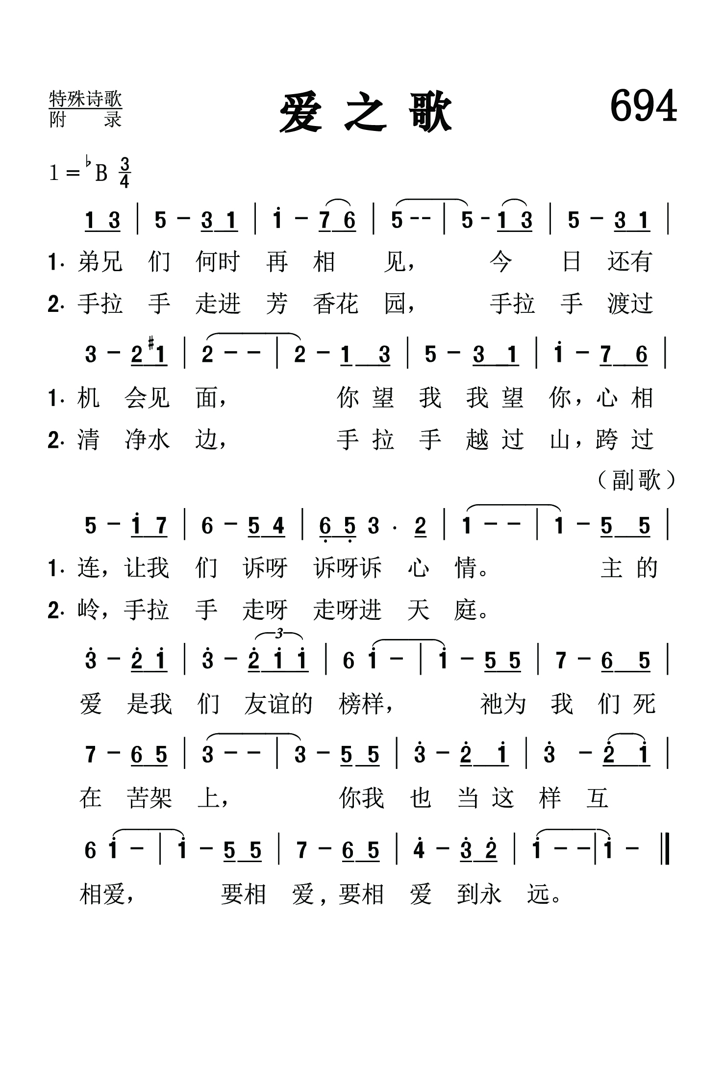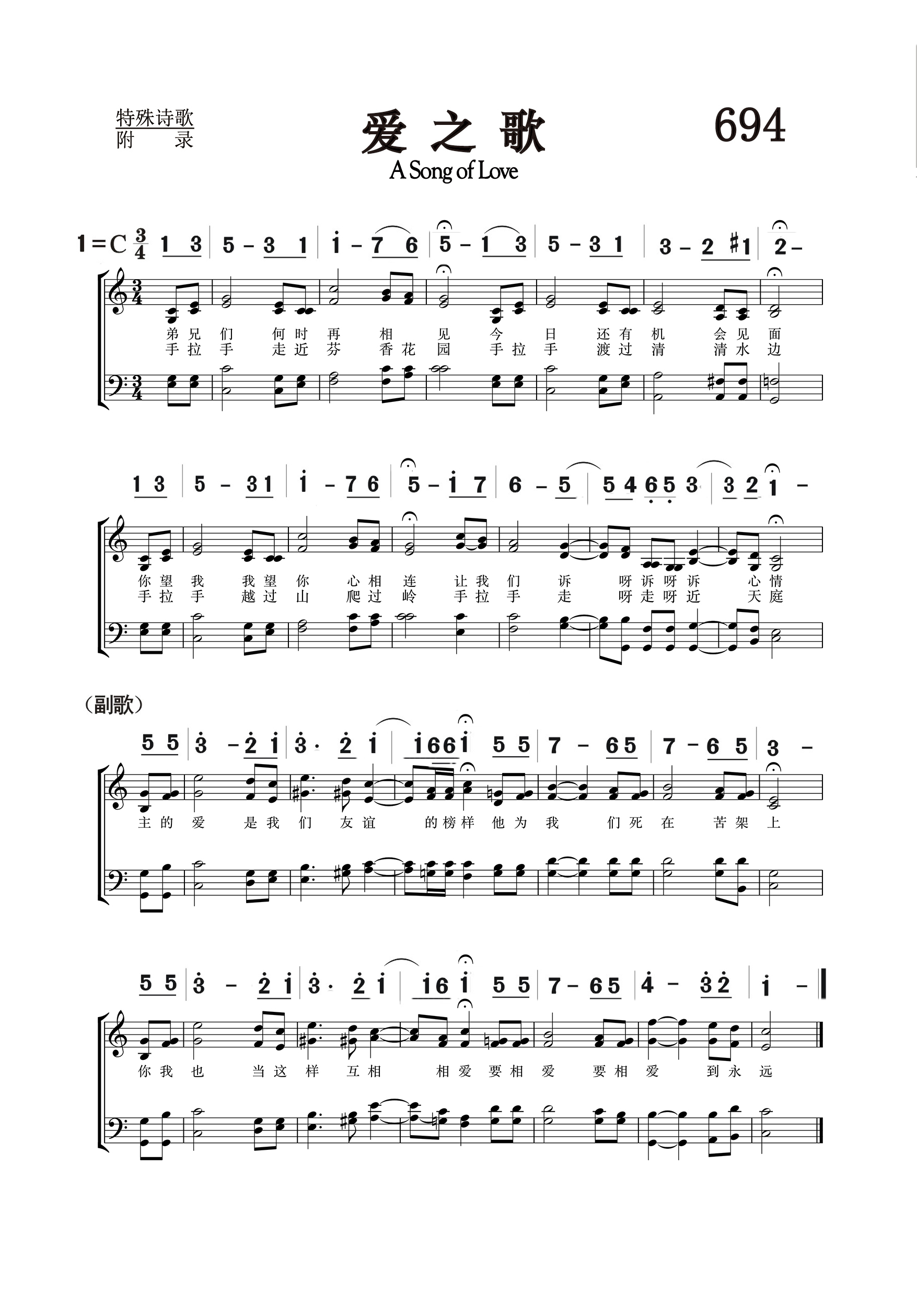 第694首爱之歌 A Song of Love 陈德和作词作曲 弟兄们何时再相见, 今日还有机会见面, 你望我,我望你,心相连,让我们诉呀,诉呀,诉心情。 手拉手走进芳香花园, 手拉手渡过清净水边, 手拉手越过山跨过岭,手拉手,走呀,走呀,进天庭。 主的爱是我们友谊的榜样,祂为我们死在苦架上, 你我也当这样互相爱, 要相爱,要相爱,到永远。 陈德和是基督复临安息日会牧师,中国福建省人,出生于1931年6月31日。他生长在复临信徒家庭,曾接受复临信仰的神学教育。他在坎坷的一生中,本着对基督耶稣的赤诚之爱,不顾个人的安危,到处奔波,勇敢地为那一次交付圣徒的真道做见证,数十年如一日,坚持传扬救人的福音和三位天使的时代信息。他的讲道铿锵有力,又不失幽默风趣,深受信徒所欢迎。陈德和与2004年5月10日歇下他的劳苦,在主内安息。 多才多艺的陈德和还是一为出色的音乐家。他弹得一手好钢琴,在蹉跎岁月中,曾创作了不少脍炙人口的赞美诗歌,在海内外广为传唱。