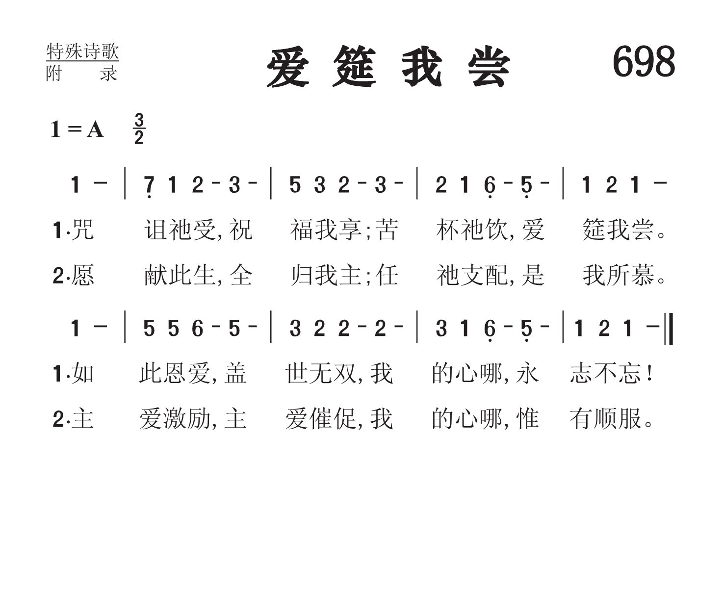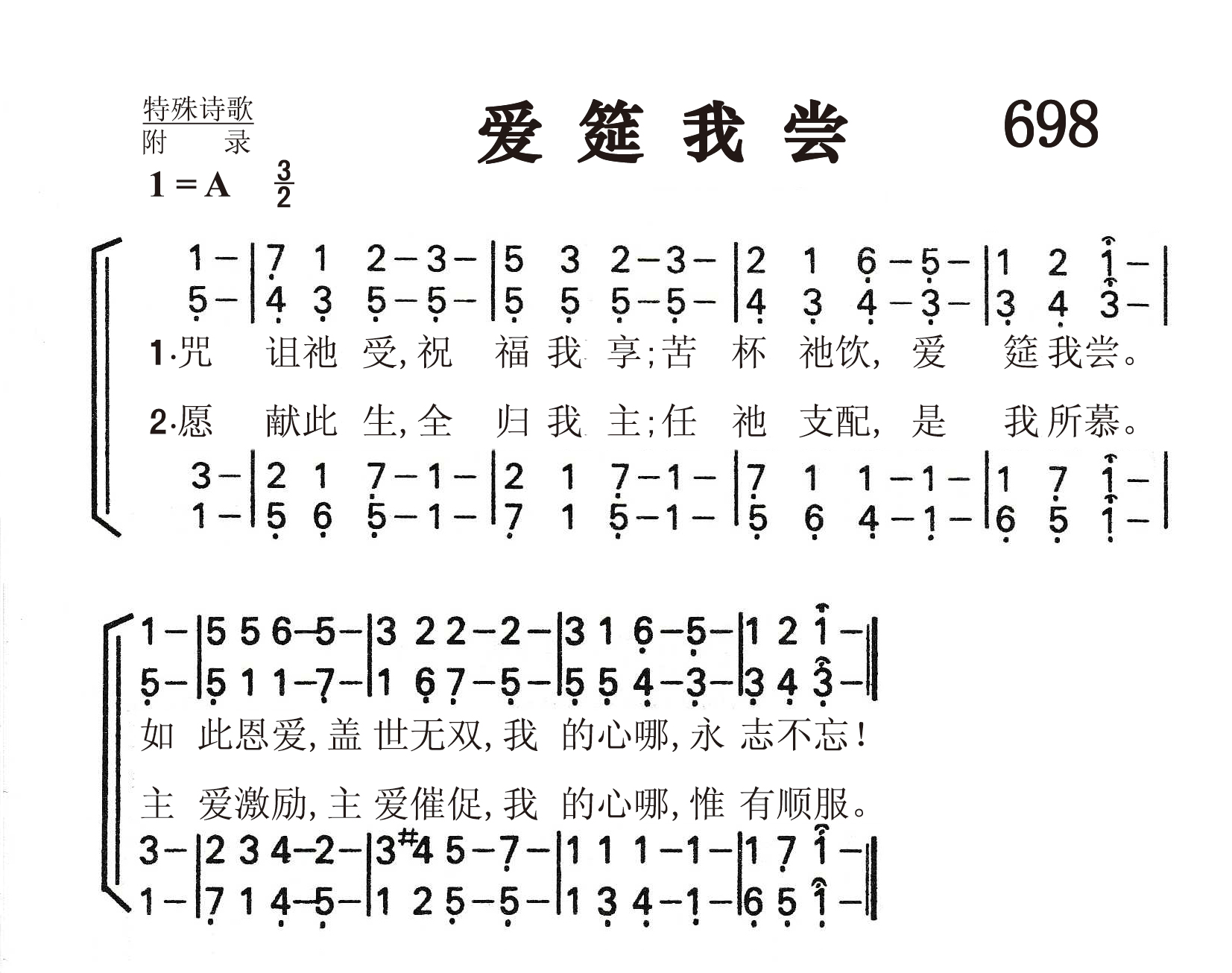 第698首 爱筵我尝 He Took My Curse 唐守临(1906-1993)作词,梅森(Lowell Mason,1792,7,8-1872,8,11)作曲 咒诅祂受,祝福我享;苦杯祂饮,爱筵我尝。 如此恩爱,盖世无双,我的心哪,永志不忘! 愿献此生,全归我主;任祂支配,是我所慕。 主爱激励,主爱催促,我的心哪,惟有顺服。 本诗第一节写于1936年,专为圣餐所用。第二节也是写于1936年,为传福音聚会所用。后两首合而为一。 诗歌的旋律是梅森1830年所作,曲名为《新罗金厄姆》(Rockingham New) 唐守临,又名唐醒,毕业于苏州东吴大学,曾在清心中学,复旦大学,东吴大学附属二中学执教。1929年献身传道。先在上海福音书房任编辑,参与修订基督徒聚会处的《诗歌》。作为倪柝声的同工,他先后在浙江、江苏、上海等地负责教会工作。抗战期间他曾去长沙、重庆等地传道。1950年至1958年担任上海教会长老。1956年以后带领一部分基督徒聚会处信徒参加三自,并长期担任中国基督教三自爱国运动委员会副主席。1982年,他担任中国基督徒圣诗委员会委员。1988年后任中国基督教协会第二、三届顾问。唐守临在诗歌创作方面很有才华。他自己又是出色的男低音。他写的许多诗歌在信徒中广为传唱。 圣乐音乐家梅森出生于美国马萨诸塞州的梅德菲尔德。幼年在校时就喜欢音乐,16岁时已成了乡村教堂唱诗的指挥。1812年迁居乔治亚州,在一家银行当办事员,同时在长老会礼拜堂任管风琴师及唱诗班指挥,并开始学习和声学和作曲。他自编了一本《圣乐曲调集》,送到好几家印刷长和出版社去,虽然讲明不要稿费,也没有一家肯承印。后经波士顿亨德尔.海顿音乐社出资代印,结果销路之广,出人意料,大大鼓舞了梅森,使他决定以音乐为他的终生事业。1827年他迁居波士顿,当选为亨德尔及海顿学会主席,并任教堂唱诗班指挥十四年。1829年编辑出版了第一本《儿童赞美诗》。他为了培养训练儿童唱诗,创办成立波士顿音乐学院,专门训练儿童唱歌。1834年又在音乐学院内成立了培训儿童音乐的教师培训班。他还负责出版音乐杂志,编辑出版了80多种诗歌集,创作诗歌曲谱1126首,改编496首,对提高美国的音乐水平,改善教会圣乐方作出突出贡献,为19世纪美国音乐界最有影响的人物。1835年纽约大学授予他第一位音乐博士学位,以表尊敬。