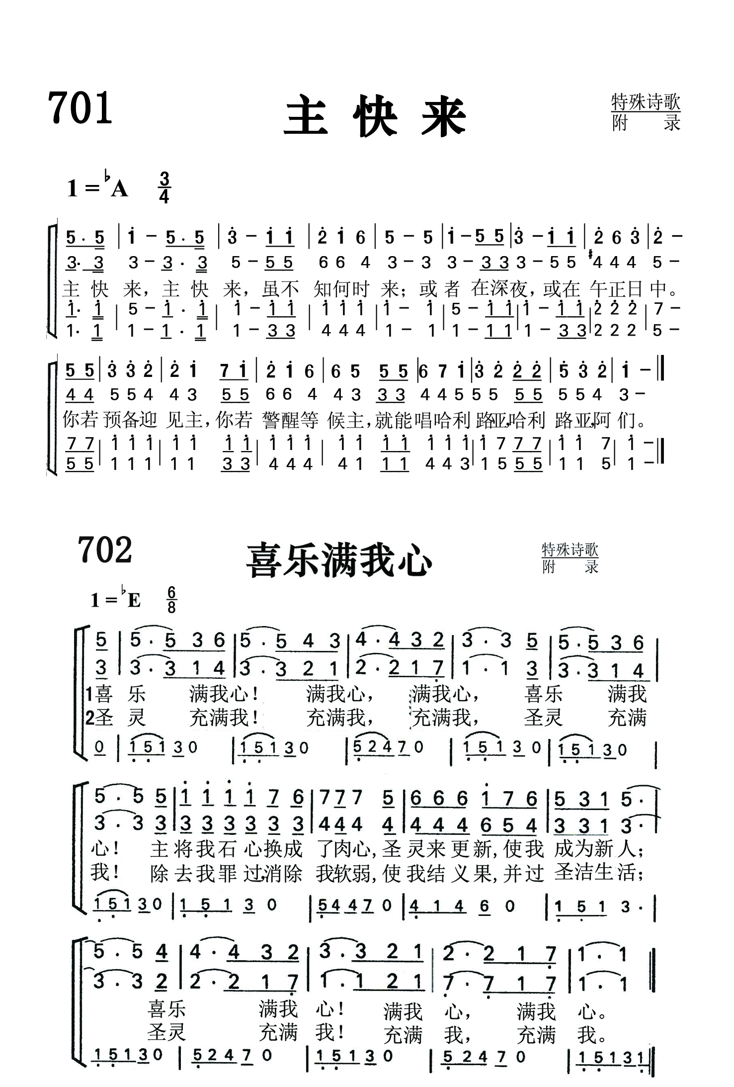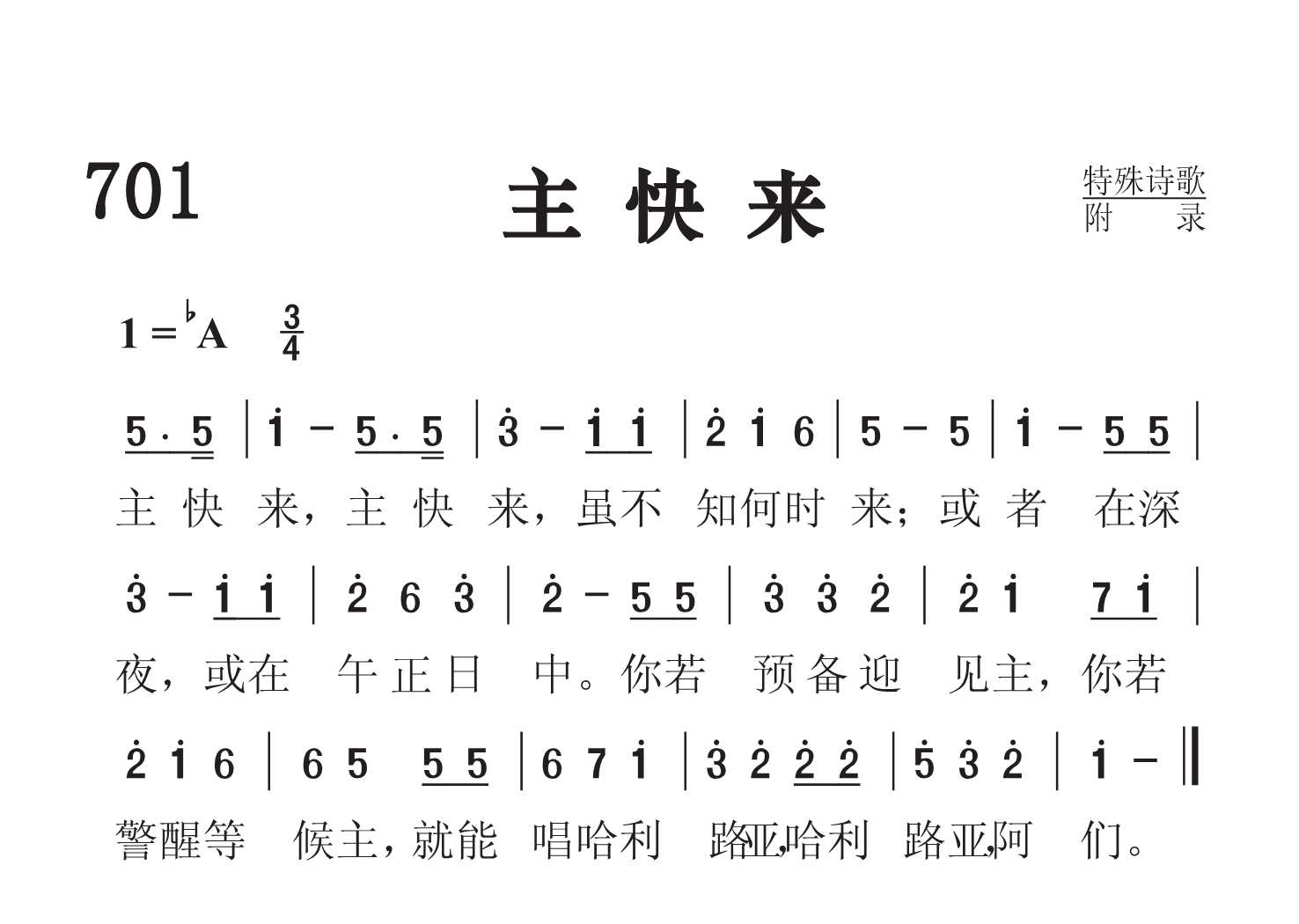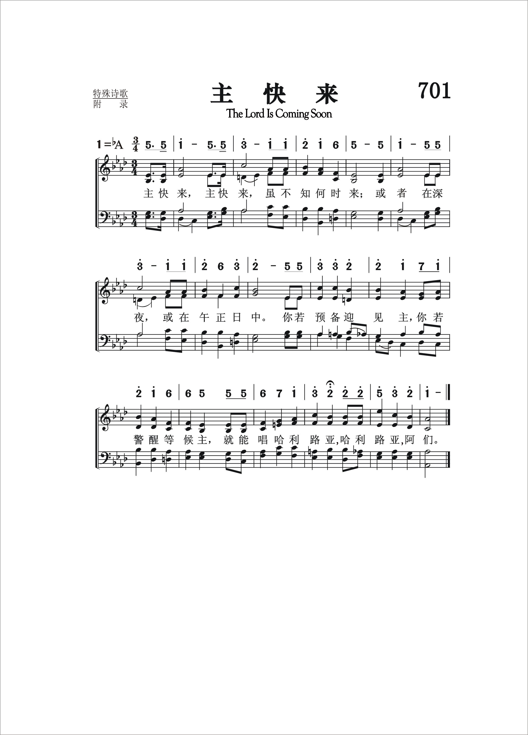 第701首主快来 The Lord Is Coming Soon 《颂赞圣诗》655首 主快来,主快来,虽不知何时来; 或者在深夜,或在午正日中。 你若预备迎见主,你若警醒等候主, 就能唱哈利路亚,哈利 路亚,阿们。