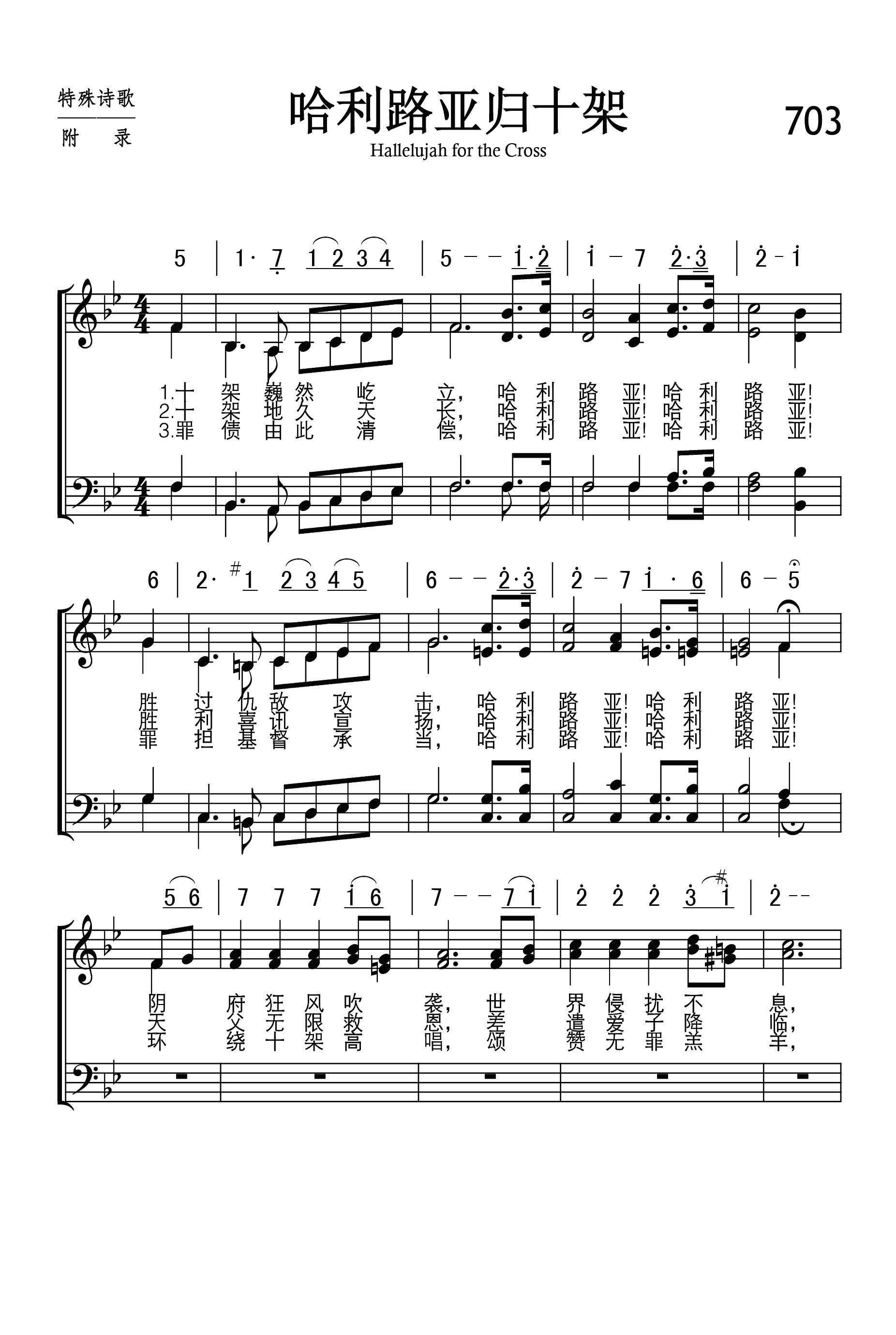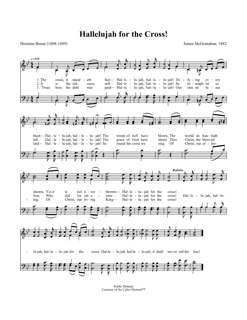 第703首哈利路亚归十架Hallelujah for the Cross 博纳(H.Bonar 1808,12,19-1889,7,31)改编歌词;麦格雷纳汉(James McGranahan,1840,7,4-1907,7,9)作曲 十架巍然屹立, 哈利路亚! 哈利路亚! 胜过仇敌攻击, 哈利路亚! 哈利路亚! 阴府狂风吹袭, 世界侵扰不息, 十架依然坚立, 哈利路亚归十架! 十架地久天长, 哈利路亚! 哈利路亚! 胜利喜讯宣扬, 哈利路亚! 哈利路亚! 天父无限救恩, 差遣爱子降临, 十字架上舍命,哈利路亚归十架! 罪债由此清偿, 哈利路亚! 哈利路亚! 罪担基督承当, 哈利路亚! 哈利路亚! 环绕十架高唱, 颂赞无罪羔羊, 基督永活君王, 哈利路亚归十架! 博纳博士是苏格兰长老会中最著名,影响最大的圣诗作者。他于1808年12月19日出生于爱丁堡一个律师兼学者的家庭。他从小就立志献身归主,上大学时师从长老会神学大师多马 查默斯(1750-1847)。他毕业后担任苏格兰教会(即长老会,当时的苏格兰国教)的牧师。1843年追随其师以及一部分教牧人员脱离国教,另行组织自由长老会。查默斯去世后,他受聘担任爱丁堡查默斯纪念会堂首任牧师,并接任苏格兰自由长老会全国大会会长。他一生敬虔事主,努力工作,牧养羊群,素有勤祷告、勤写作、勤讲道、“三勤”牧师之称。 博纳博士以宣讲基督复临的要道见长。他于1855至1856年间漫游埃及与巴基斯坦以后,更增强了对于圣书预言的兴趣。他在报章上多次发表诗文,同时担任预言杂志的主编。他以满腔的热忱盼望基督再来,宣扬战胜死亡,荣归天家的快乐。他以自己虔诚祈祷的人生感动了周围无数的人。 他爱儿童,常常专为儿童写诗。他爱好音乐。在乌云密布的日子,他用笛声表达哀婉之情,然而顷刻间,又吹奏出快乐的旋律。他所写的诗歌,热情奔放,活泼生动,不事修饰,蕴含着不可压抑的内在力量,。尤其是死亡寒流袭来之际,他的诗更象灿烂辉煌的灯光,穿越黑暗,照亮前程。 他于1889年逝世时,虽遇狂风暴雨,前来送行的仍人山人海。他们痛惜教会失去了一个柱石,同时怀念他所写下的不朽诗章。 曲作者麦格雷纳汉出生于美国的一个农民家庭,所受的正式教育很有限,却靠自己的努力和爱好,使他在19岁时就出任音乐教师。以后他到纽约州布雷德伯里所办的音乐学校短期学习,接着便参加福音布道团以歌声宣扬主名。1877年,福音歌唱家、作曲者布利斯突然去世,他便与诗人惠特尔合作,组织布道团,旅行美国各地并前往英国,担任唱诗班领唱,以他优美动听的男高音和亲切感人的魅力大获成功。他还首先组织完全是男声的唱诗班,曾与桑基,鲁特•斯特宾斯等人合编出版多本福音诗歌集,其中较有名的有《男声福音圣诗》二卷,《福音圣诗》等。他自己也写诗,如《颂赞诗歌》317首《信主得生命》。