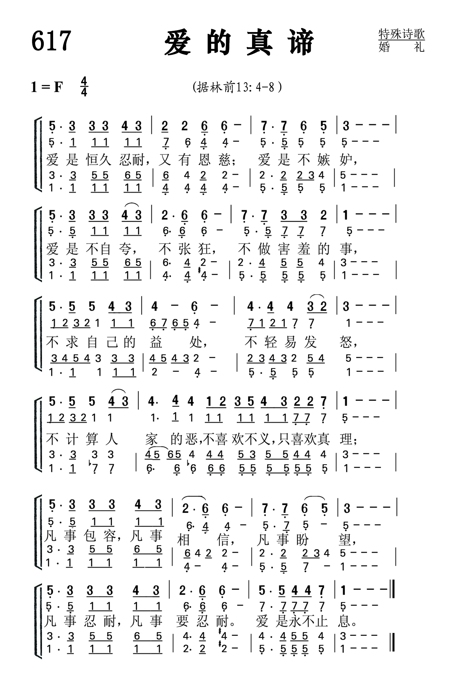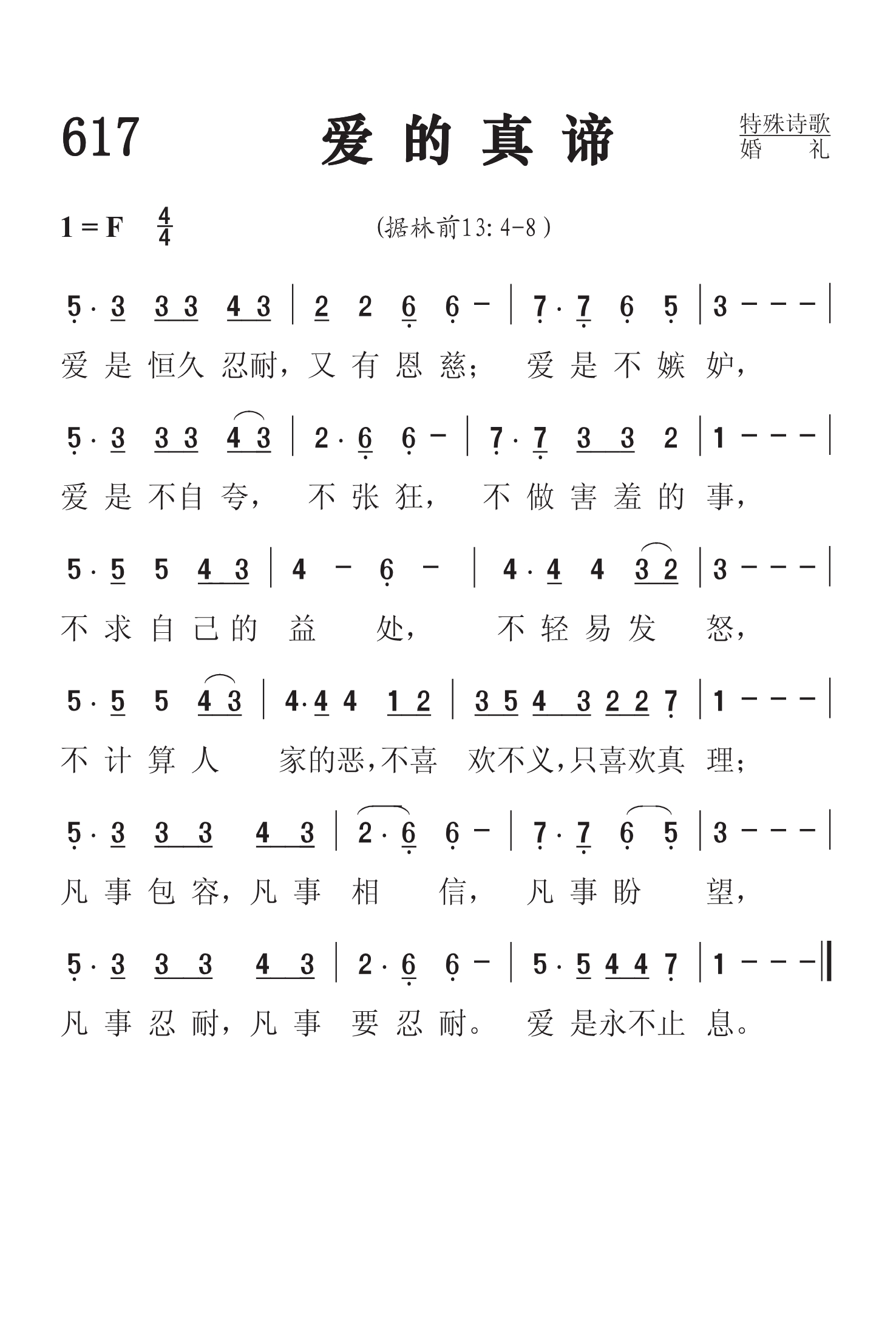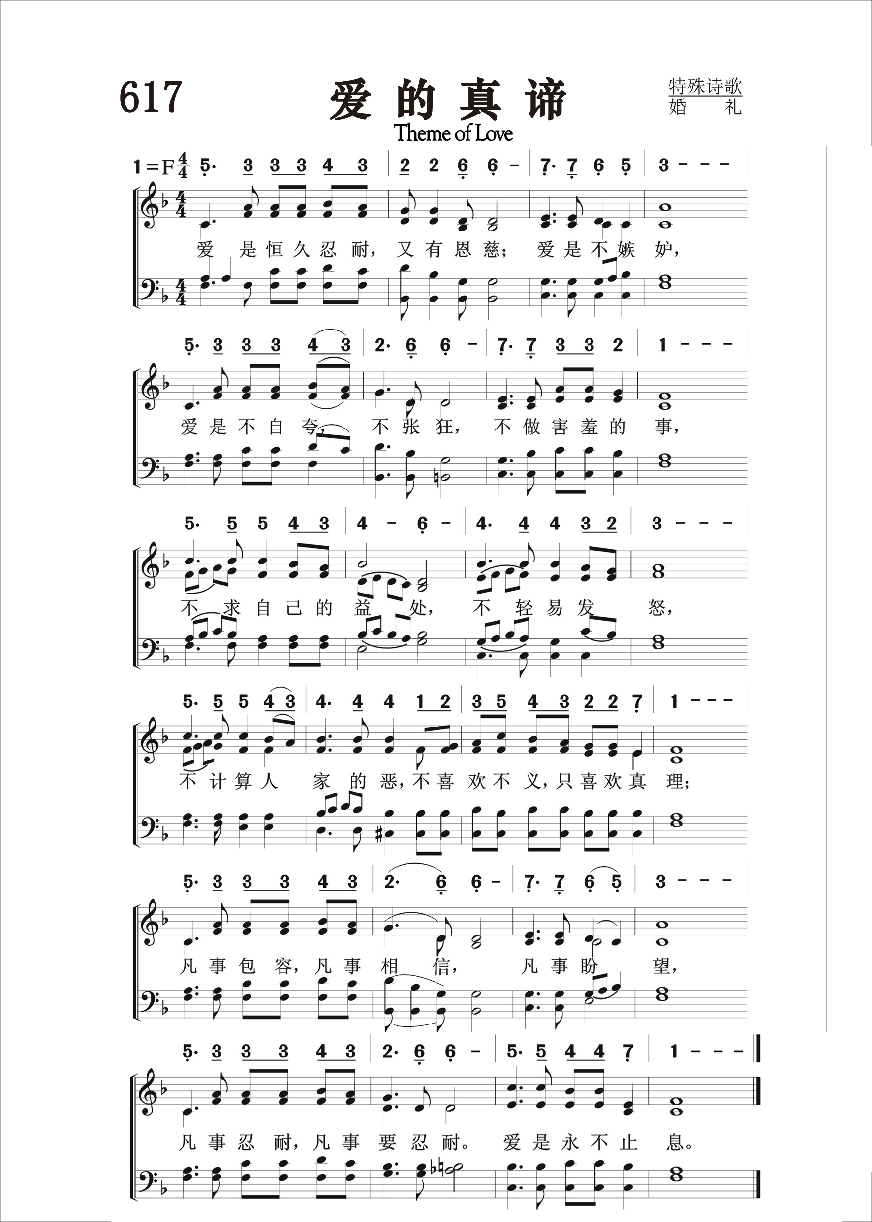 第617首 爱的真谛Theme of Love 歌词是《哥林多前书》13:4-8上;曲作者是简铭耀 爱是恒久忍耐,又有恩慈;爱是不嫉妒, 爱是不自夸,不张狂,不做害羞的事, 不求自己的益处, 不轻易发怒, 不计算人家的恶,不喜欢不义,只喜欢真 理; 凡事包容,凡事相信,凡事盼望, 凡事忍耐,凡事要忍 耐,爱是永不止息。 华人圣乐作曲家简铭耀出生在台湾台北,淡江中学毕业后就进台湾神学院音乐系,主修钢琴,副修作曲。1972年春,他在神学院求学时一个春雨连绵的早晨,望着窗外屹立细雨中院长的墓碑,油然兴起对前辈的思念之情,然后抚琴作了他的第一首圣诗。他编著过《爵士钢琴即兴演奏法》。
